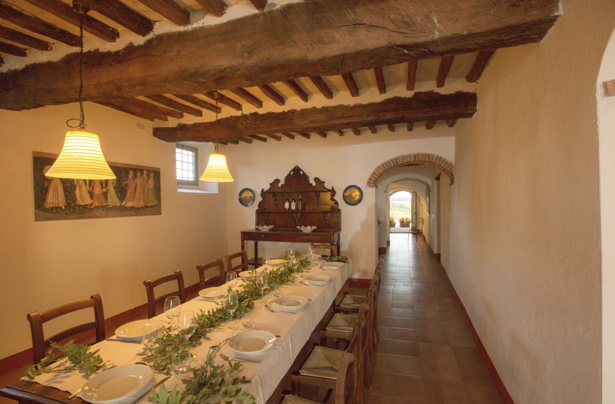 The farmhouse, completely renovated, is located within a large property that extends over an area of about 460 hectares near Castellina in Chianti. Careful restoration work has brought it back to its ancient splendor. This ancient and majestic farmhouse stands in a dominant position on the hills of the Chianti Senese. From the house you can enjoy a splendid view of the surrounding countryside where vineyards and olive groves alternate. Careful restoration has returned the house to its ancient charm. Central position with respect to the Chianti area and the art cities of Siena and Florence.