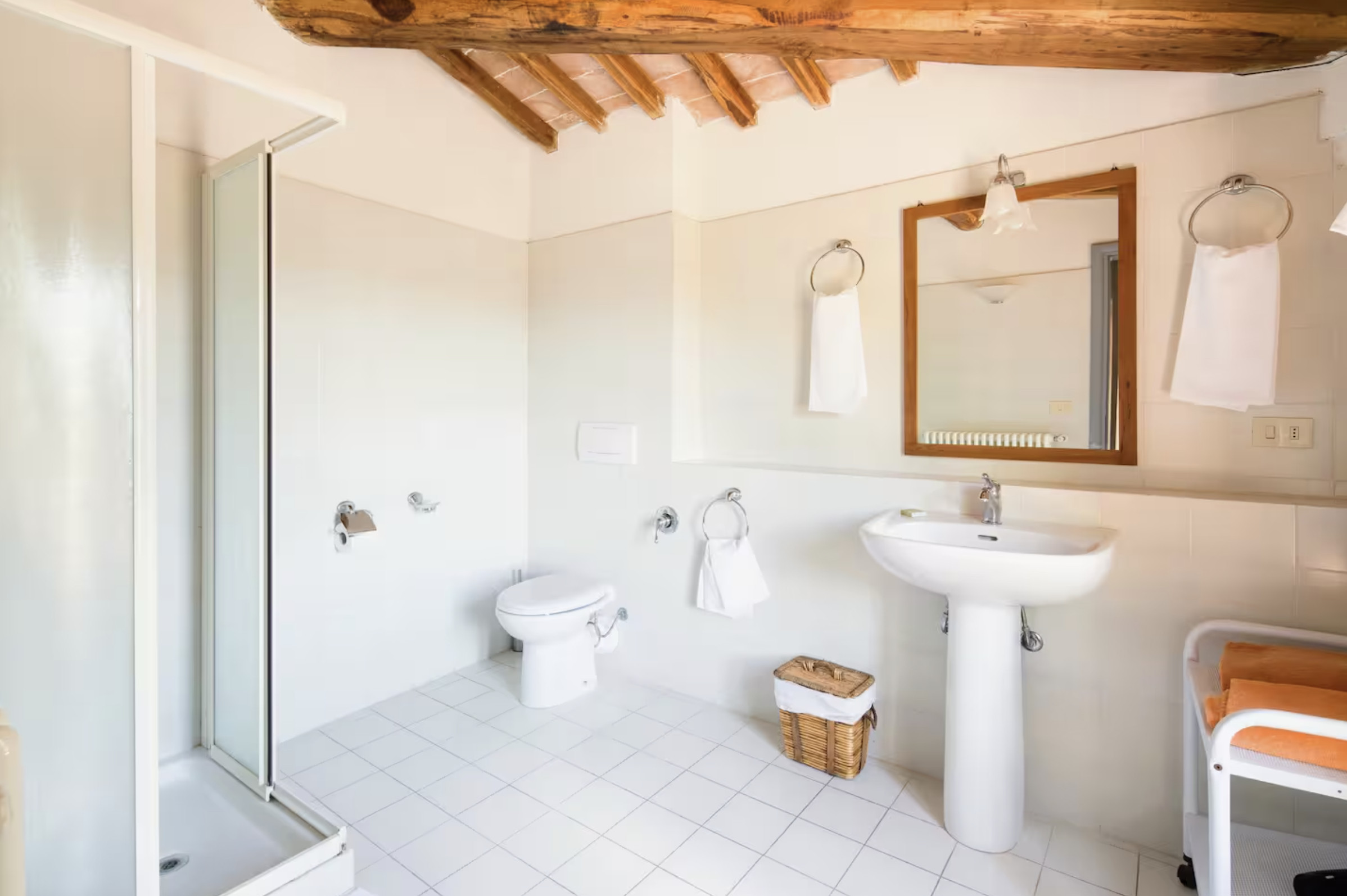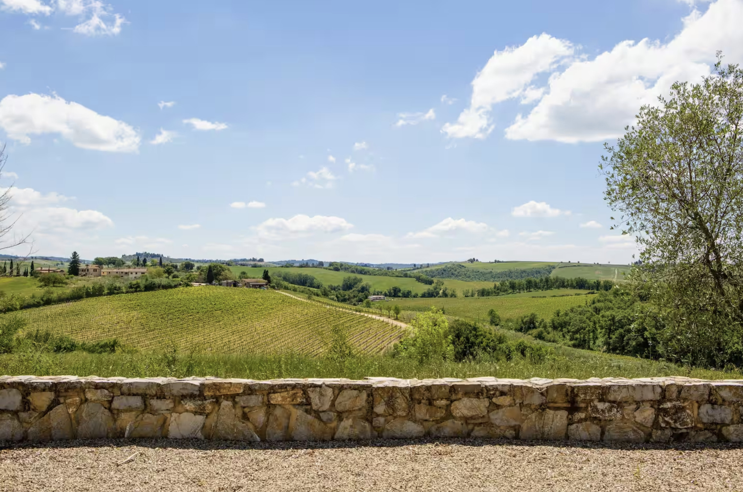 Within the estate there are alternating vineyards, olive groves and wheat fields, protected by woods and scrub. 5 km from Castellina in Chianti (food shops, tennis), 15 km from Poggibonsi (all kinds of shops), 20 km from Siena and San Gimignano, 50 km from Florence. Tennis 15 km, riding stables 15 km.