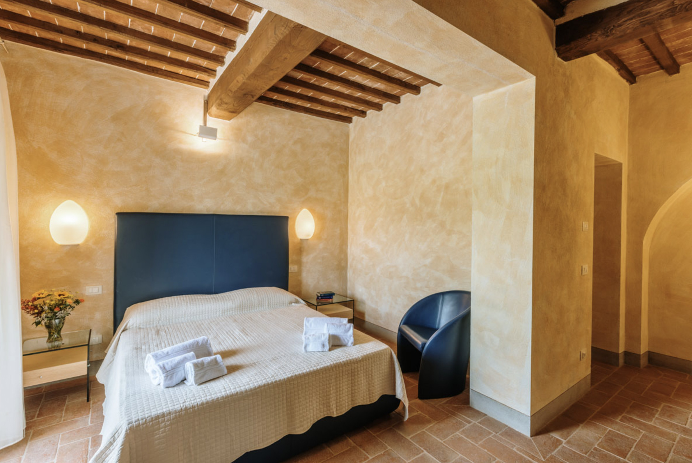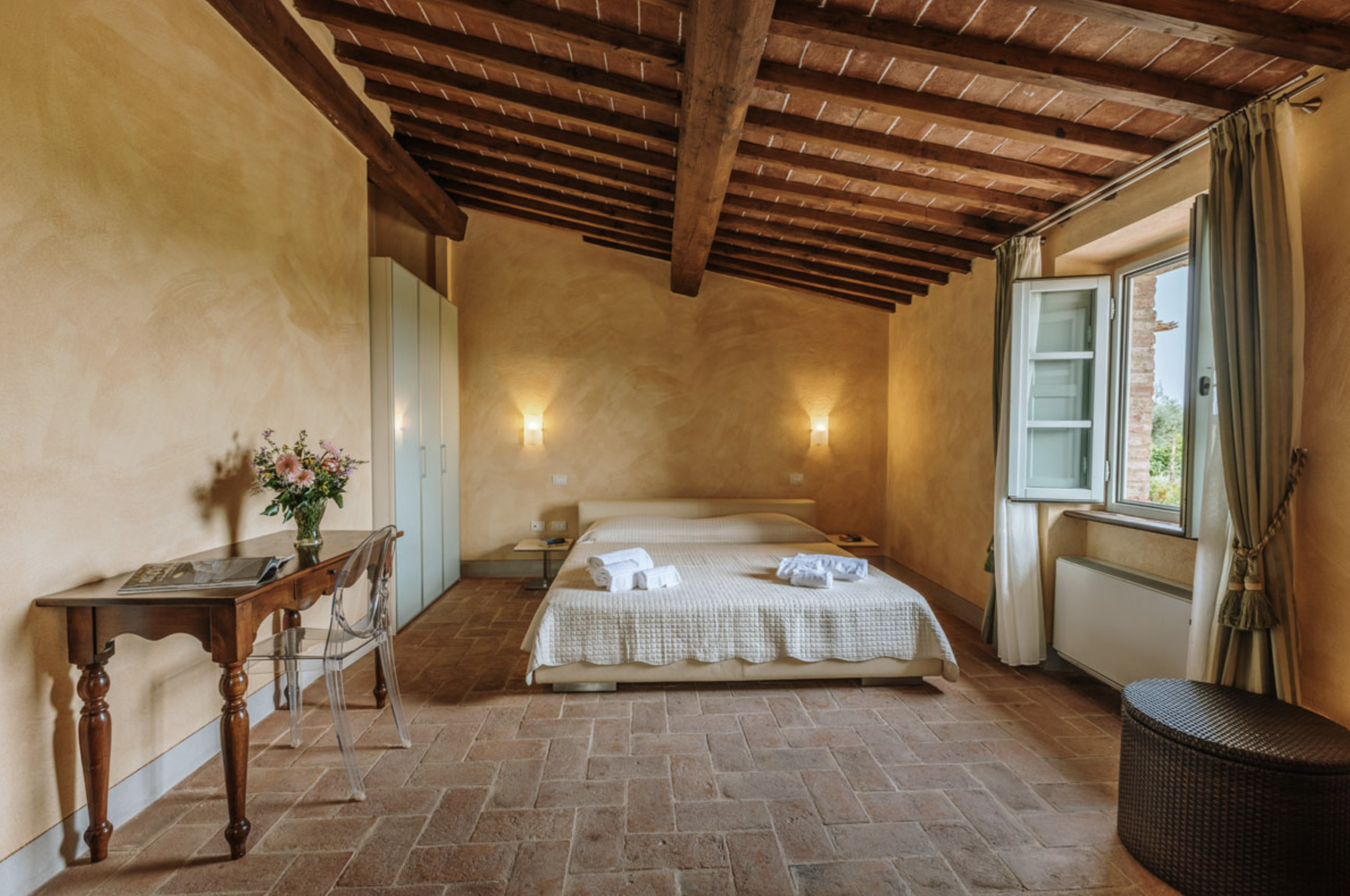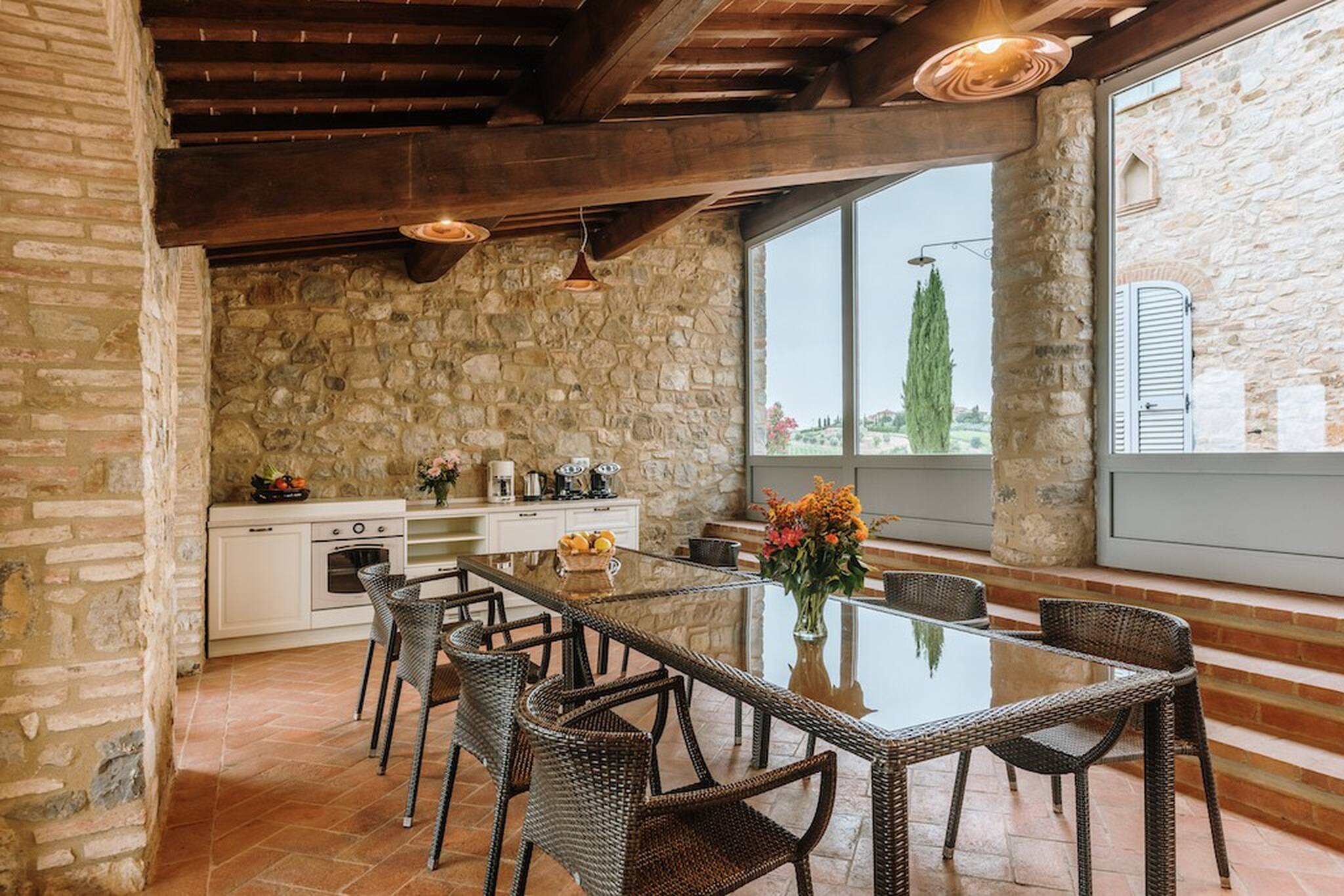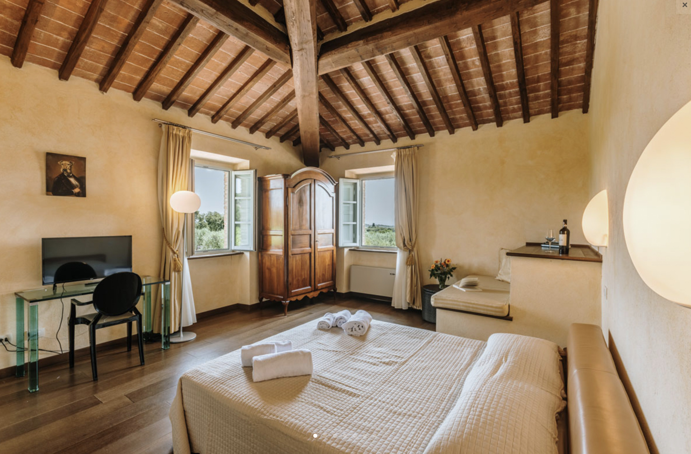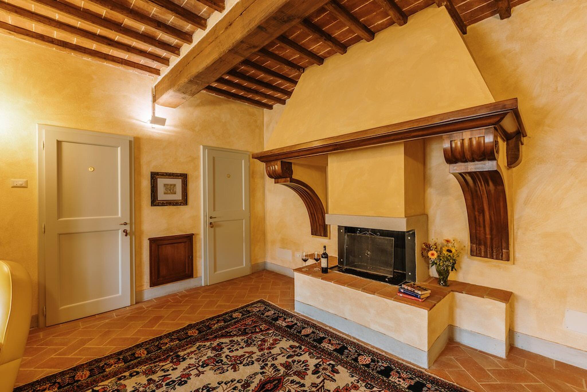 The inside of the villa has the high quality finishes typical of rural Tuscan architecture: handmade cotto floors, ceilings with wooden beams , stone walls while on the hot Summer evenings the outside areas are perfect for living under the stars with family or friends. All the furnishings have been chosen with care for details it is an ideal place for comfort and relax.