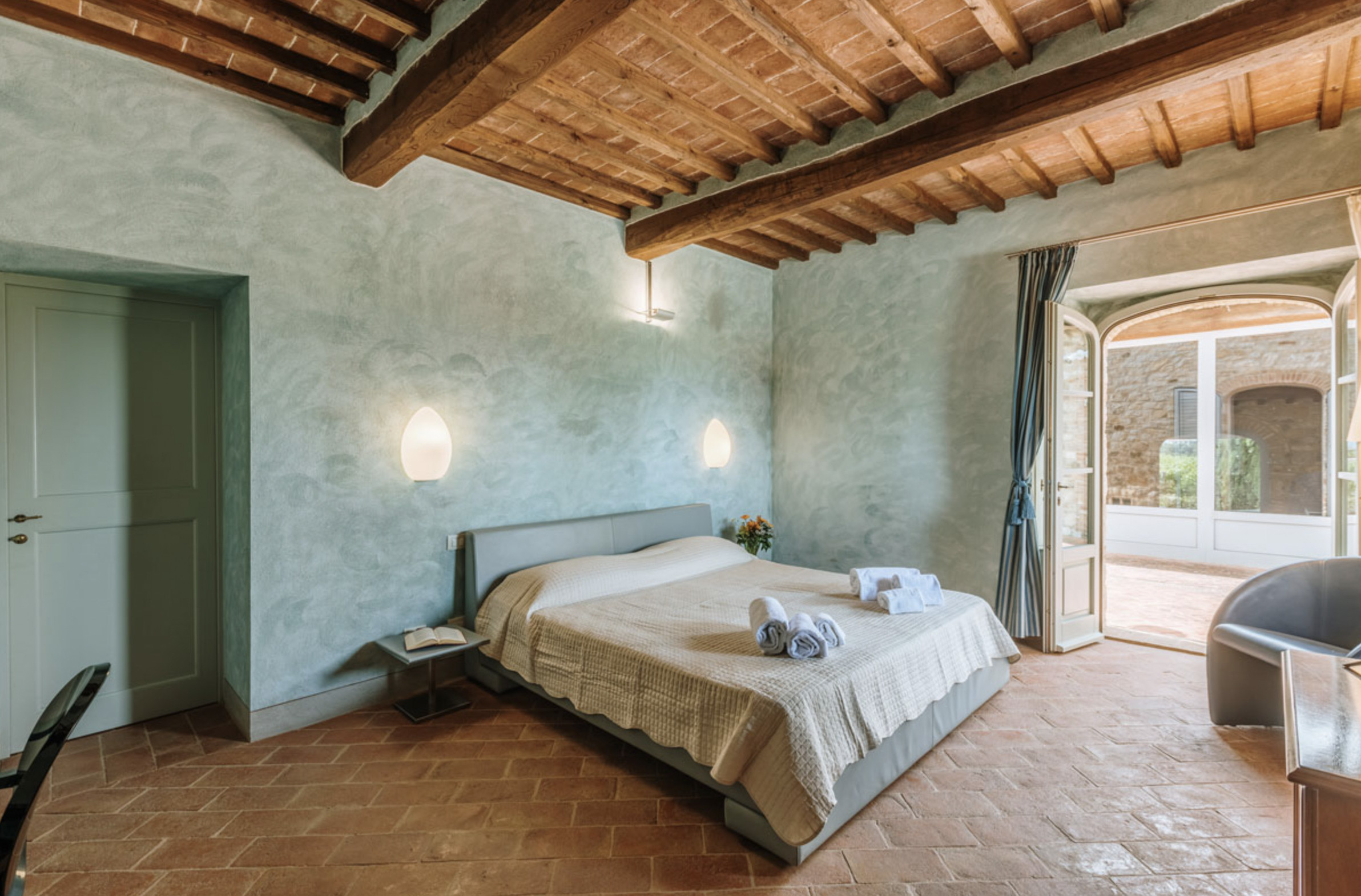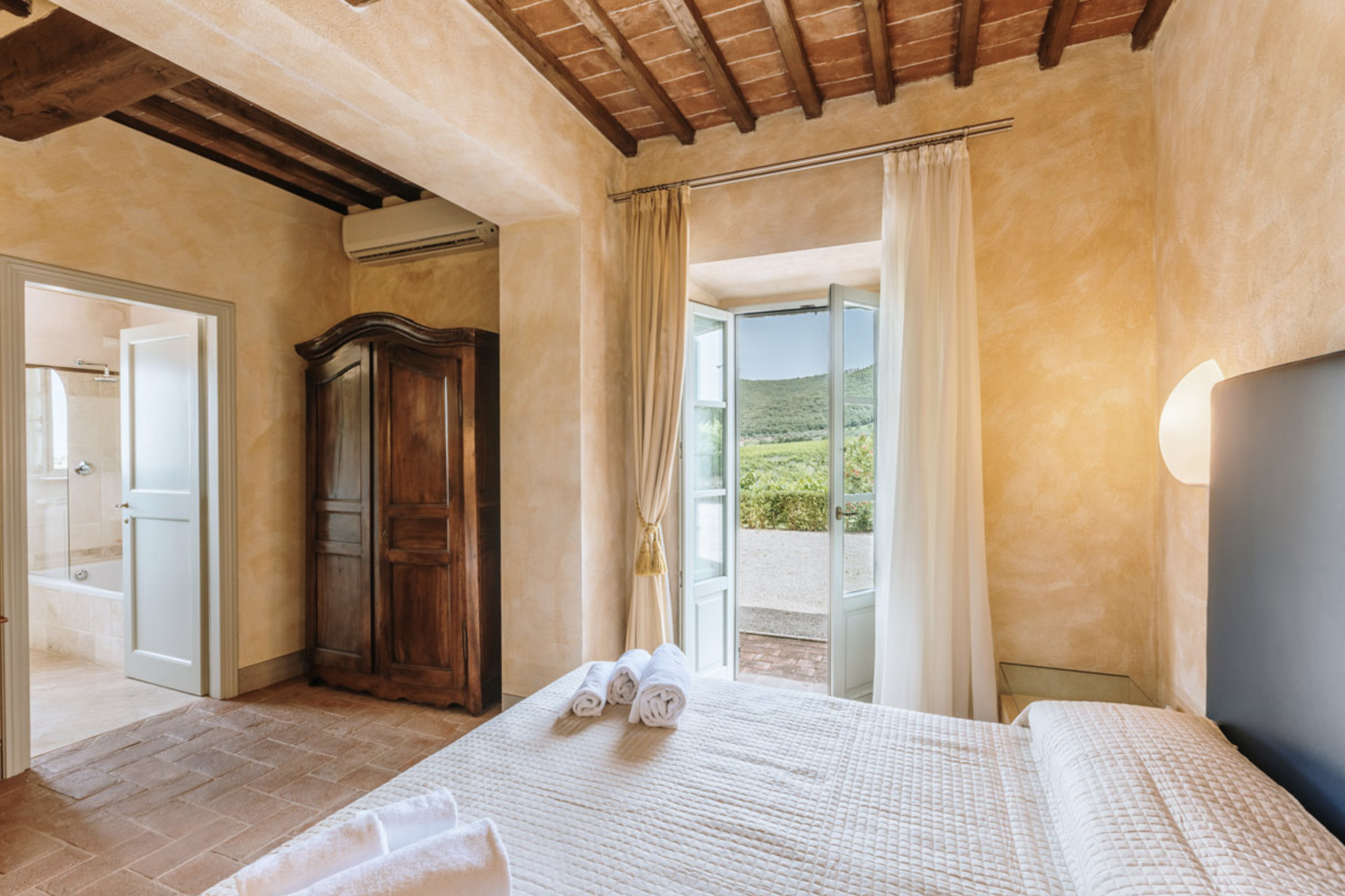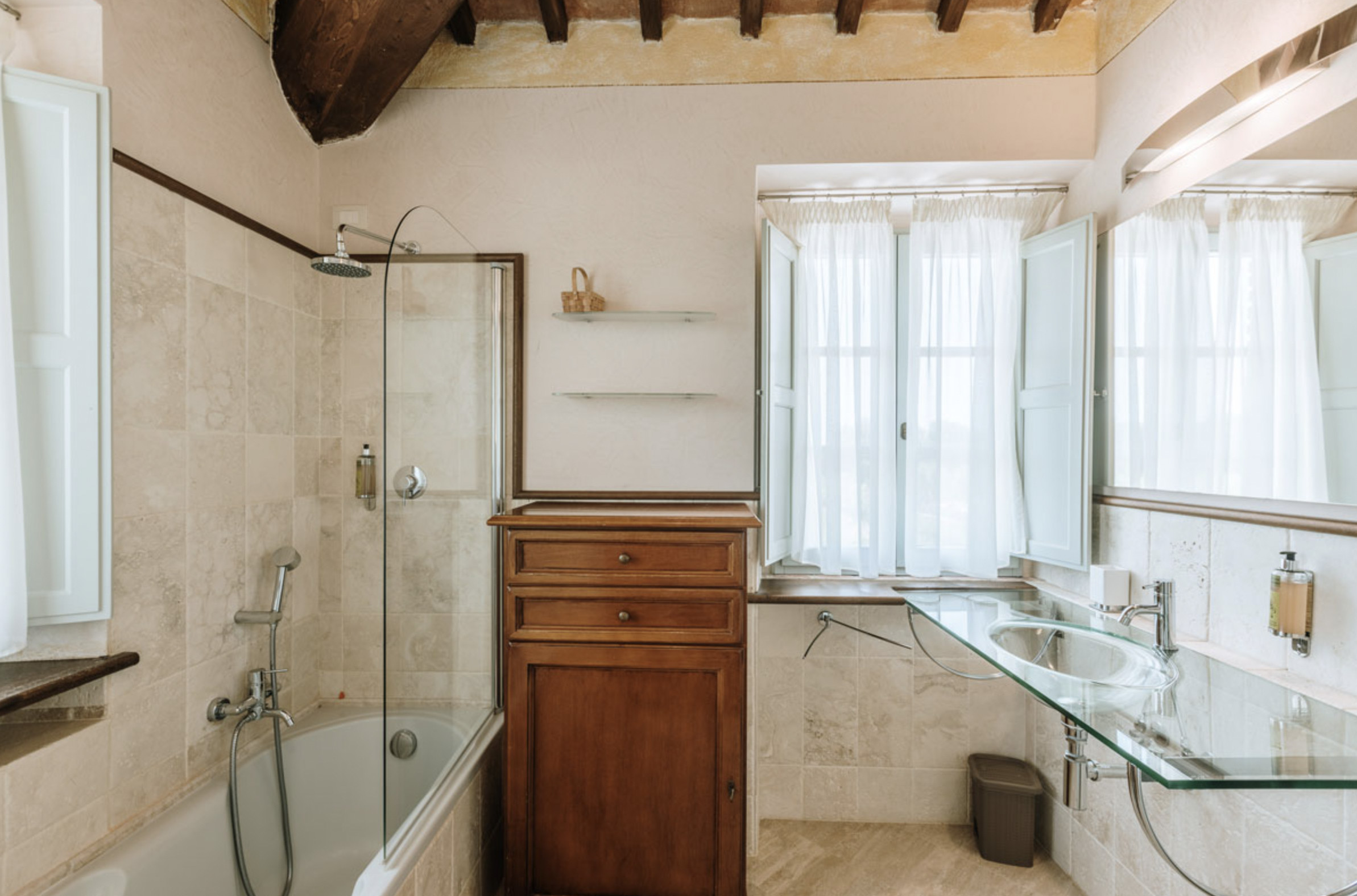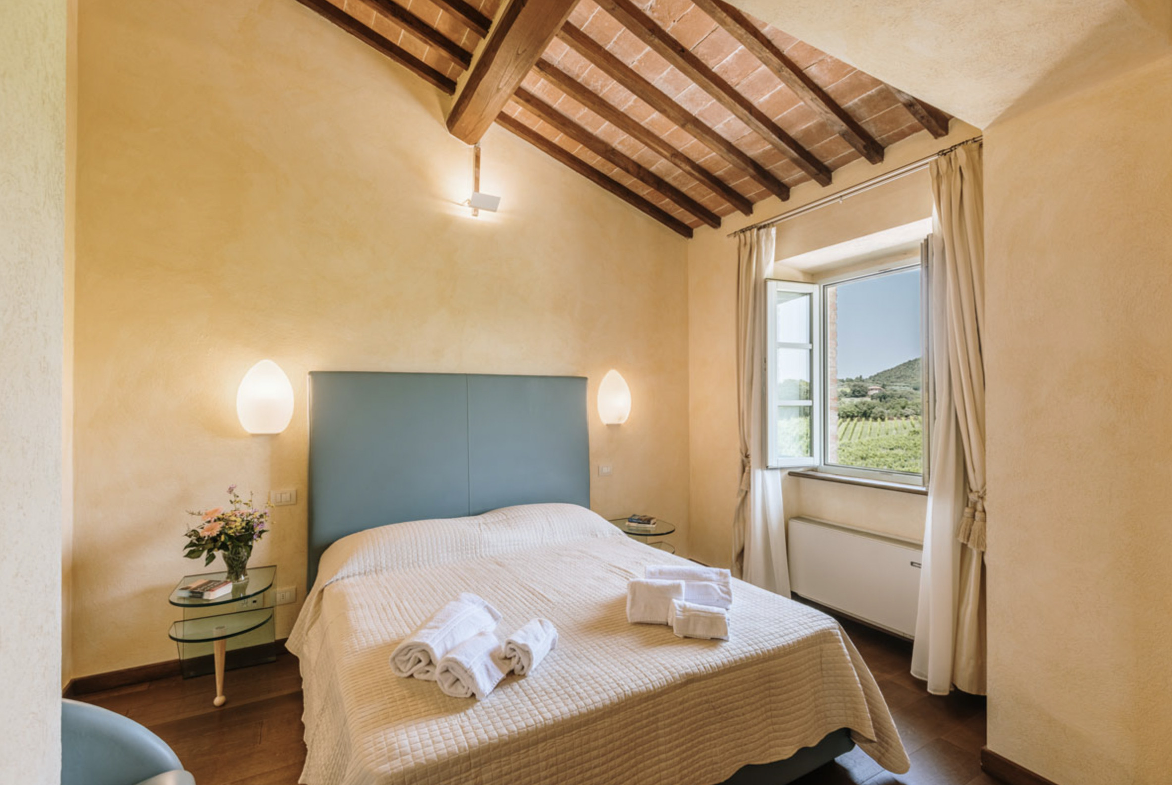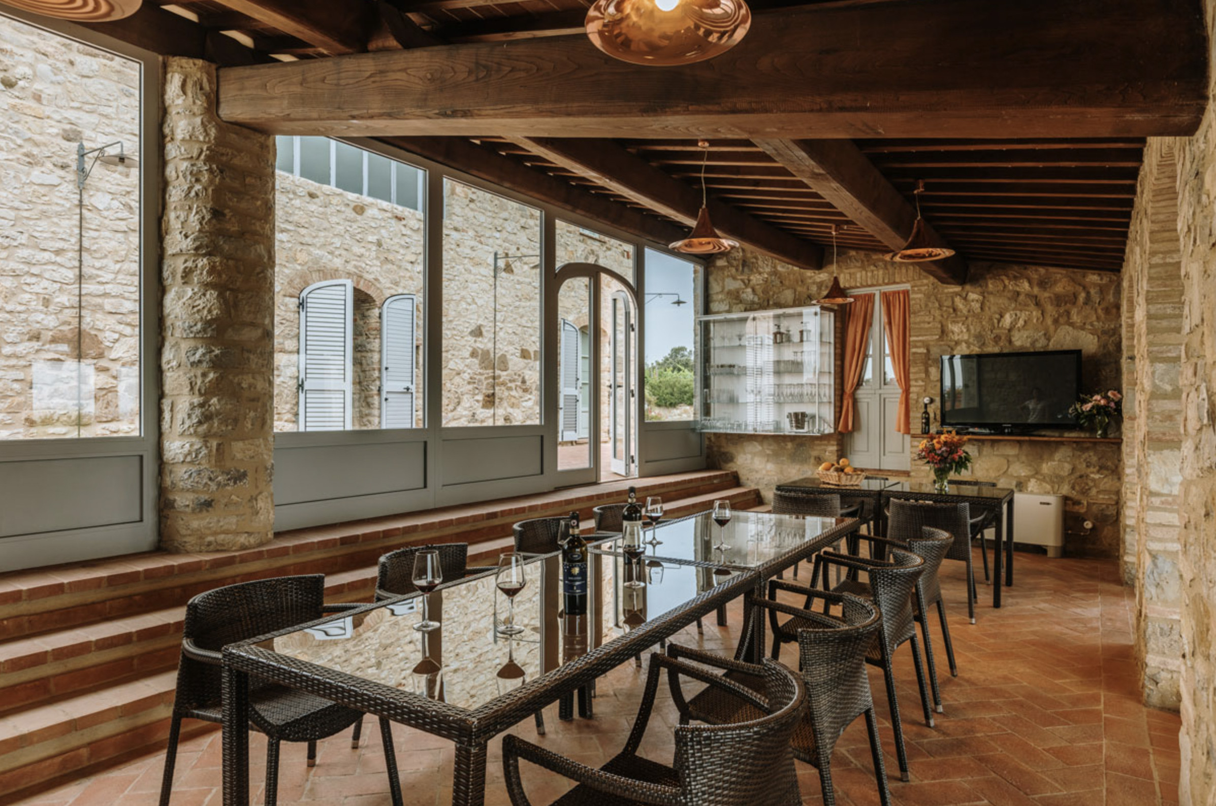 The inside of the villa has the high quality finishes typical of rural Tuscan architecture: handmade cotto floors, ceilings with wooden beams , stone walls while on the hot Summer evenings the outside areas are perfect for living under the stars with family or friends. All the furnishings have been chosen with care for details it is an ideal place for comfort and relax.