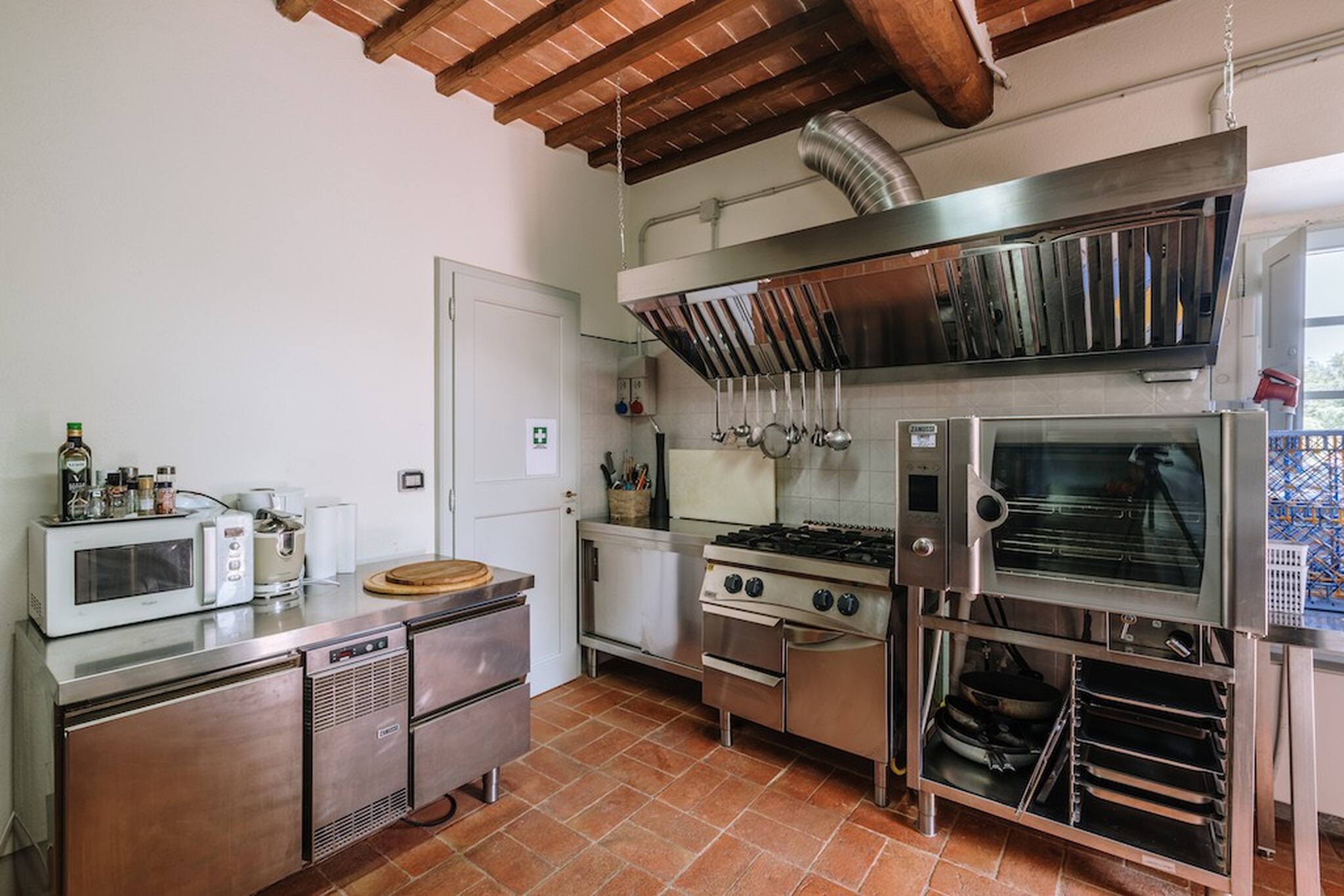 The ground floor is composed of a completely equipped professional kitchen, a small lounge area with service bathroom.On