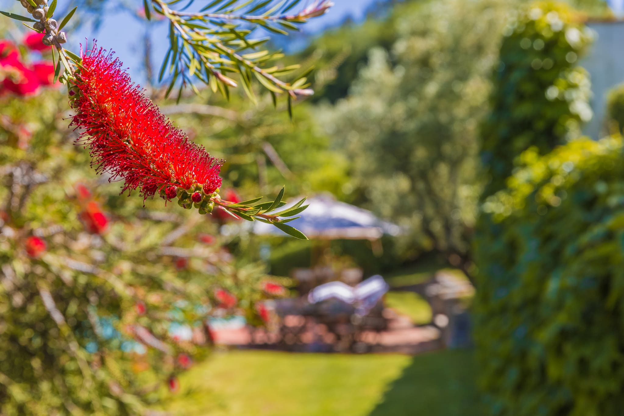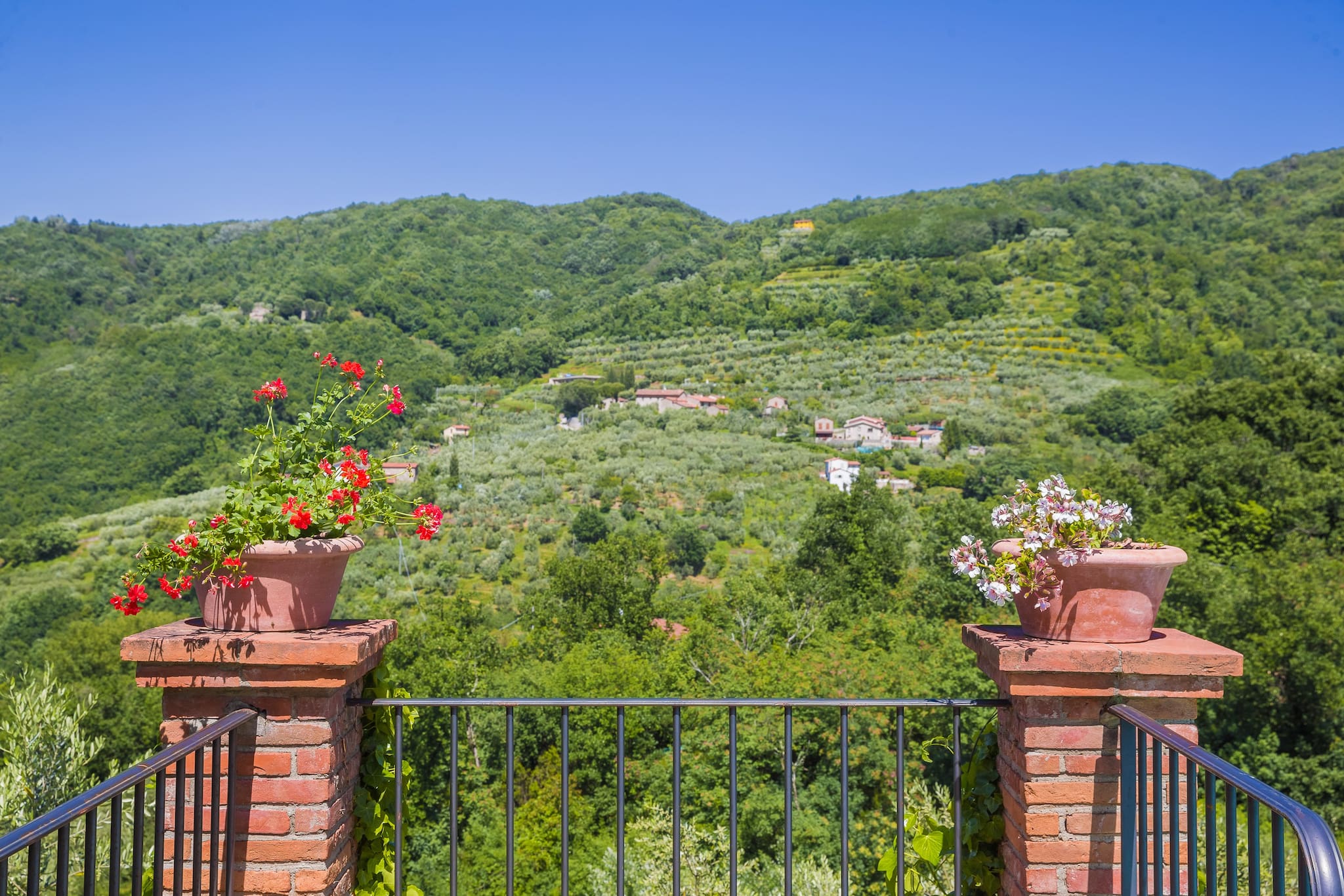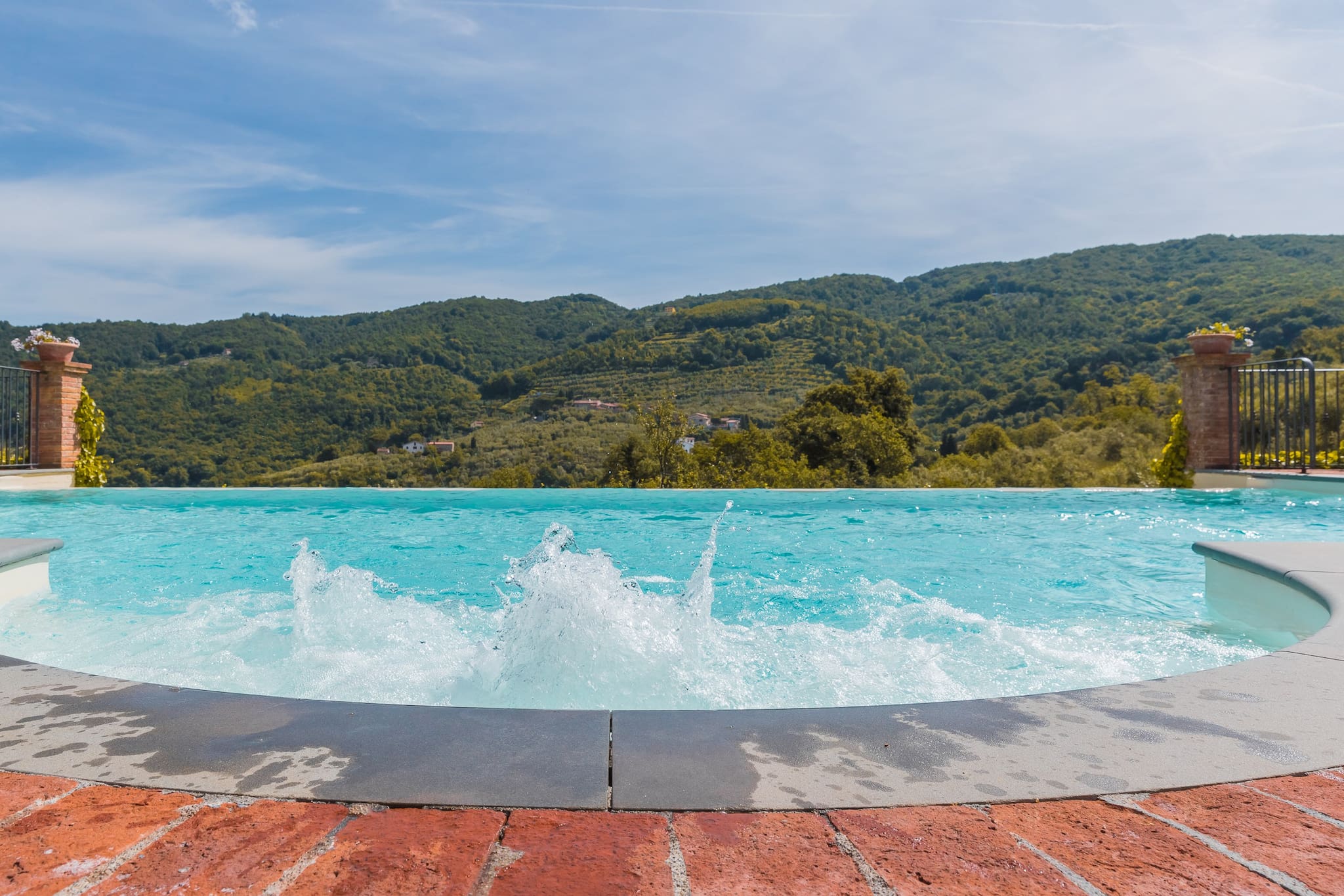 The view that can be enjoyed from the garden is constituted to the north by the main facade of Villa Il Ronco and on the other sides by the hills of olive groves and cypress trees typical of the Tuscan countryside and by chestnut and oak woods.