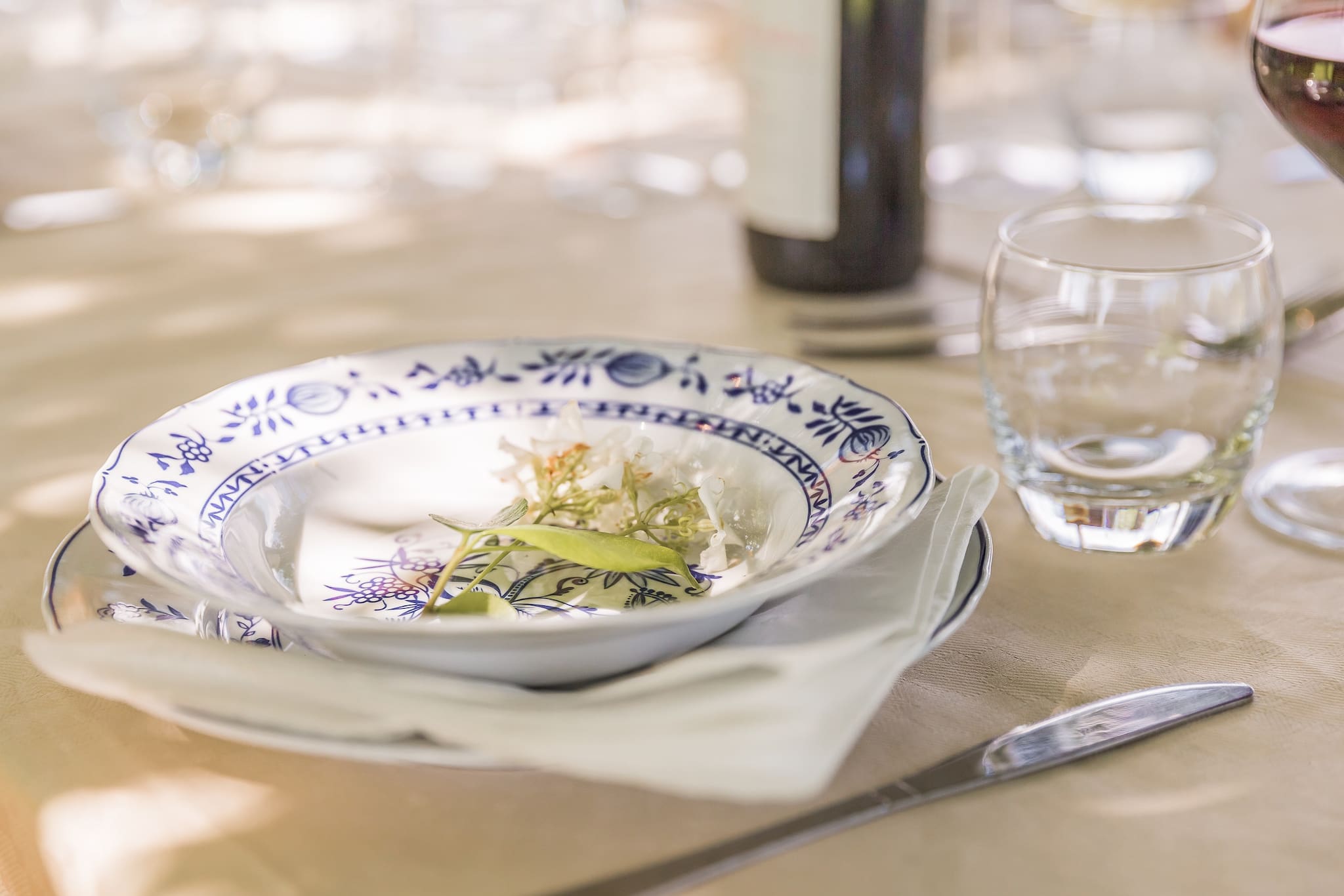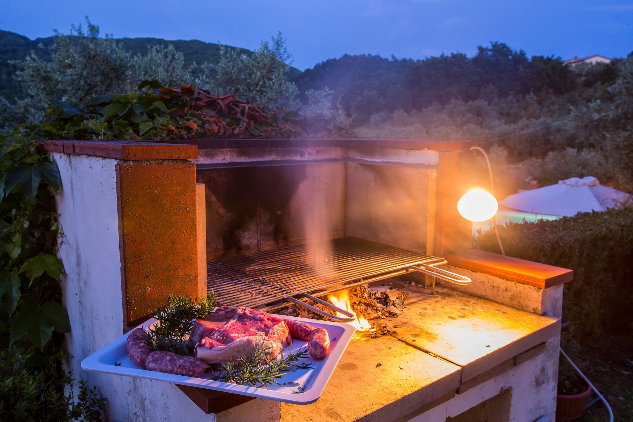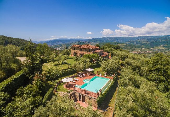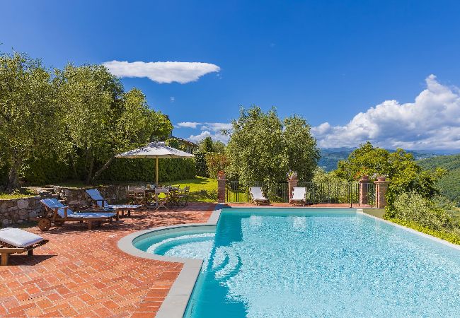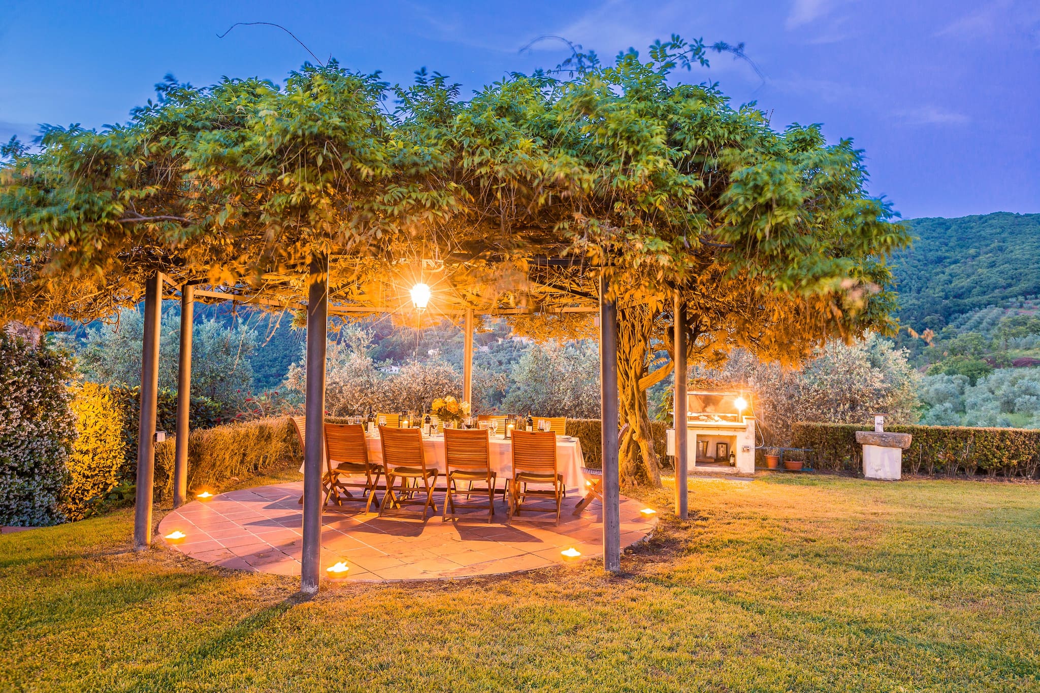 The view that can be enjoyed from the garden is constituted to the north by the main facade of Villa Il Ronco and on the other sides by the hills of olive groves and cypress trees typical of the Tuscan countryside and by chestnut and oak woods.