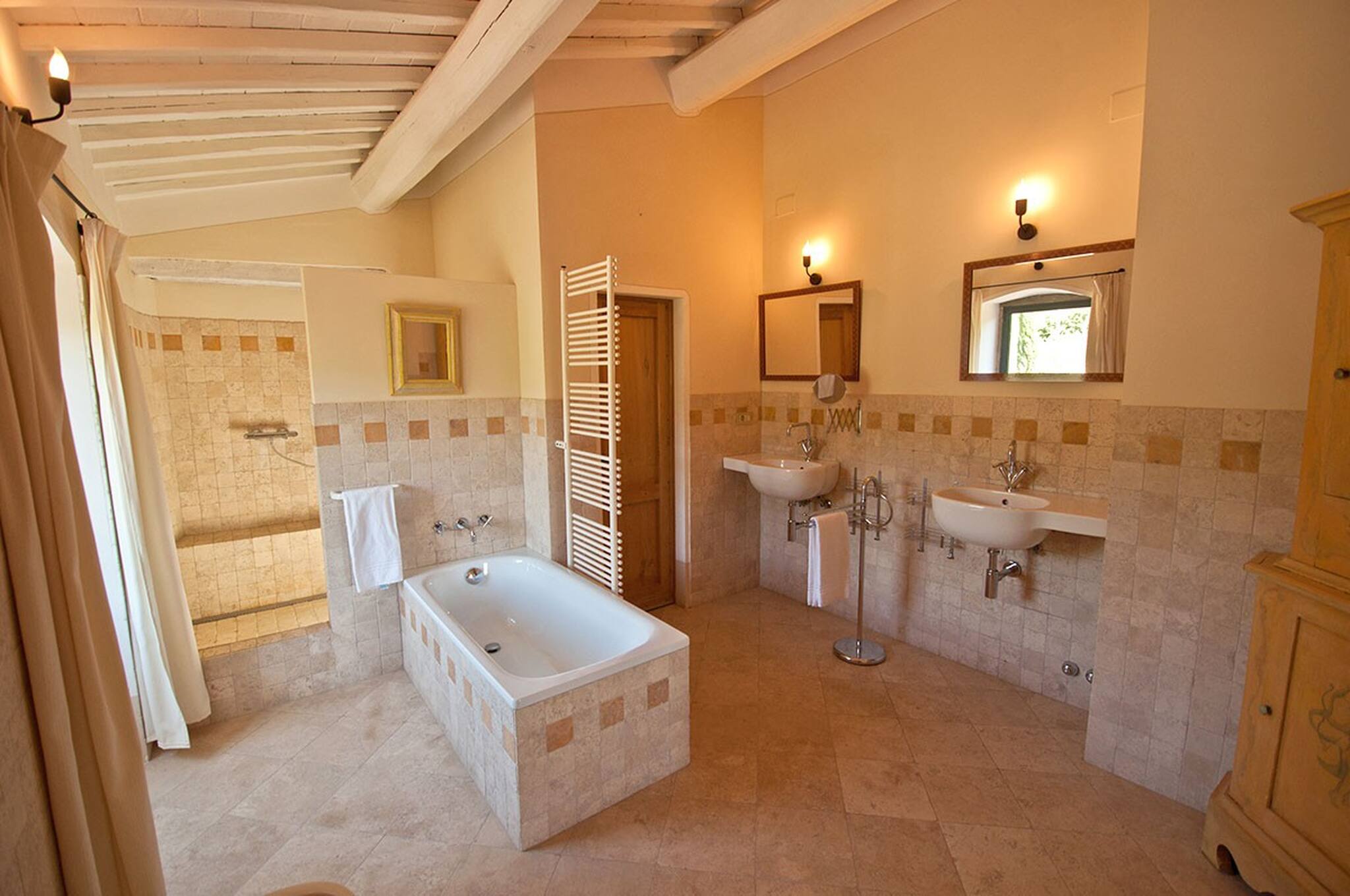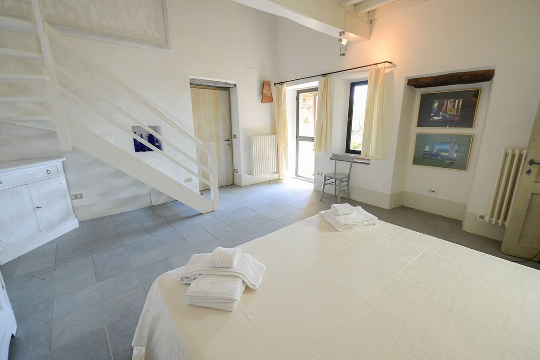 Another double ensuite bedroom with shower and two basins. Another double room in the mezzanine.Terrace with stairs to the garden.