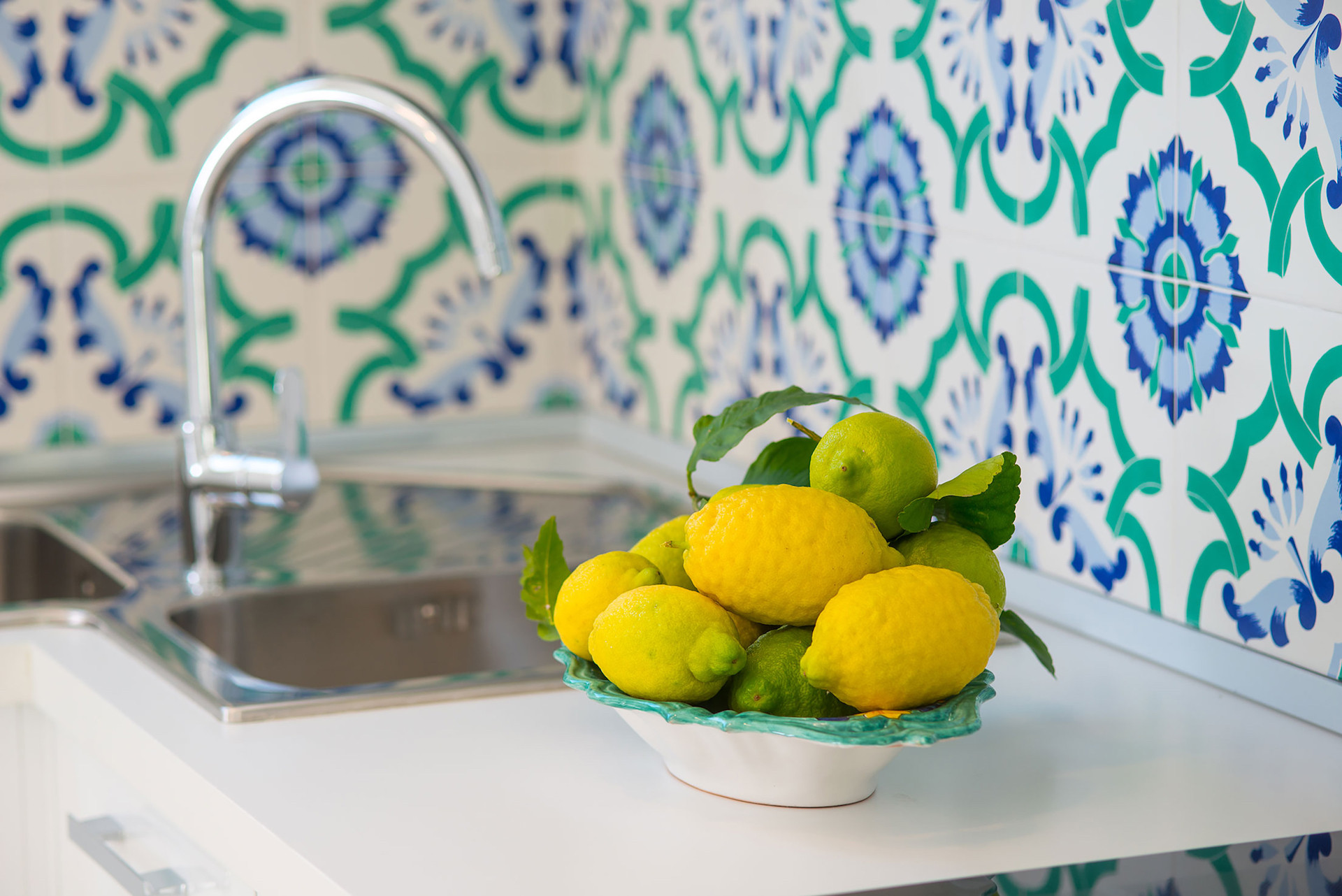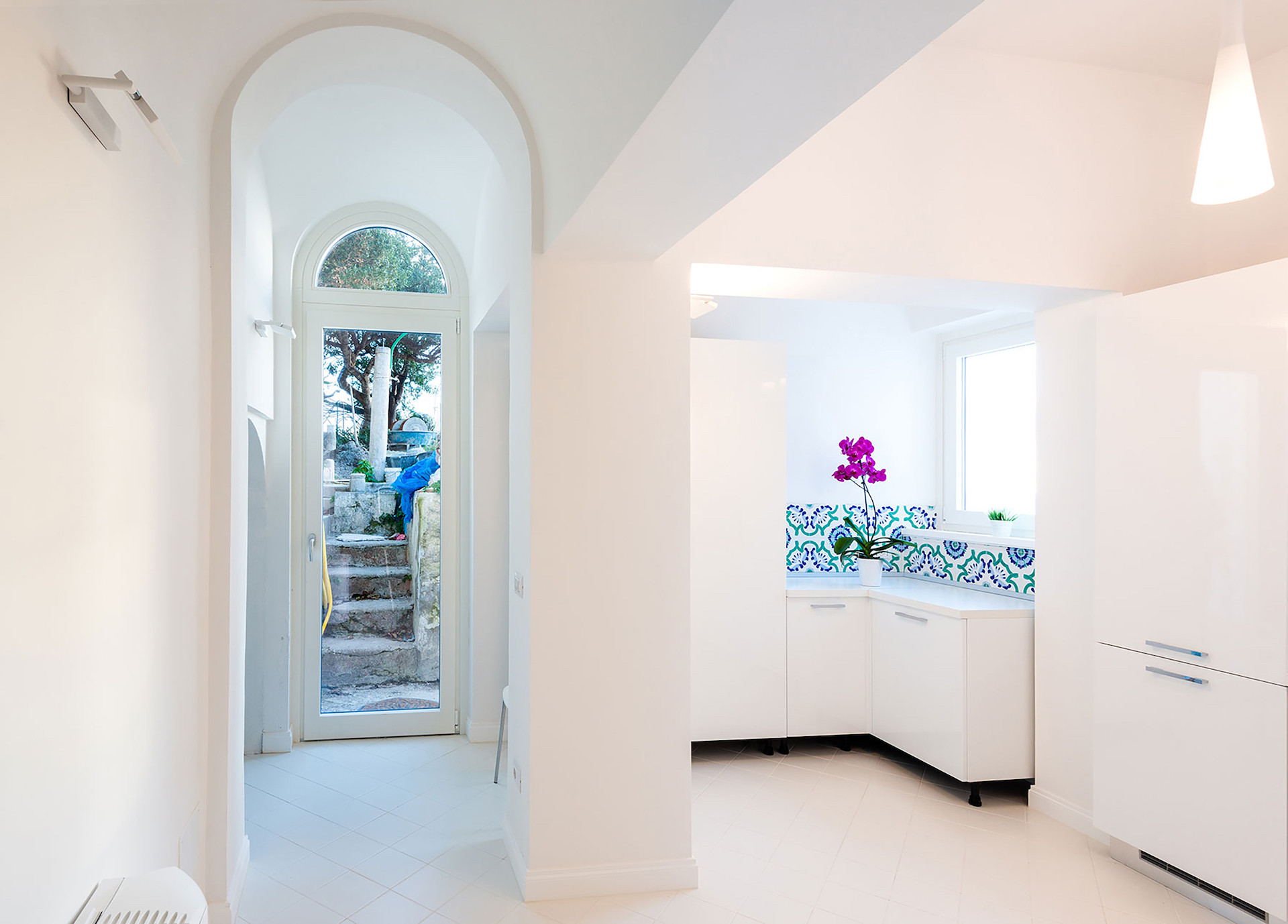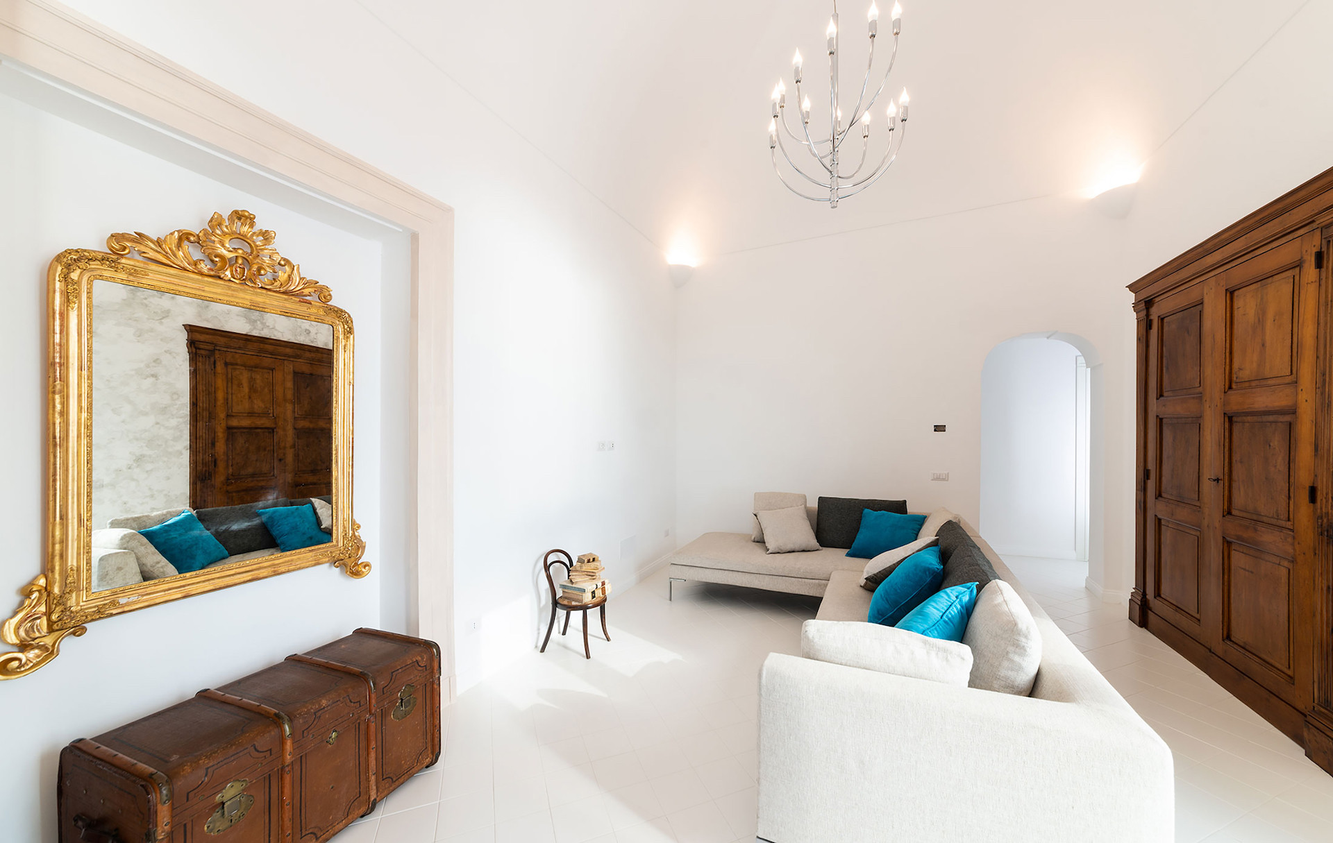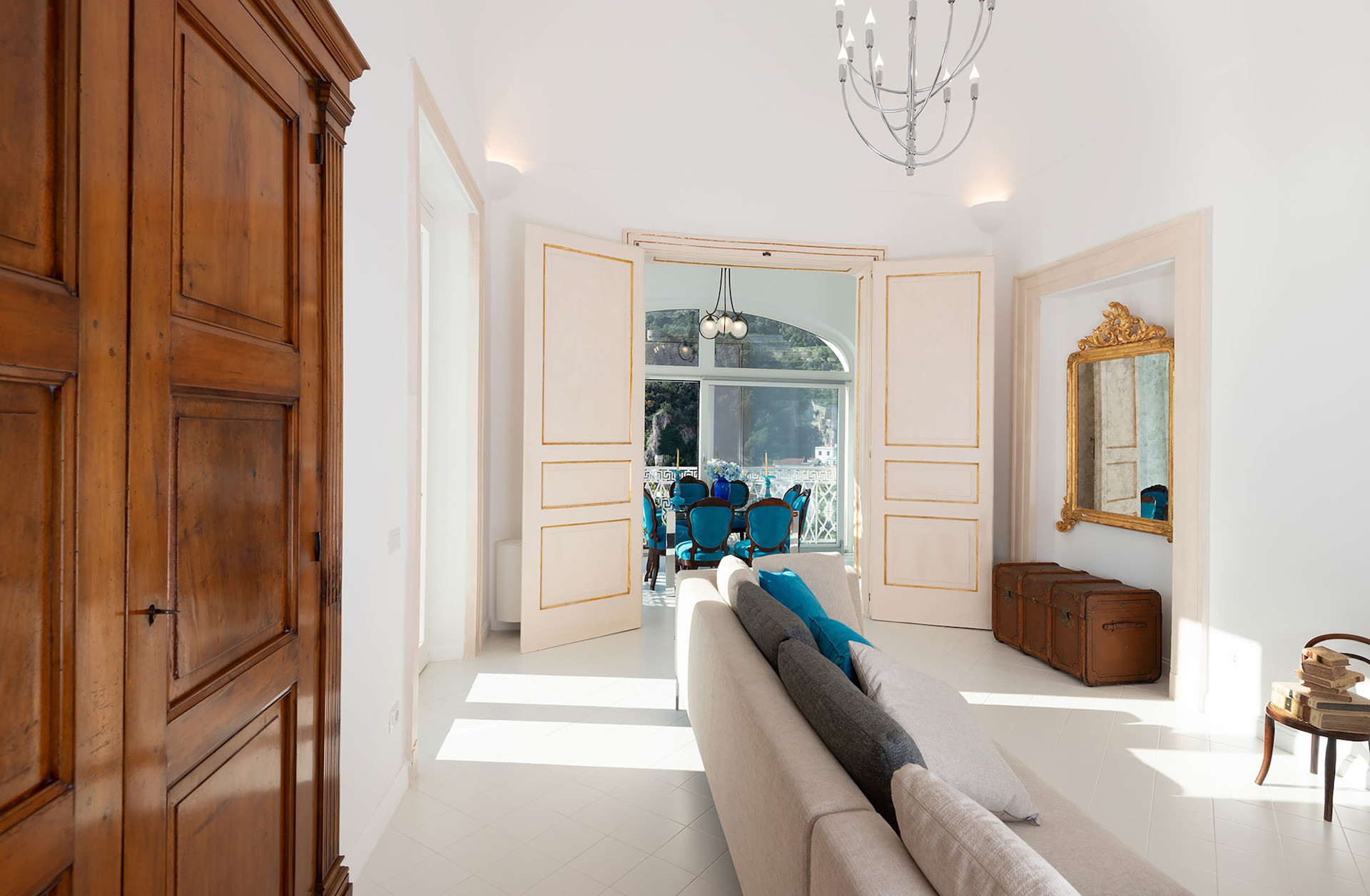 THE LIVING ROOM is bright and elegant with the distinctive Amalfi coast style and a high vaulted ceiling. The furnishings