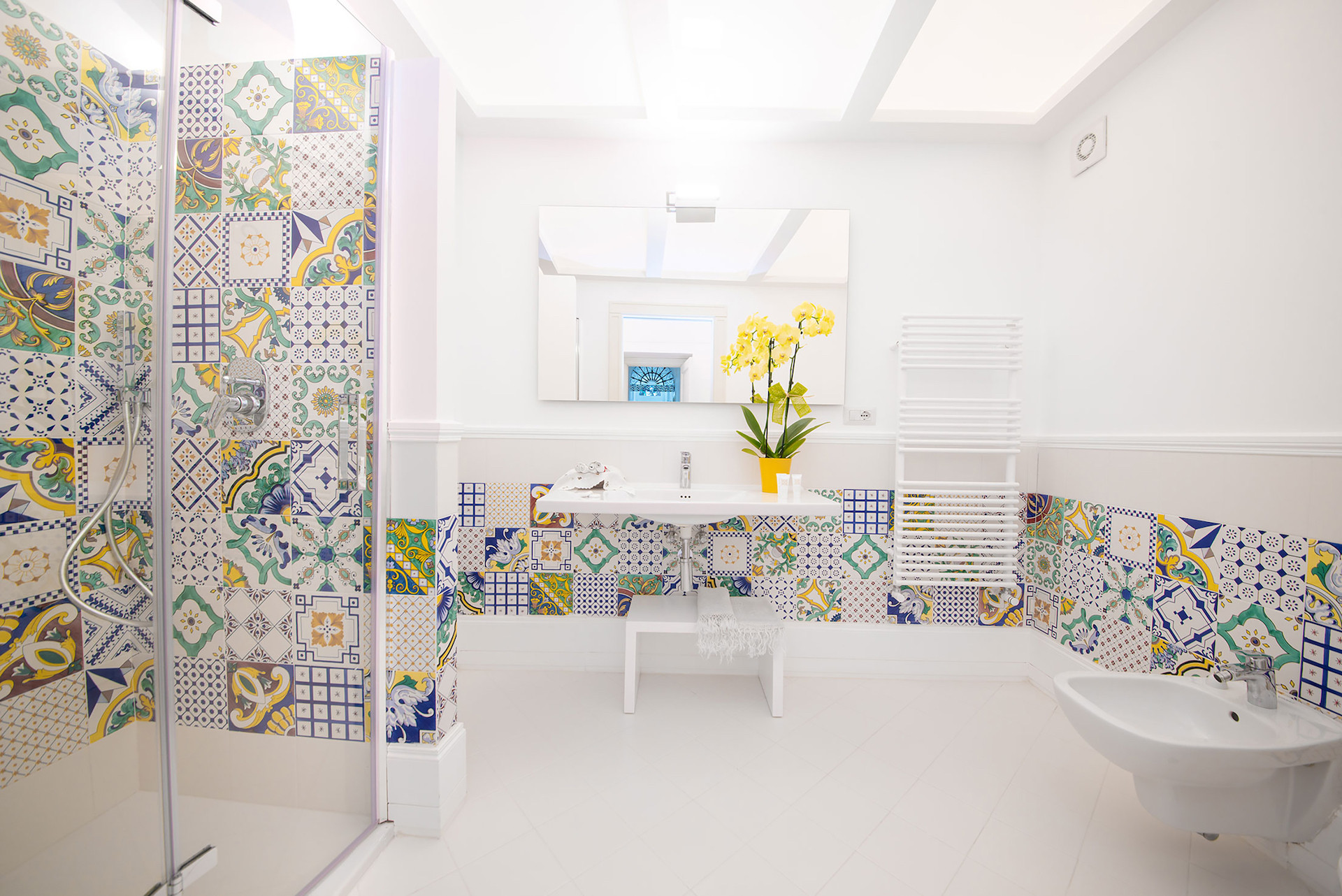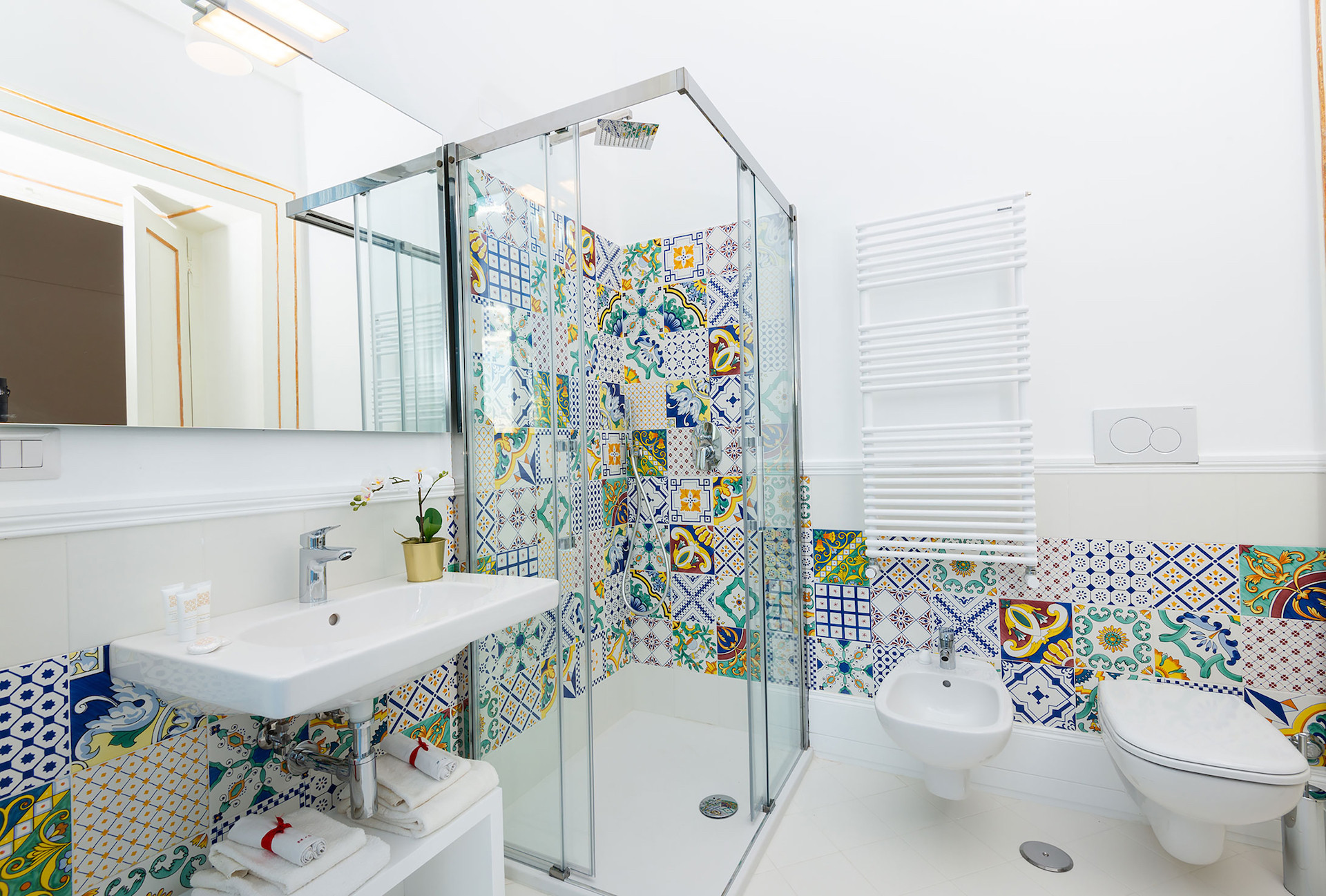 and heating. The bathroom, decorated with polished handmade ceramics, contains a sink, toilet, bidet, shower cubicle and a