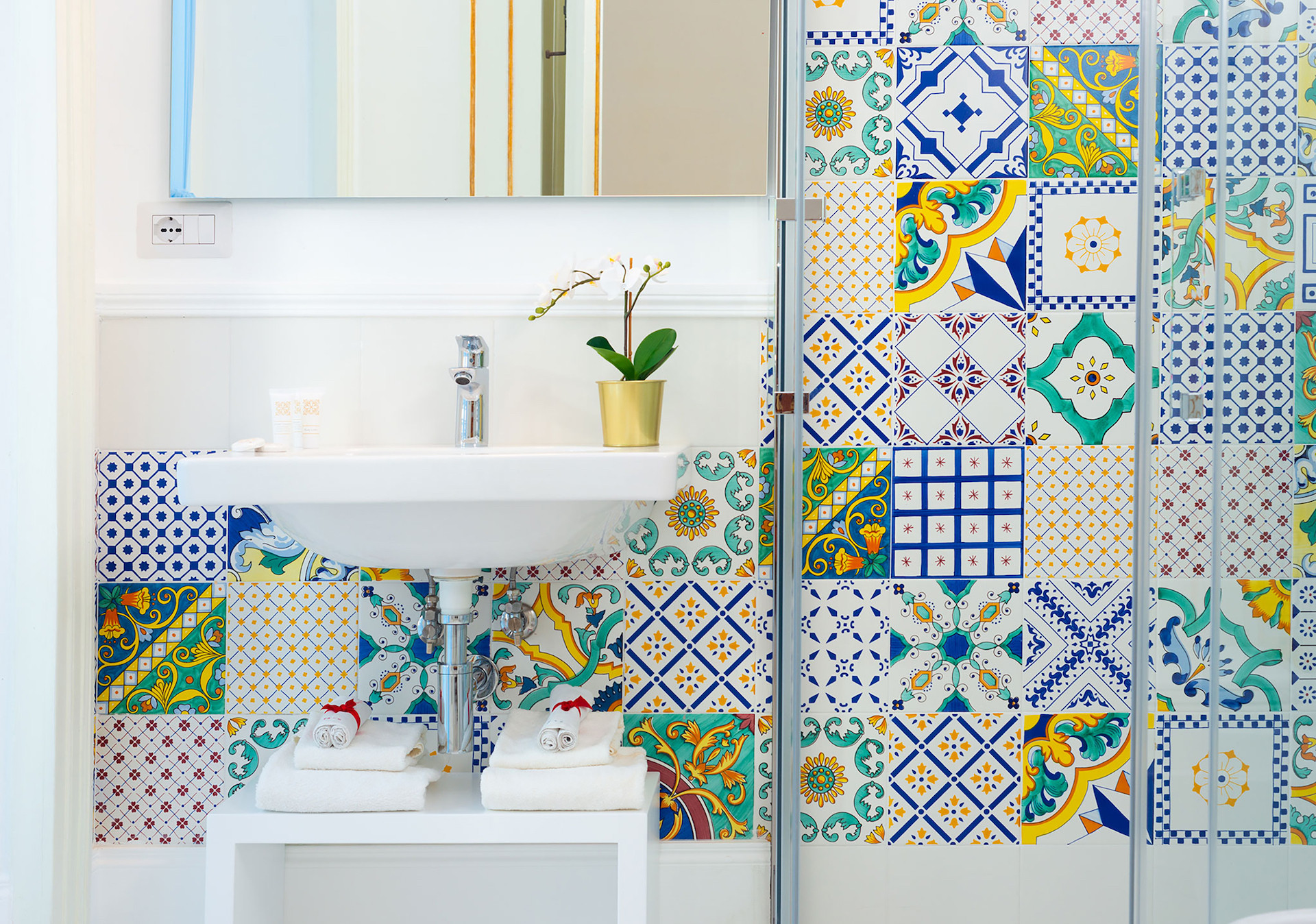 with air conditioning and heating. The bathroom, decorated with polished handmade ceramics, contains a sink, toilet, bidet,