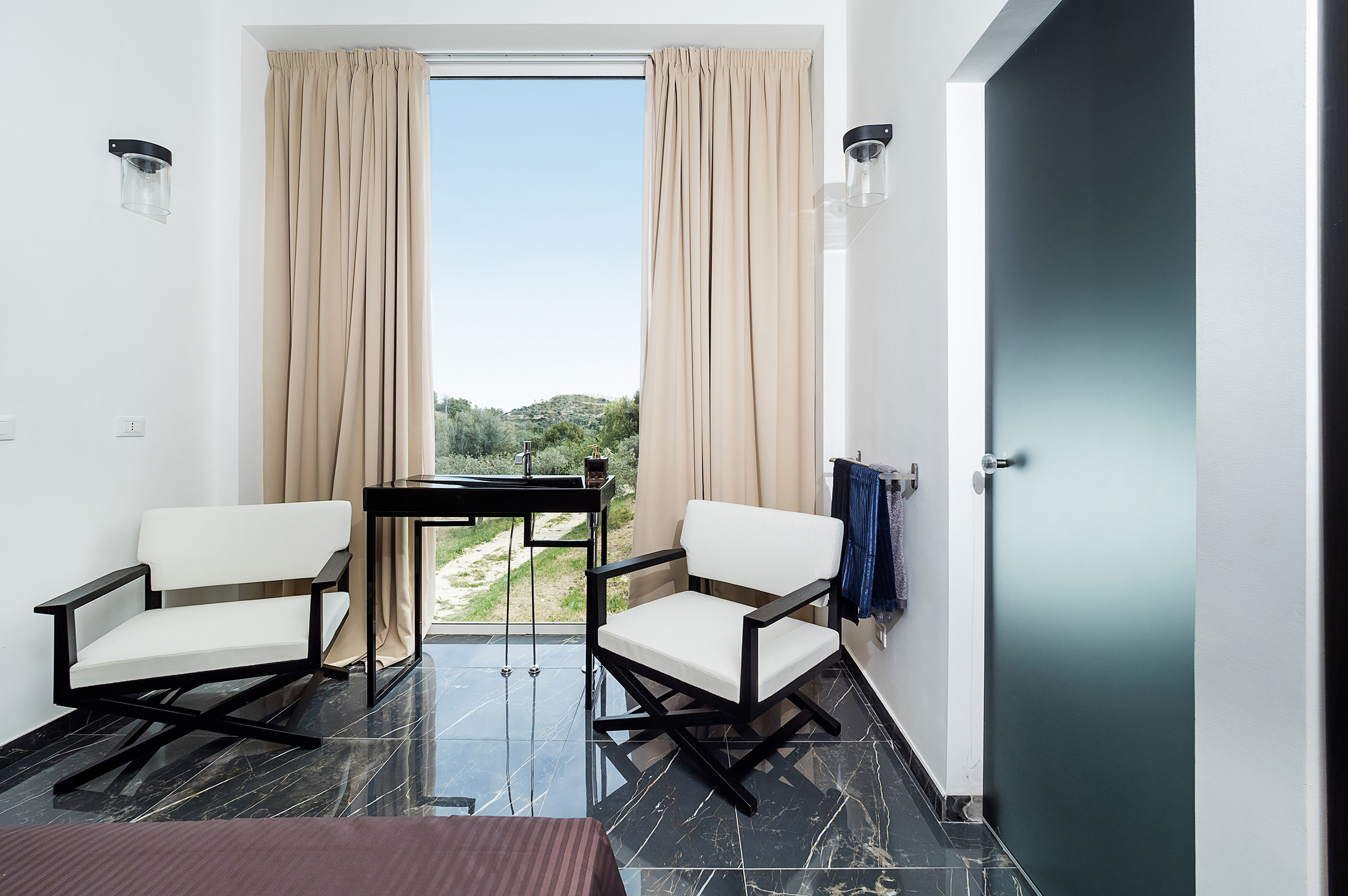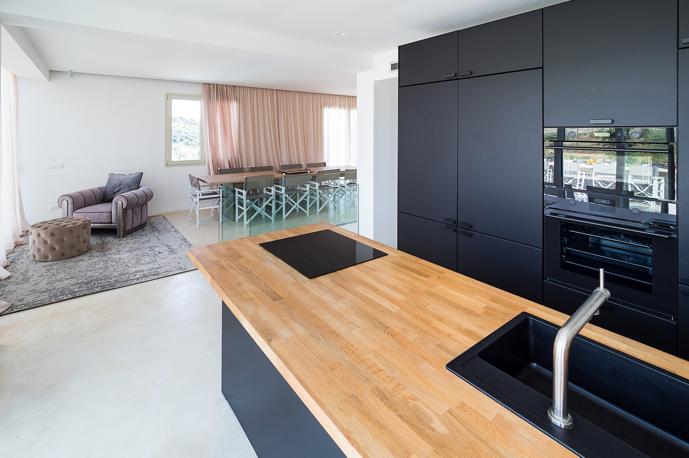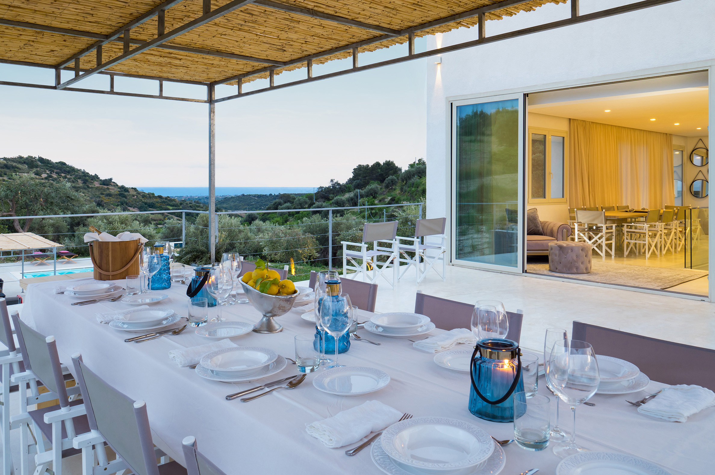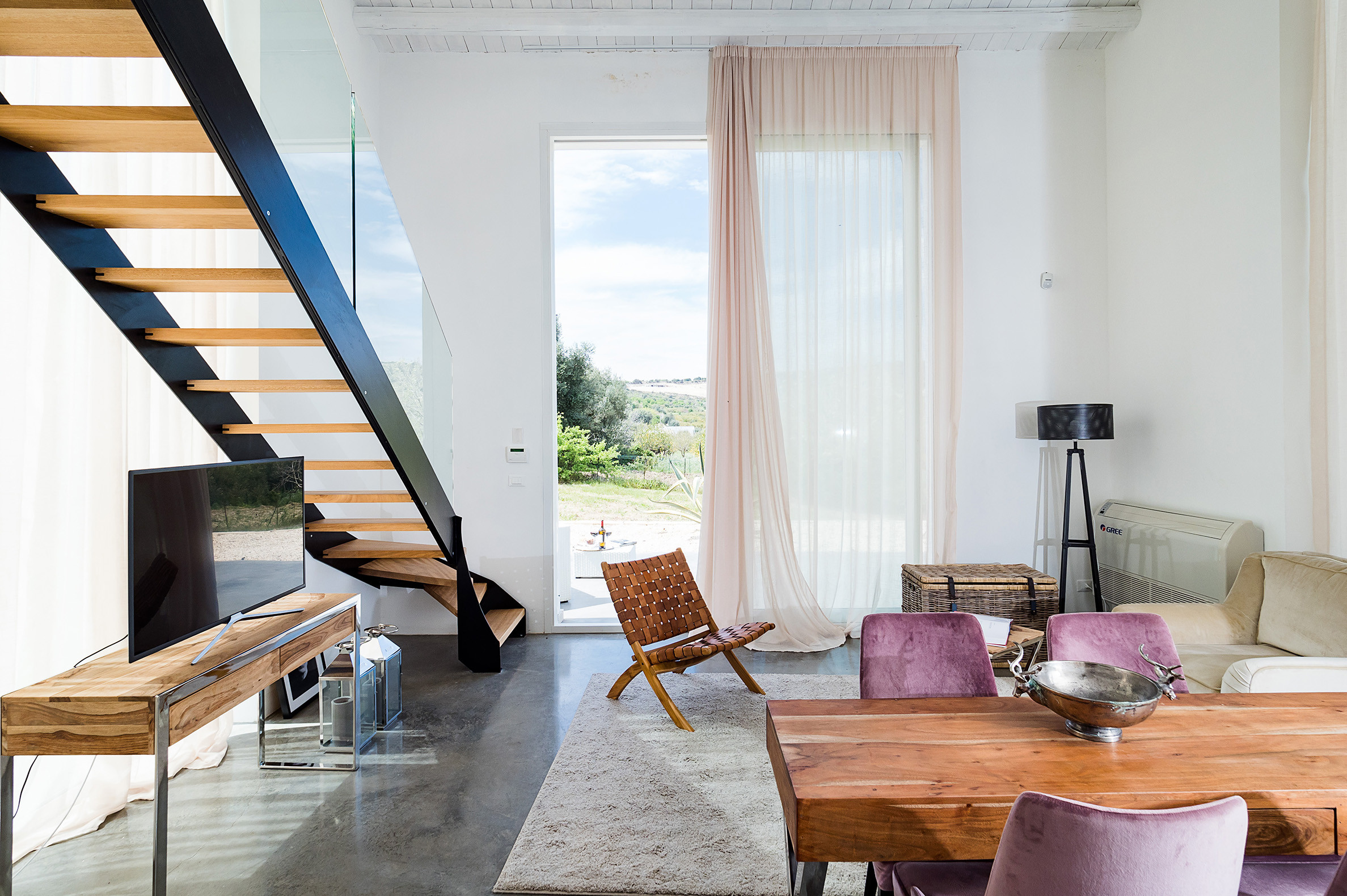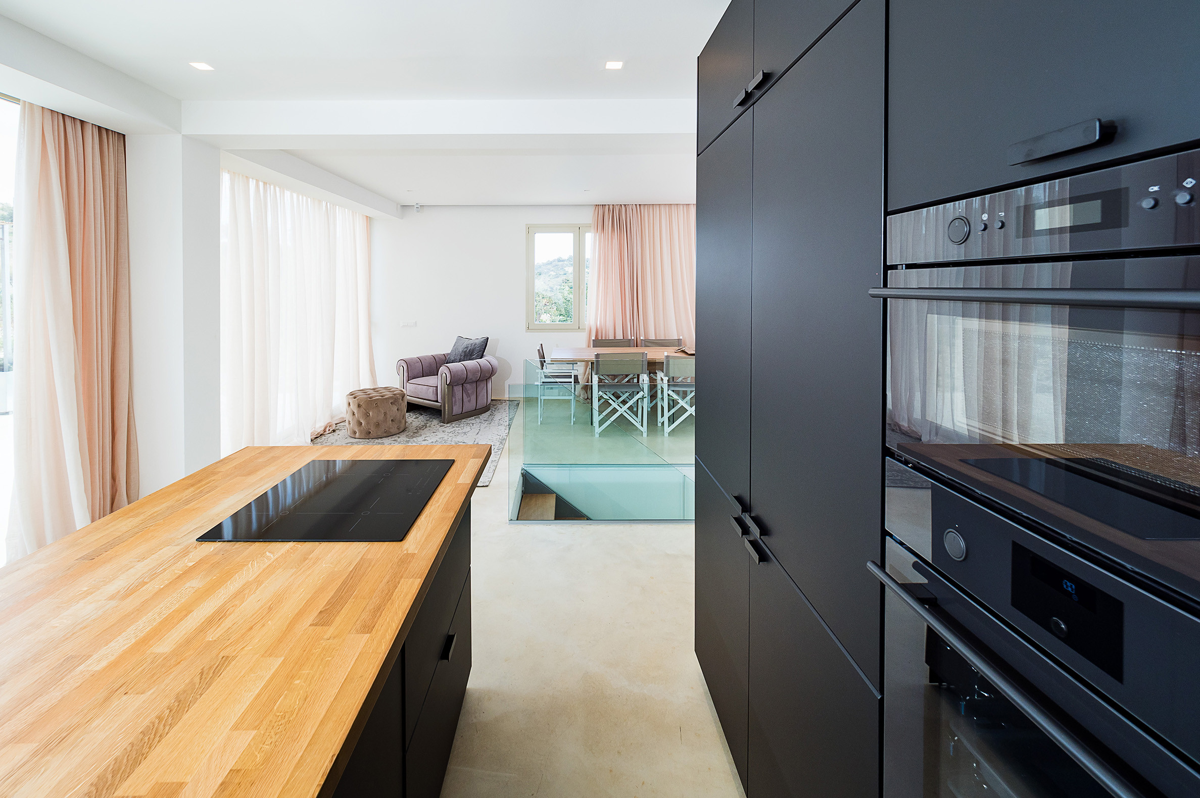 surrounding countryside and the sea. This beautiful scenery can be enjoyed in total relaxation from the characteristic, natural garden, the lovely pool and large, well-equipped terraces. This newly-built, contemporary villa consists of two buildings, both spreading over two floors. The main villa includes on the ground floor two elegant suites with double bed and bathroom with shower. On the first floor, connected with an internal and an external staircase, are a large, bright living area with a sitting and a dining room, a modern kitchen, a guest bathroom and a further double bedroom with en-suite bathroom. The annex includes on the ground floor a living room with kitchenette, a small single bedroom and a bathroom, and on the first floor is the fifth bedroom with en-suite bathroom.