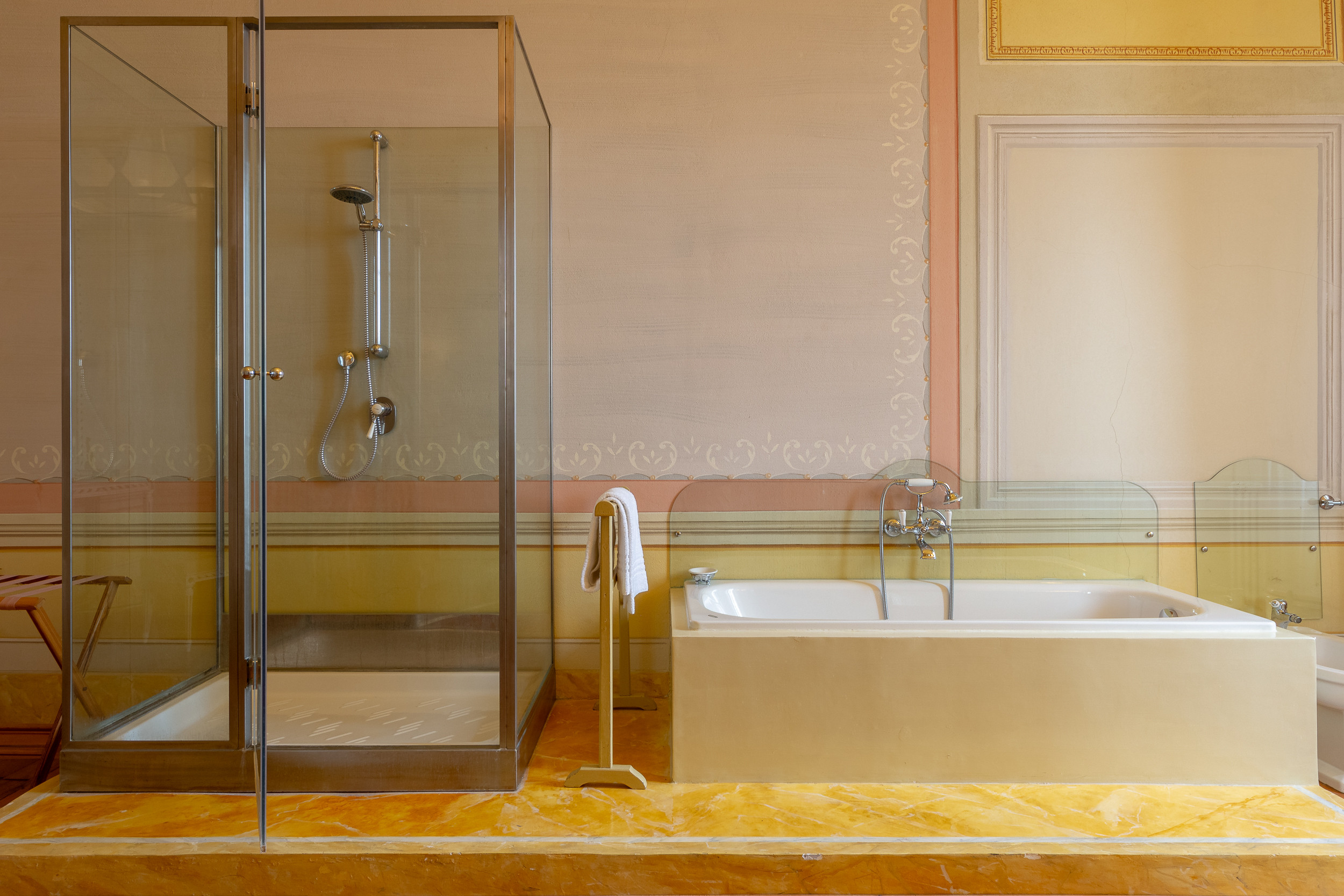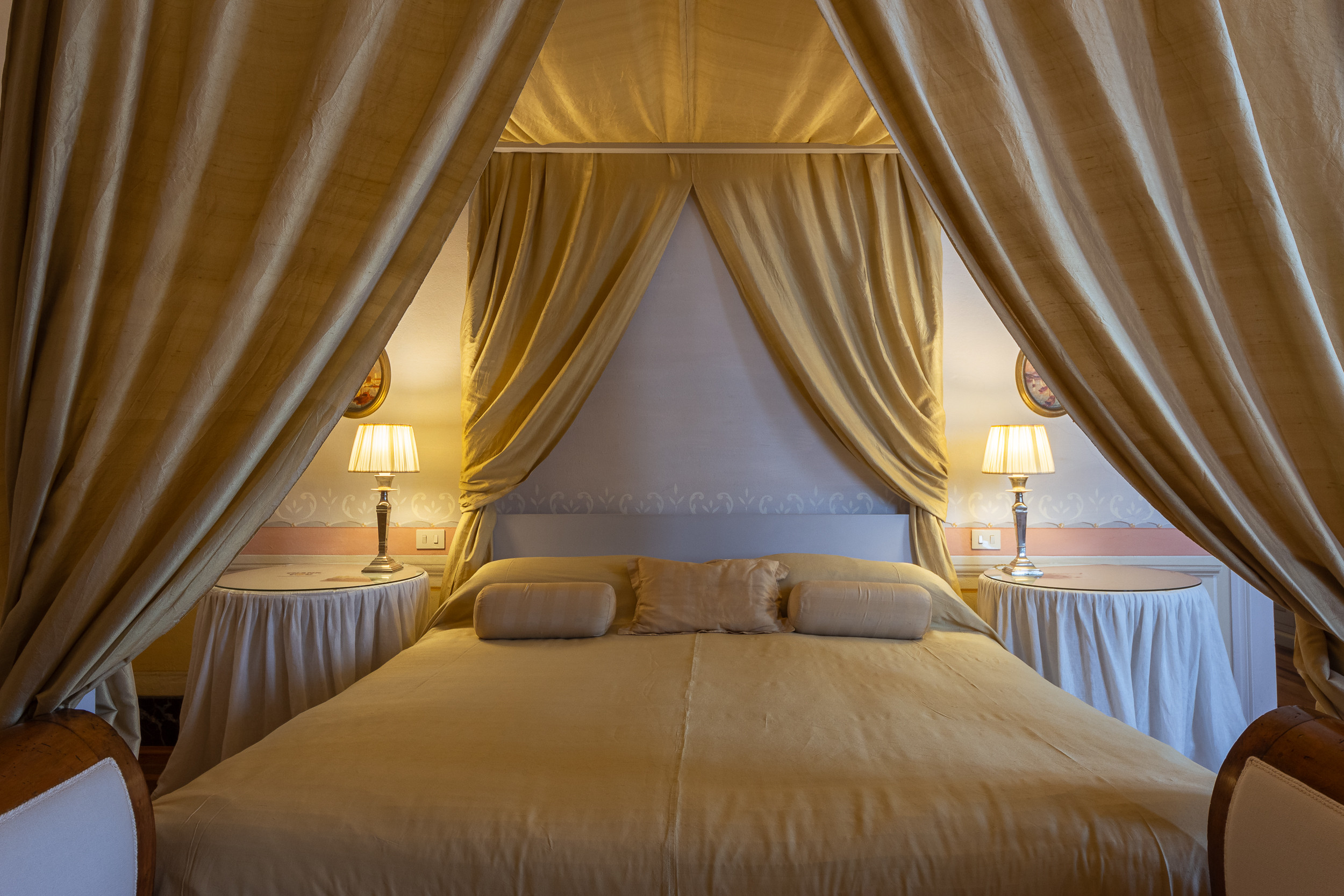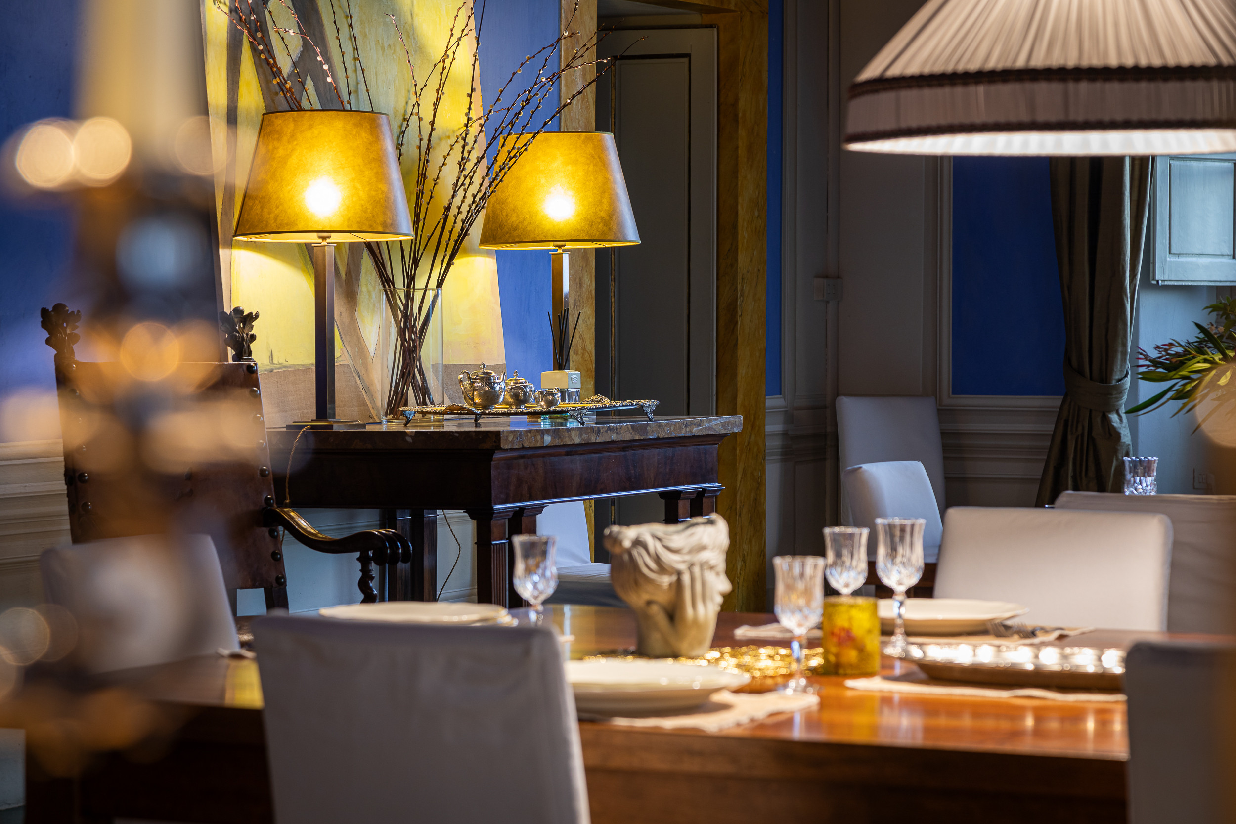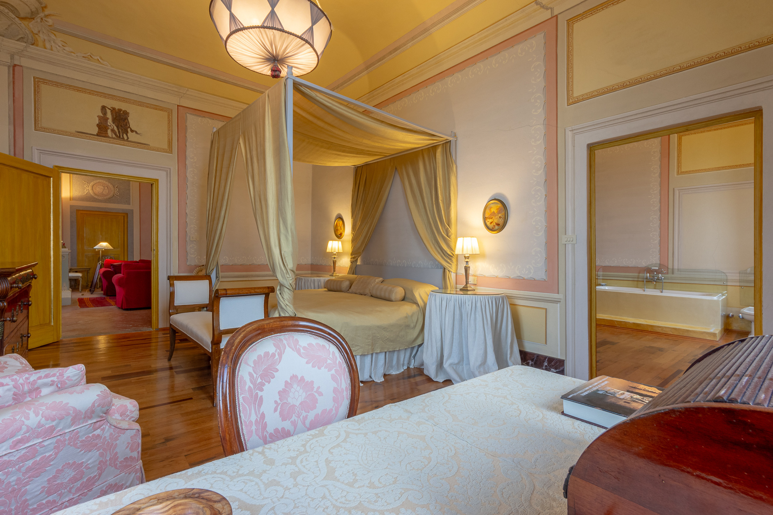 On the ground floor there are magnificent lounge and dining rooms, bright, elegant and furnished with fine furniture, as well as the splendid Ballroom characterized by a coffered ceiling, a large Renaissance fireplace and on painted floor. Next to it, the nineteenth-century library which overlooks the romantic garden through two large French windows. Here guests can decide to immerse themselves in reading, surrounded by the silence and peace of the countryside, enjoying a good cup of tea and letting themselves be lulled, if they wish, by a background of classical music.