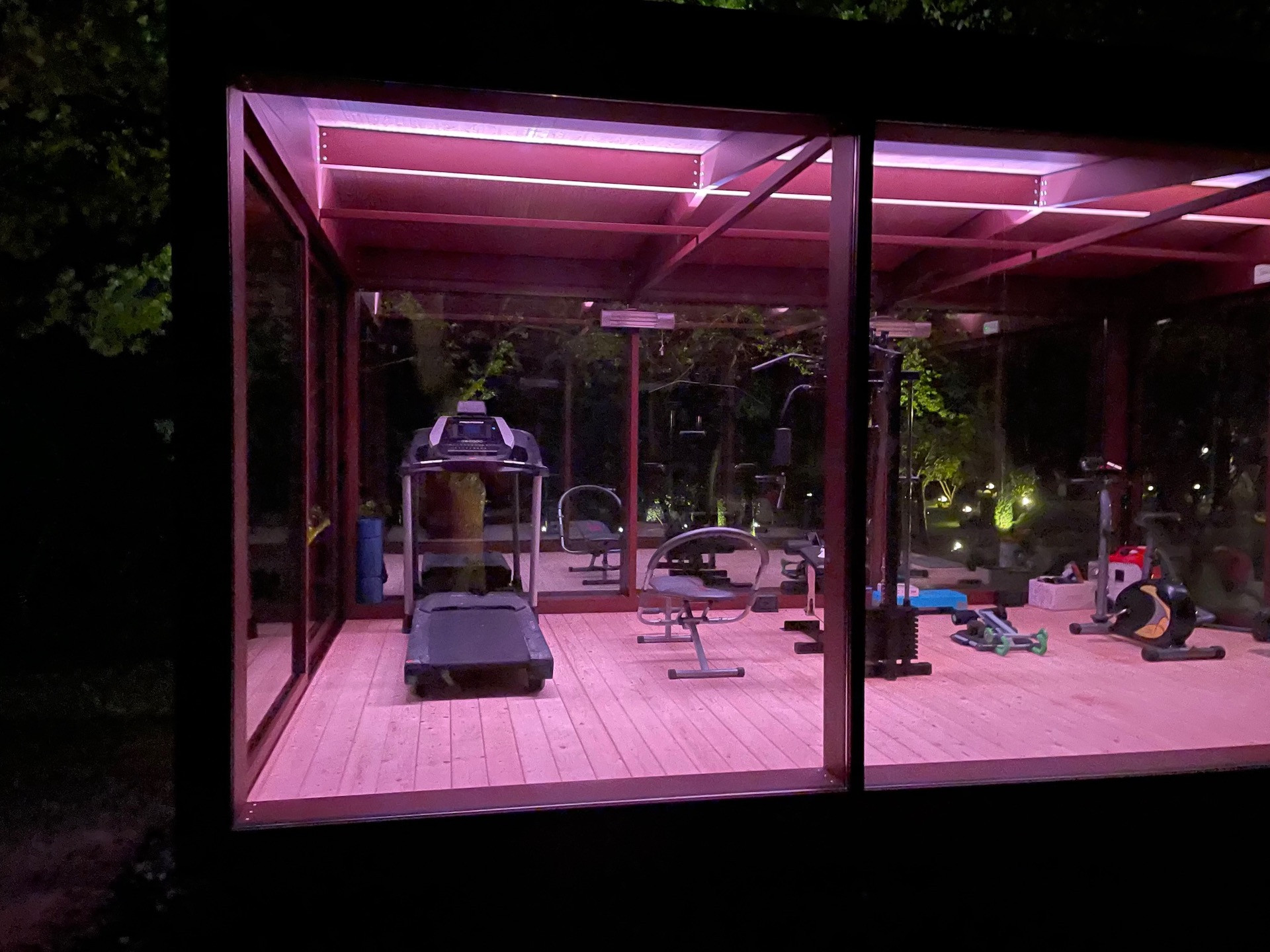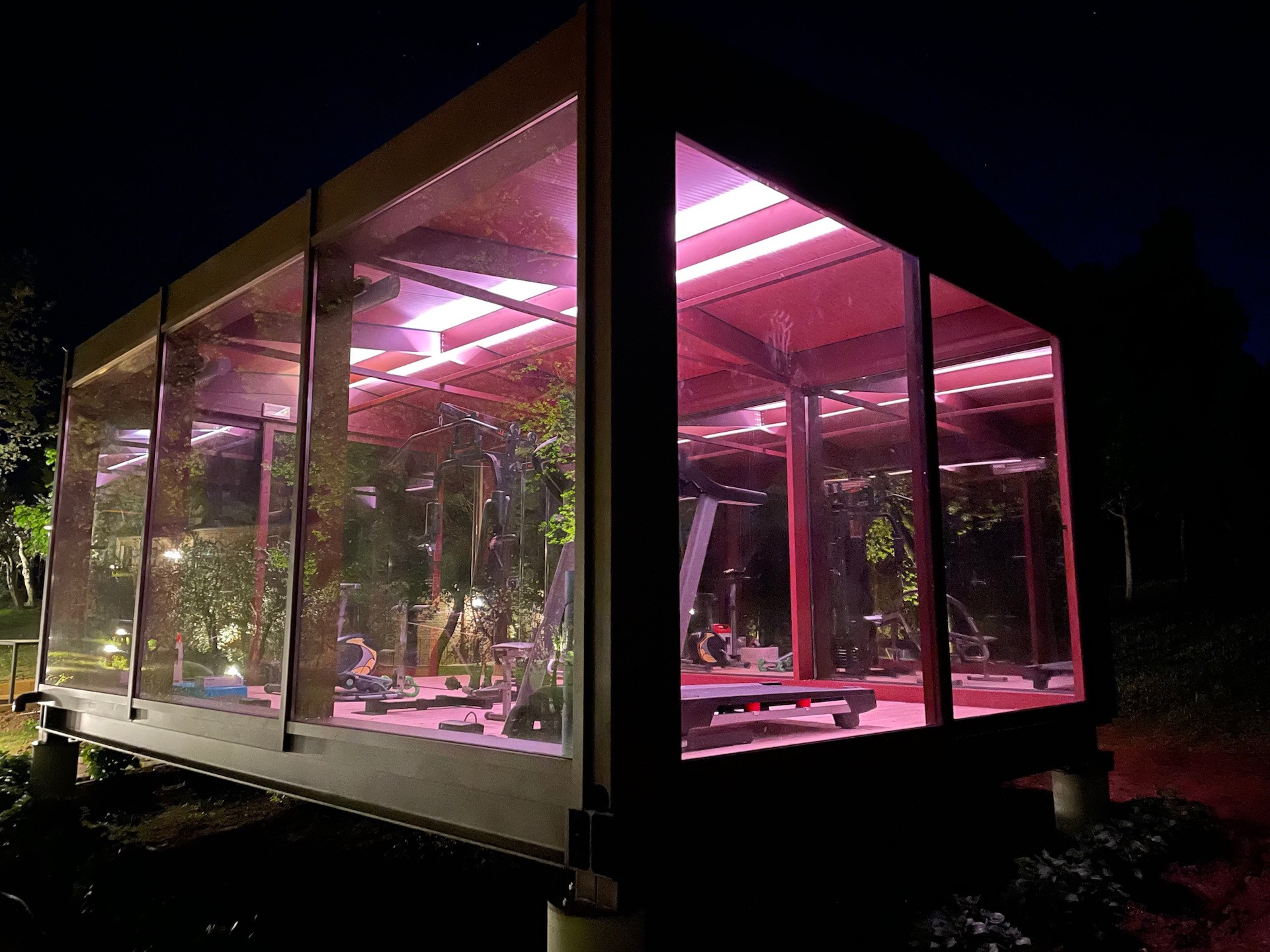 In the middle of the park there is another “pearl”, a gym room on a high level base with all-glass walls, which gives you the impression to use your gym in an open air and while you do your exercises you can enjoy the nature all around you. In the night then some special colored leds bring you in a….magic fairy tale!