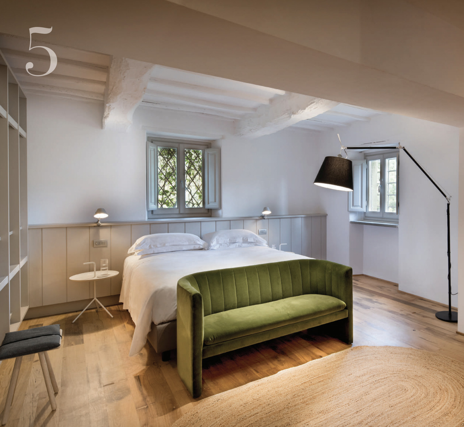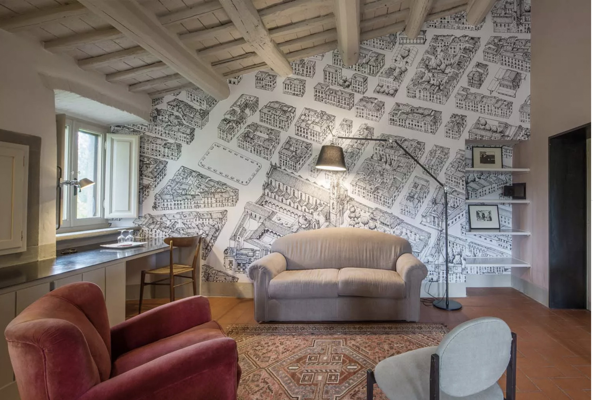 In each room, a mini-library of illustrated books and objets d’ art by Florentine ceramic designer Bitossi add to the feeling of homeliness and comfort. Striking wall art by Simone Boni, showing the nine neighbourhoods of medieval Florence makes each light and airy room unique.