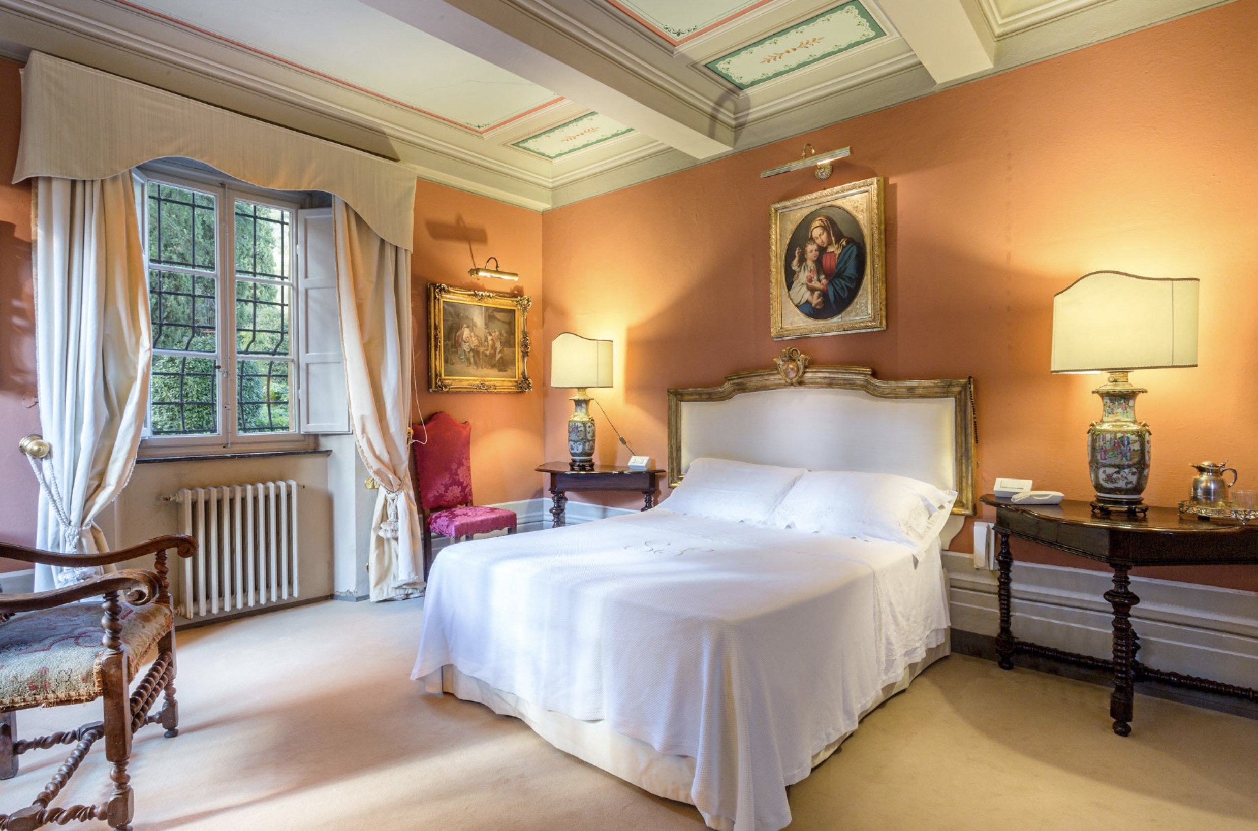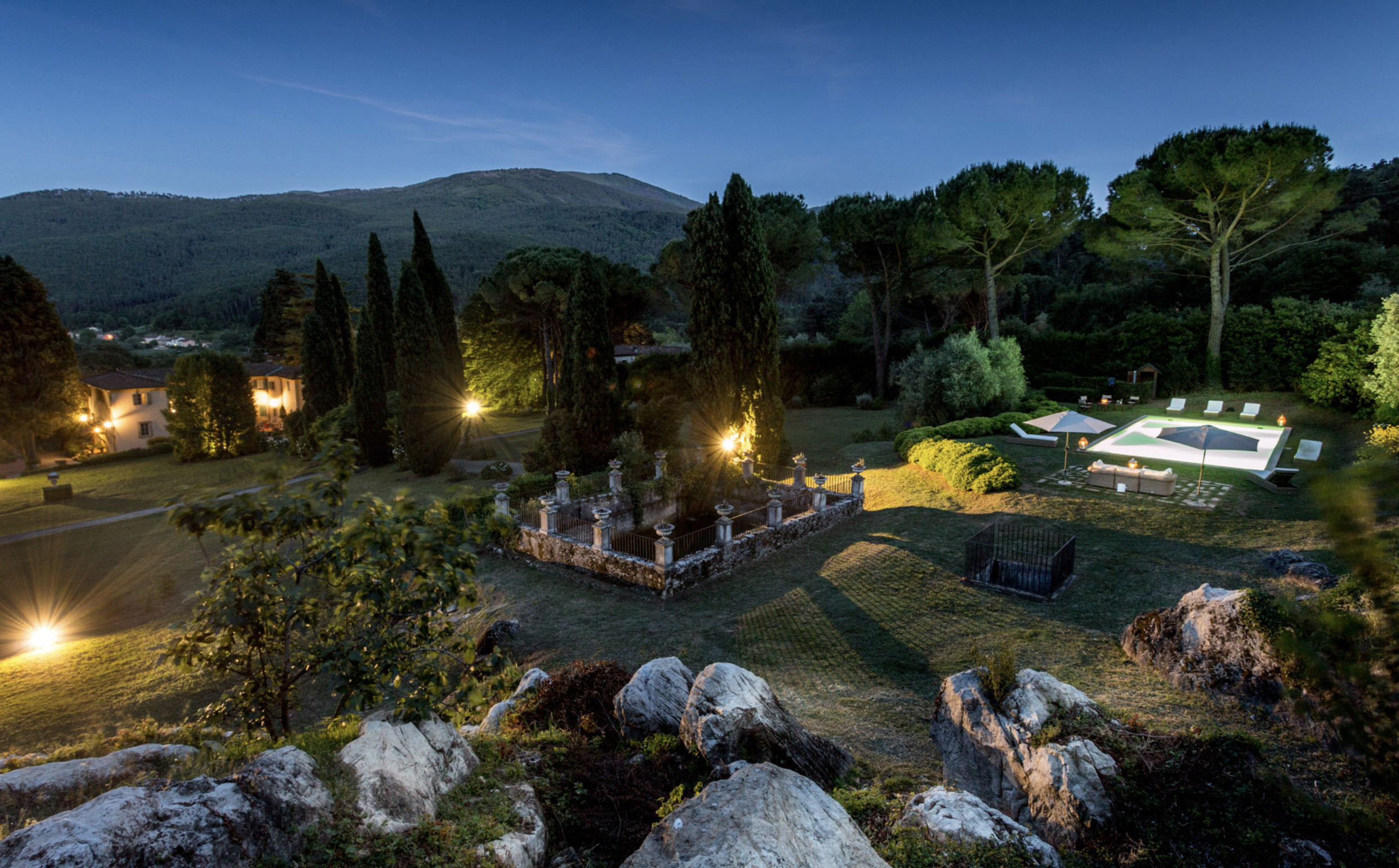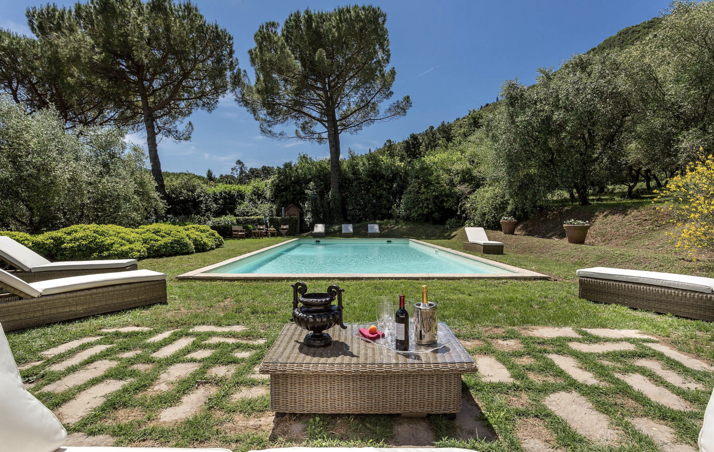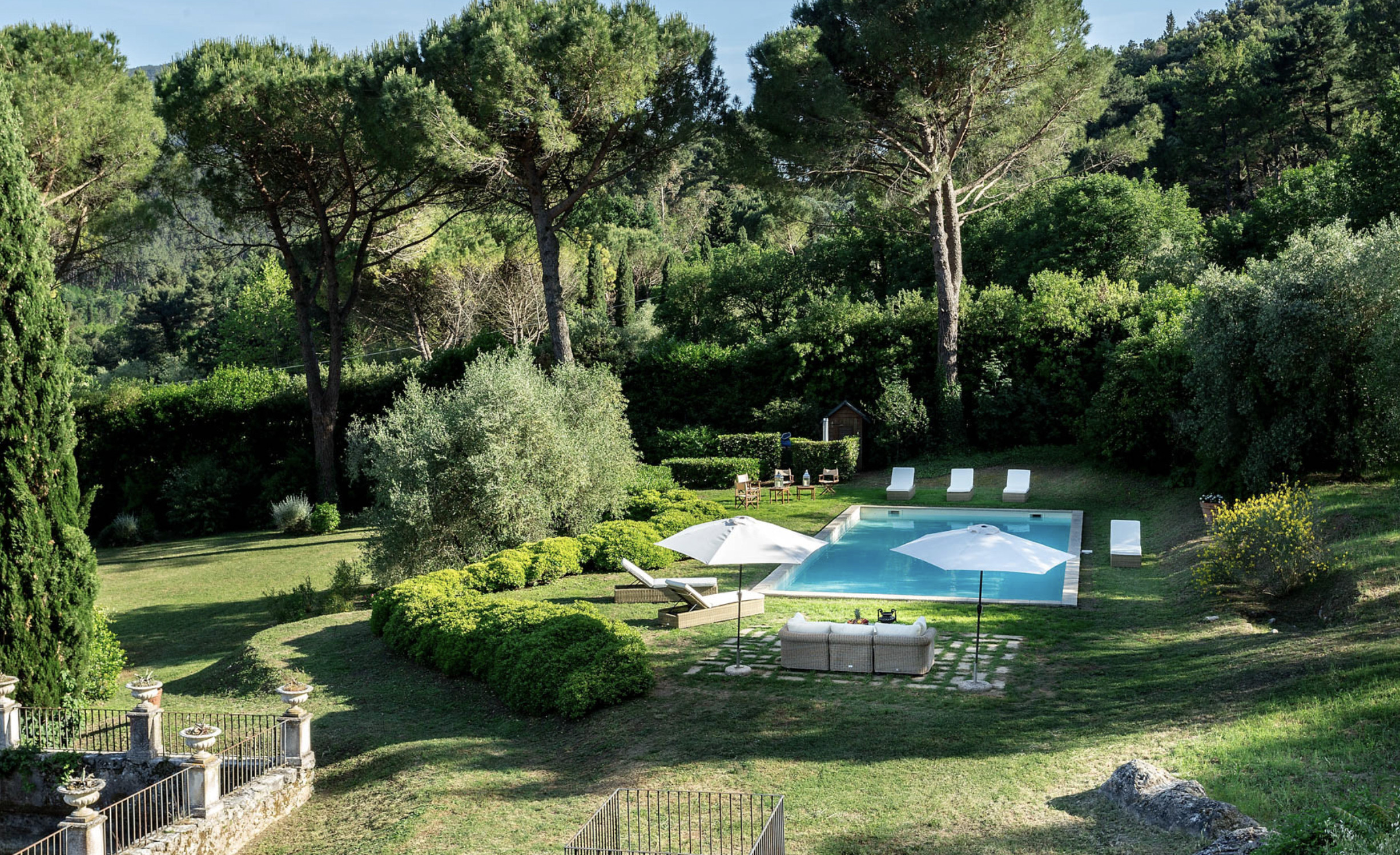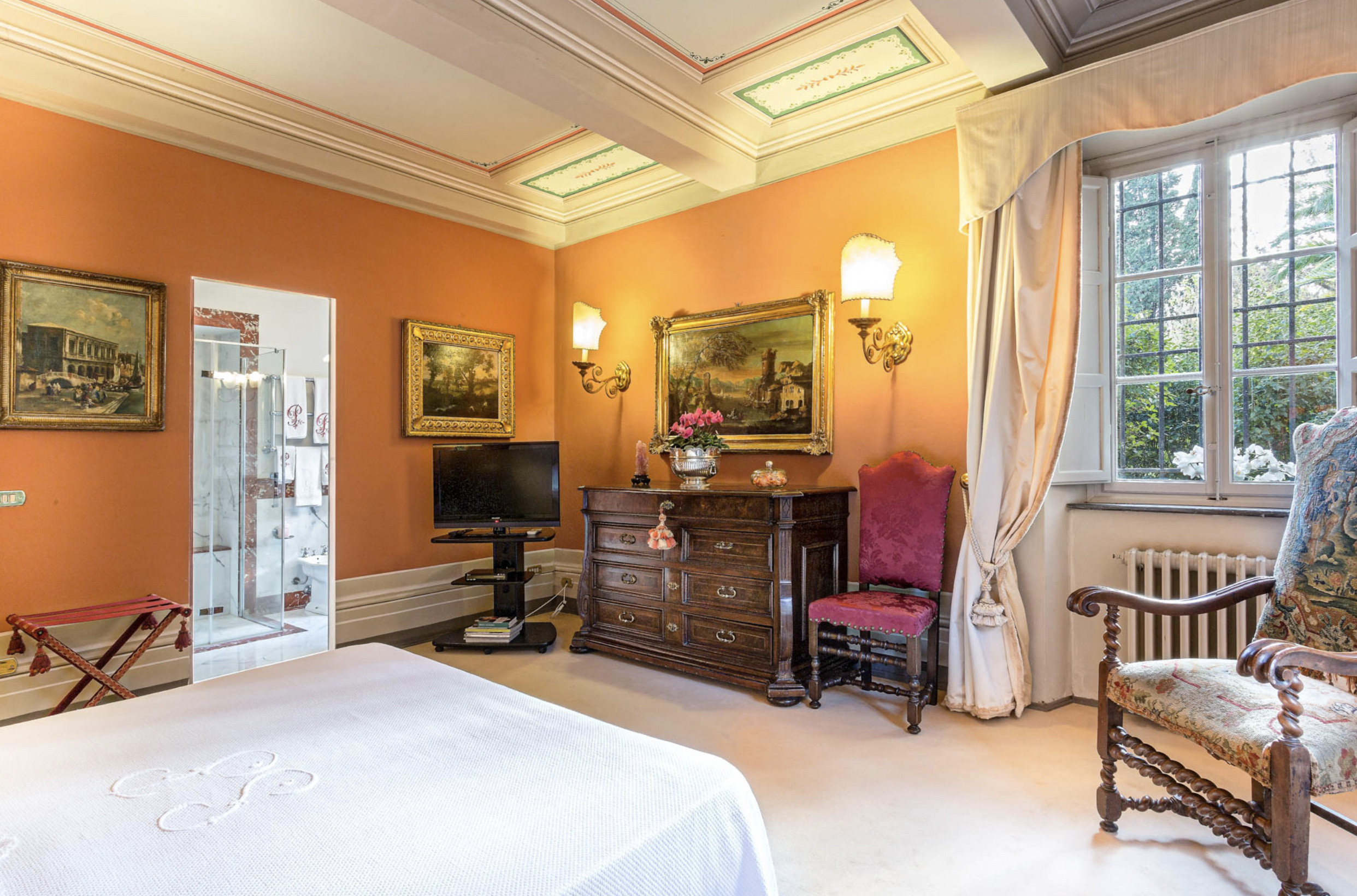 Villa has been superbly restructured, all the rooms have period furnishings, flanked by the modern of TV, satellite and internet. The internal beauty and elegance of the villa is harmoniously balanced with the external space which is made up of a stunning beautifully-kept park with a garden, ancient trees and a small patio. In the middle of the park is situated a swimming pool (14 x 6) well equipped with umbrella and sunbeds. Back to the villa there is table and chairs for meals “ al fresco” and a large sun umbrella.