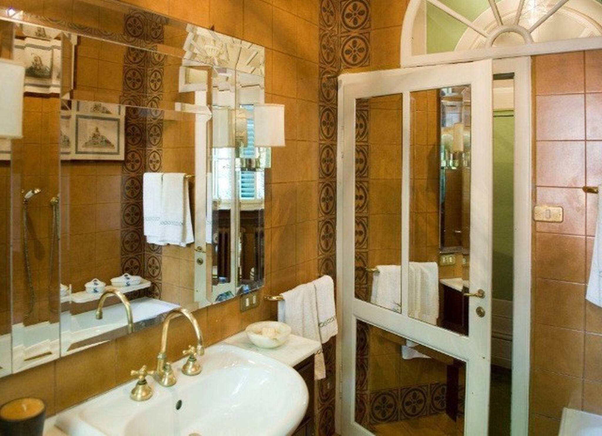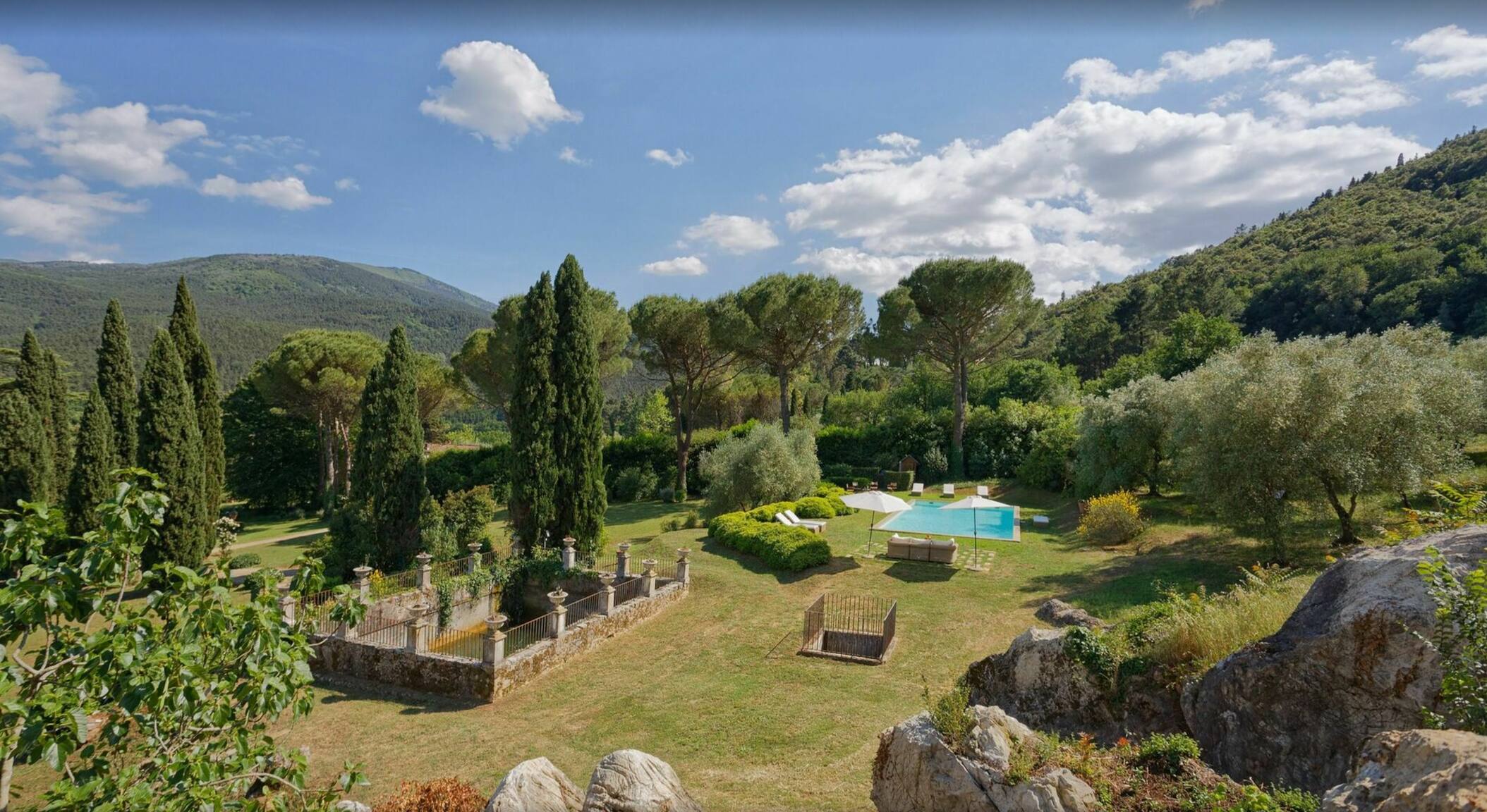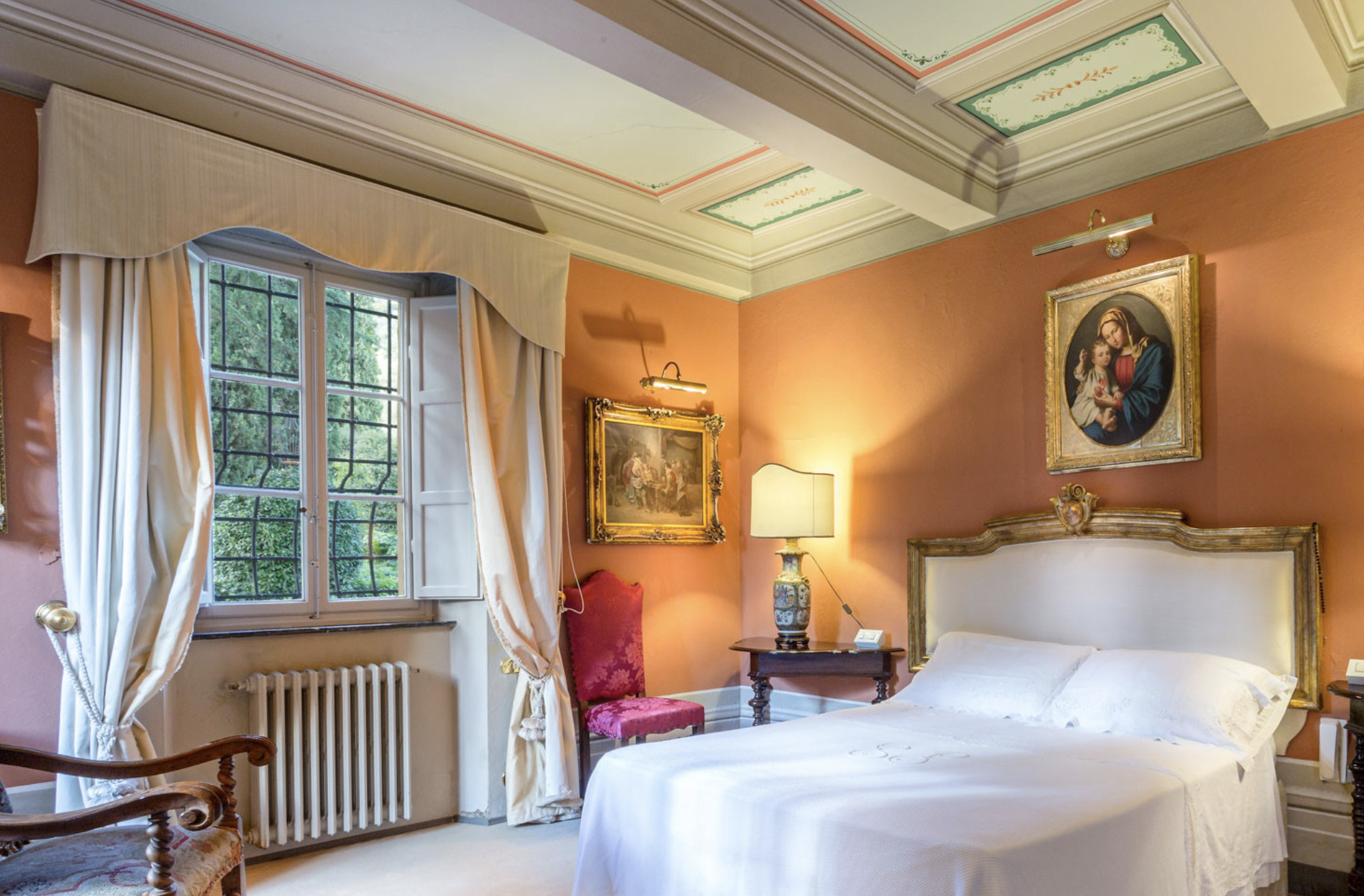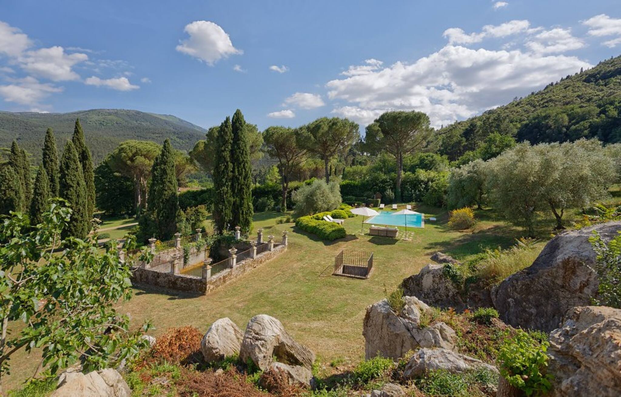 Villa has been superbly restructured, all the rooms have period furnishings, flanked by the modern of TV, satellite and internet. The internal beauty and elegance of the villa is harmoniously balanced with the external space which is made up of a stunning beautifully-kept park with a garden, ancient trees and a small patio. In the middle of the park is situated a swimming pool (14 x 6) well equipped with umbrella and sunbeds. Back to the villa there is table and chairs for meals “ al fresco” and a large sun umbrella.