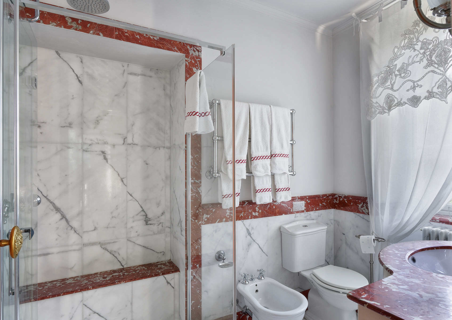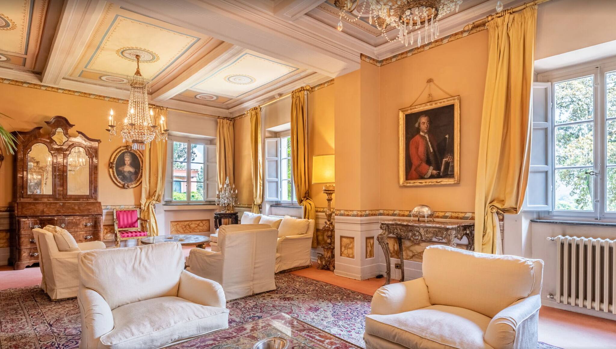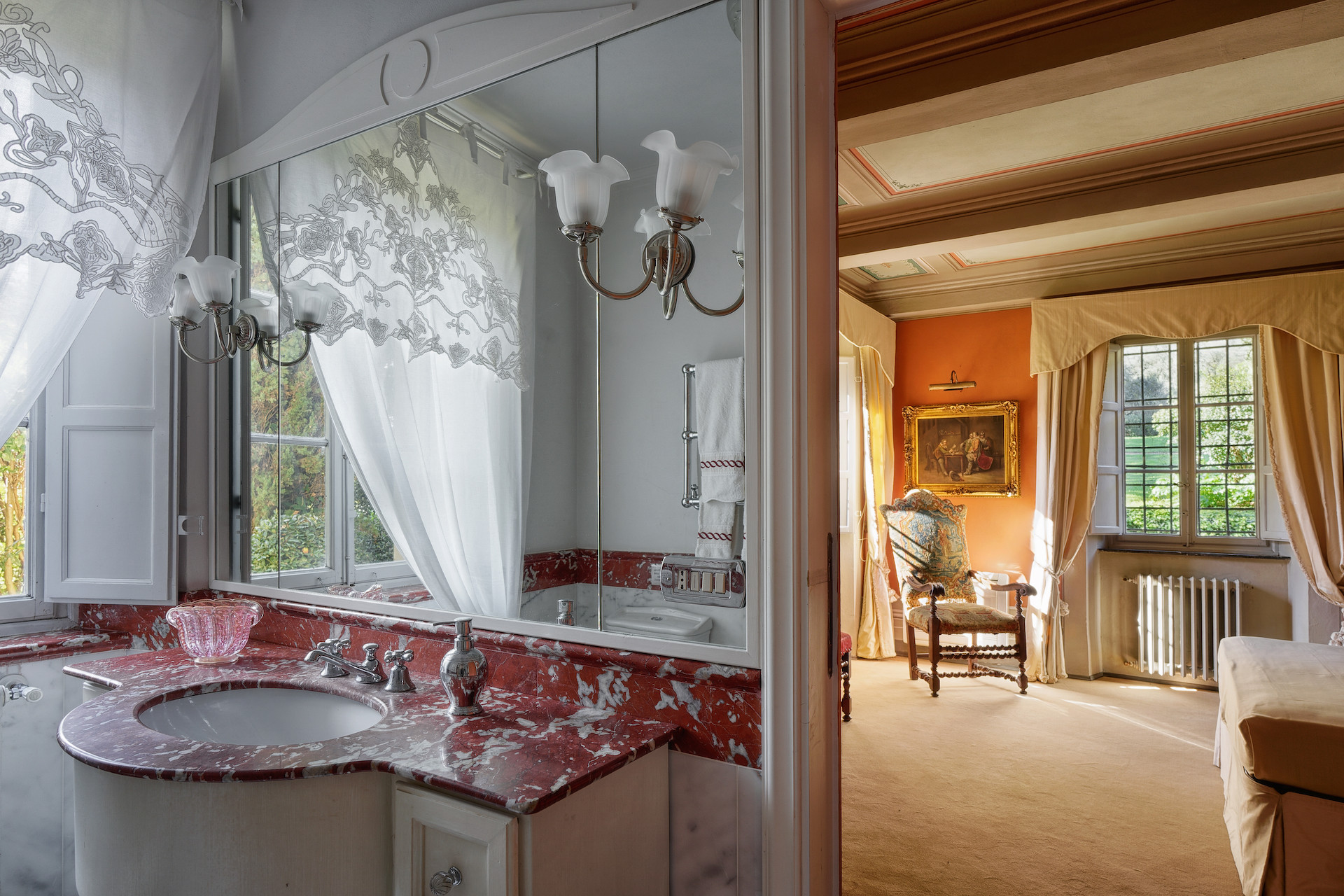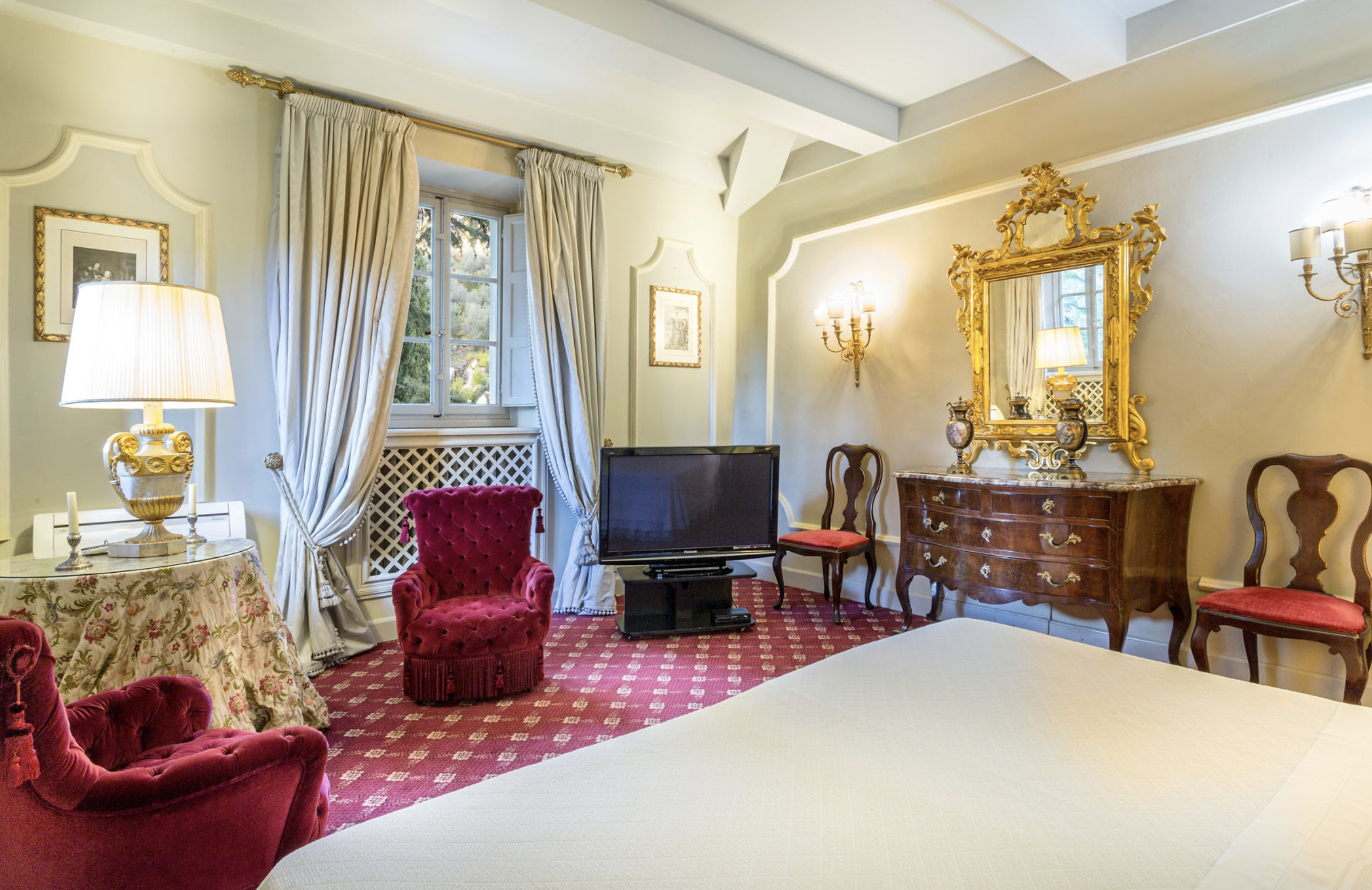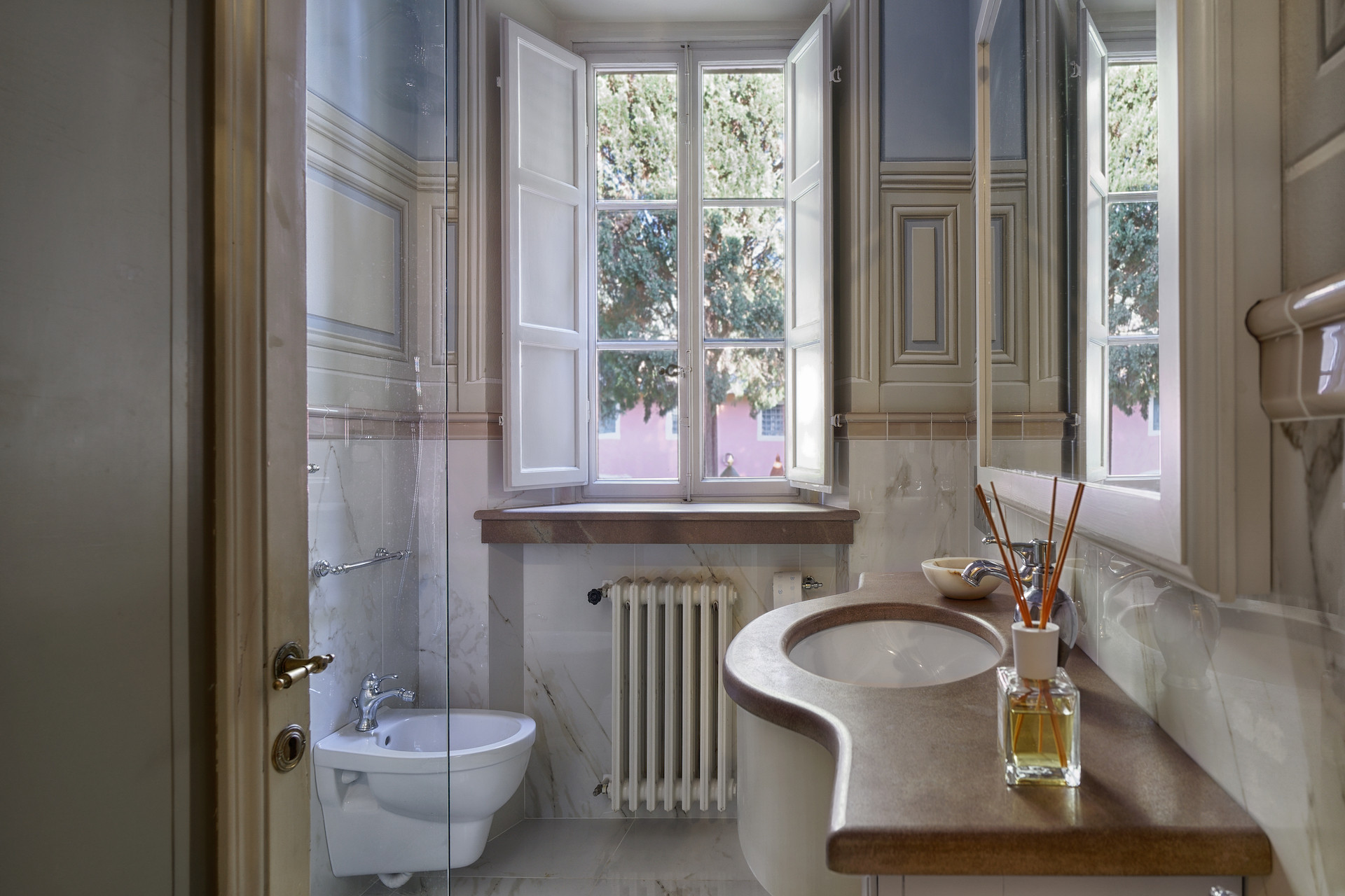 Villa has been superbly restructured, all the rooms have period furnishings, flanked by the modern of TV, satellite and internet. The internal beauty and elegance of the villa is harmoniously balanced with the external space which is made up of a stunning beautifully-kept park with a garden, ancient trees and a small patio. In the middle of the park is situated a swimming pool (14 x 6) well equipped with umbrella and sunbeds. Back to the villa there is table and chairs for meals “ al fresco” and a large sun umbrella.