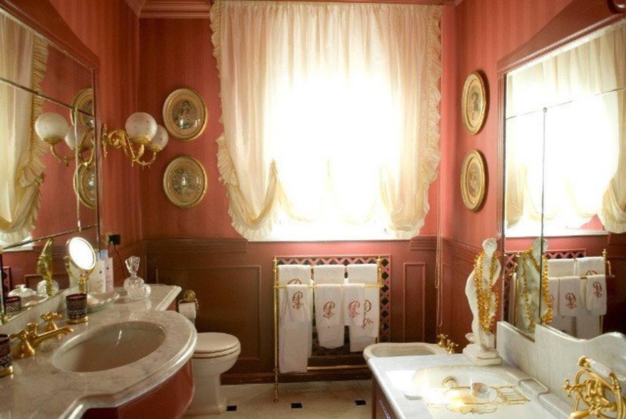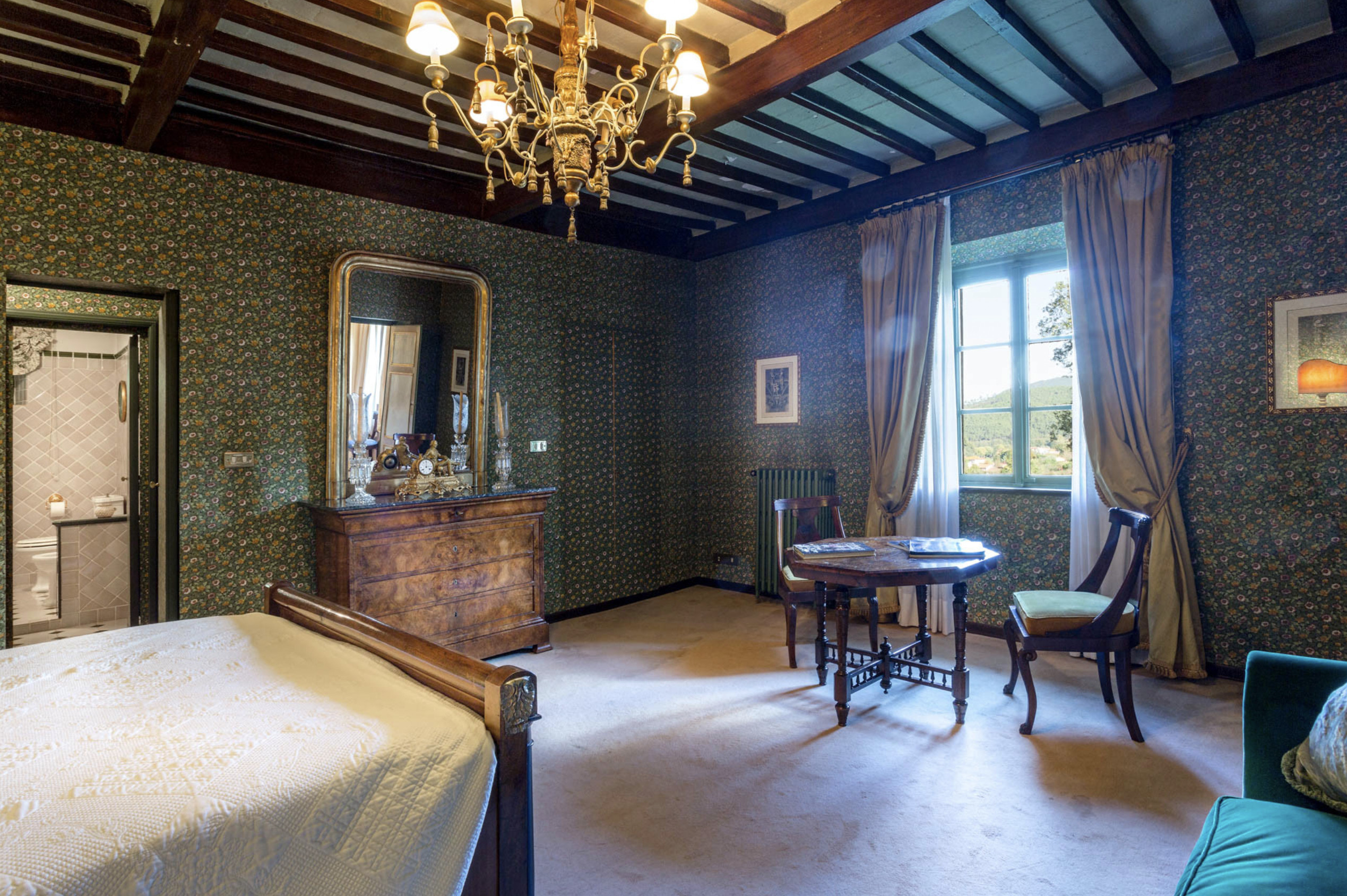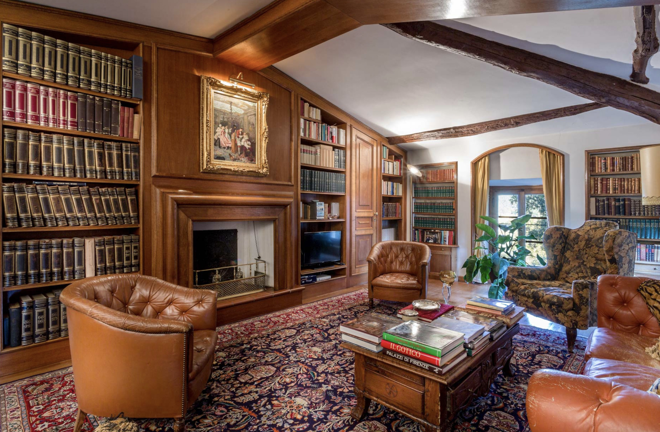 FIRST FLOOR: Twin bedroom (each bed is 200cmx90) with en-suite bathroom with bath; double bedroom (160cmx195cm) with en-suite bathroom with bath shared with a dressing room, that on request can be convertible into a single room; sitting room with fireplace, master bedroom with double bed and en-suite bathroom with bath, satellite TV with Sky and air conditioning; large dressing room; library-sitting room with fireplace, satellite TV, DVD and CD player, Hi-Fi stereo mini bar.