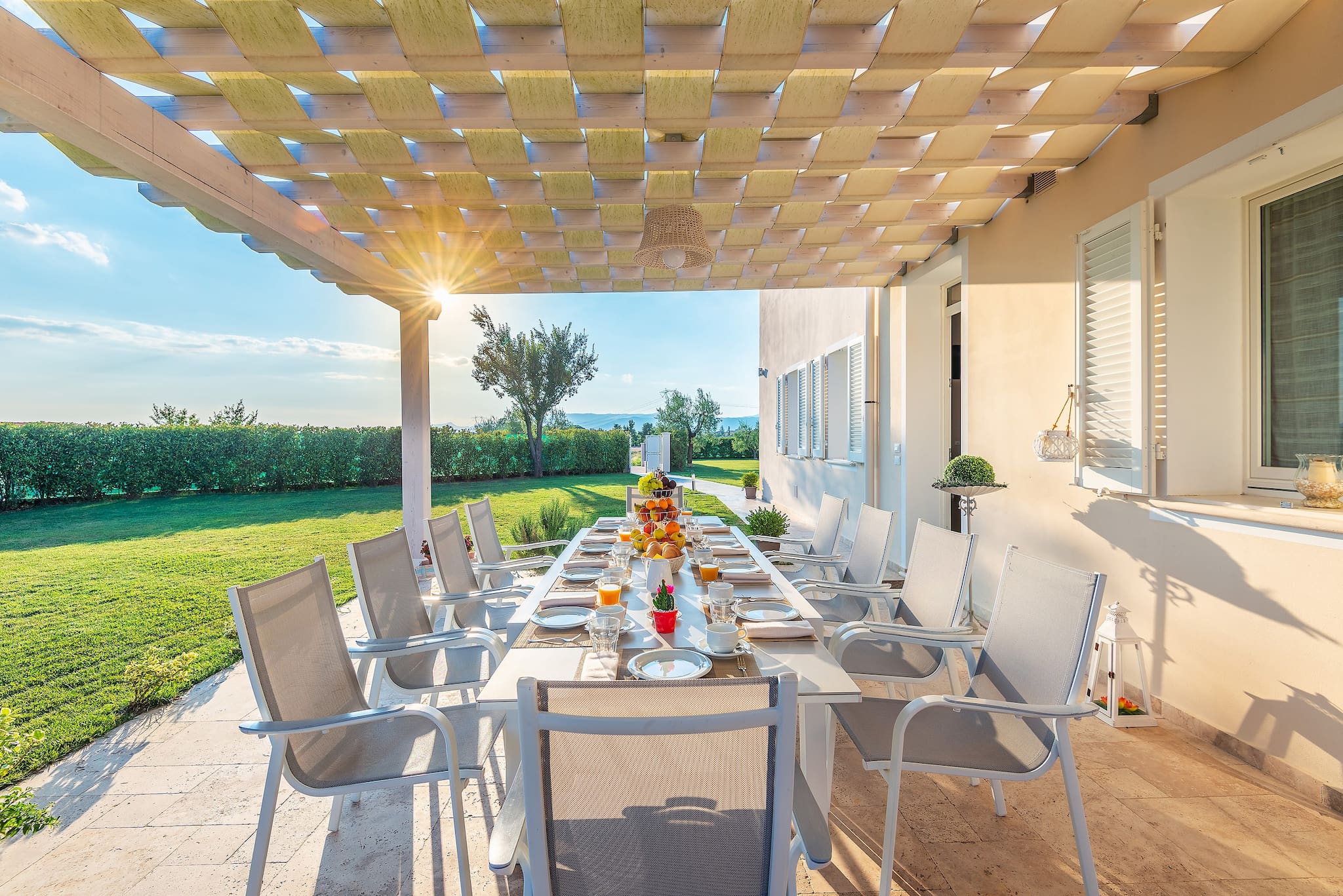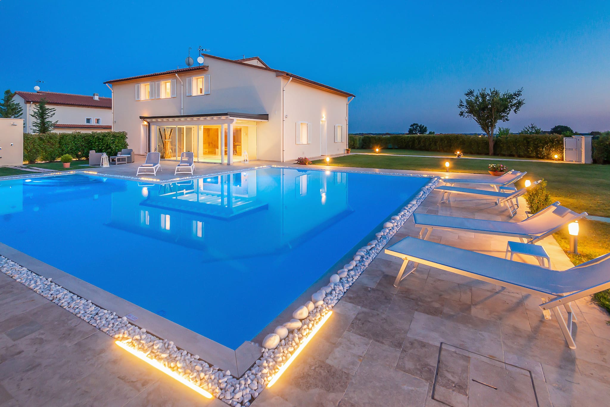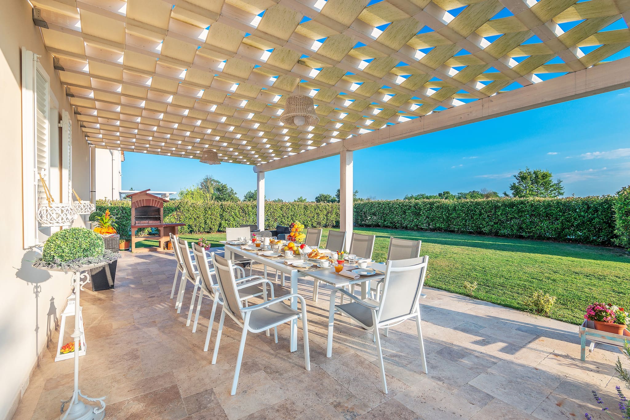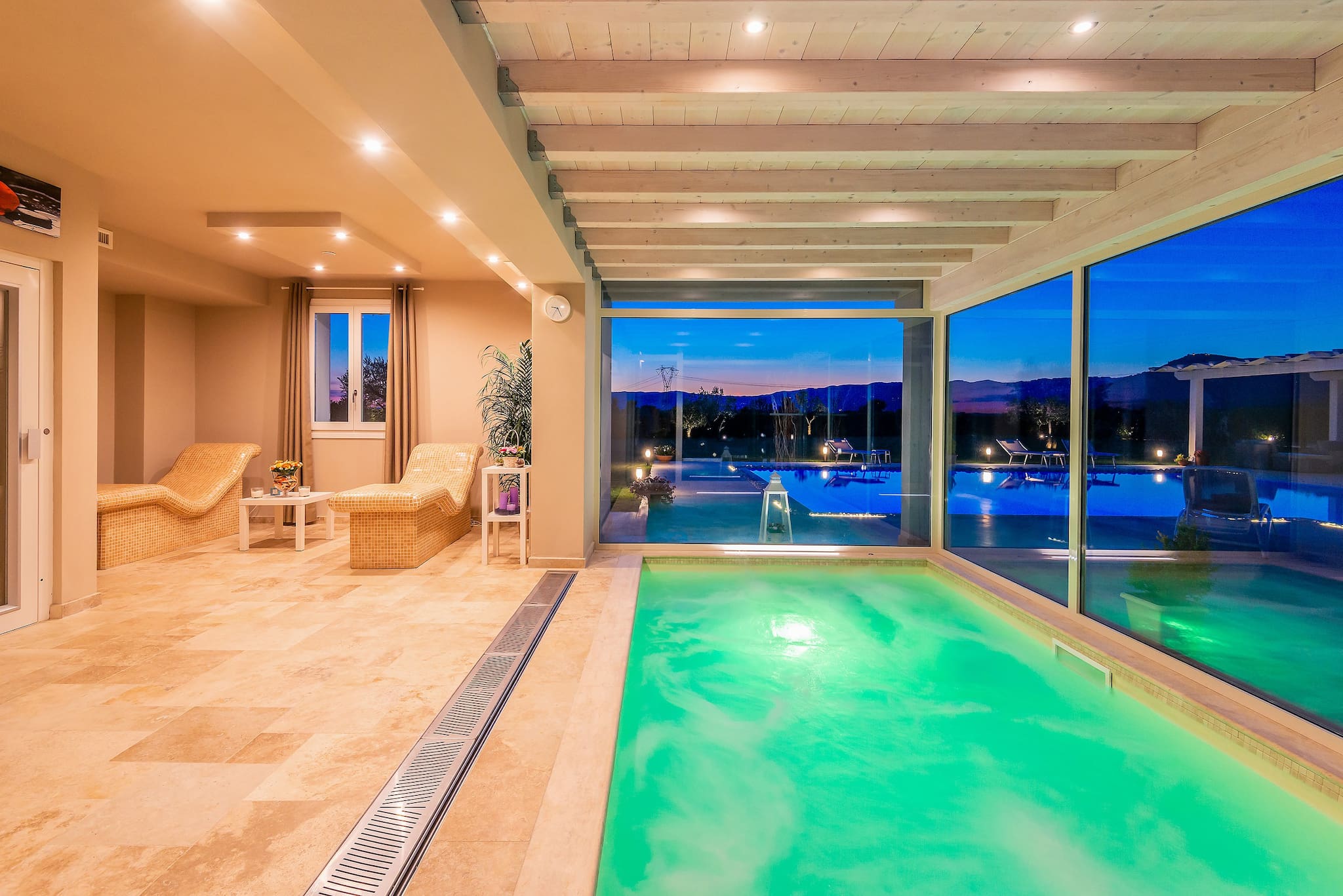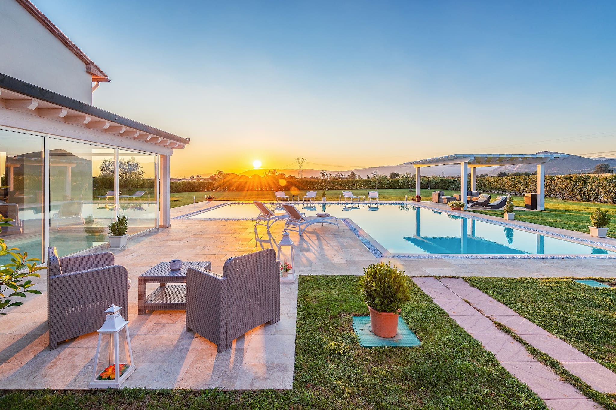 Thanks to the wooden pergola with curtains the lounge areat beside the pool is perfect for moments of relax, with a good book and a prosecco.