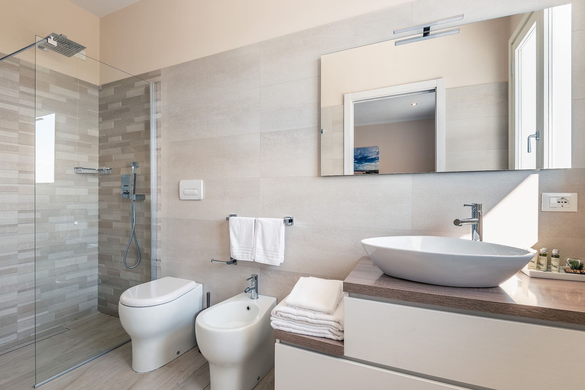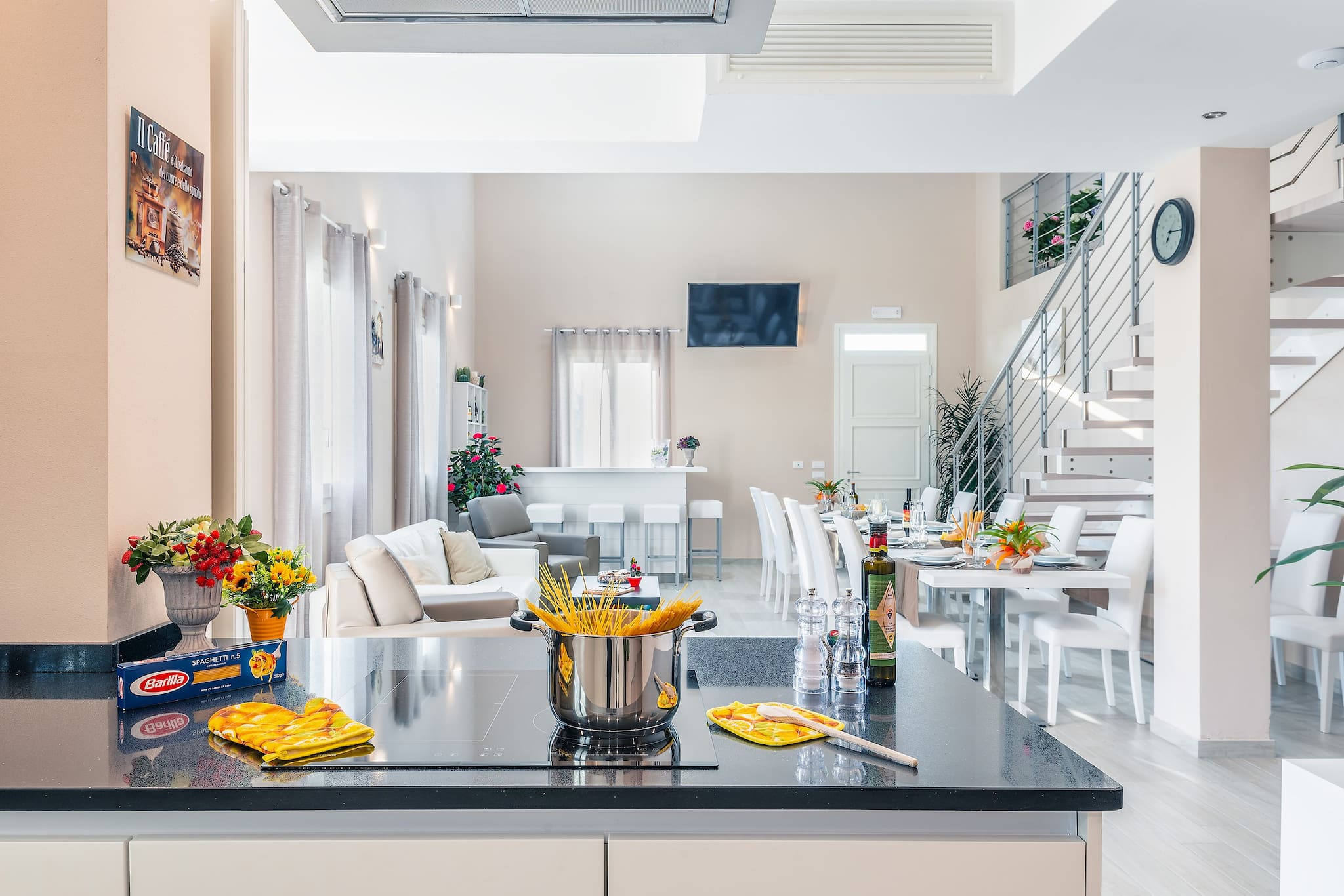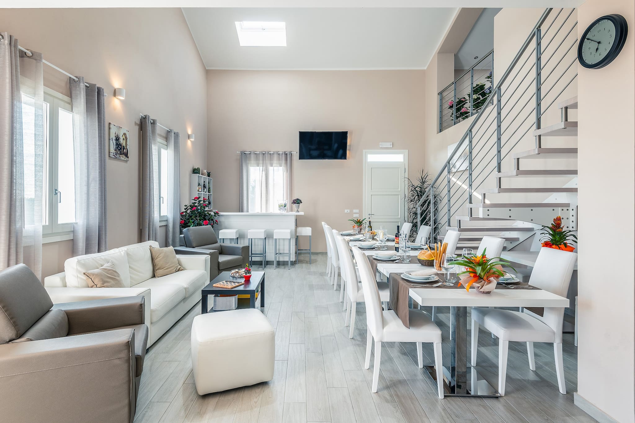 It has 5 double bedrooms, all with ensuite bathrooms. In 3 of these spacious rooms there is a third single bed, so the number of guest can be 13. The style is rigorously minimalistic, but warm. Everything depends on the play on colours and the shades of brown and white. The result is extremely elegant, but at the same time comfortable and functional.