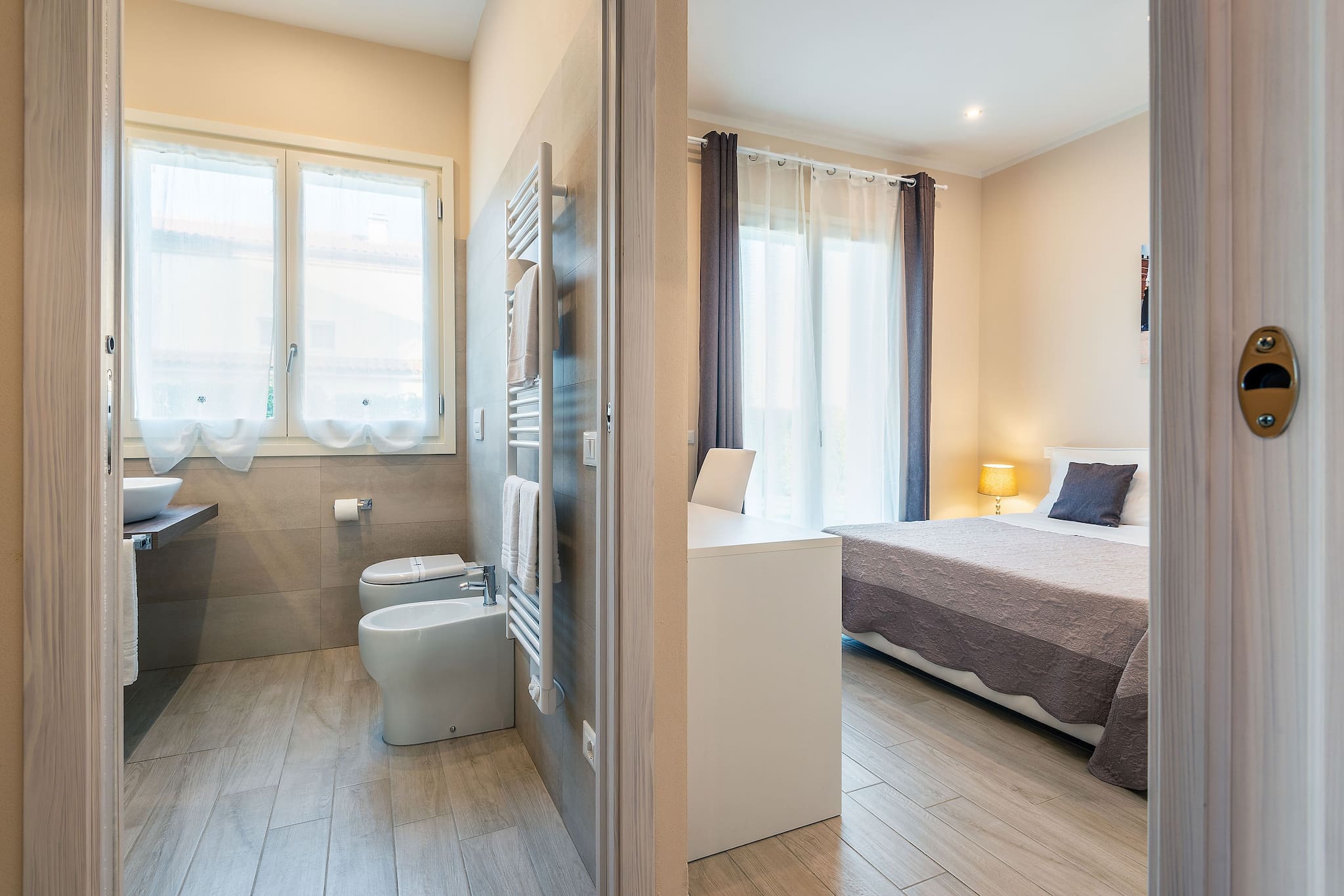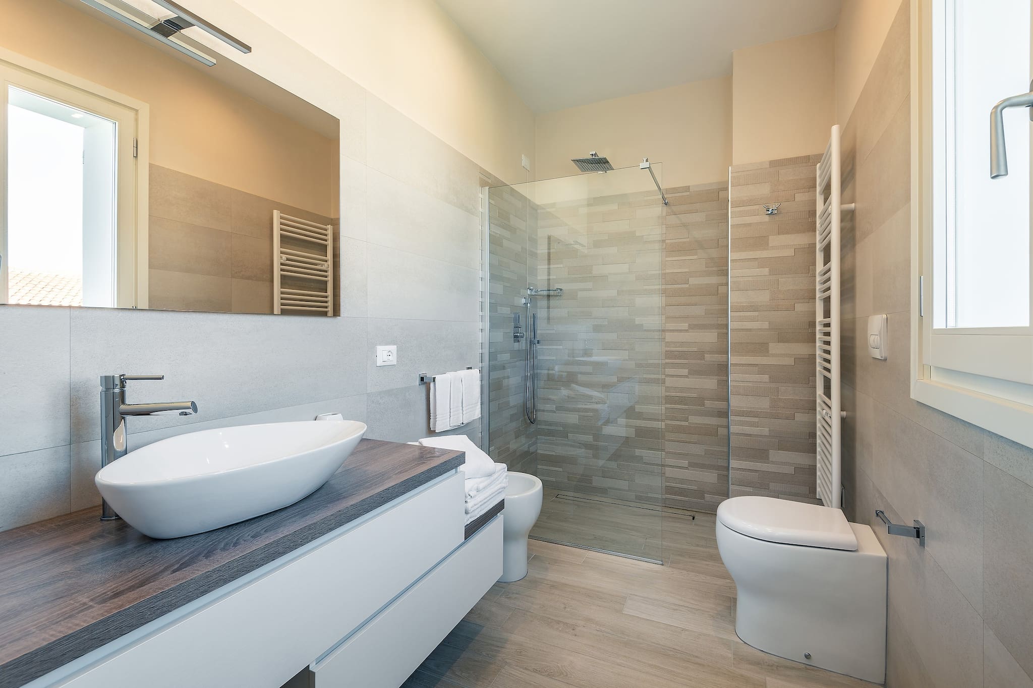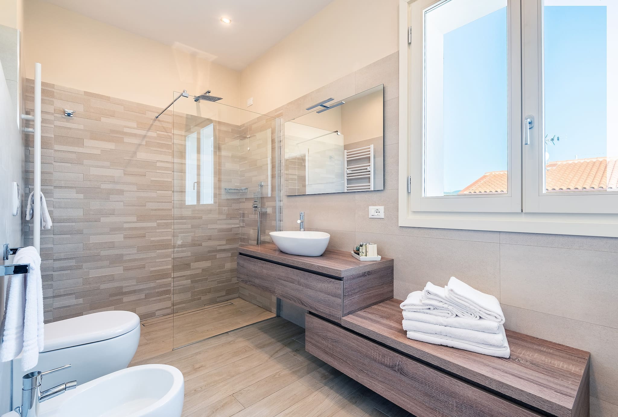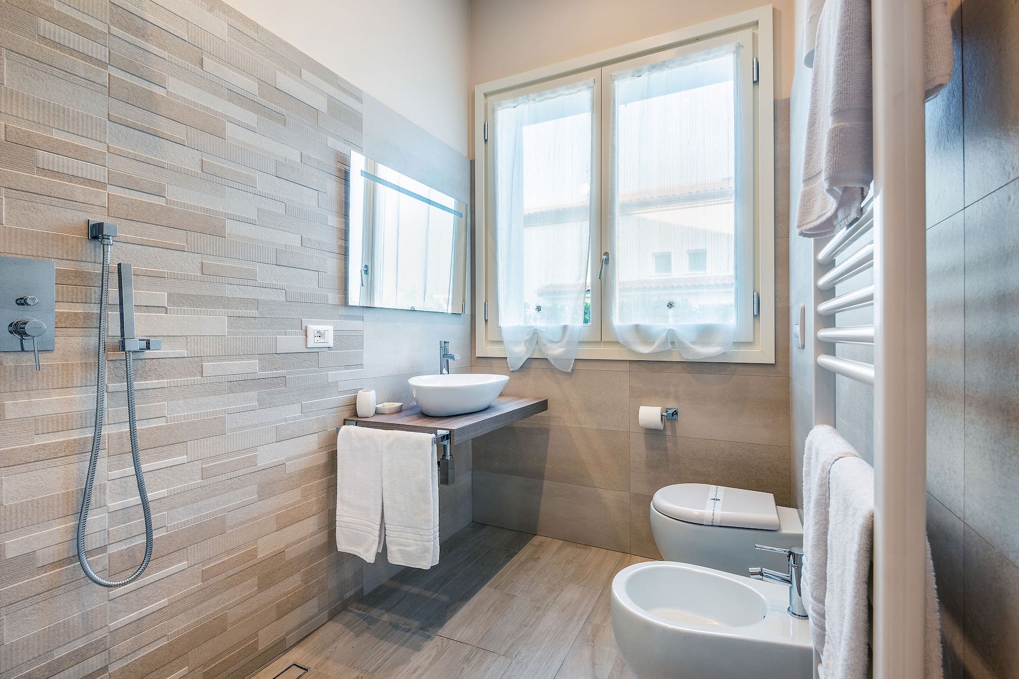 It has 5 double bedrooms, all with ensuite bathrooms. In 3 of these spacious rooms there is a third single bed, so the number of guest can be 13. The style is rigorously minimalistic, but warm. Everything depends on the play on colours and the shades of brown and white. The result is extremely elegant, but at the same time comfortable and functional.