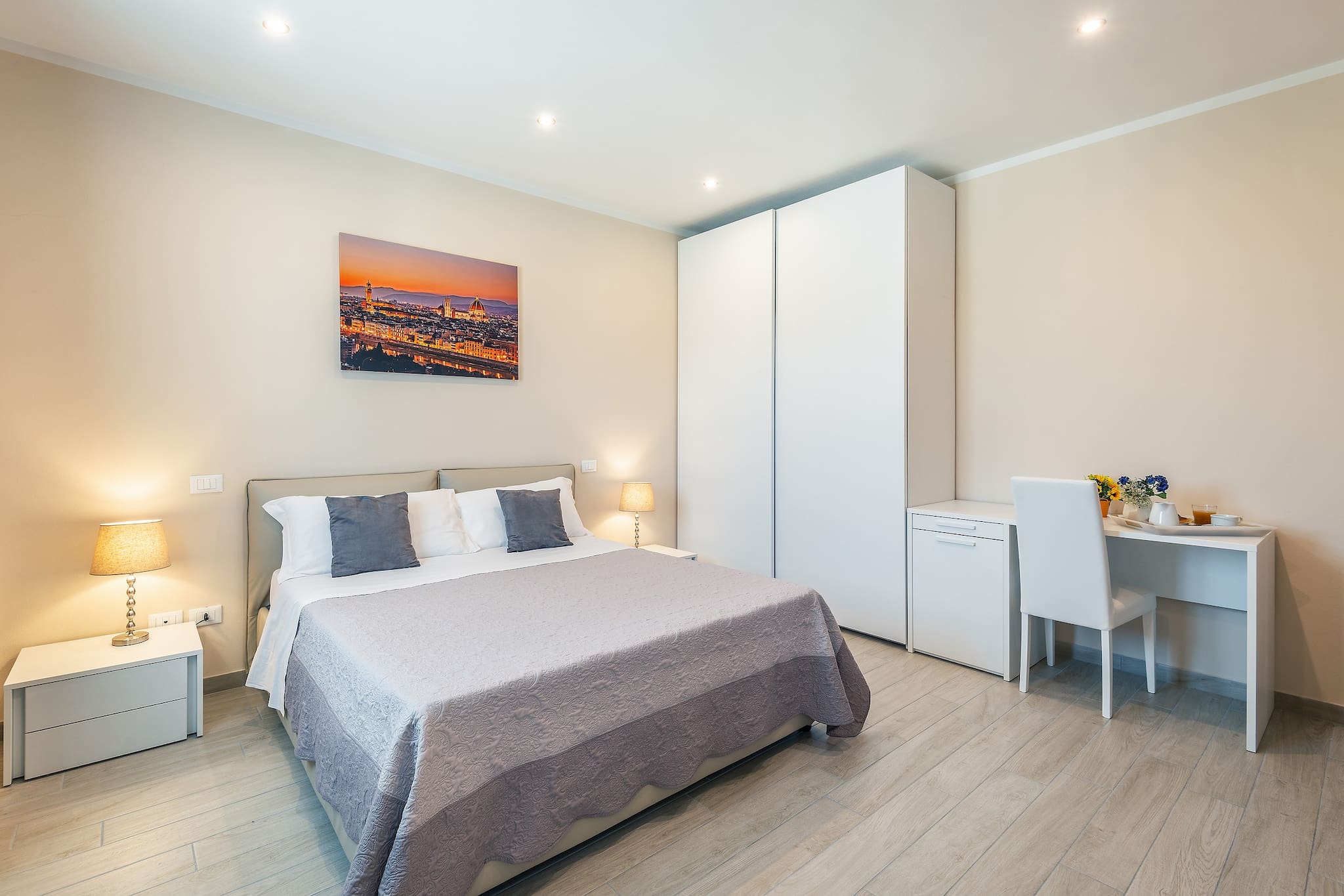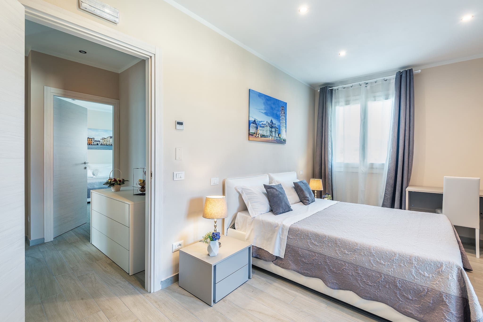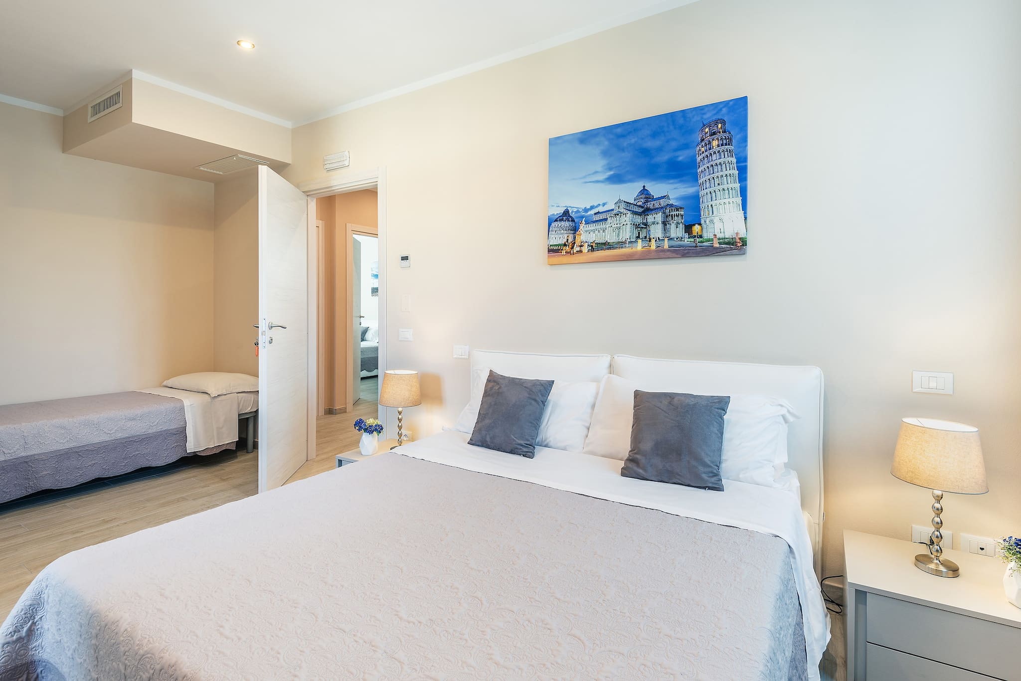 A staircase leads up to the first floor where you will find 4 double bedrooms in a refined and minimalistic design, all with private bathroom with shower, Sat. Tv. Three of the bedrooms also have a single bed.