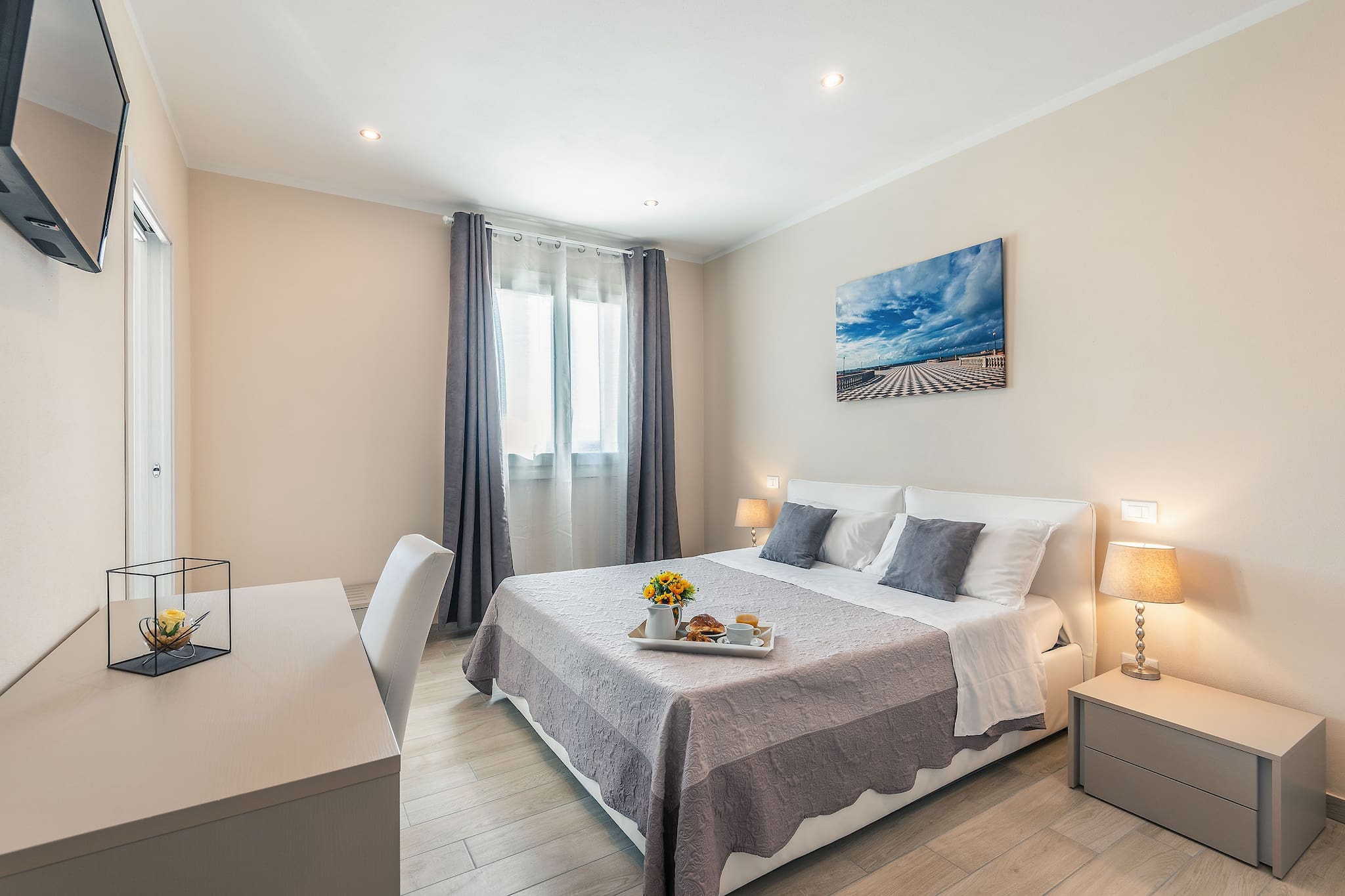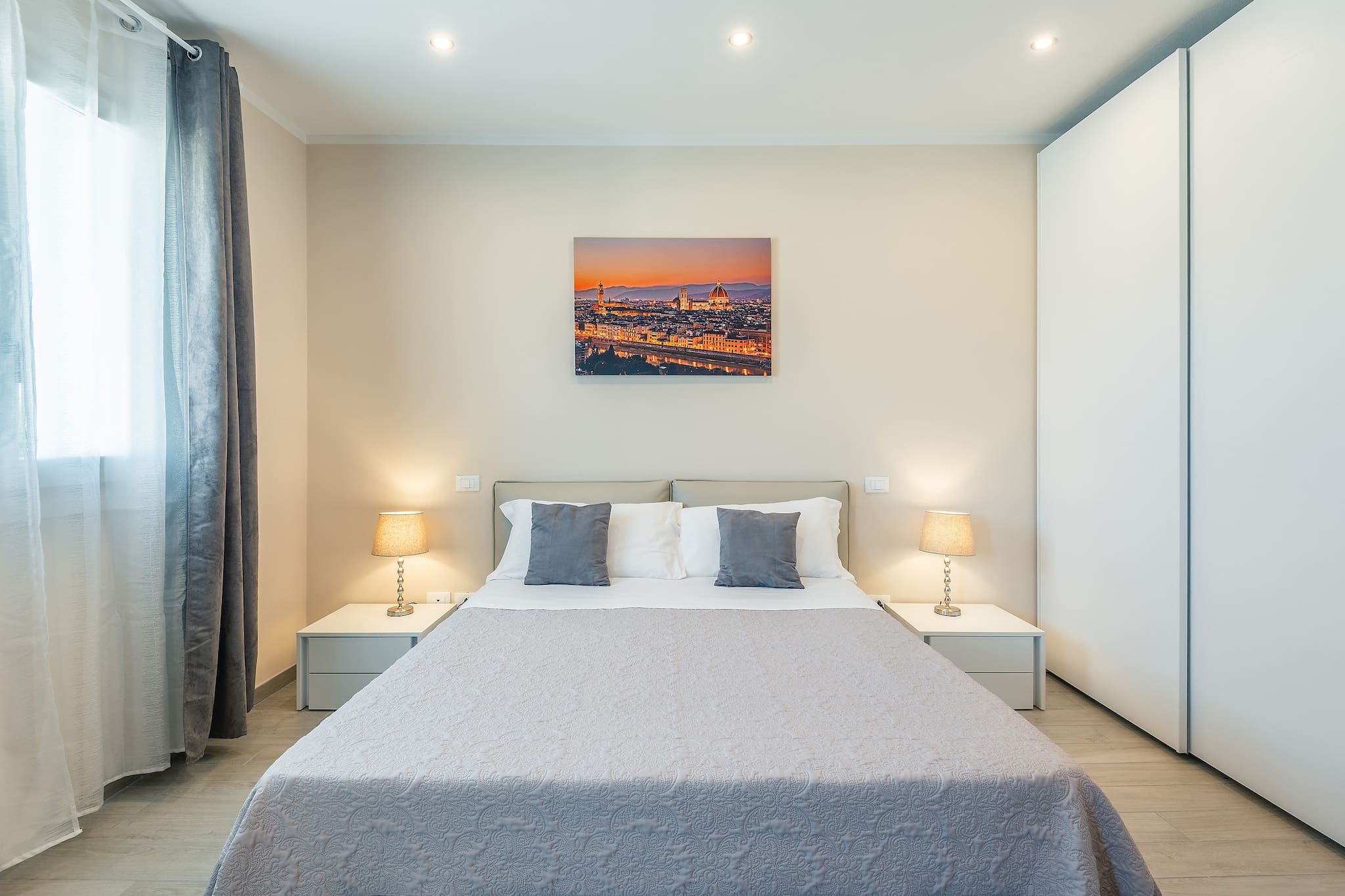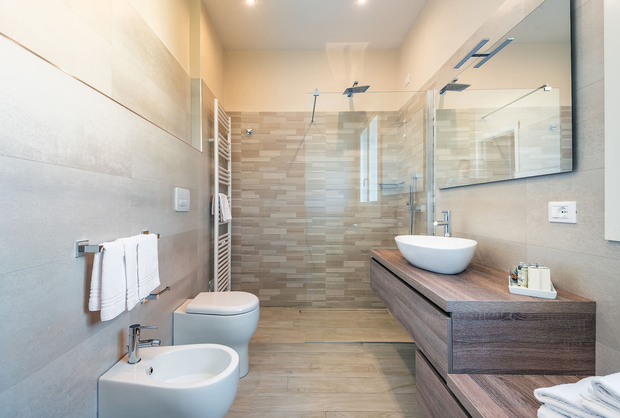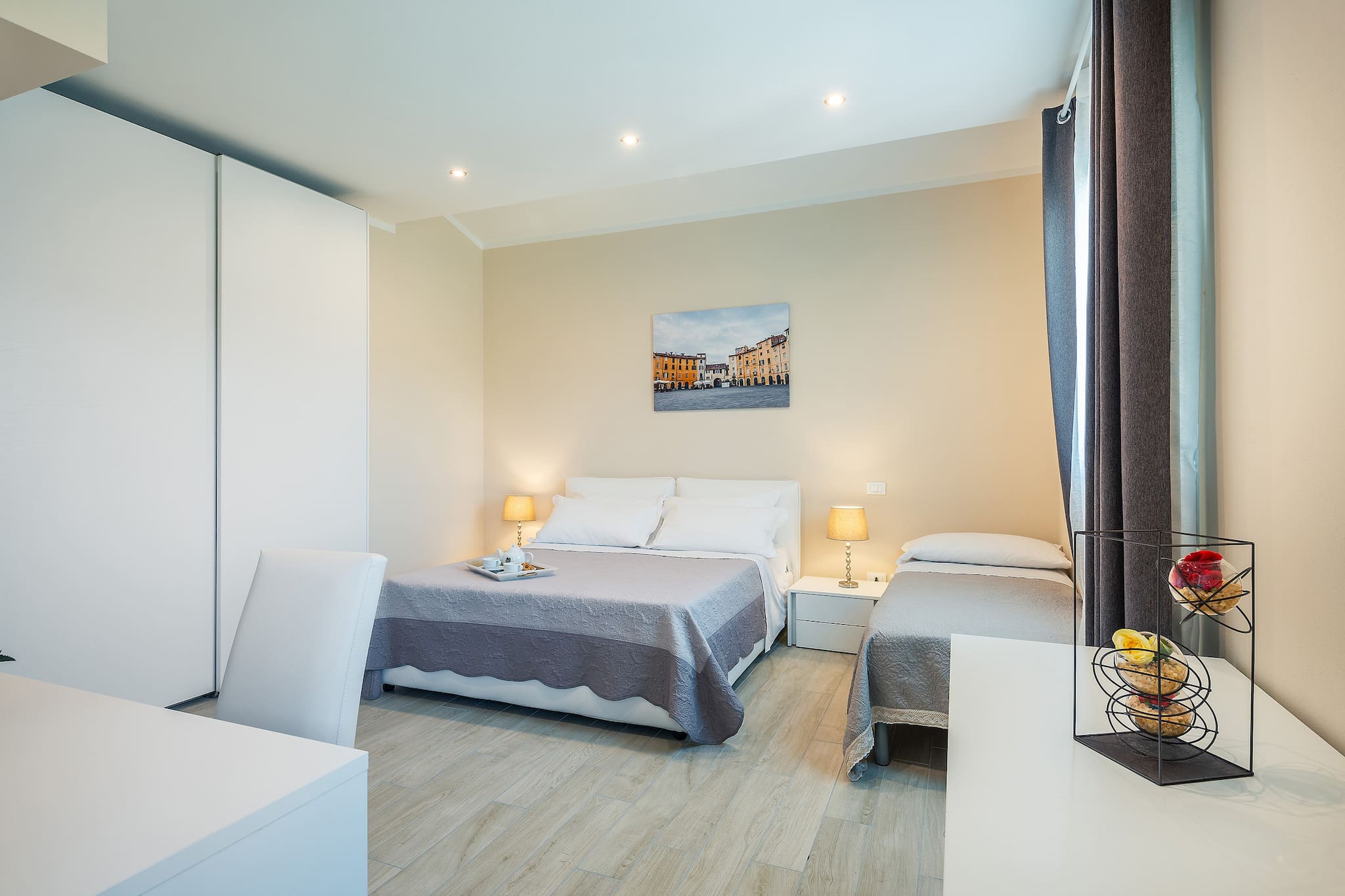 A staircase leads up to the first floor where you will find 4 double bedrooms in a refined and minimalistic design, all with private bathroom with shower, Sat. Tv. Three of the bedrooms also have a single bed.