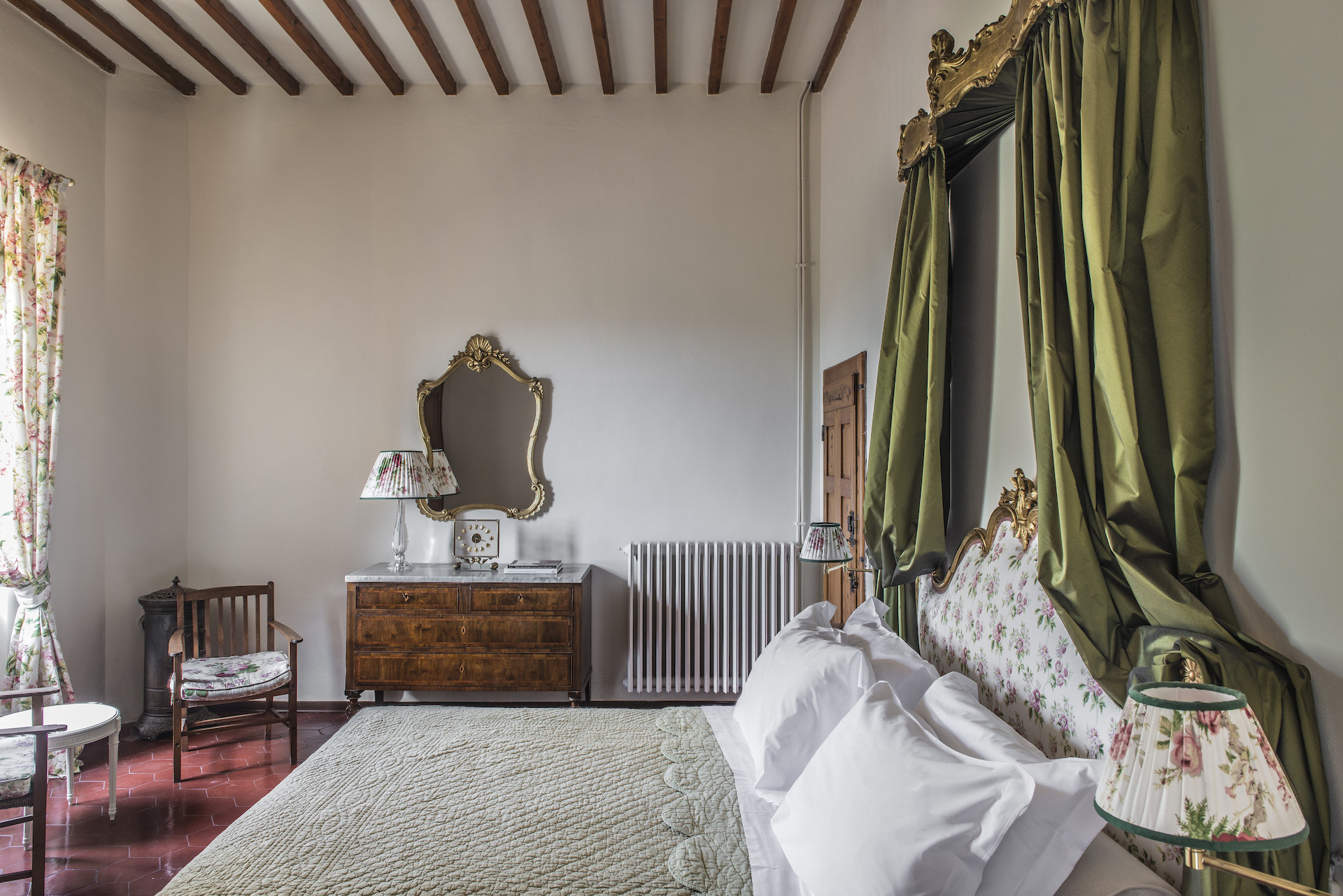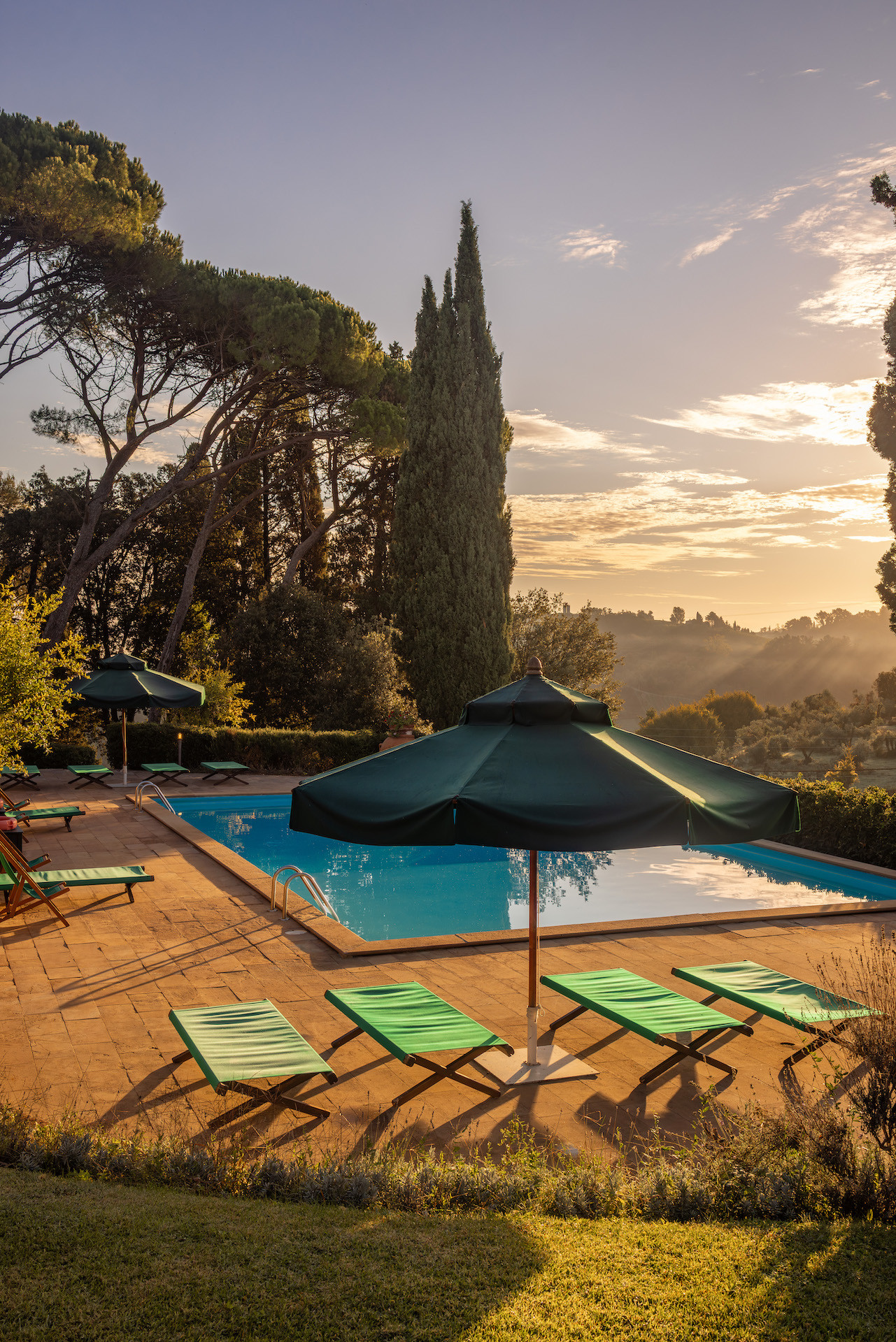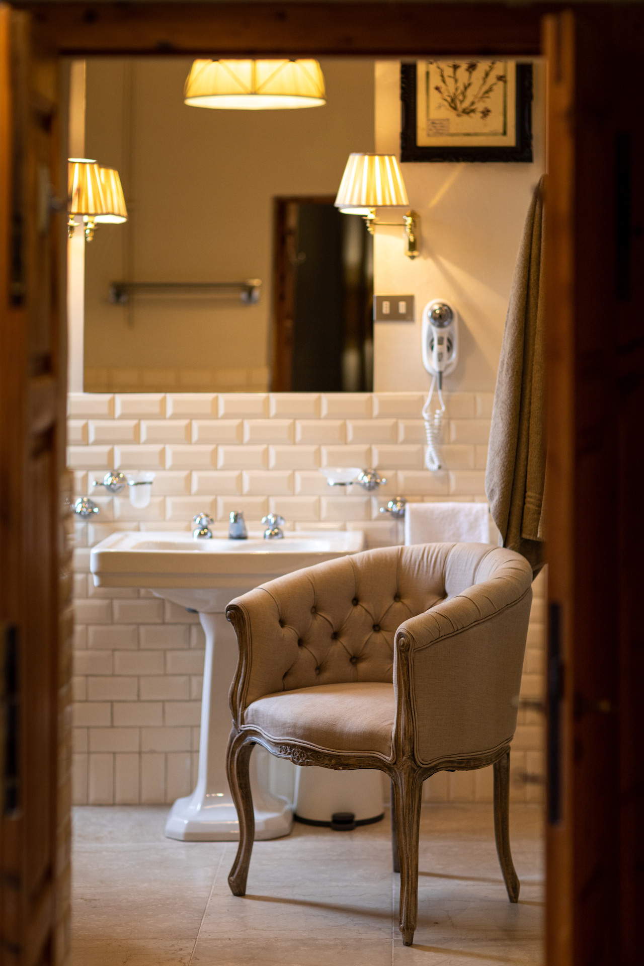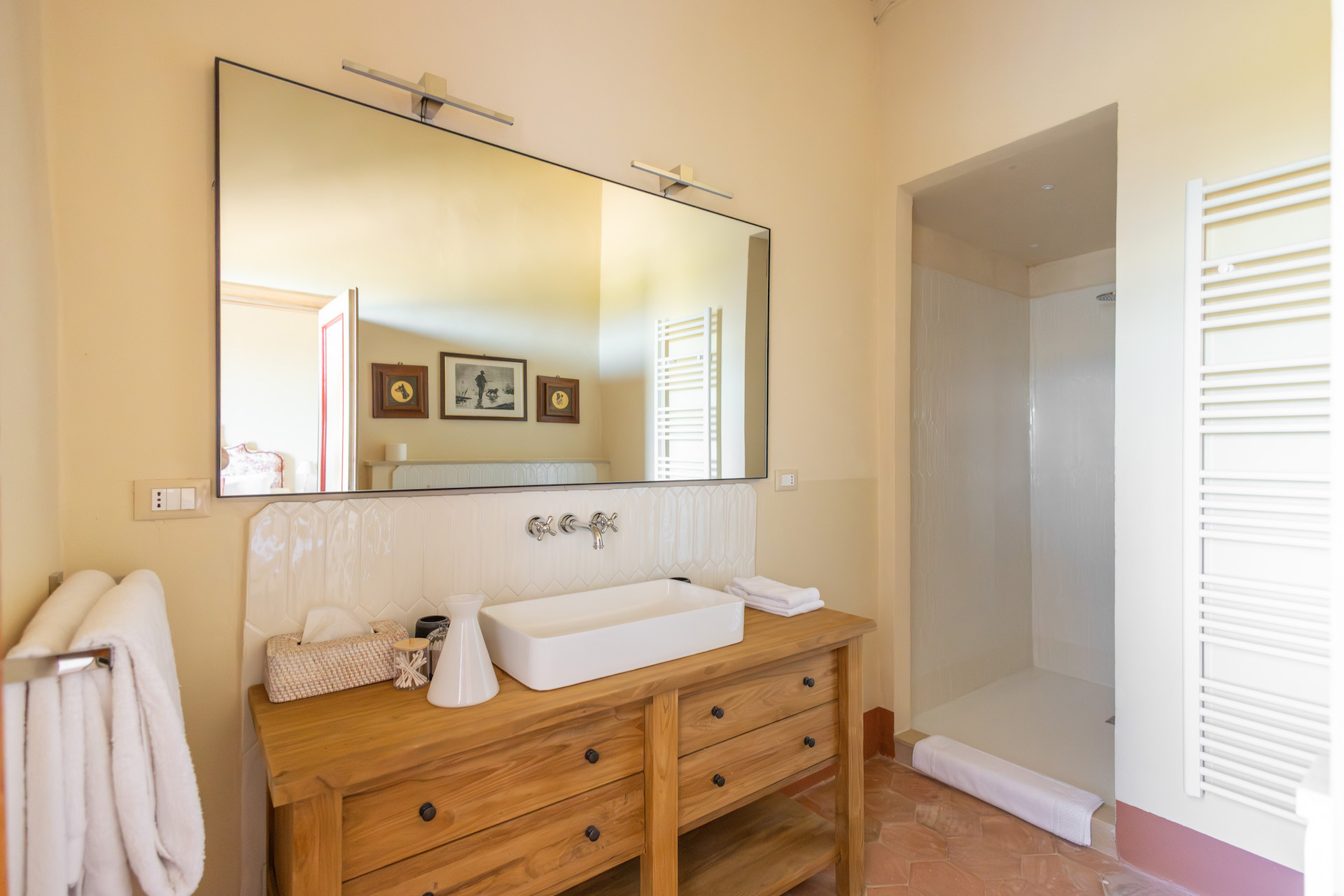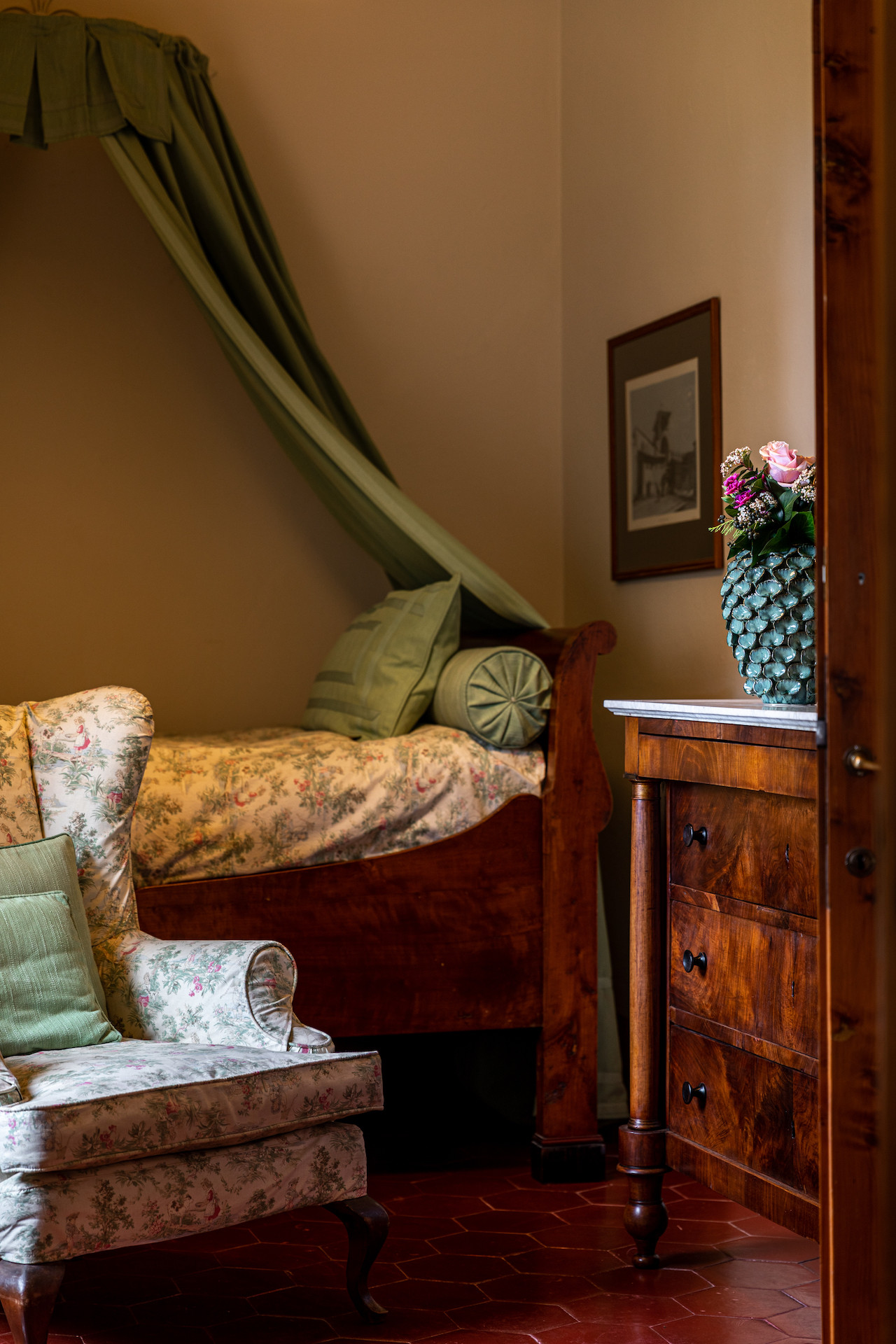 A large staircase made of pietra serena stone leads to the first floor, where eight of Villa’s rooms are located. All the bedrooms offer a stunning garden view and are accessed via a long corridor which, on the left, leads to the master bedroom with a large king-size canopy bed. This room features a living area with a terrace overlooking the garden and a spacious and elegant travertine bathroom. On the same side, there are two double bedrooms with en-suite bathrooms, one of which has two single beds with a marble bathroom, and the only single room, styled in an imperial fashion, with a French bed and a magnificent, spacious bathroom with a large shower. On the right side of the corridor, there are two beautiful suites, each with two beds and large en-suite bathrooms, one of which includes a bathtub. Finally, the grandparents’ room features a large canopy bed and a breathtaking view of the Tuscan countryside. In the left wing of the Villa, we find two more bedrooms, both equipped with air conditioning. The nanny’s room, with a private bathroom, is located on the ground floor near the kitchen, while on the first floor, there is the last of the suites, featuring a canopy bed and a magnificent bathroom decorated with mosaic and fine local marble.