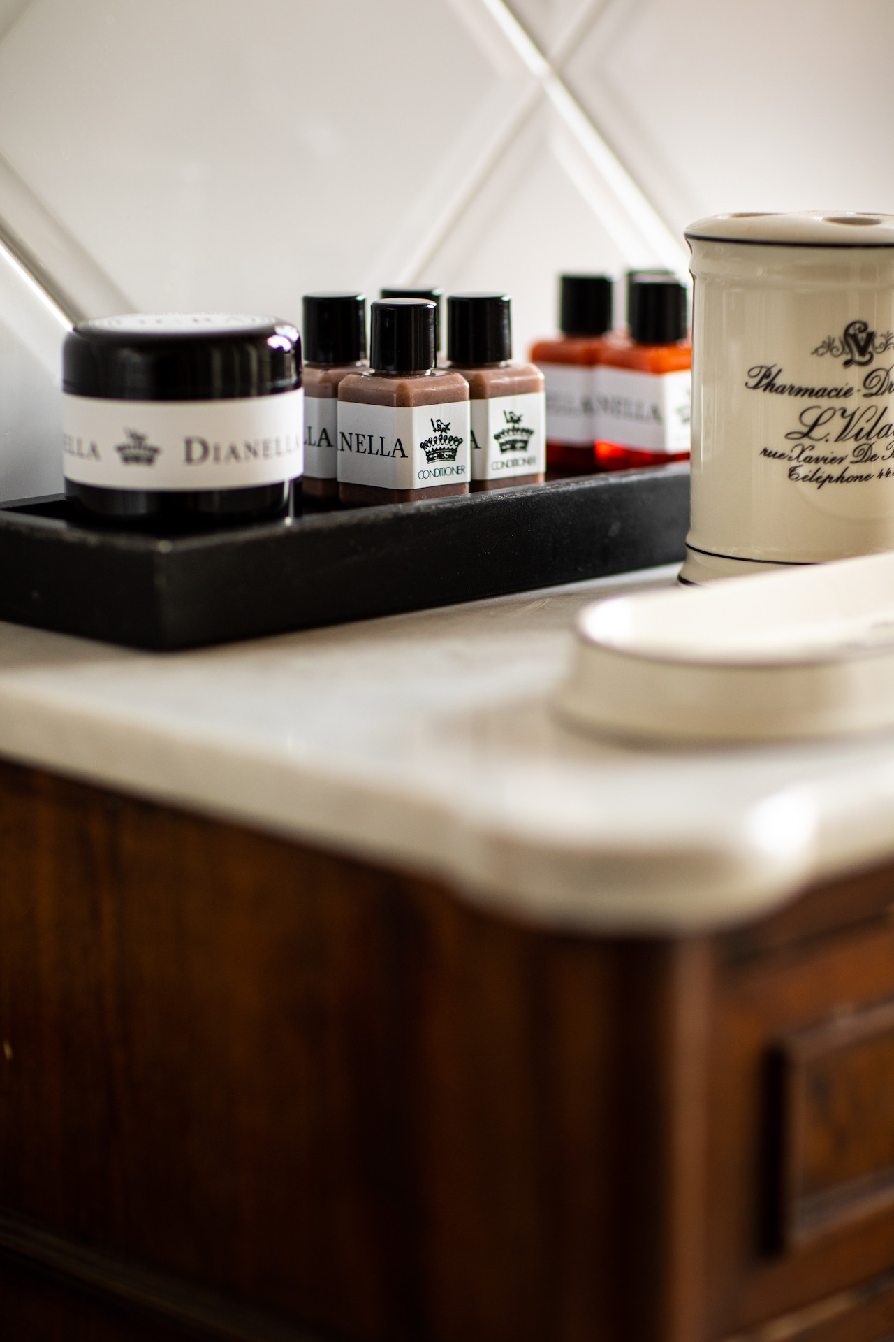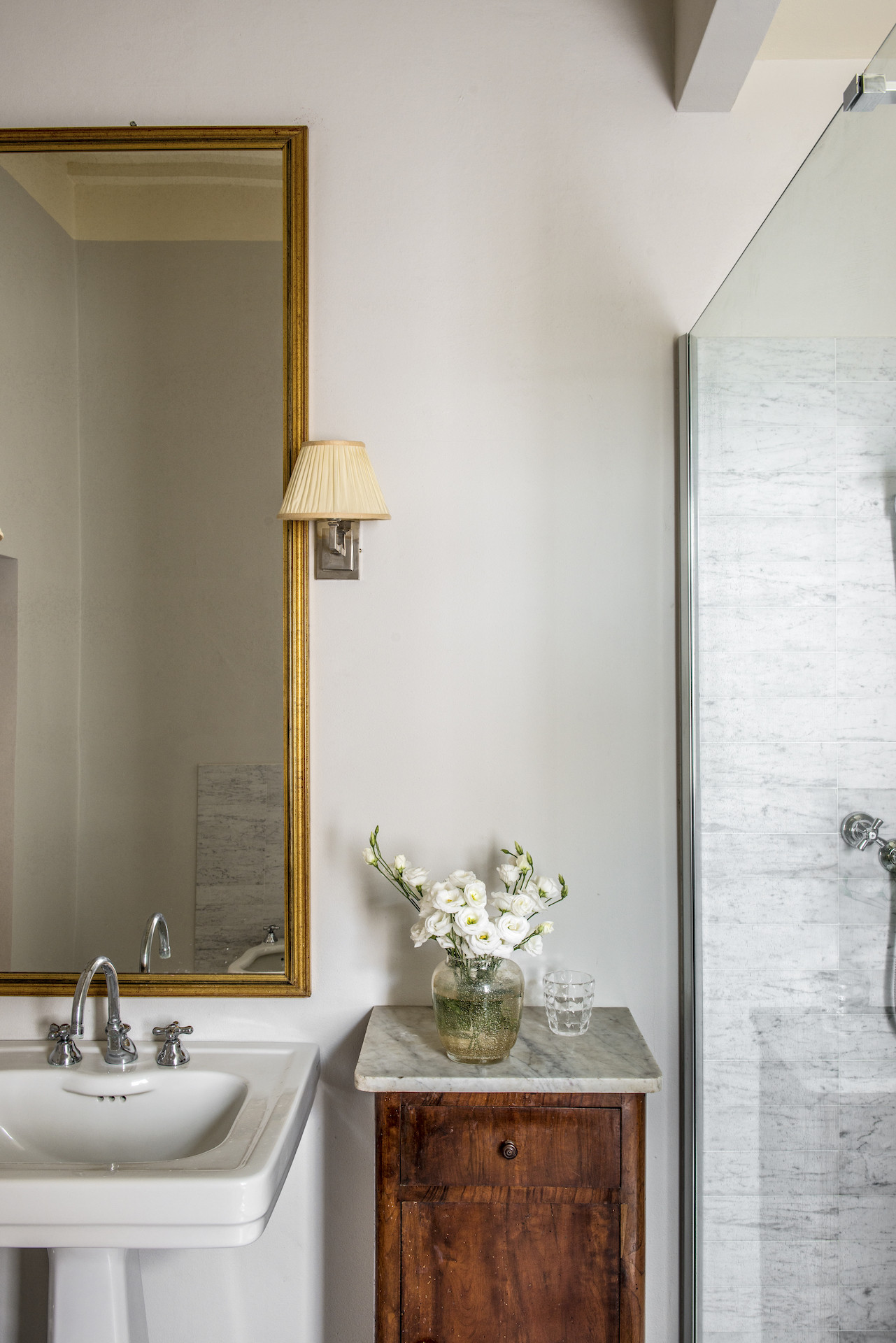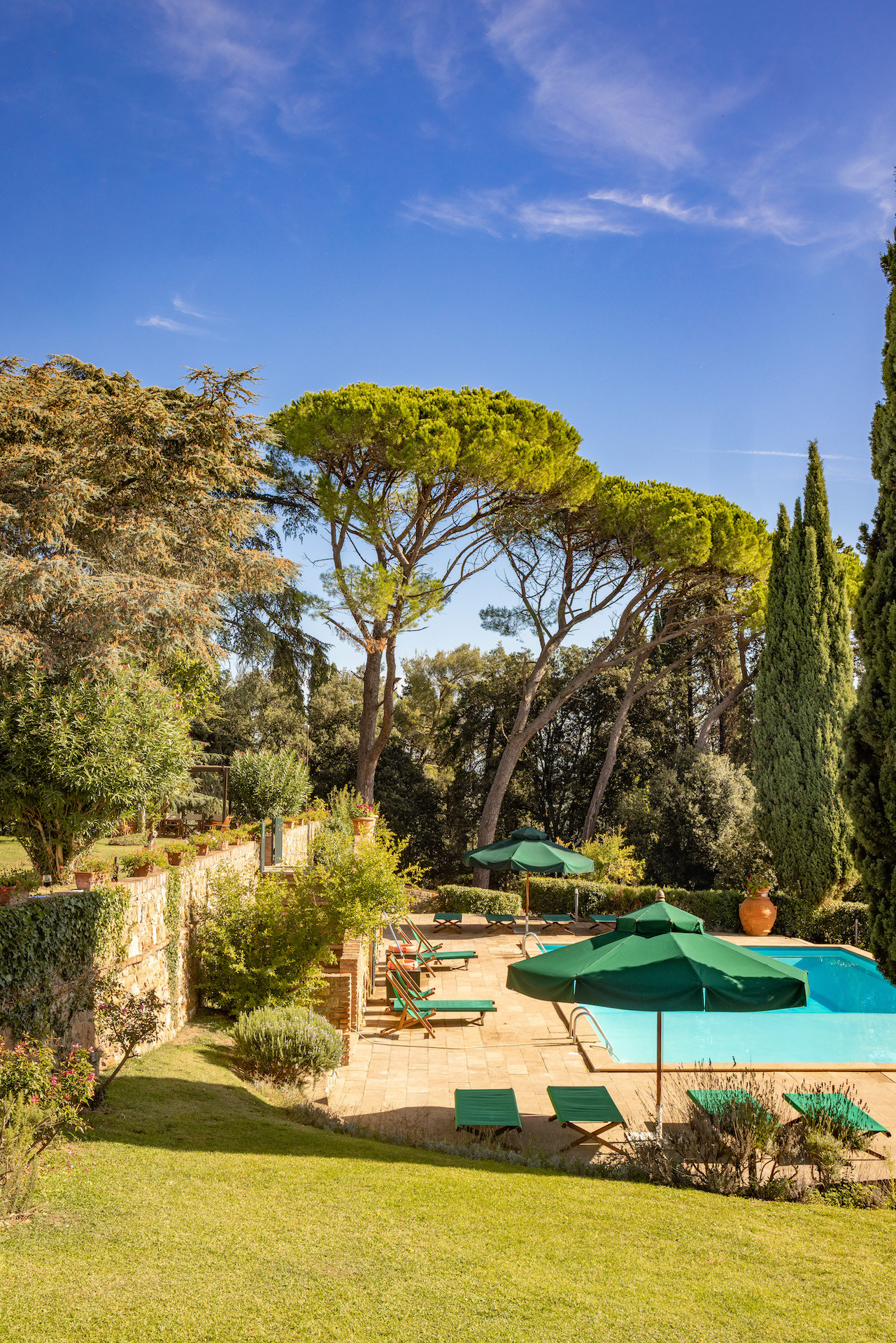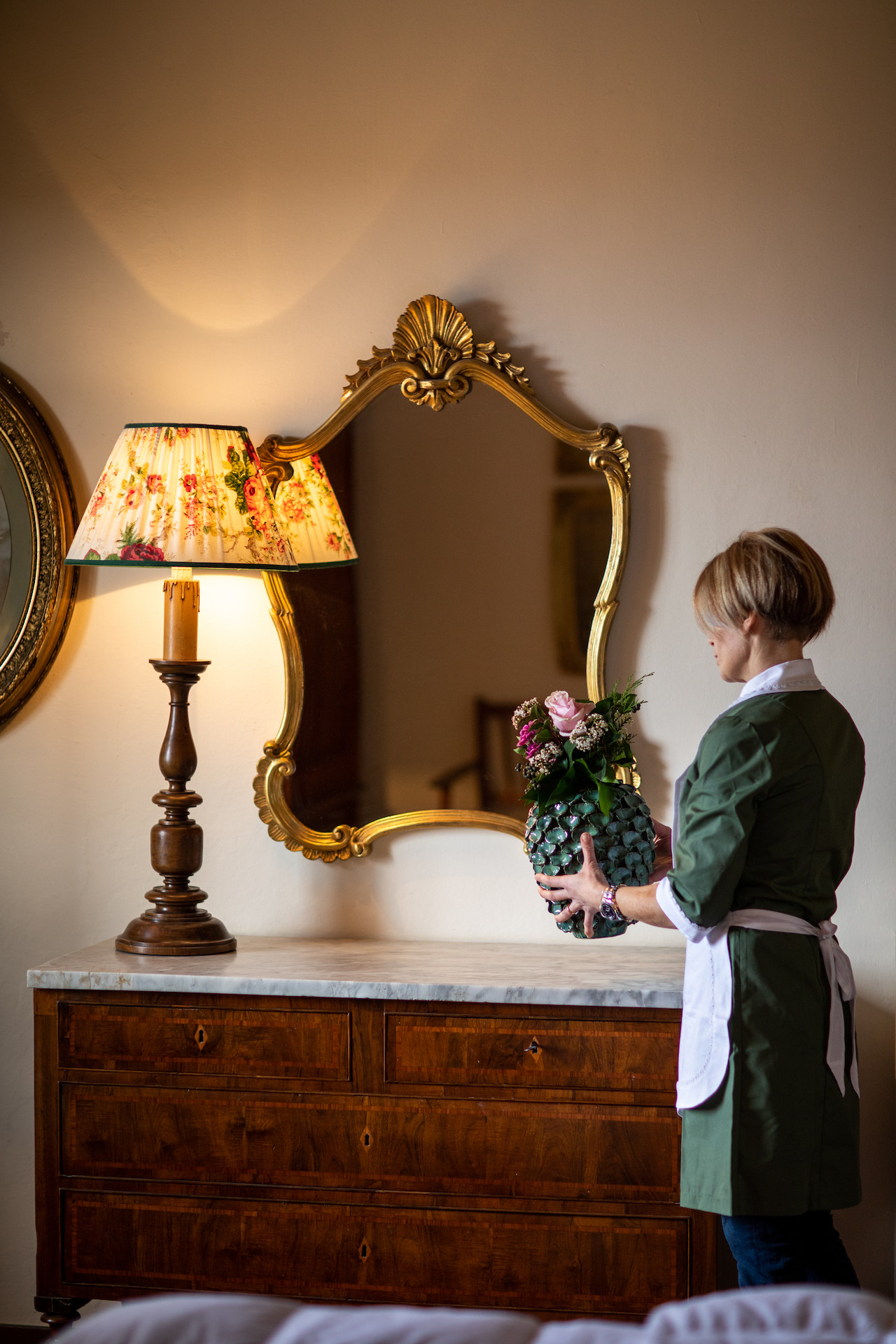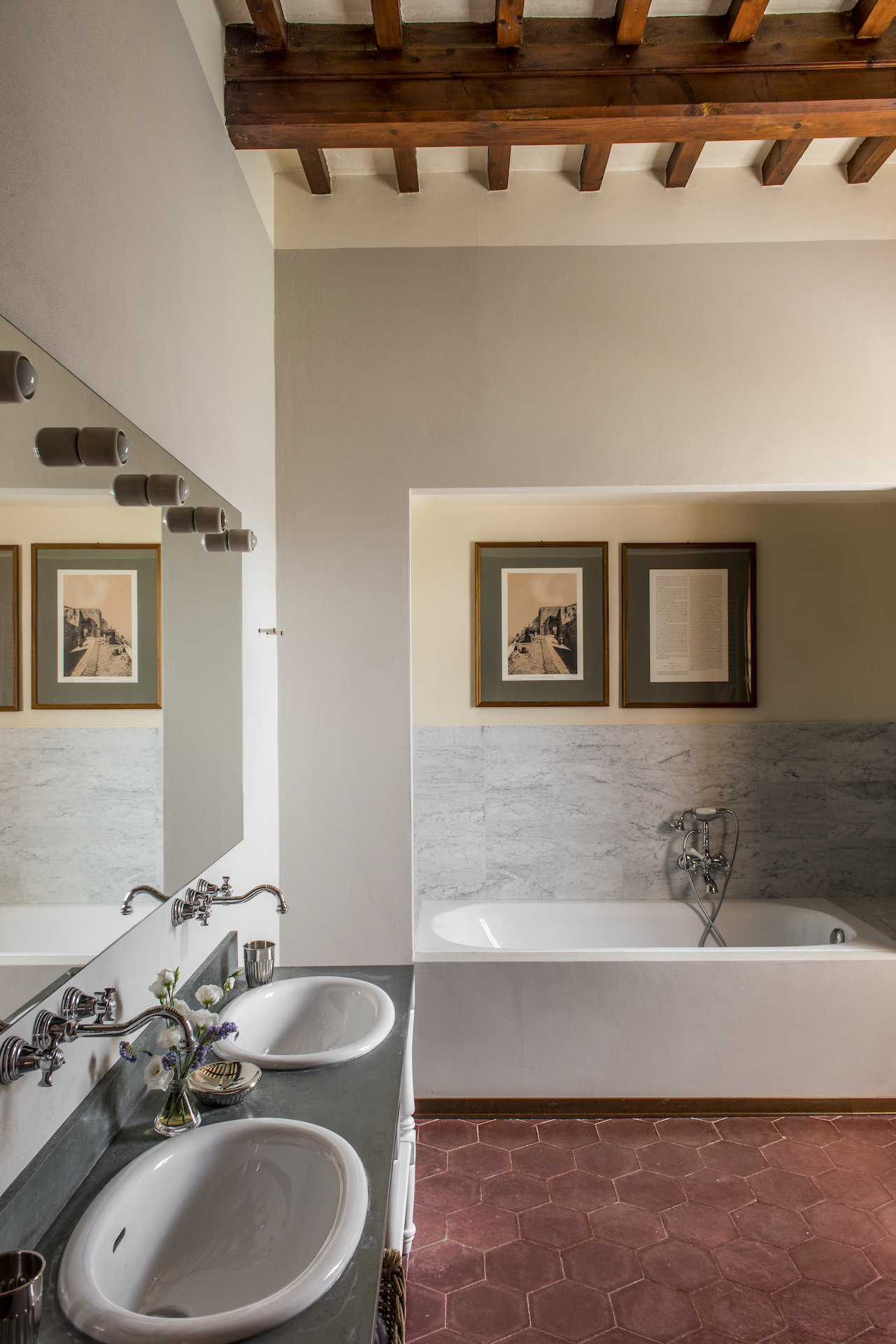 A large staircase made of pietra serena stone leads to the first floor, where eight of Villa’s rooms are located. All the bedrooms offer a stunning garden view and are accessed via a long corridor which, on the left, leads to the master bedroom with a large king-size canopy bed. This room features a living area with a terrace overlooking the garden and a spacious and elegant travertine bathroom. On the same side, there are two double bedrooms with en-suite bathrooms, one of which has two single beds with a marble bathroom, and the only single room, styled in an imperial fashion, with a French bed and a magnificent, spacious bathroom with a large shower. On the right side of the corridor, there are two beautiful suites, each with two beds and large en-suite bathrooms, one of which includes a bathtub. Finally, the grandparents’ room features a large canopy bed and a breathtaking view of the Tuscan countryside. In the left wing of the Villa, we find two more bedrooms, both equipped with air conditioning. The nanny’s room, with a private bathroom, is located on the ground floor near the kitchen, while on the first floor, there is the last of the suites, featuring a canopy bed and a magnificent bathroom decorated with mosaic and fine local marble.