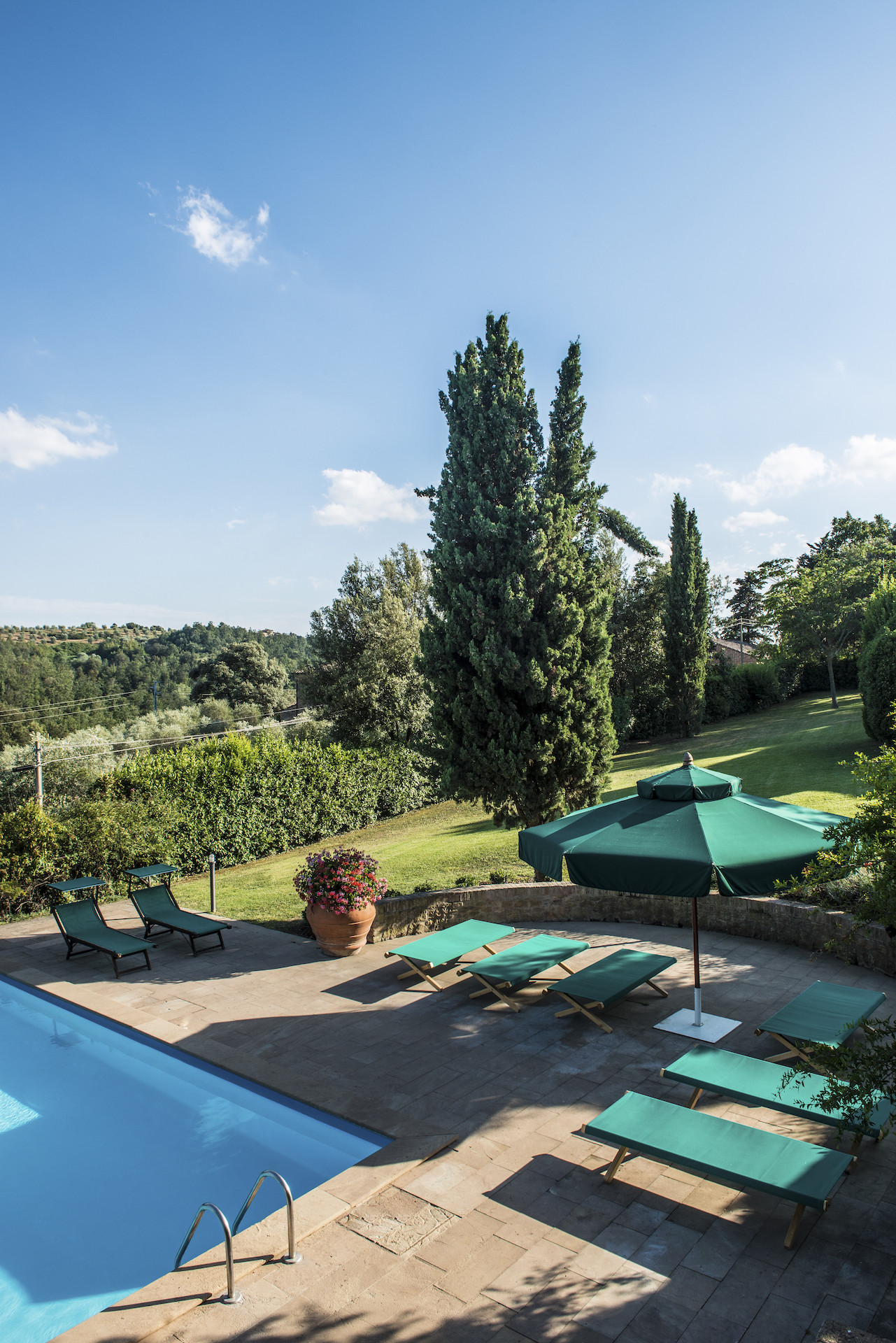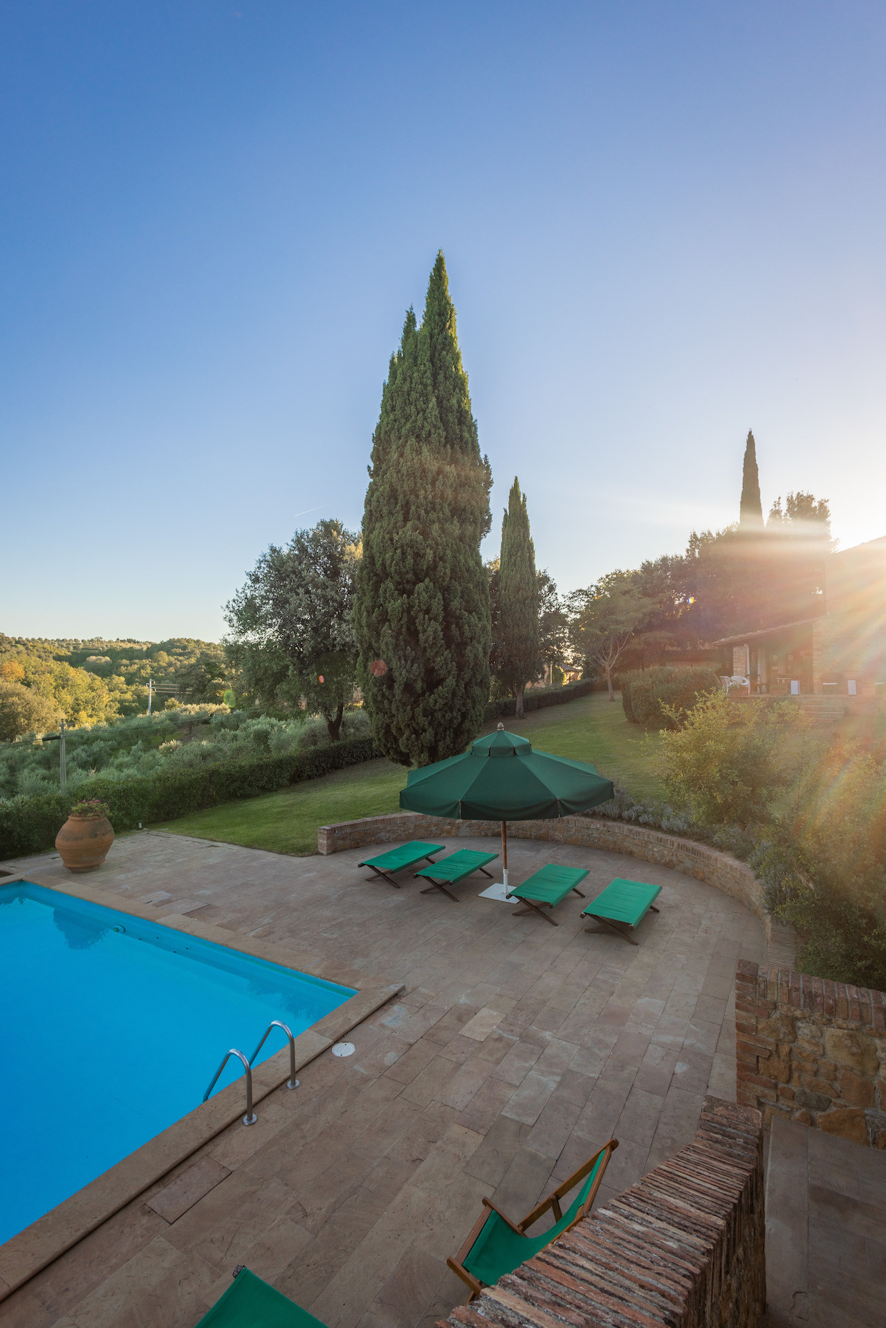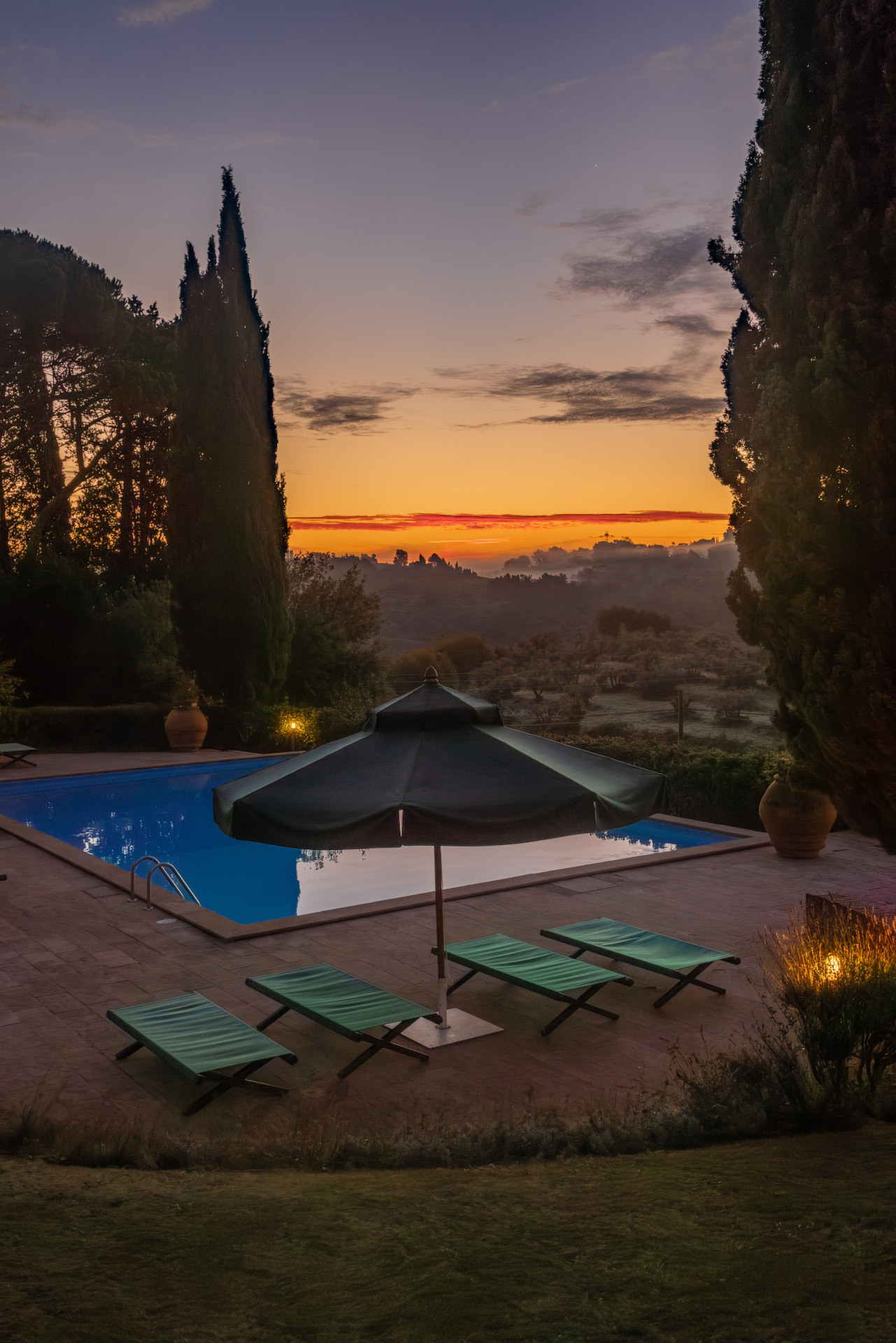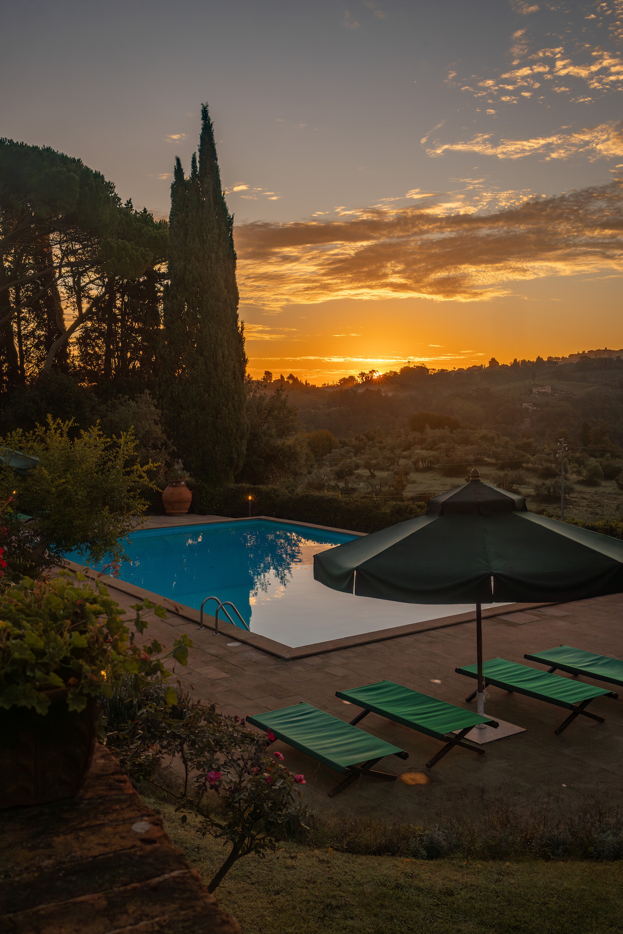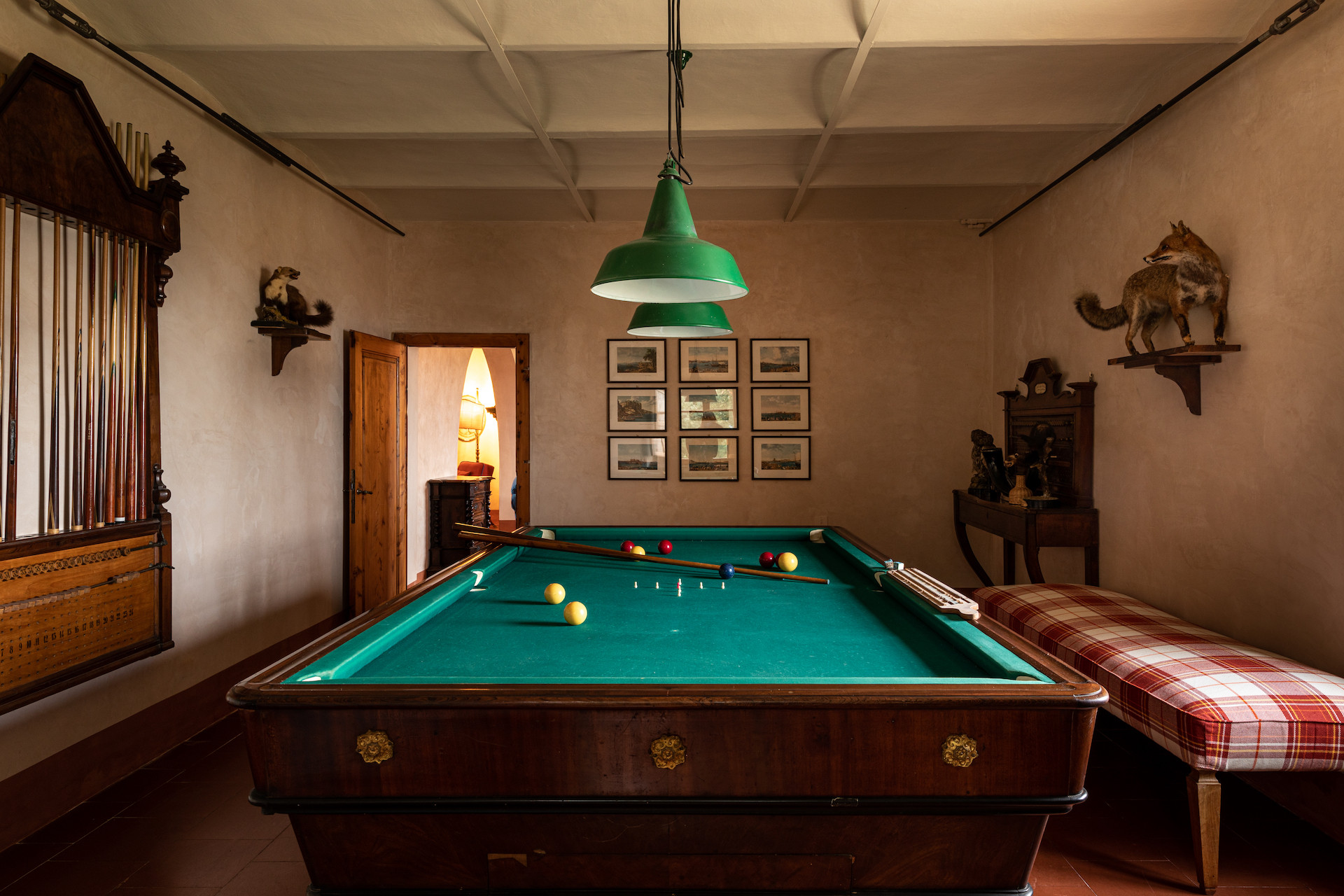 The villa has two entrances. The main entrance leads to the living room with a television and the library of the house, which provides access to the main lounges, the billiard room, and the dining hall located on the ground floor. A double bedroom with a private bathroom is also found on this level. The side entrance—opposite the main entrance—leads to the kitchen, pantry, another dining area, the service bathroom, a double bedroom, and the laundry room, as well as a single bedroom with adjoining service accommodations. On the upper floor, there is a magnificent living room with a bathroom, offering a stunning view of the Tuscan countryside.