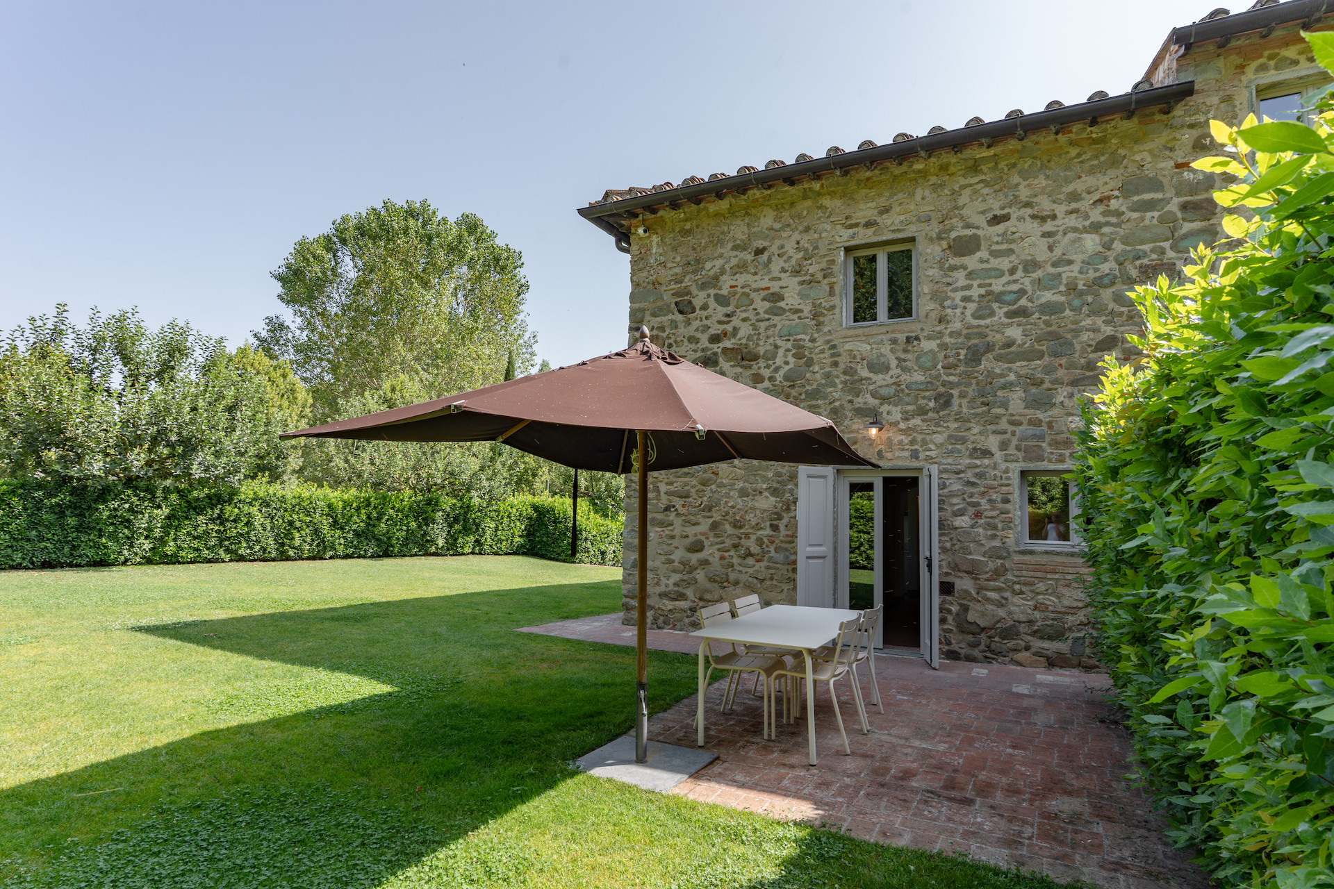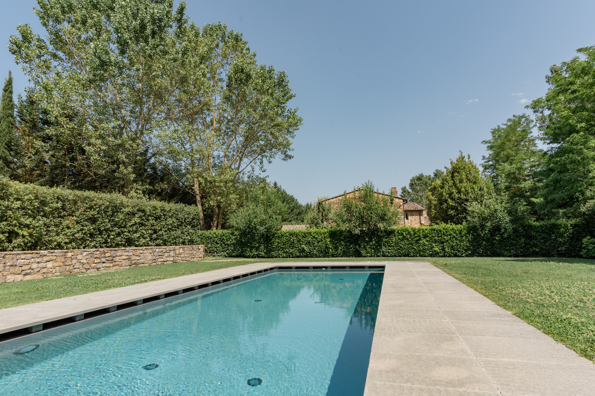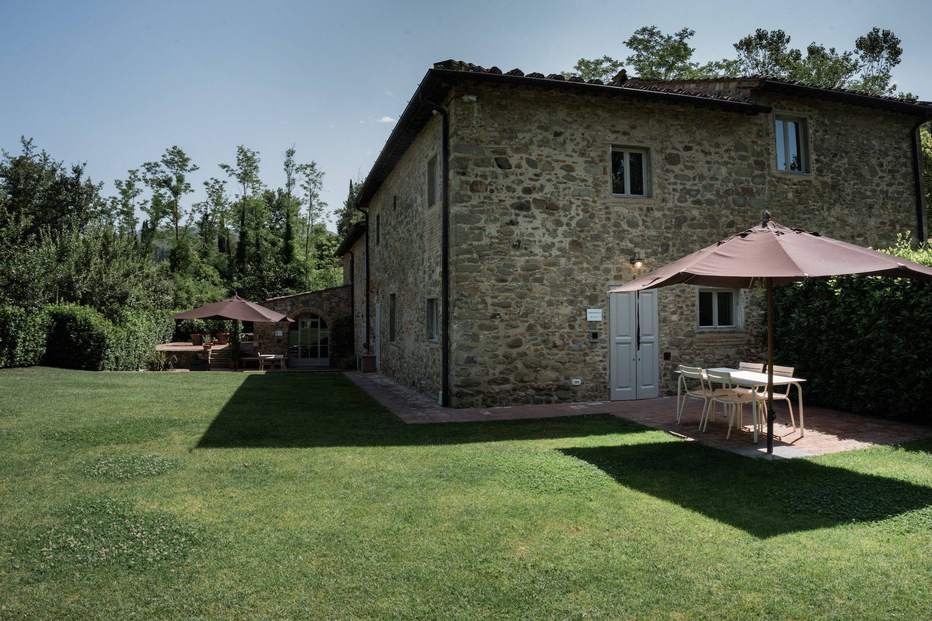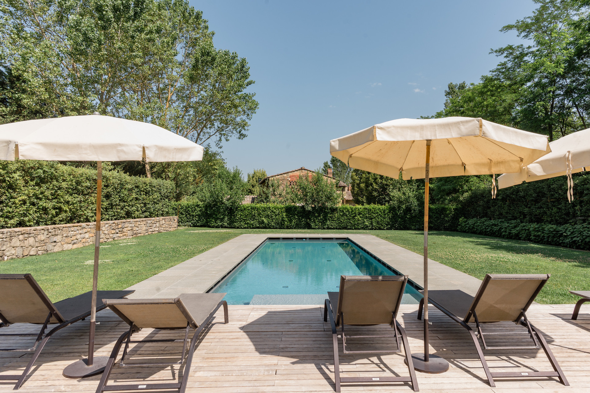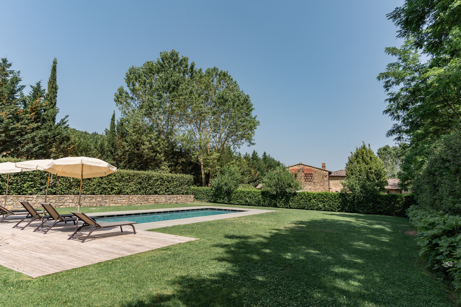 A simple, linear garden surrounded by apple and popular trees, tall bay leaf, holm oaks and linden trees. A beautiful green field surrounds the stone farmhouses and leads to the pool that is surrounded by a solarium where you can completely relax and soak up the sun.