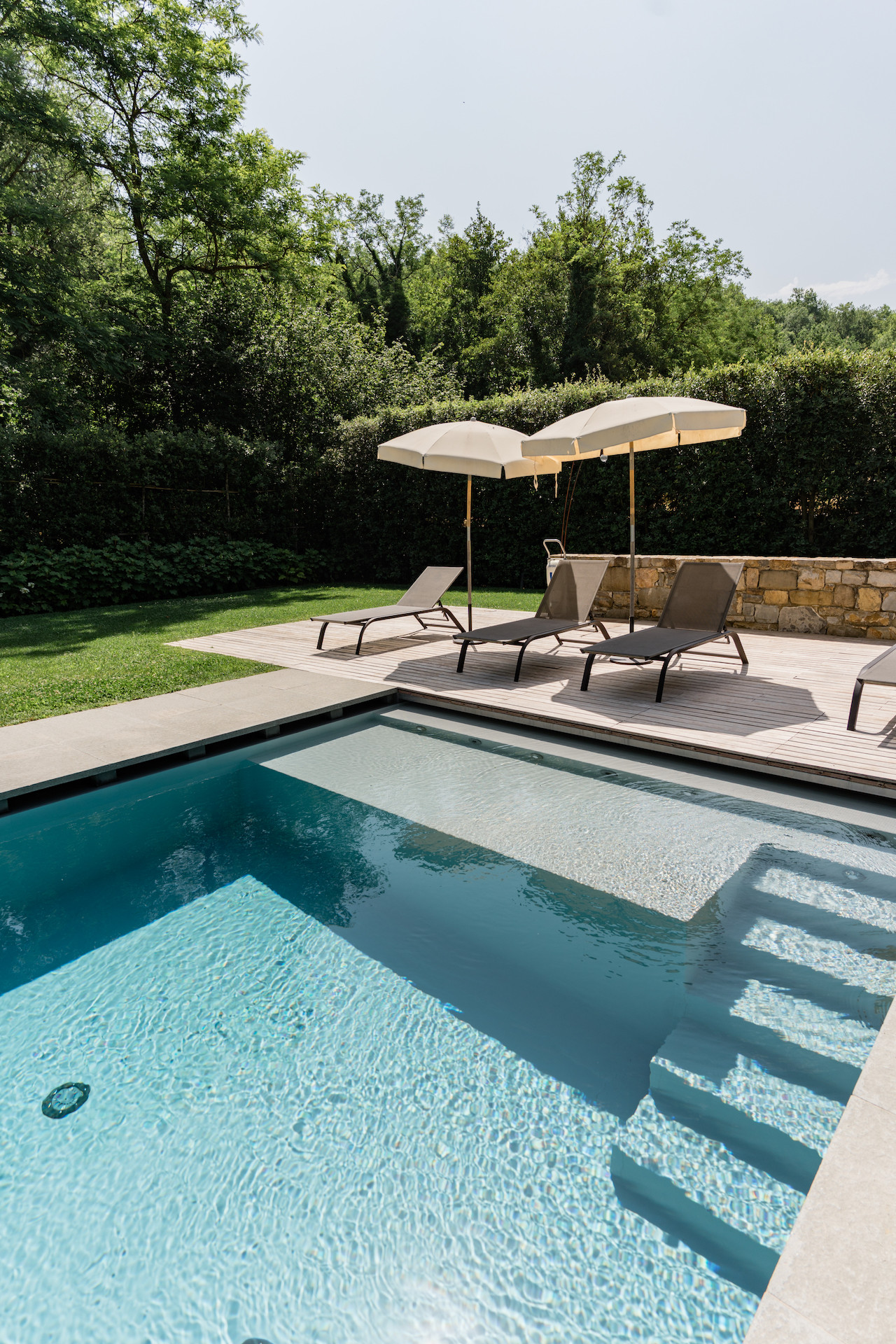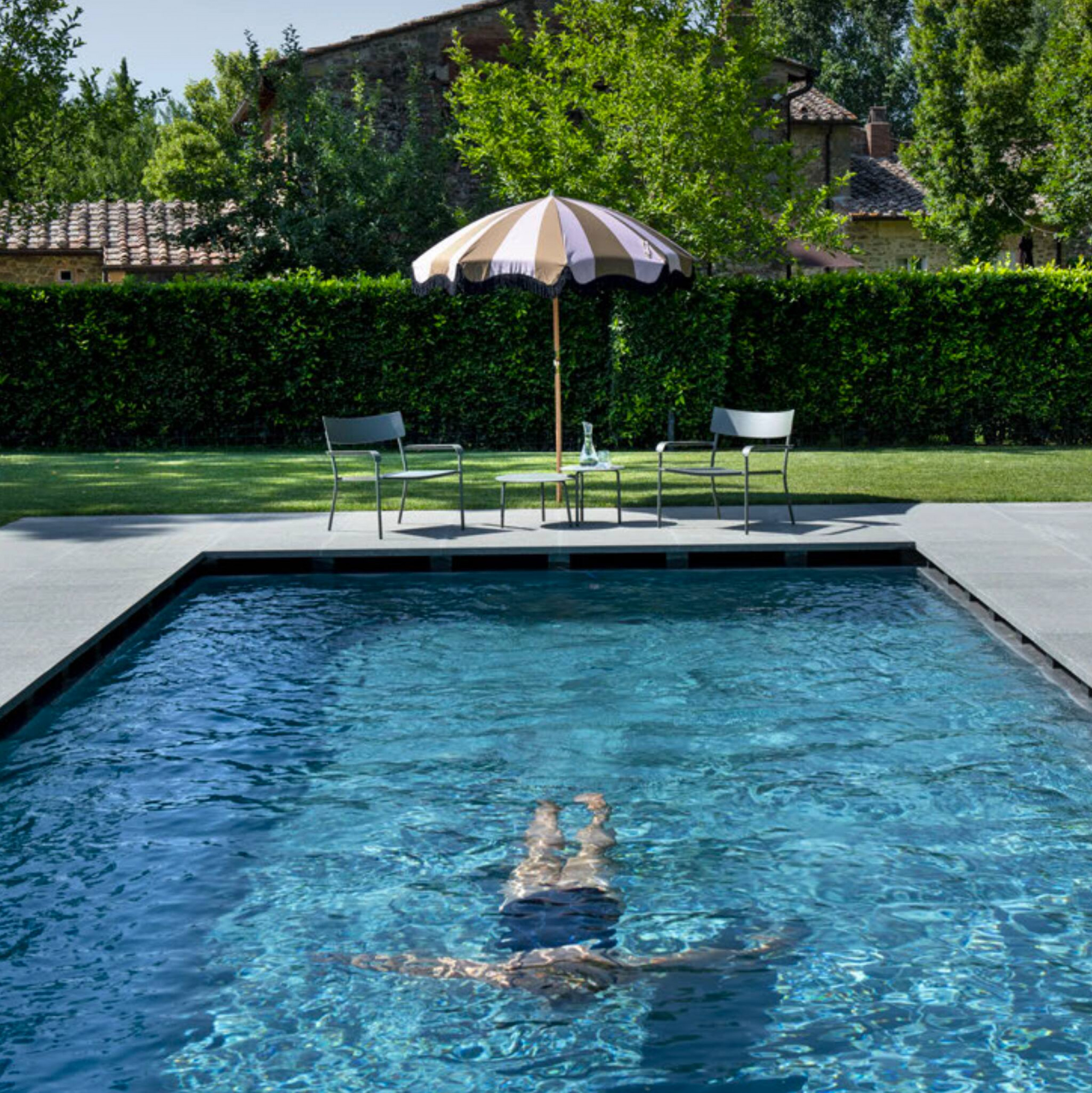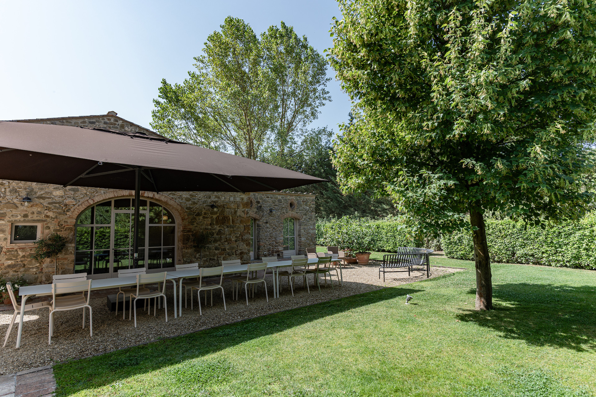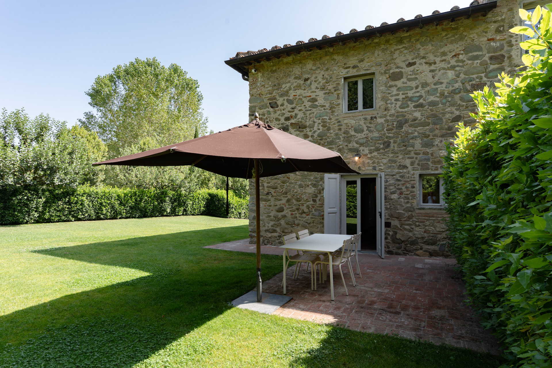 A simple, linear garden surrounded by apple and popular trees, tall bay leaf, holm oaks and linden trees. A beautiful green field surrounds the stone farmhouses and leads to the pool that is surrounded by a solarium where you can completely relax and soak up the sun.