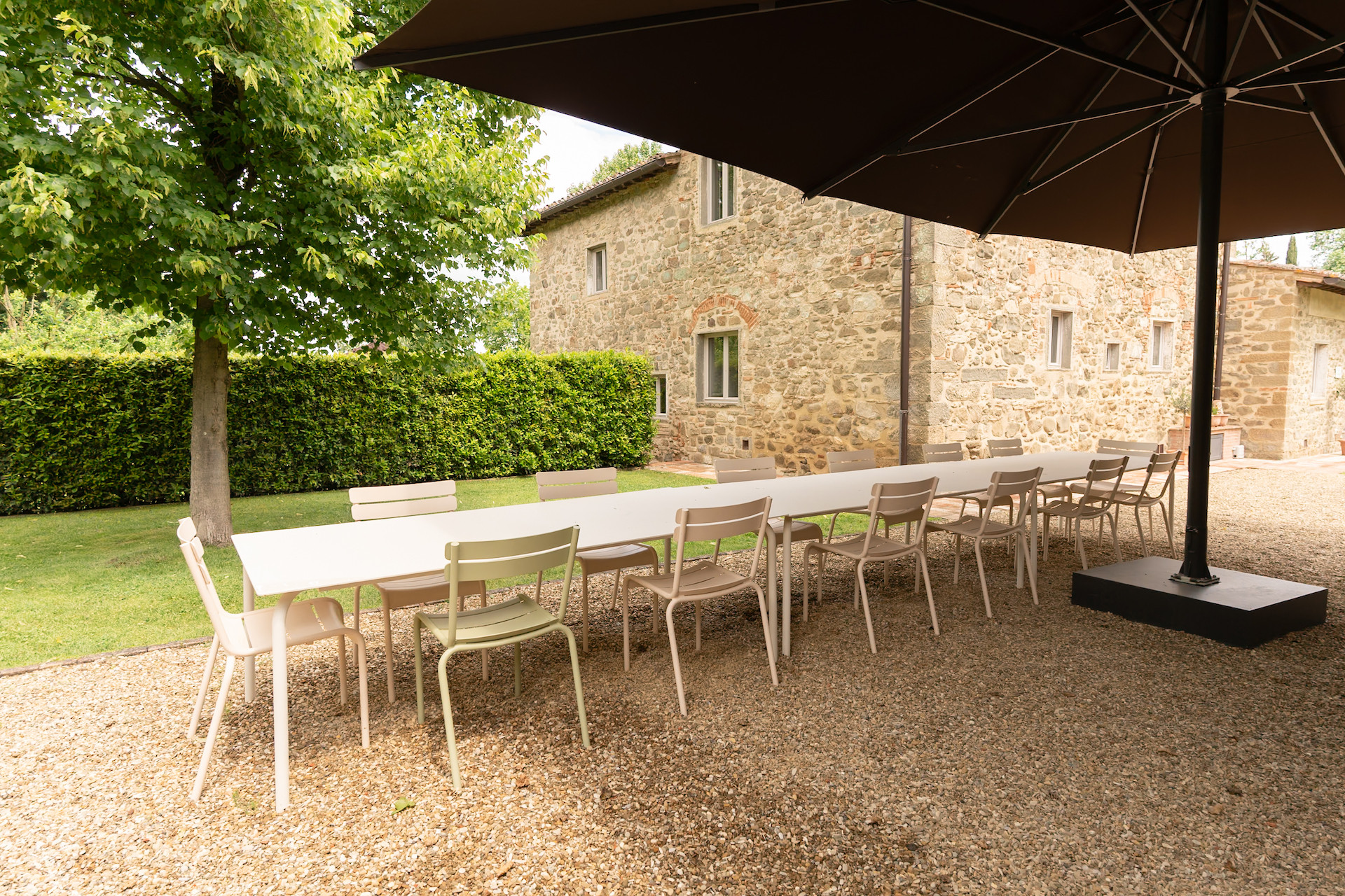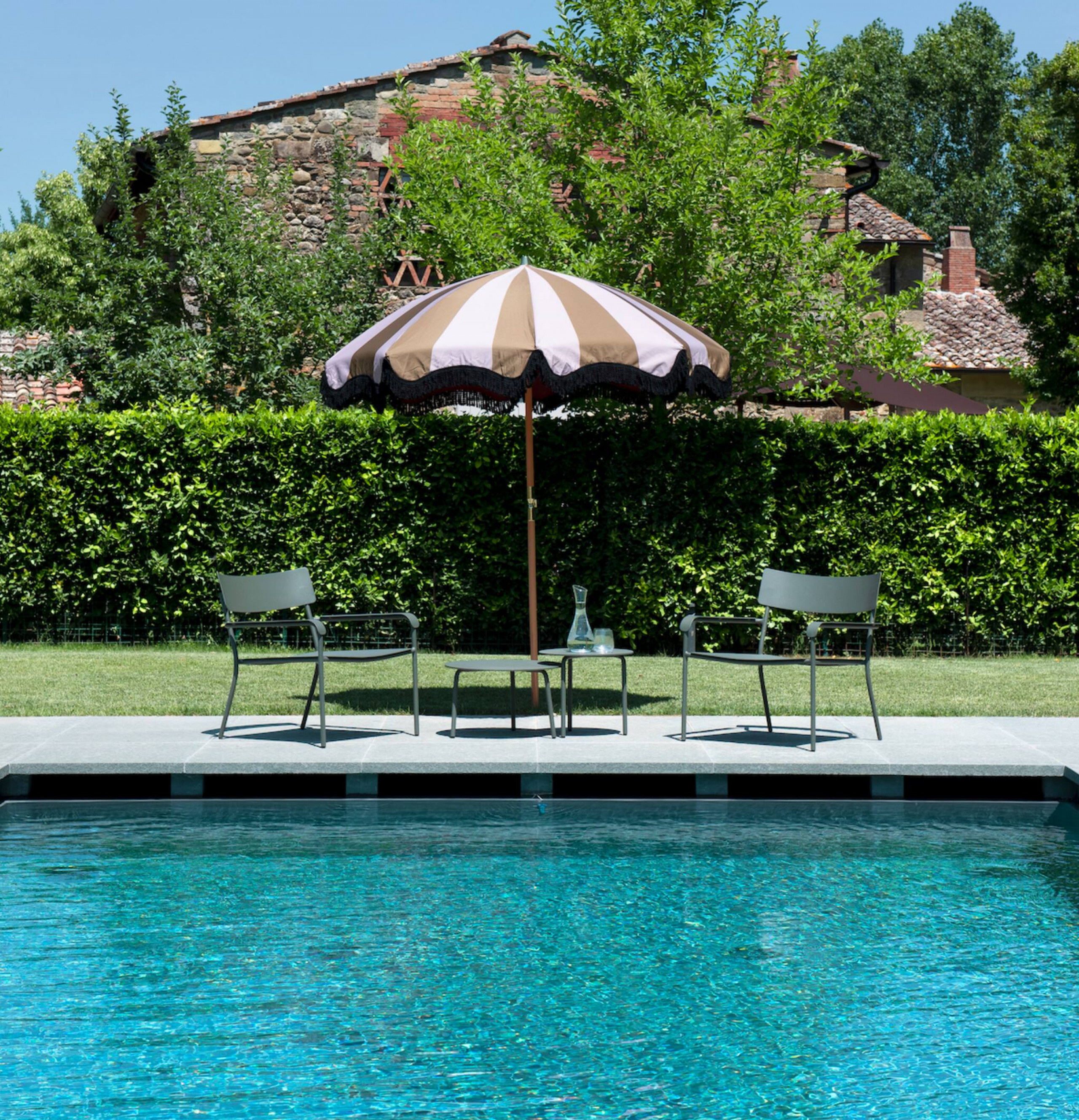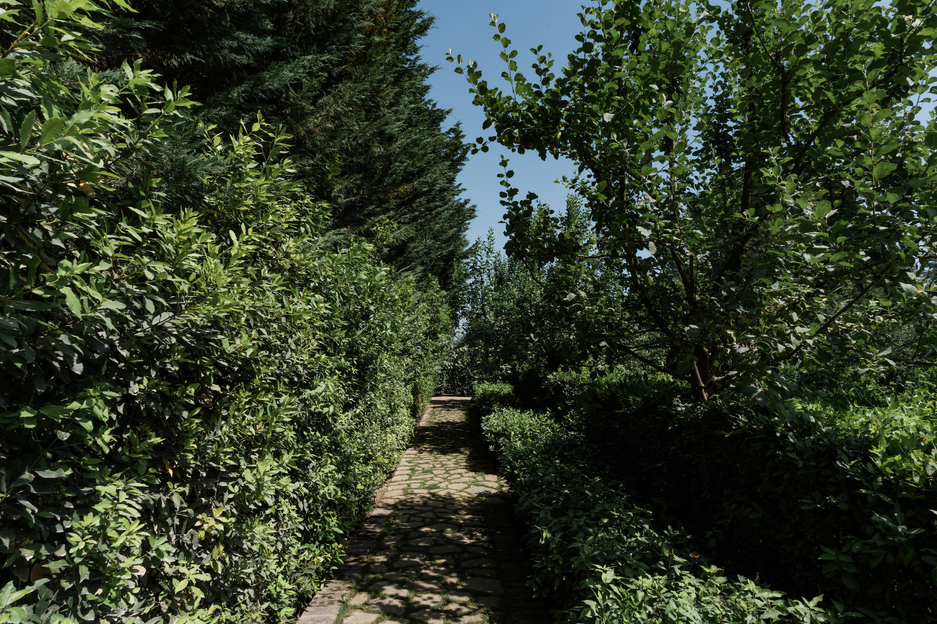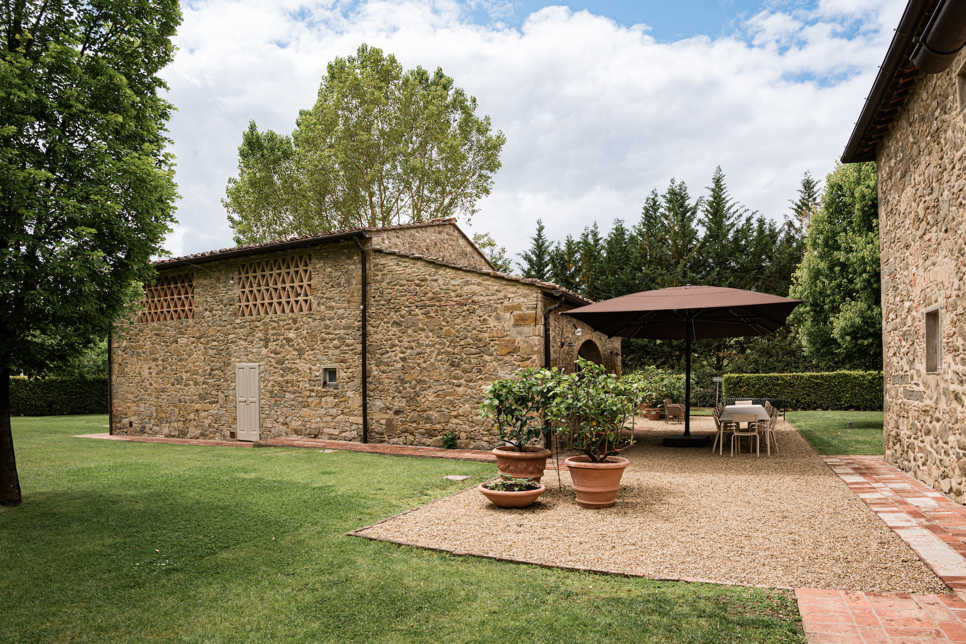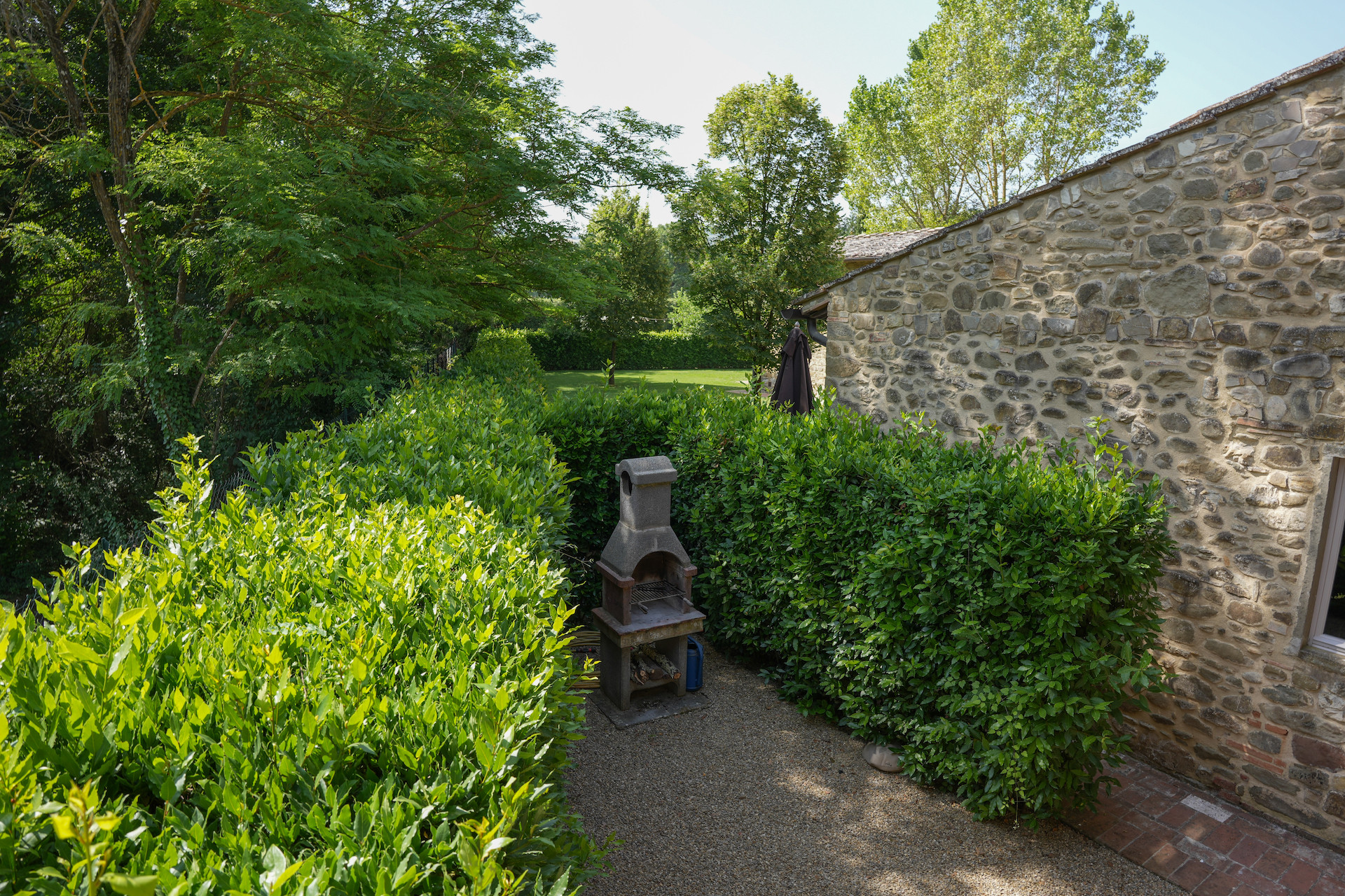 A simple, linear garden surrounded by apple and popular trees, tall bay leaf, holm oaks and linden trees. A beautiful green field surrounds the stone farmhouses and leads to the pool that is surrounded by a solarium where you can completely relax and soak up the sun.