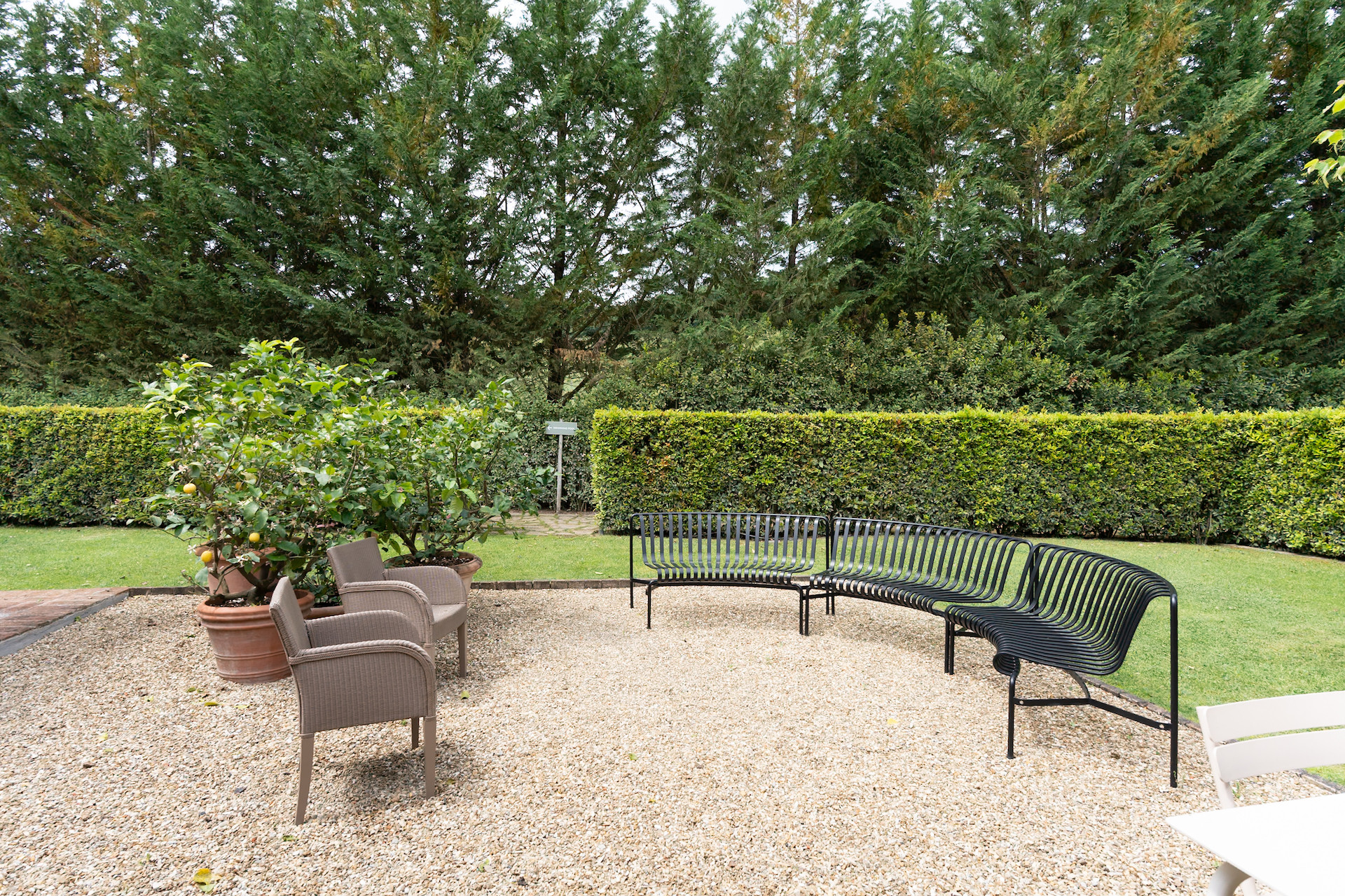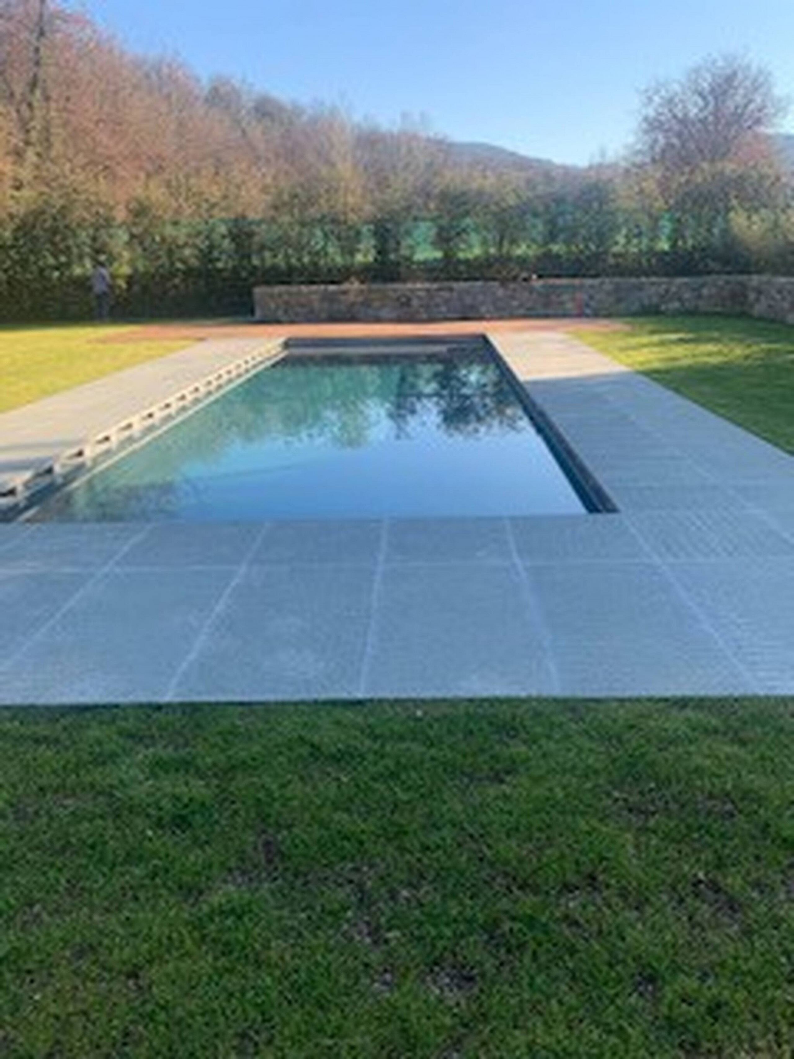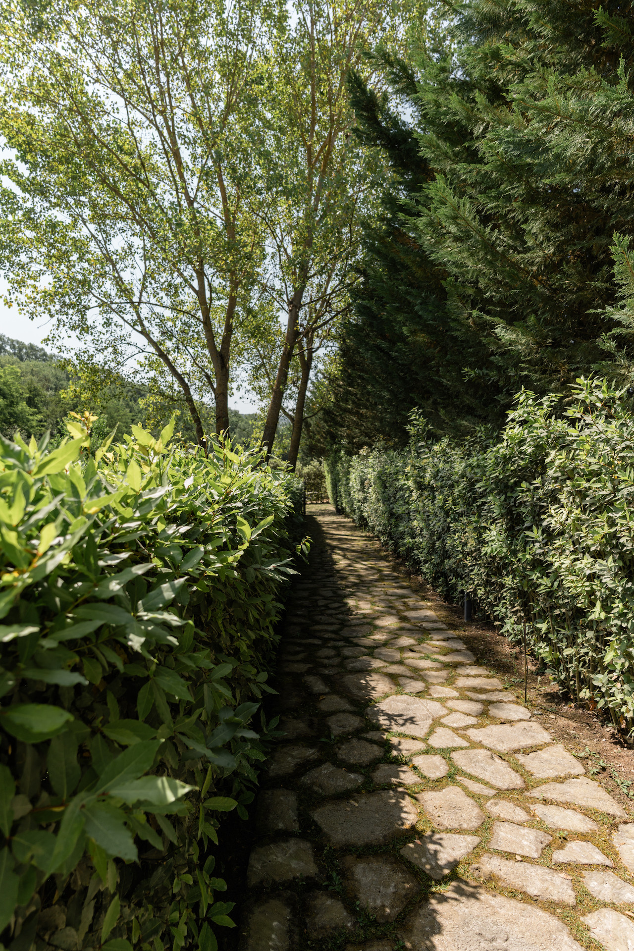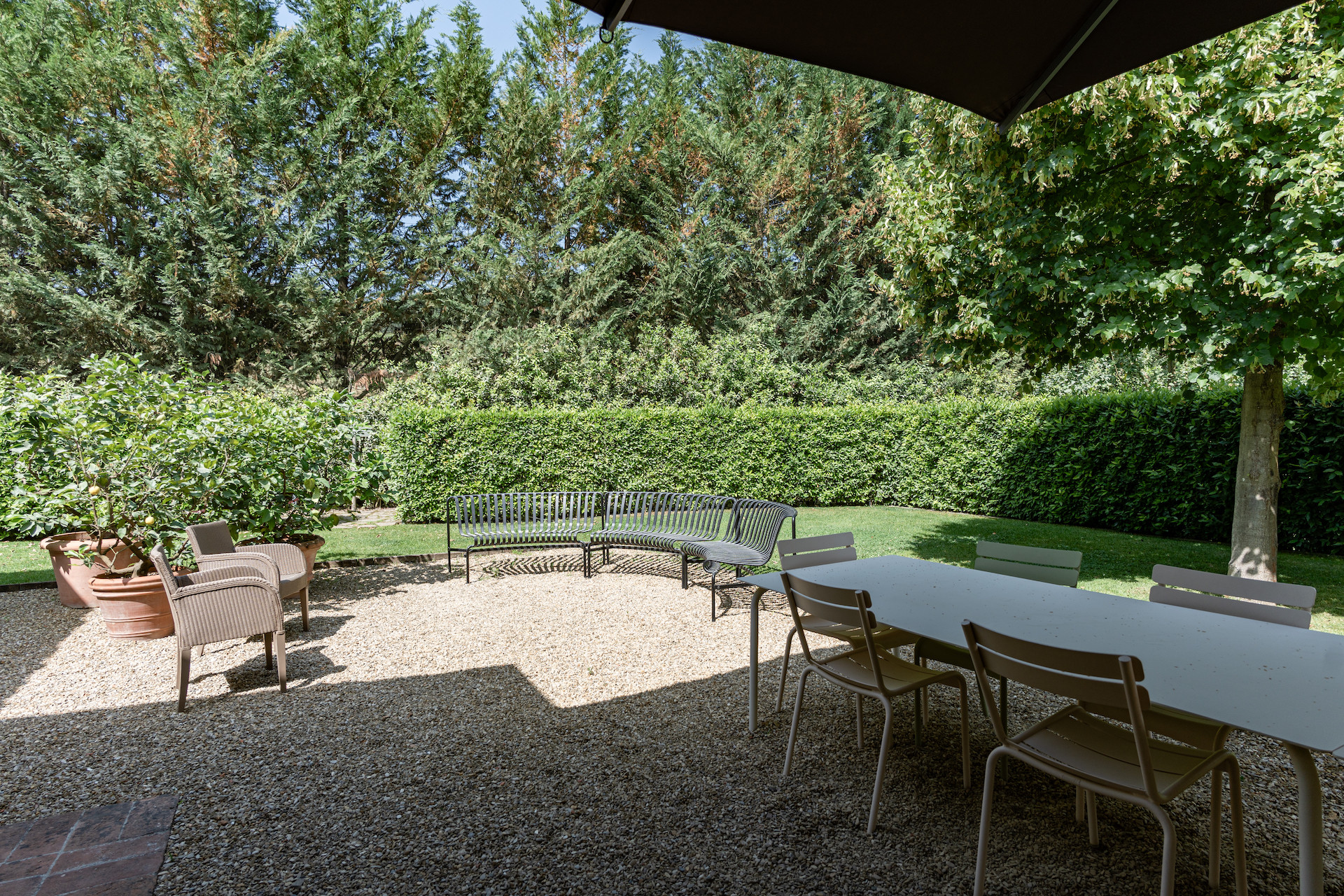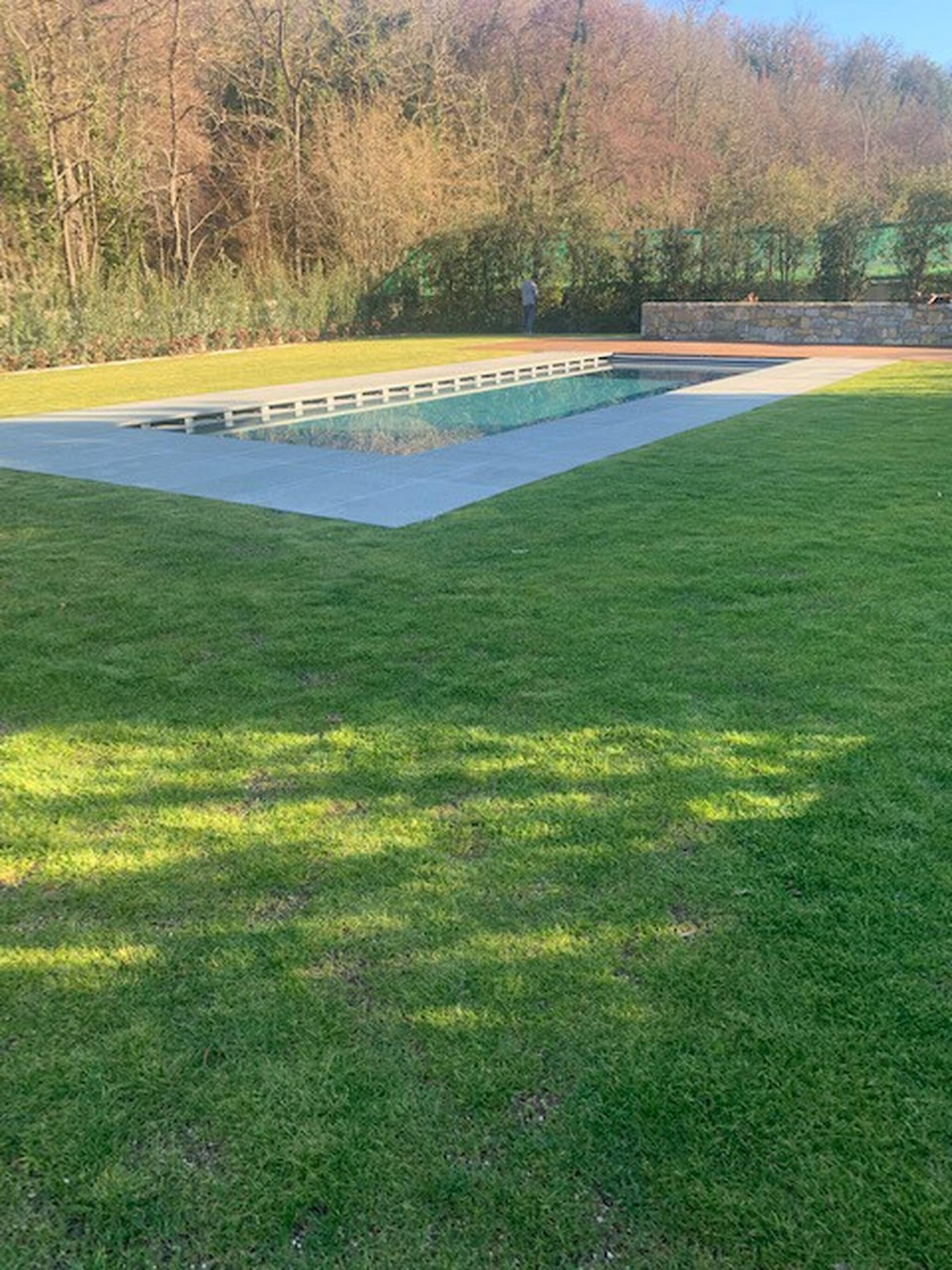 A simple, linear garden surrounded by apple and popular trees, tall bay leaf, holm oaks and linden trees. A beautiful green field surrounds the stone farmhouses and leads to the pool that is surrounded by a solarium where you can completely relax and soak up the sun.