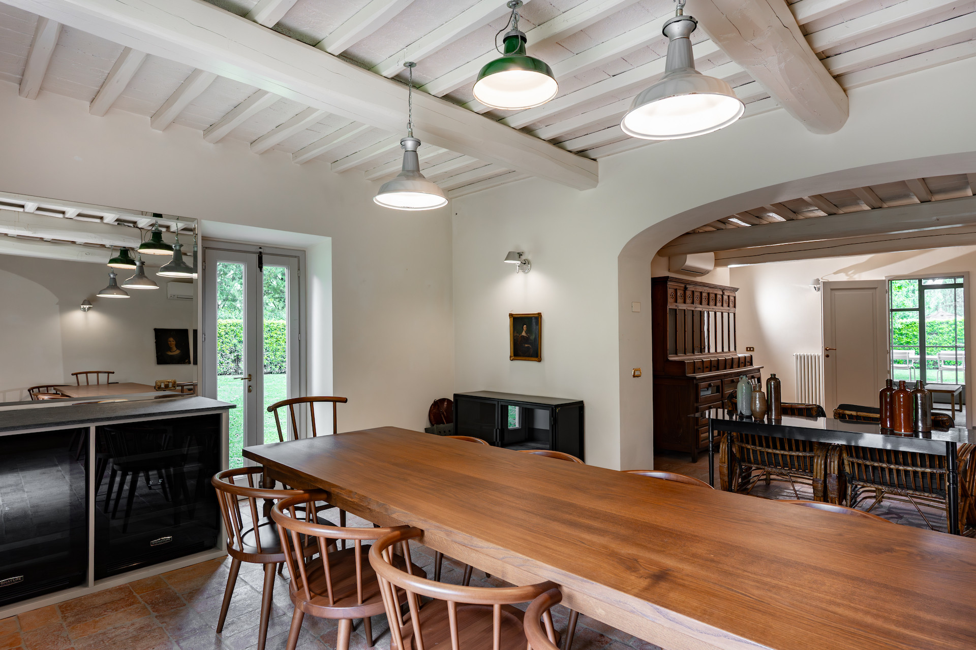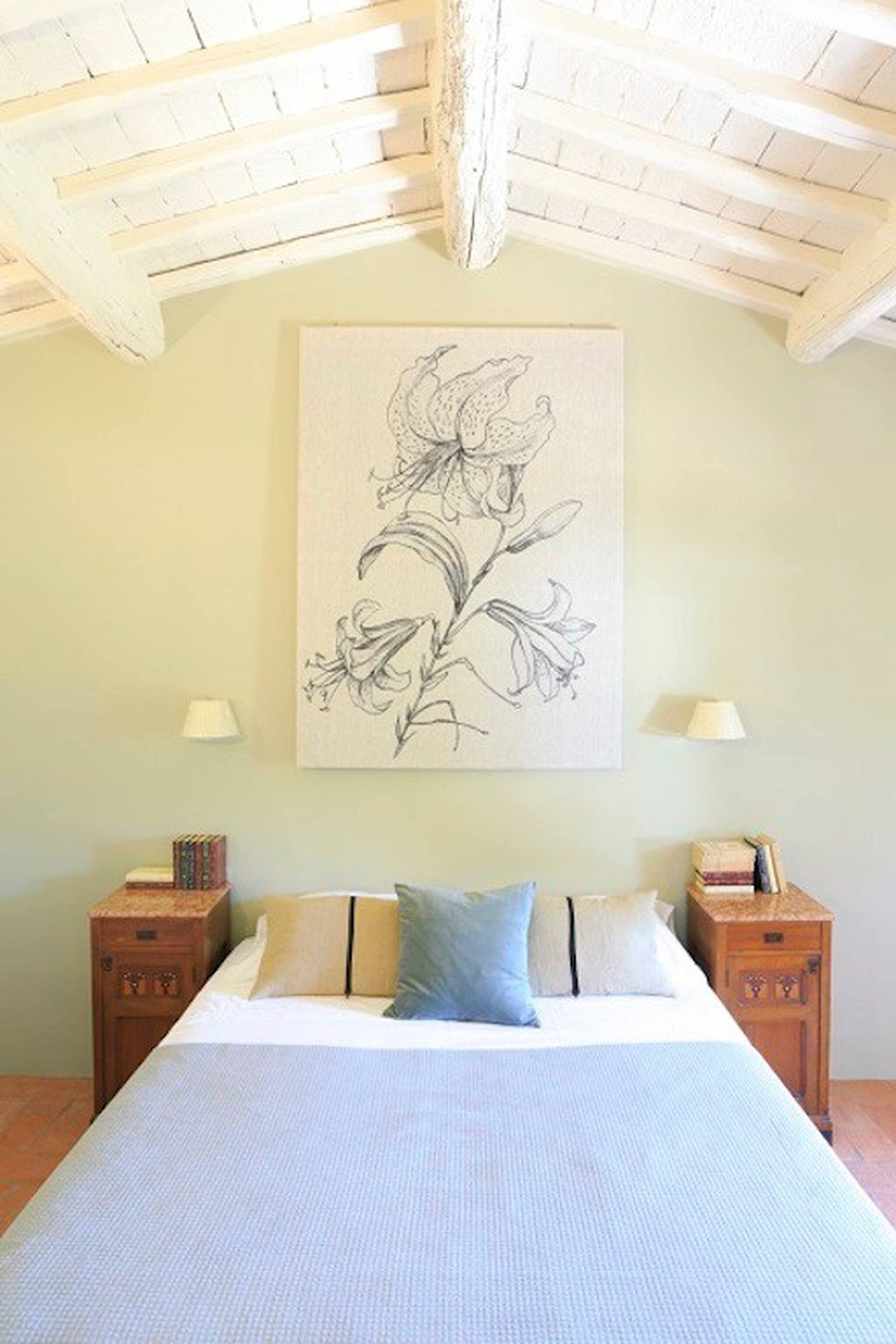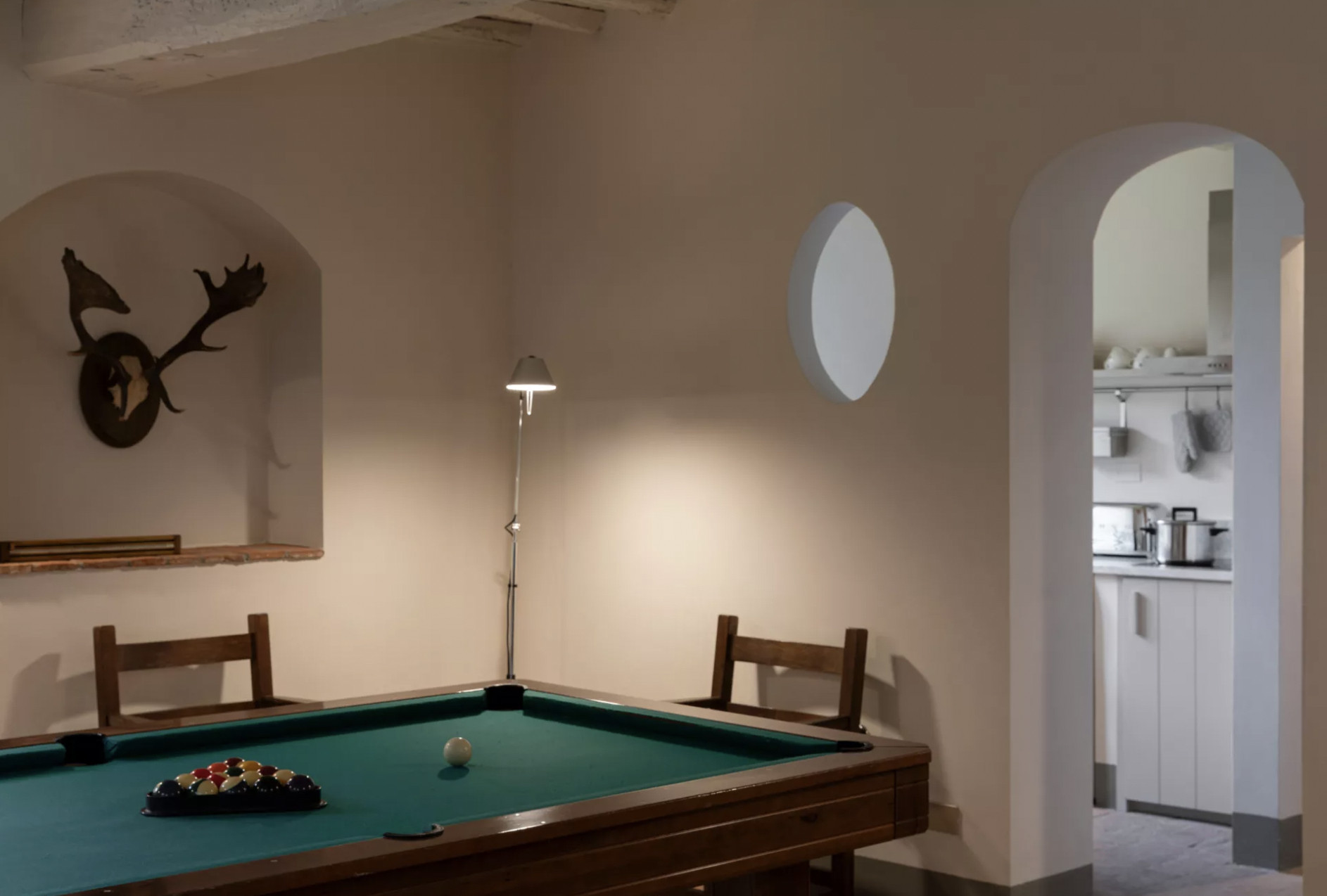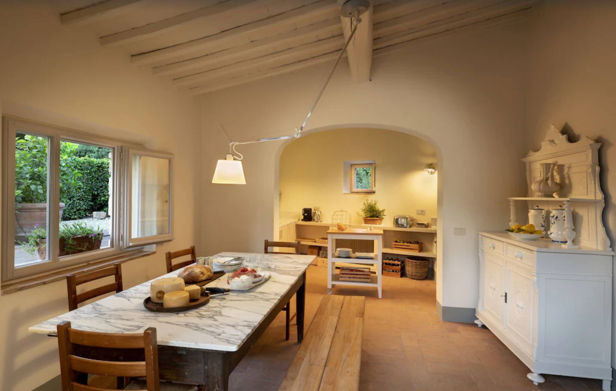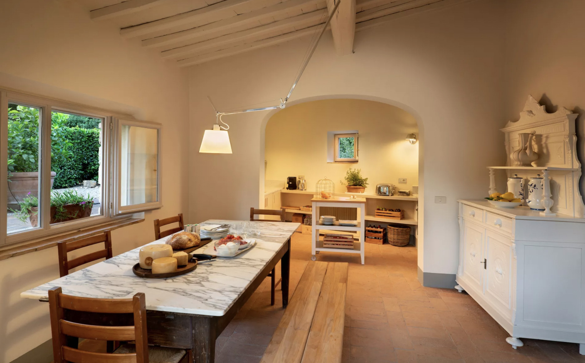 A beautiful set of arched glass doors invites you into the high ceilinged lounge, with comfy Tuscan furniture. Next to the fully equipped kitchen, the large dining room looks out onto the garden. The laundry and bathroom are on the ground floor, while on the top floor there are two bedrooms, each with its own bathroom. A covered outdoors dining table seats 22 guests for memorable alfresco parties.