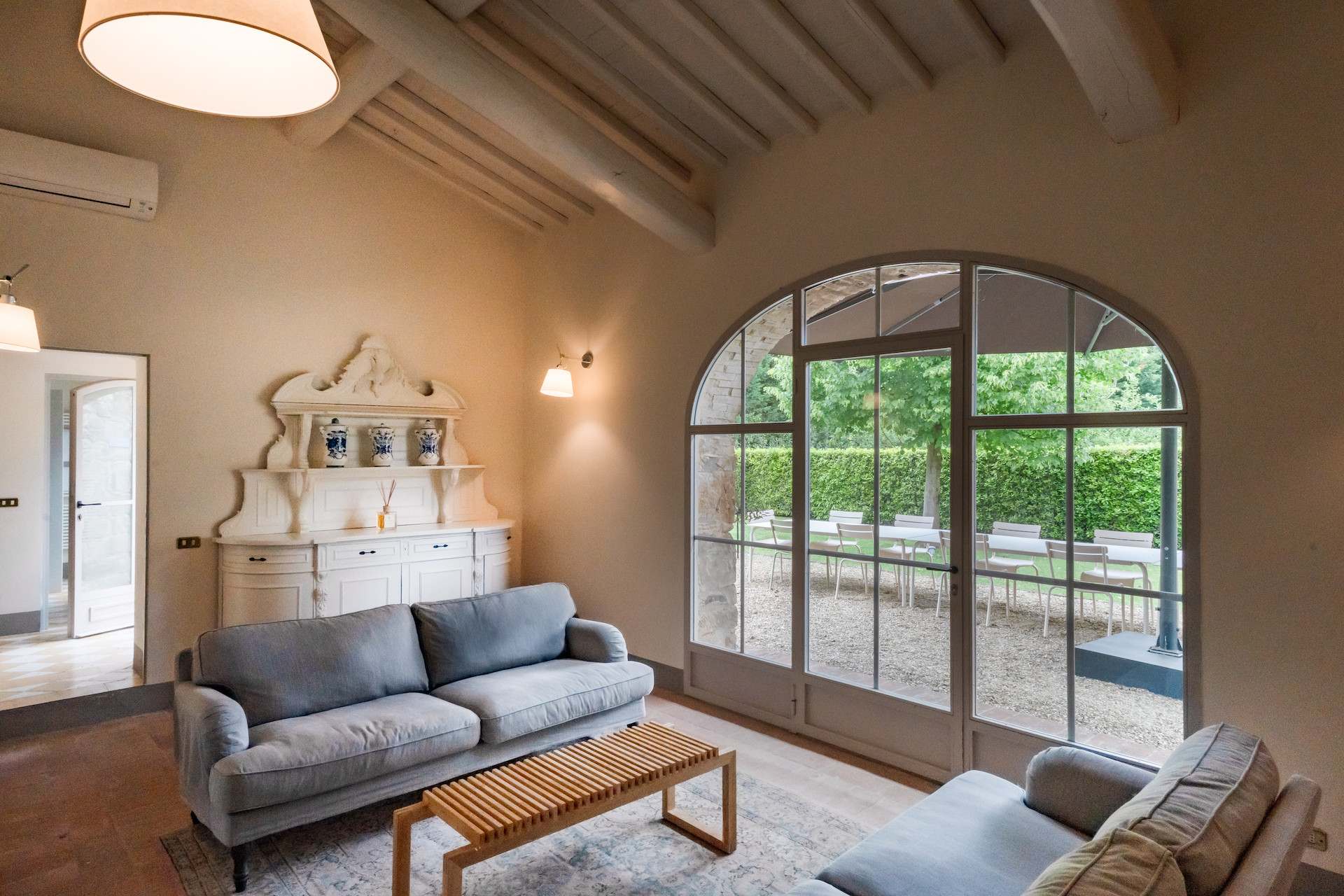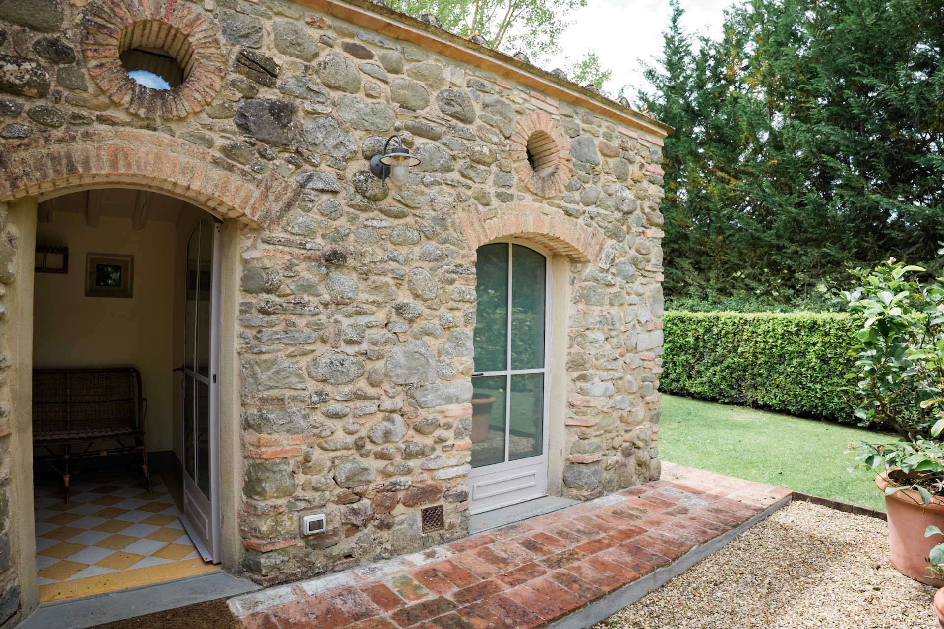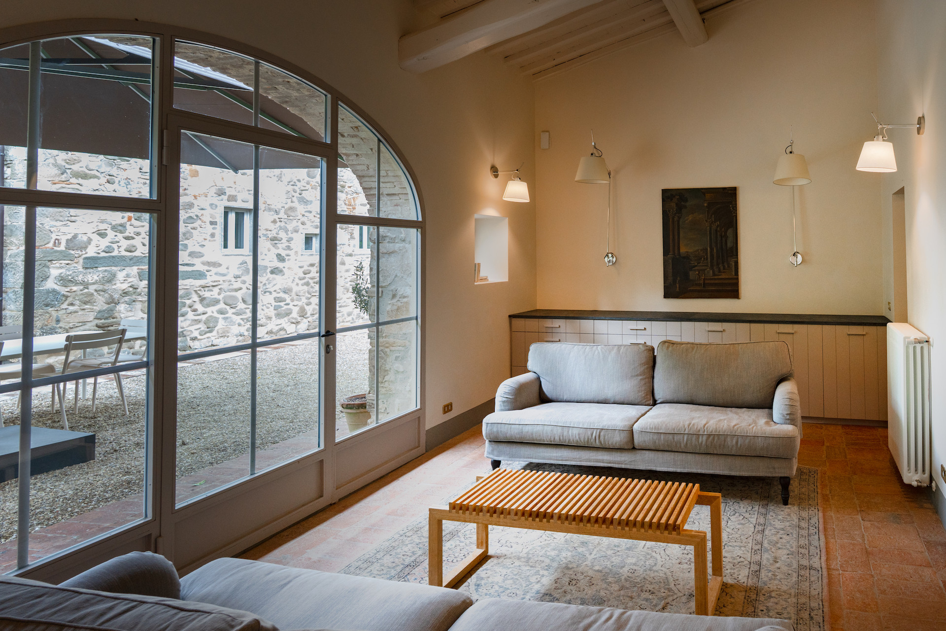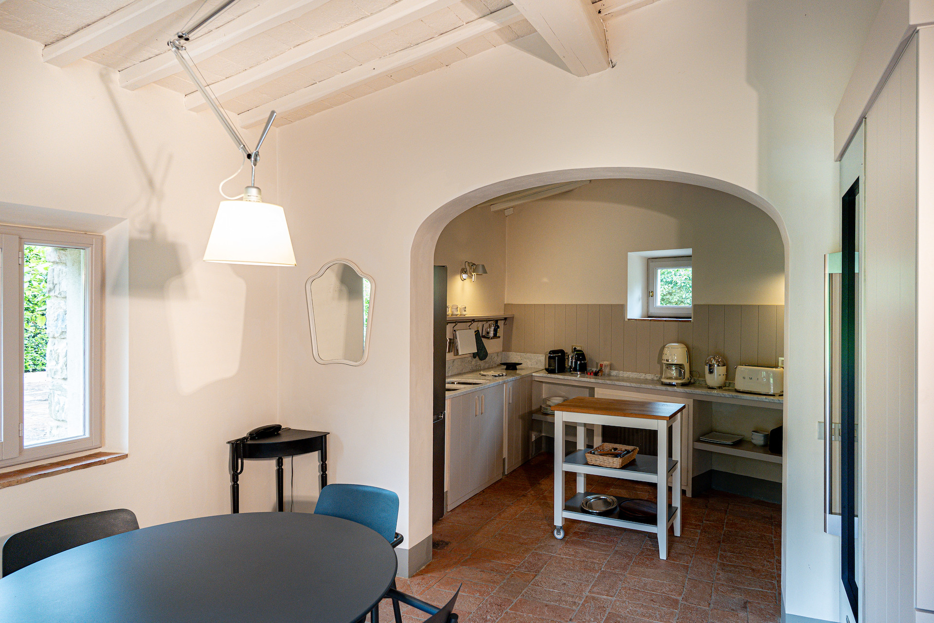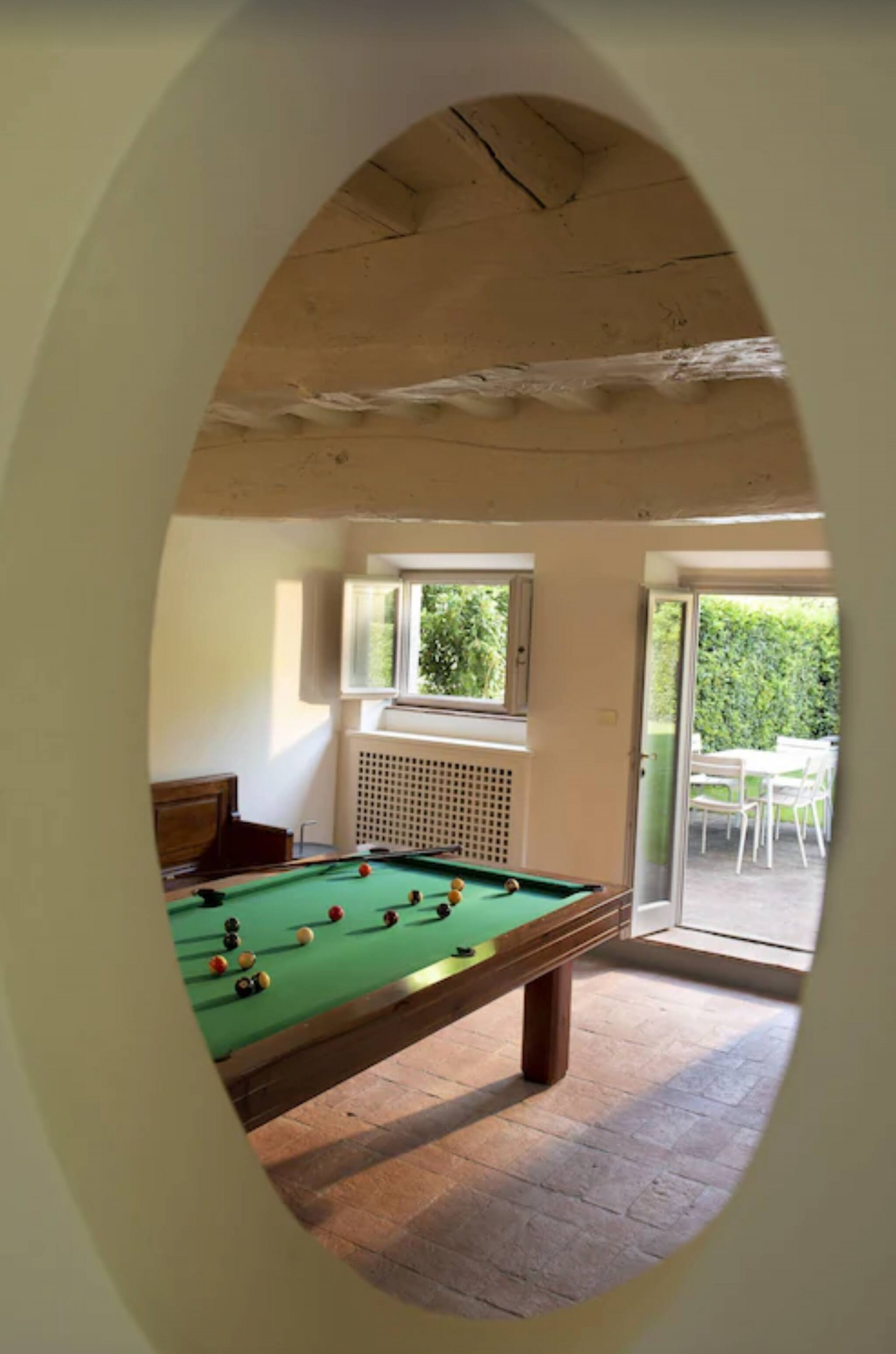 A beautiful set of arched glass doors invites you into the high ceilinged lounge, with comfy Tuscan furniture. Next to the fully equipped kitchen, the large dining room looks out onto the garden. The laundry and bathroom are on the ground floor, while on the top floor there are two bedrooms, each with its own bathroom. A covered outdoors dining table seats 22 guests for memorable alfresco parties.