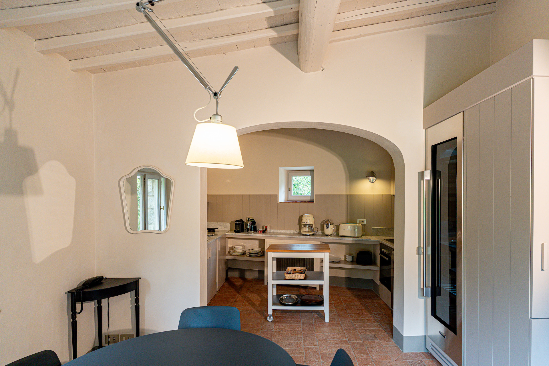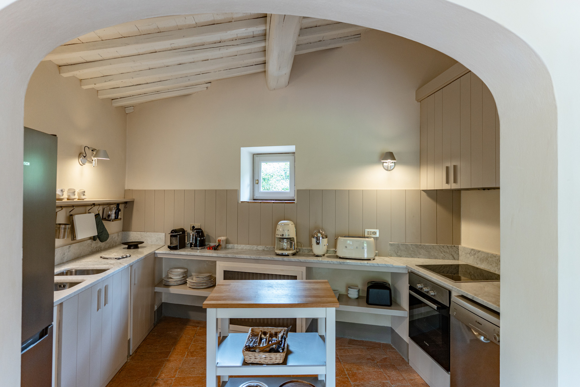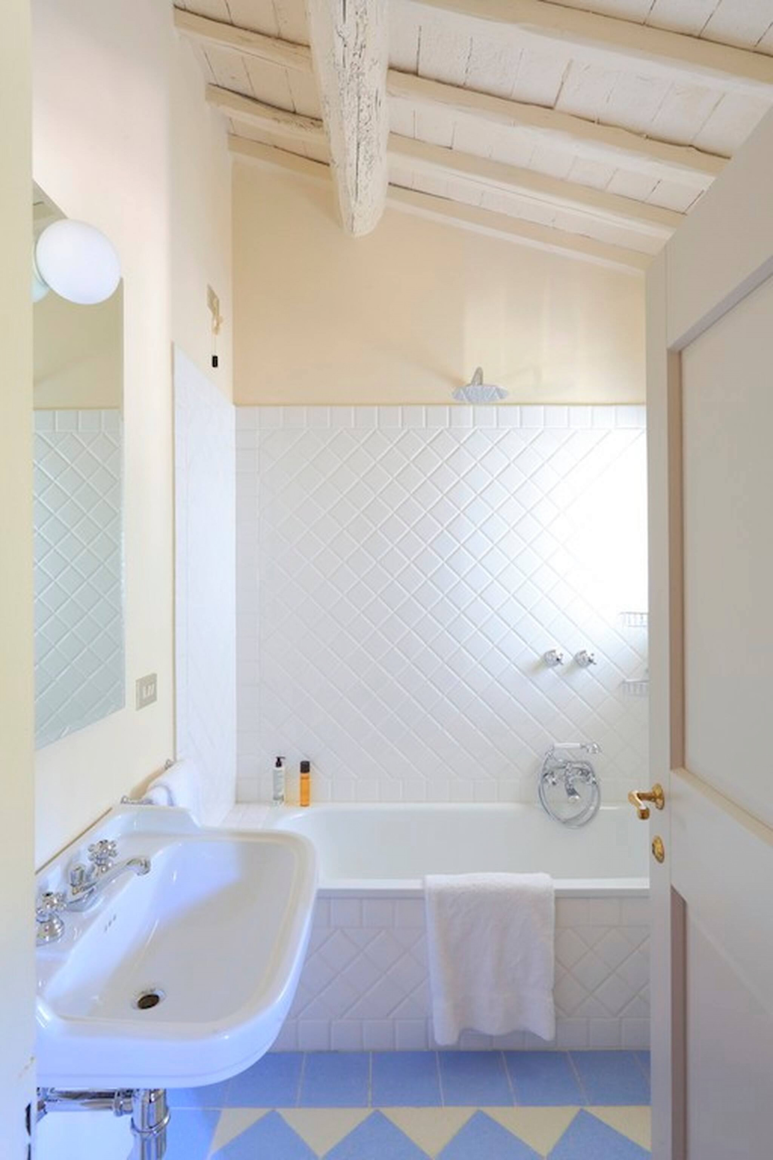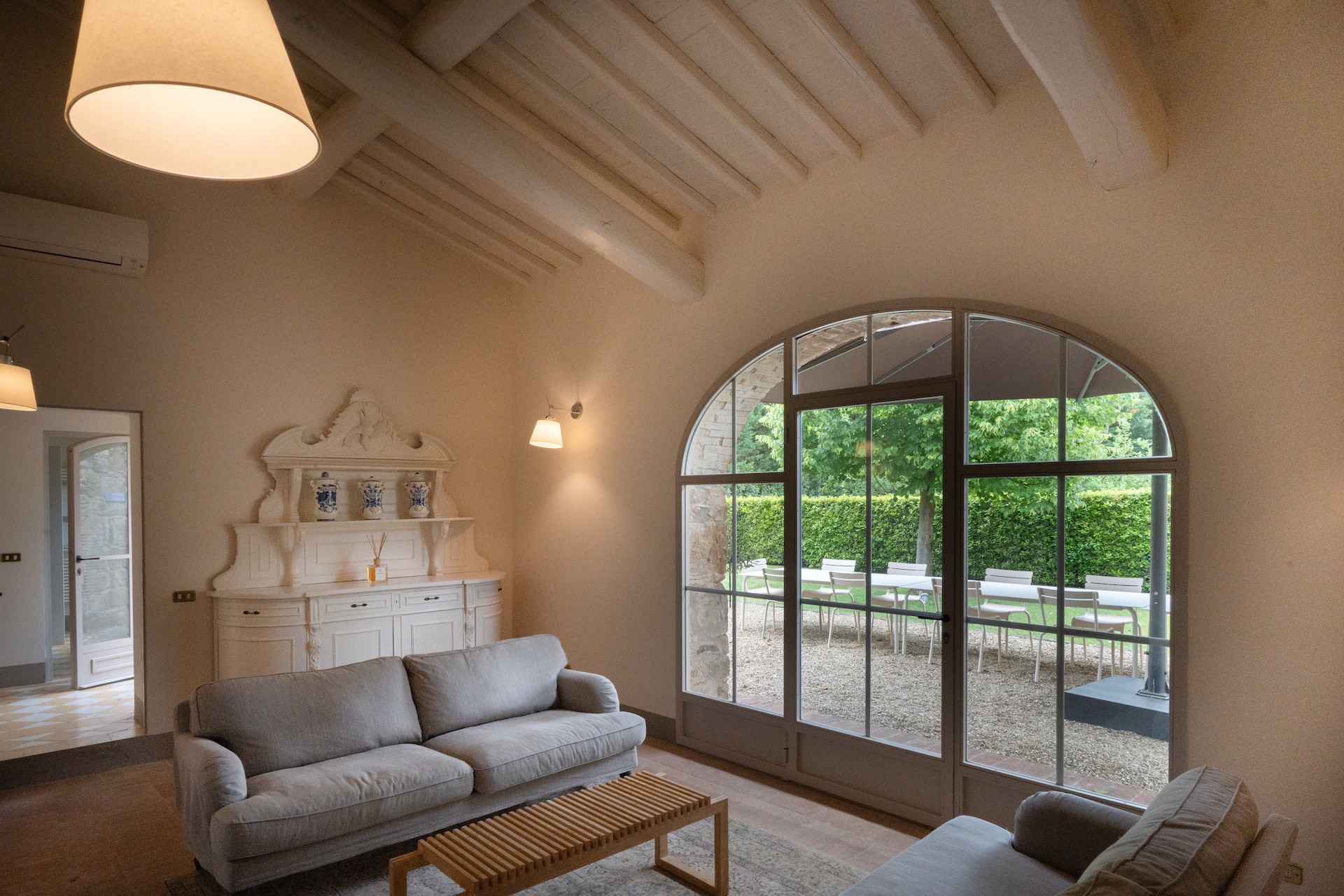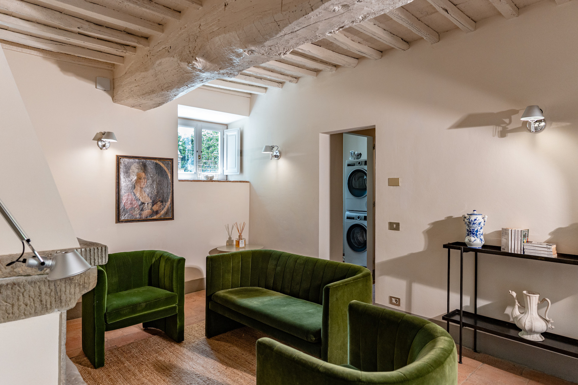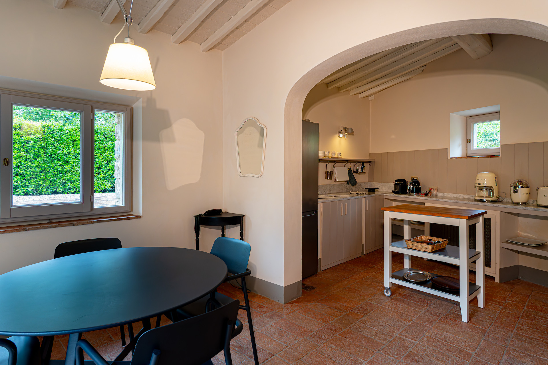 A beautiful set of arched glass doors invites you into the high ceilinged lounge, with comfy Tuscan furniture. Next to the fully equipped kitchen, the large dining room looks out onto the garden. The laundry and bathroom are on the ground floor, while on the top floor there are two bedrooms, each with its own bathroom. A covered outdoors dining table seats 22 guests for memorable alfresco parties.