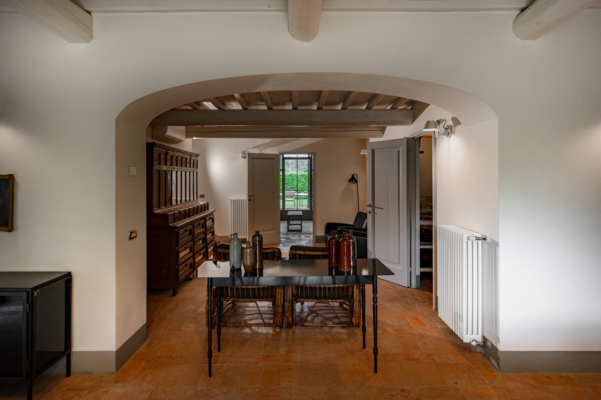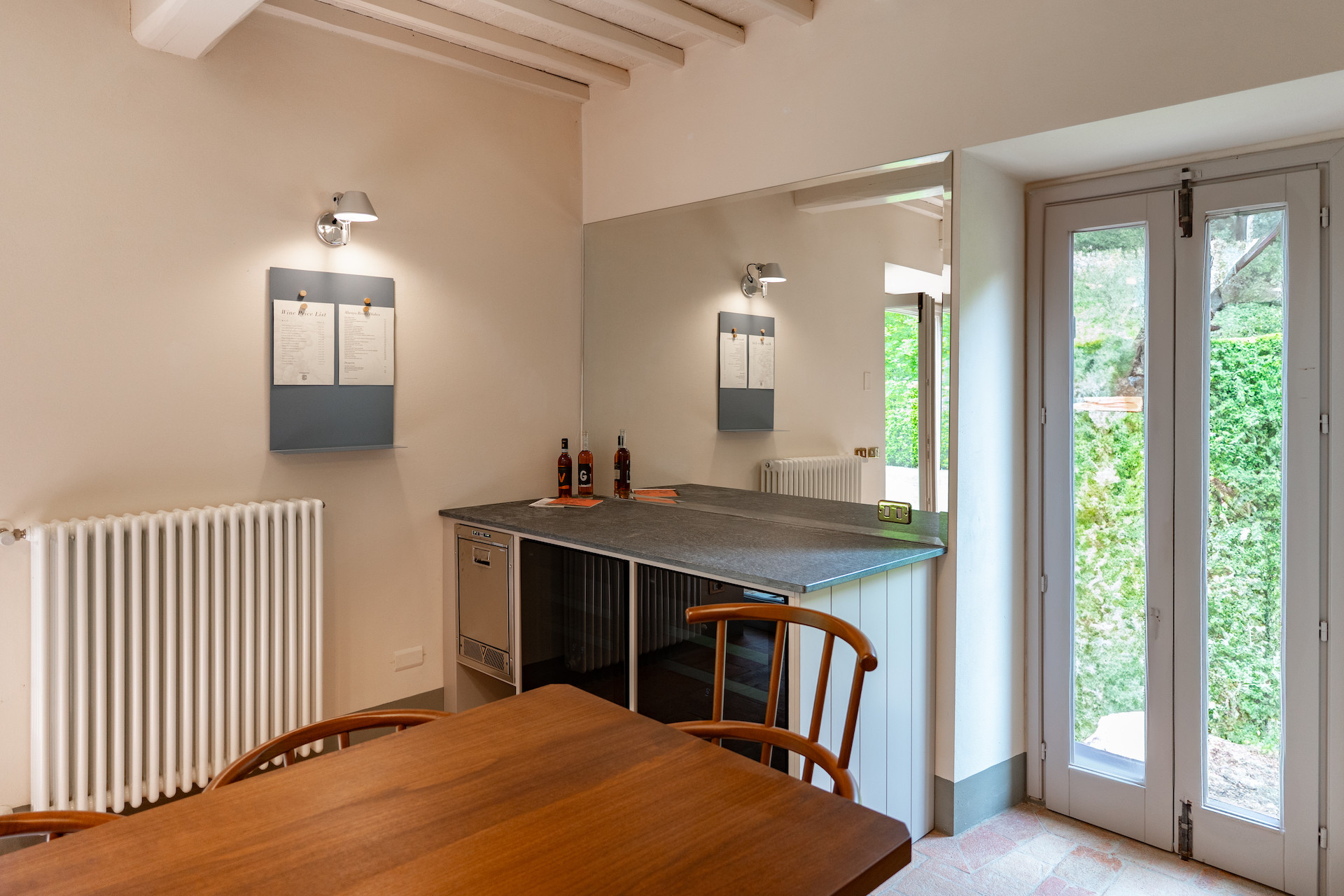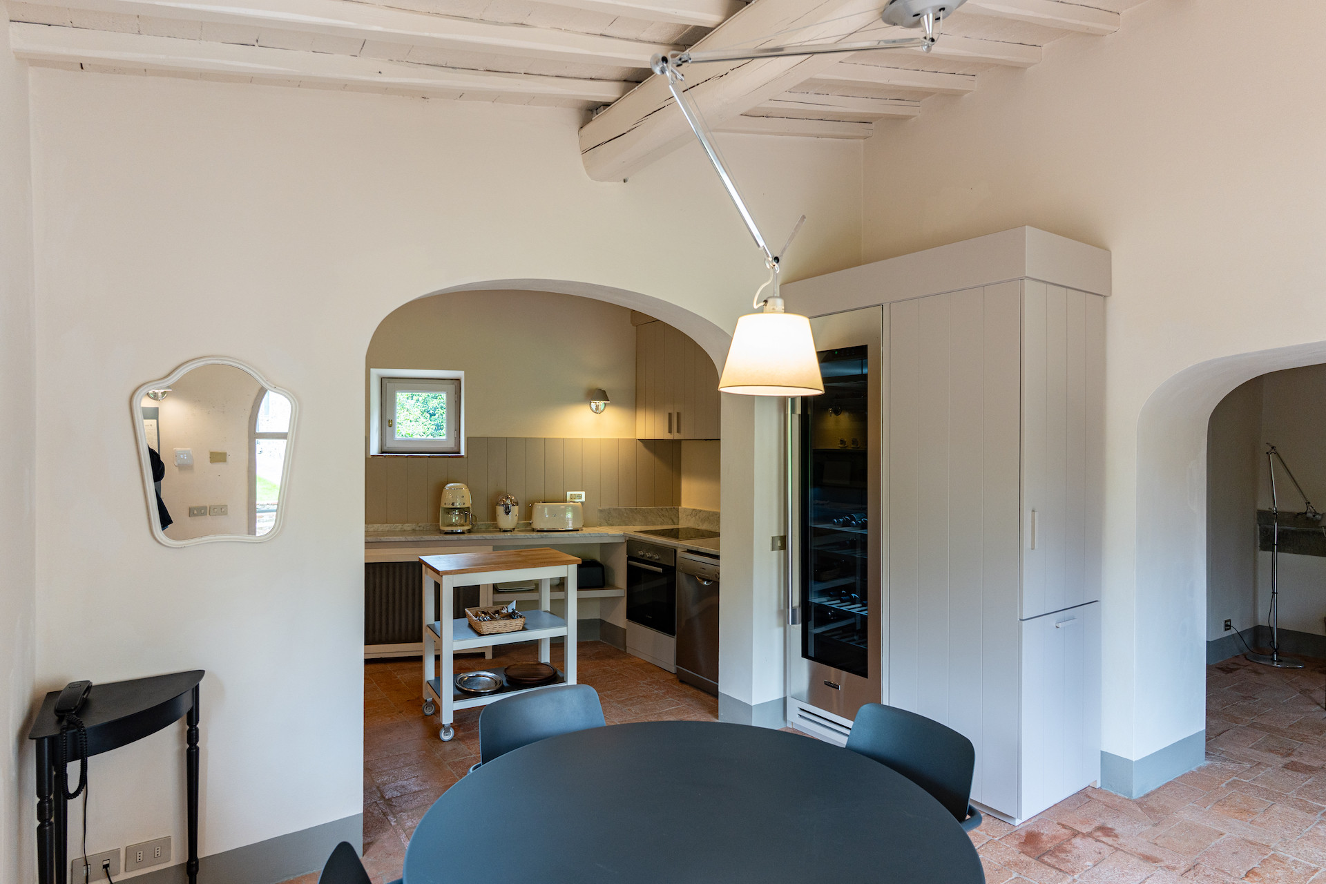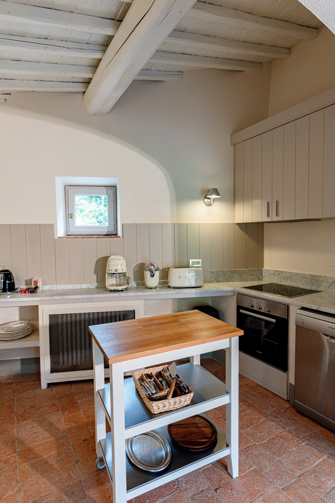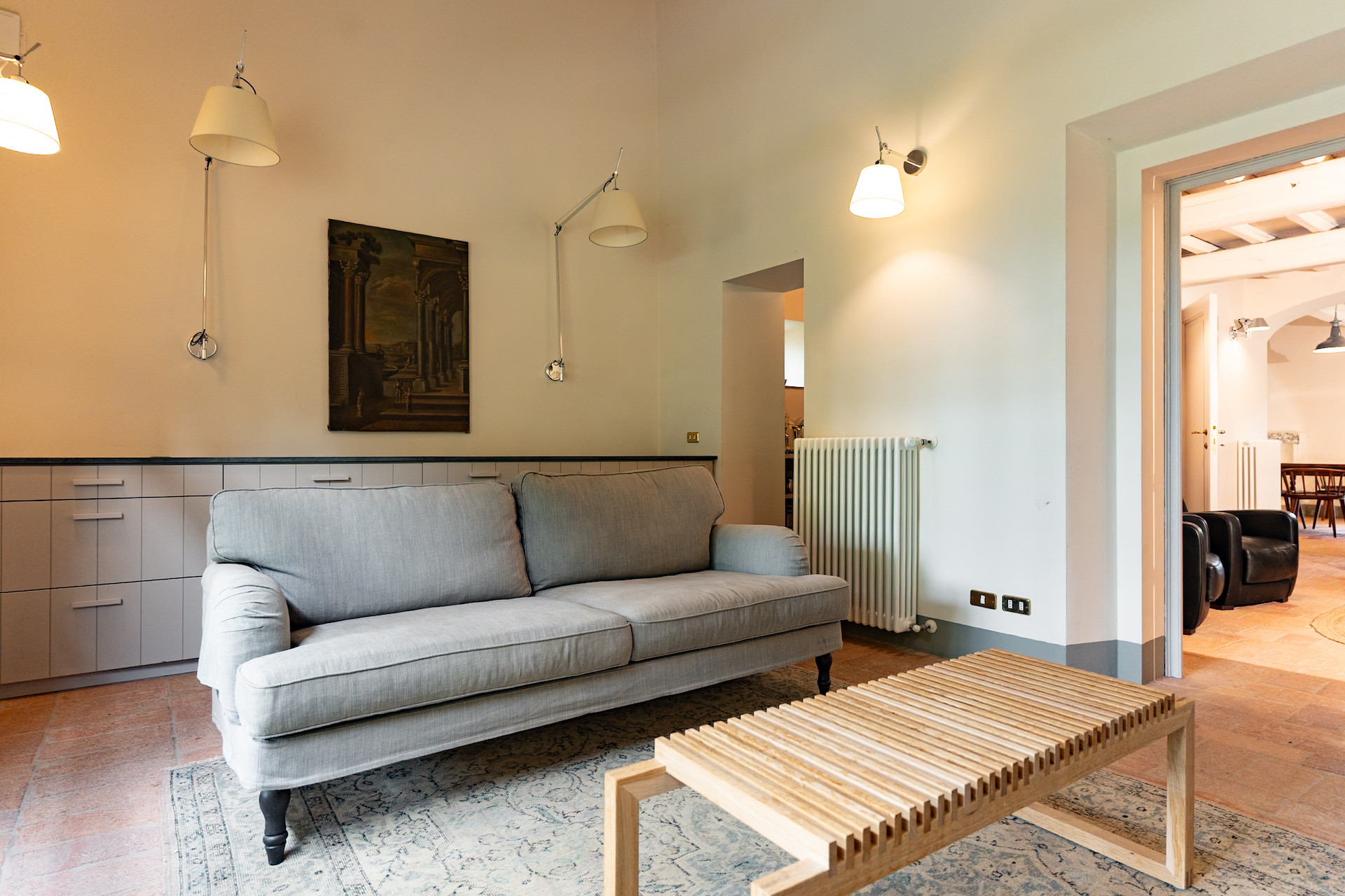 A beautiful set of arched glass doors invites you into the high ceilinged lounge, with comfy Tuscan furniture. Next to the fully equipped kitchen, the large dining room looks out onto the garden. The laundry and bathroom are on the ground floor, while on the top floor there are two bedrooms, each with its own bathroom. A covered outdoors dining table seats 22 guests for memorable alfresco parties.