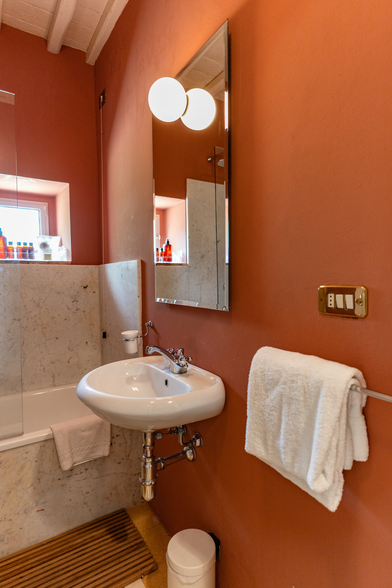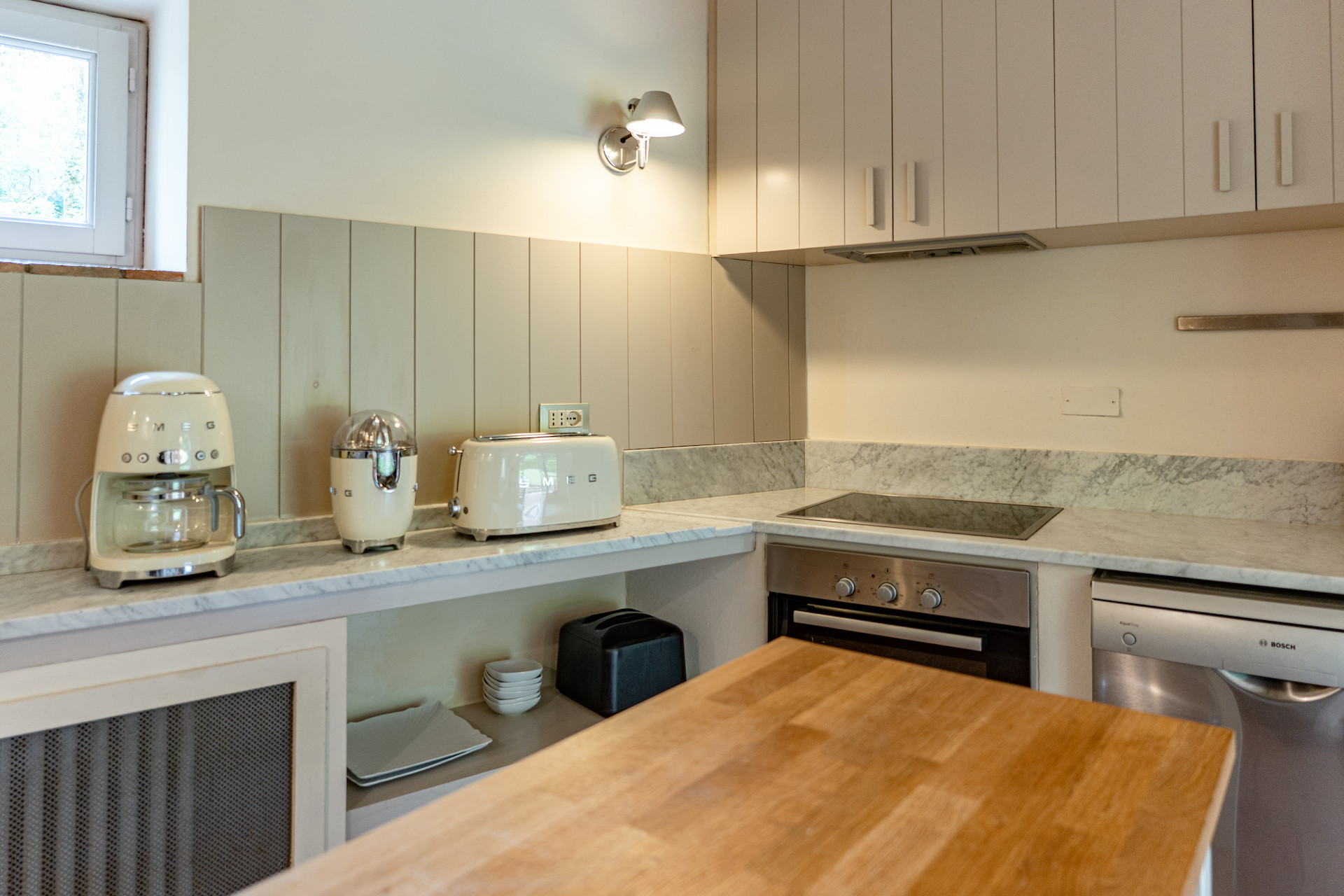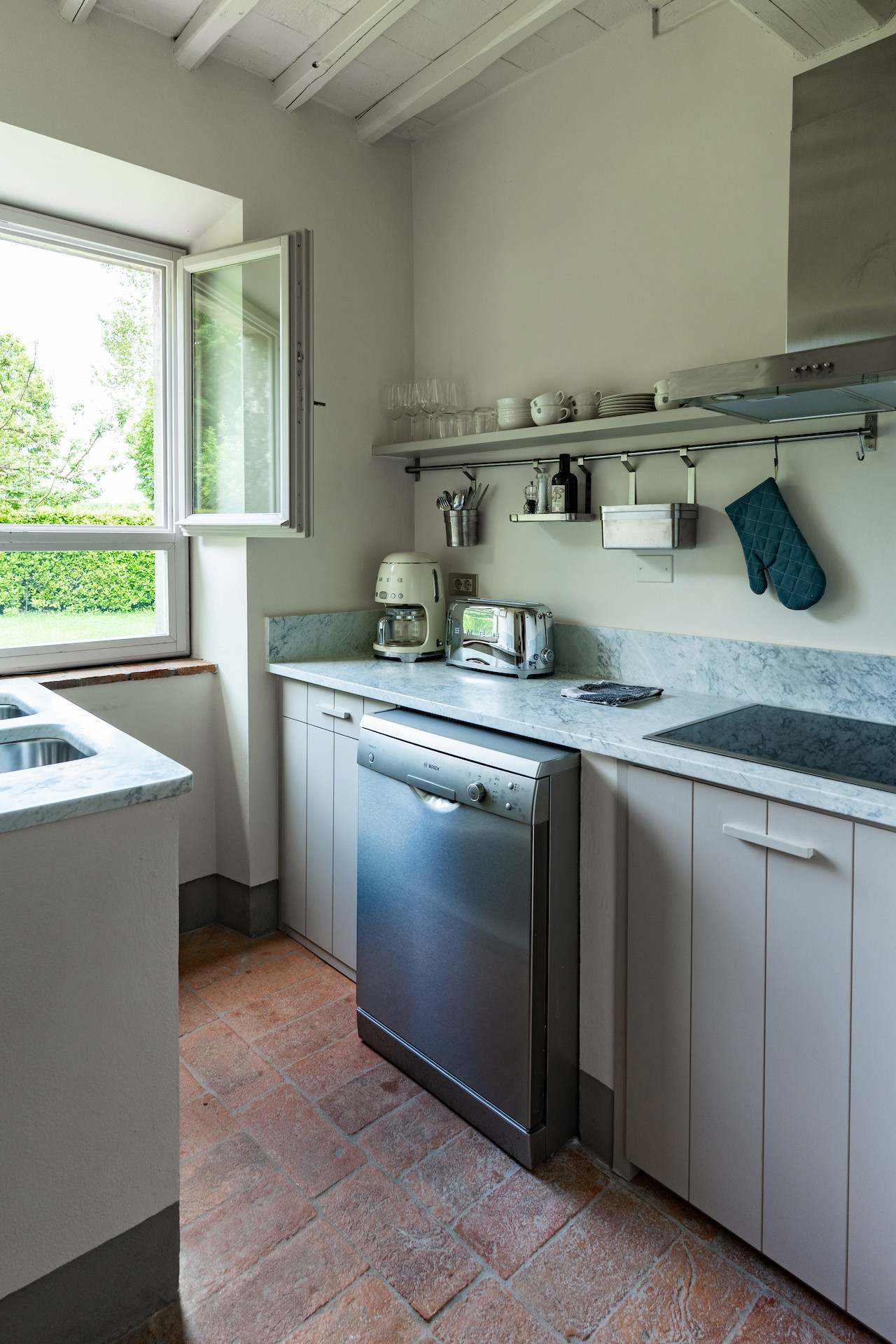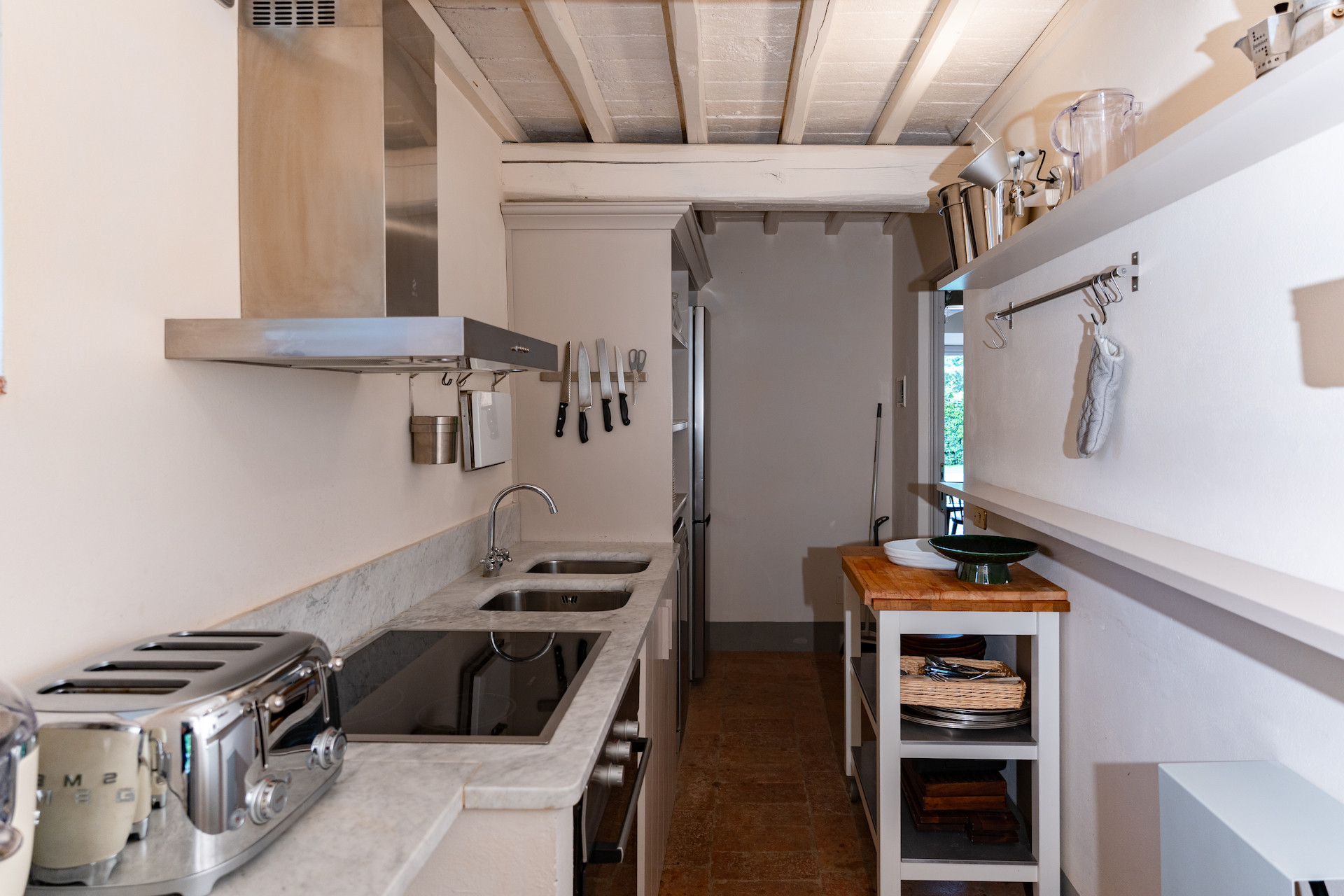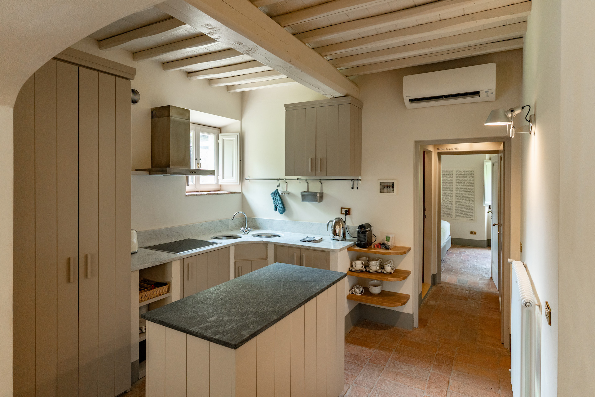 A beautiful set of arched glass doors invites you into the high ceilinged lounge, with comfy Tuscan furniture. Next to the fully equipped kitchen, the large dining room looks out onto the garden. The laundry and bathroom are on the ground floor, while on the top floor there are two bedrooms, each with its own bathroom. A covered outdoors dining table seats 22 guests for memorable alfresco parties.