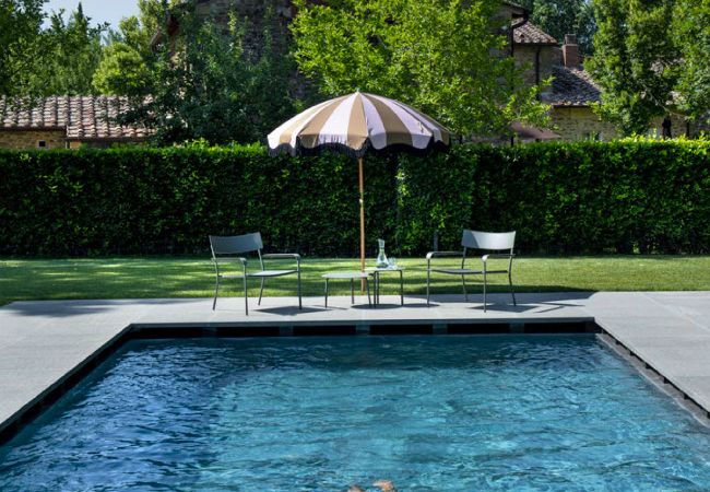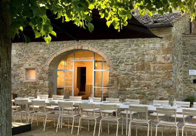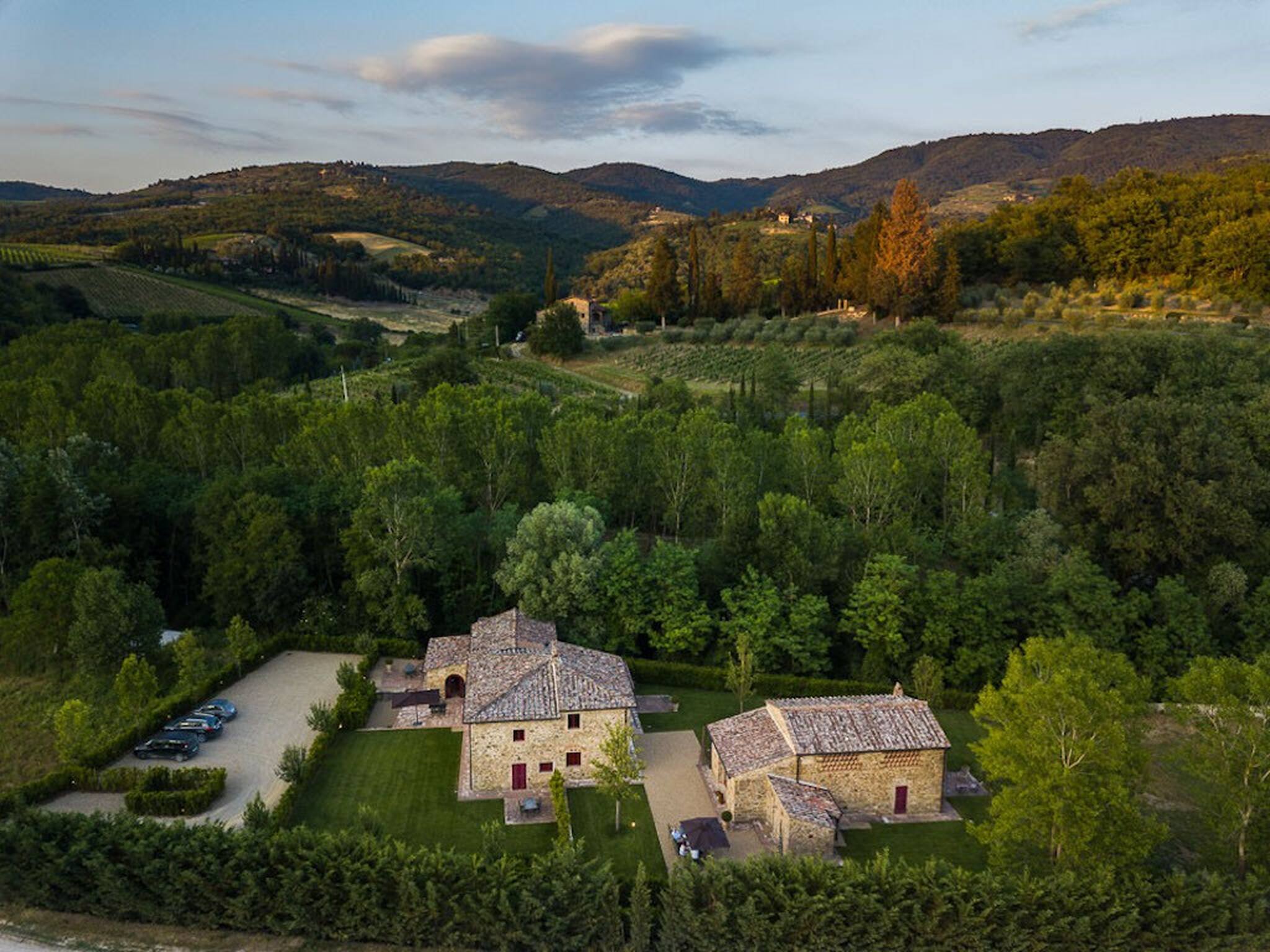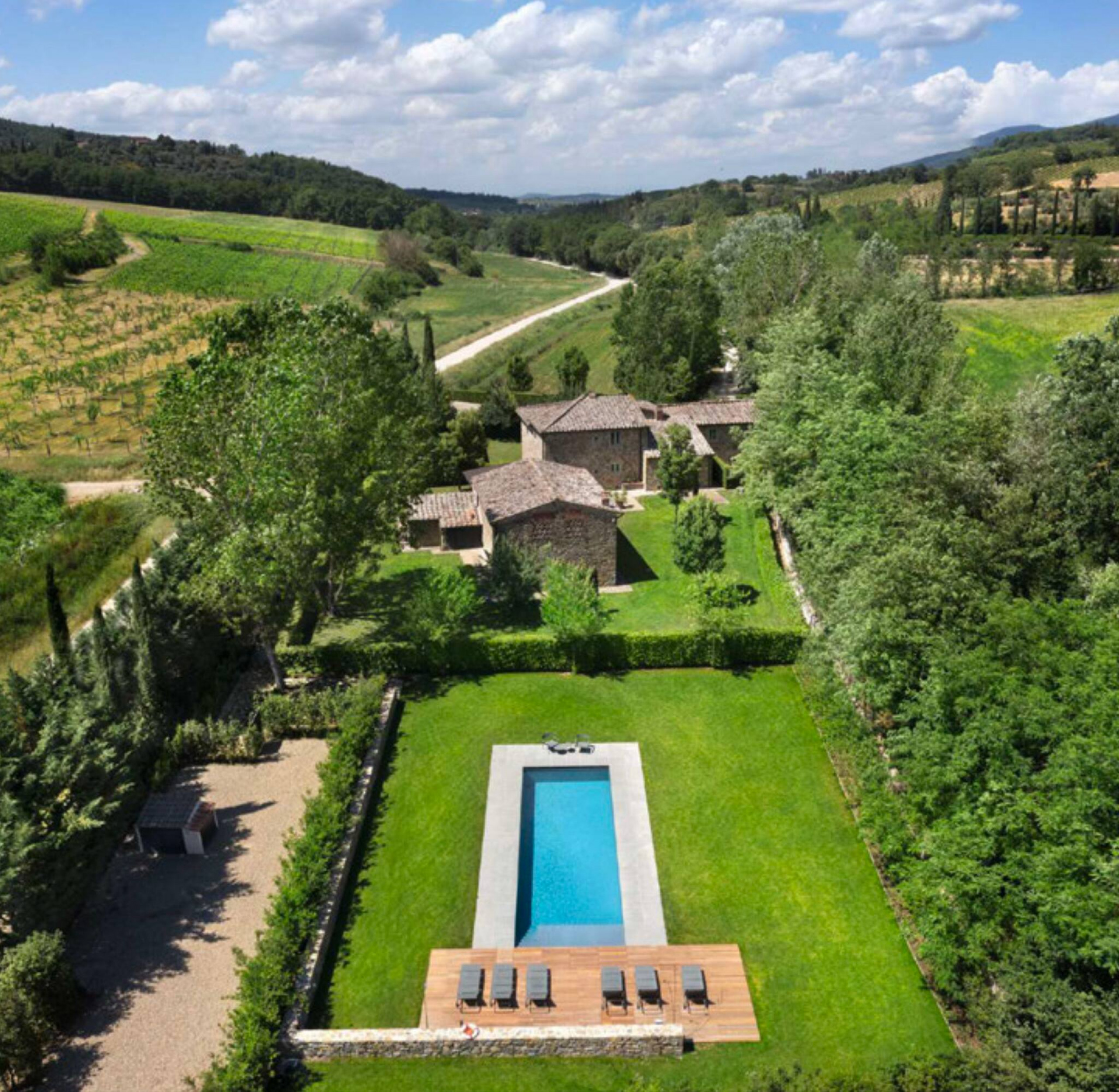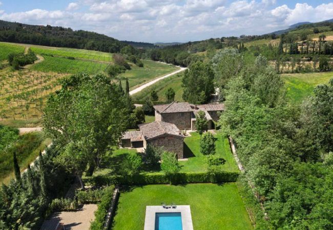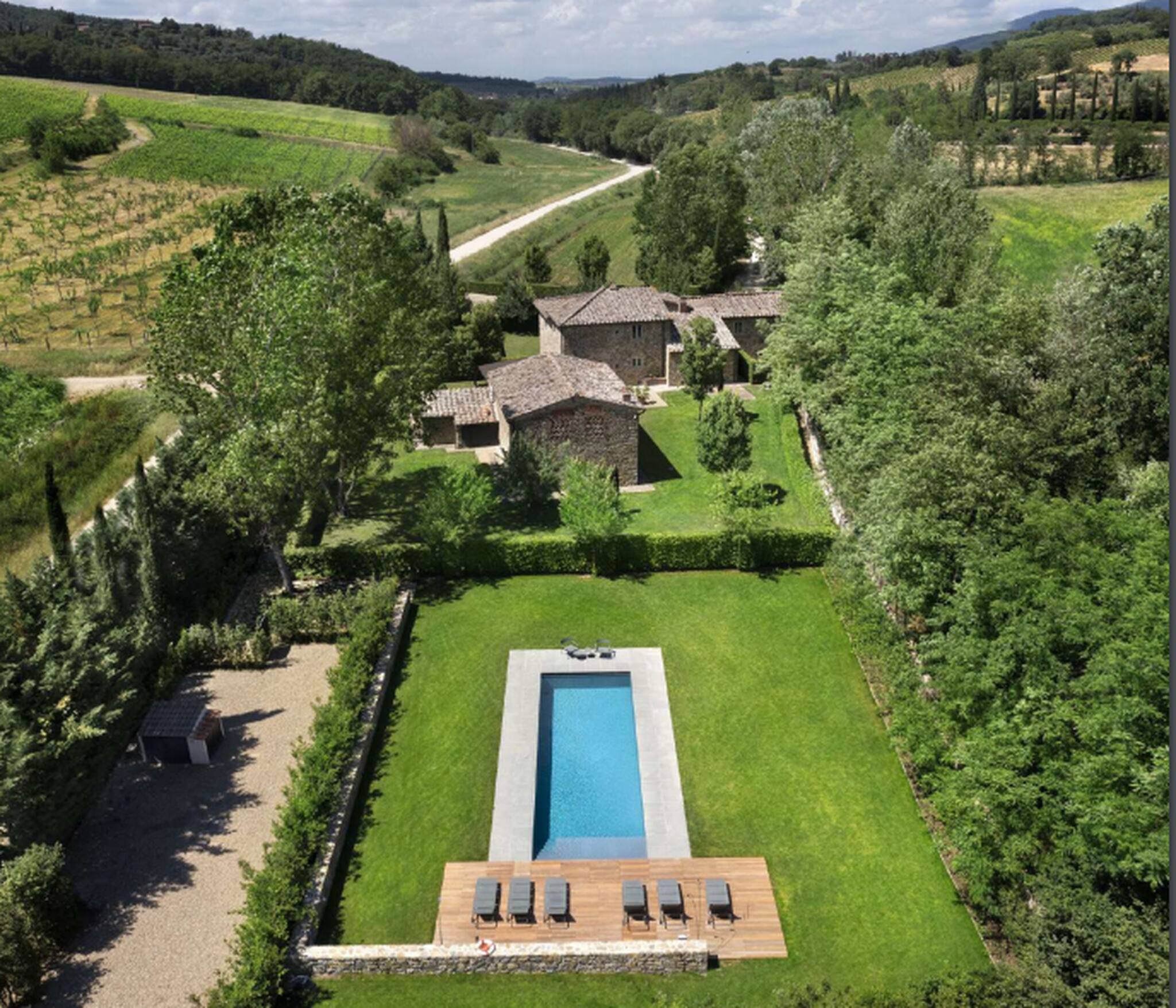In the heart of the estate, on the banks of the peaceful Greve River, lies Podere dell'Orto, a homestead immersed in nature. 9 bedrooms and 9 Bathrooms. Garden and pool. 18 people.