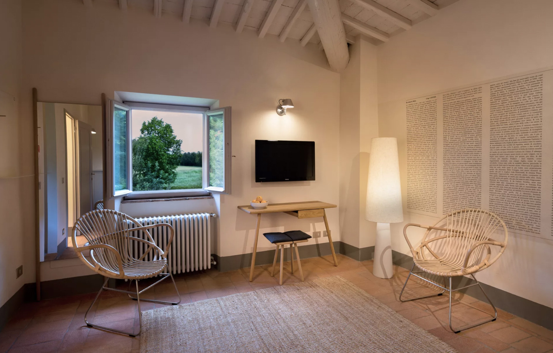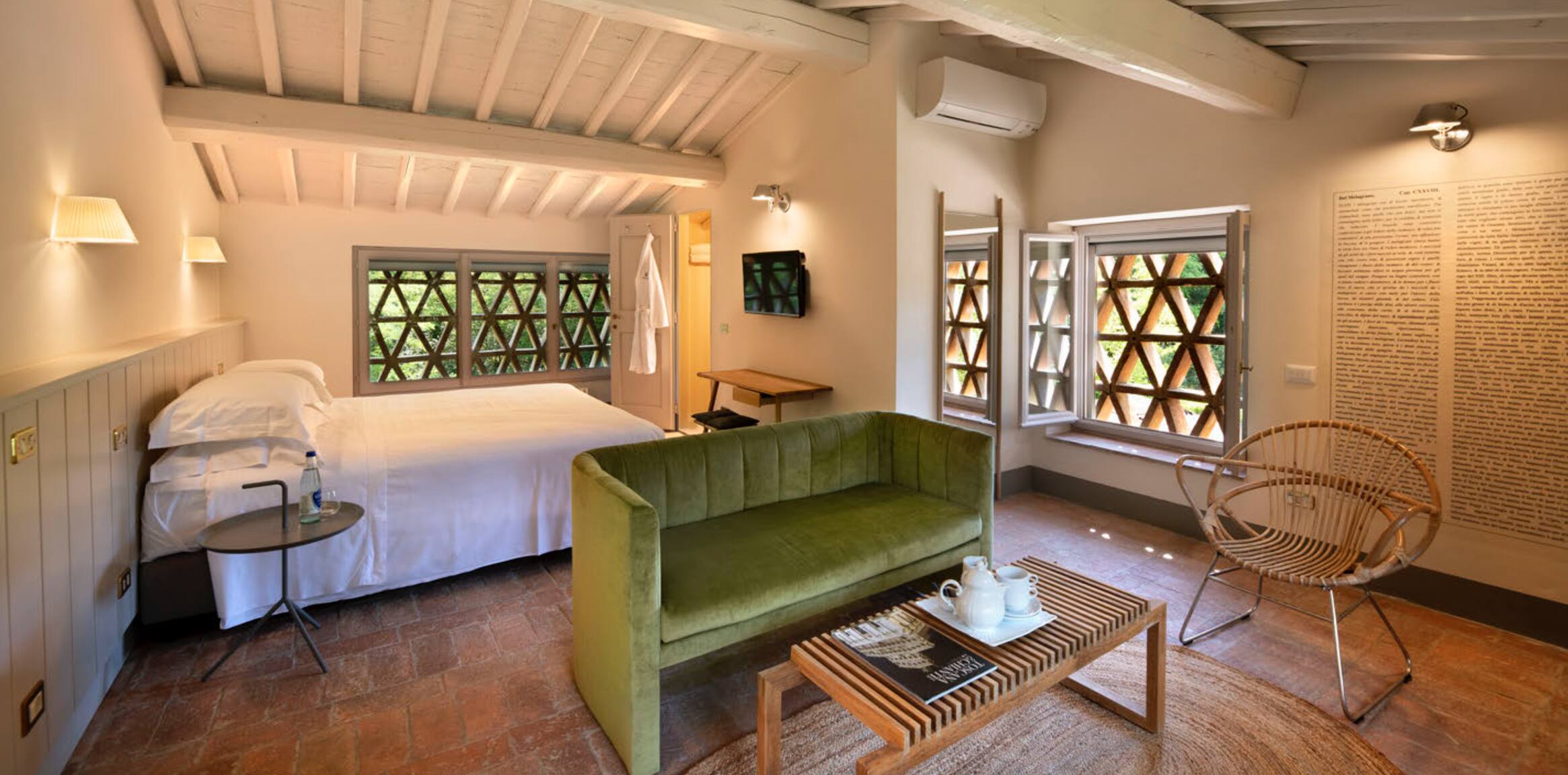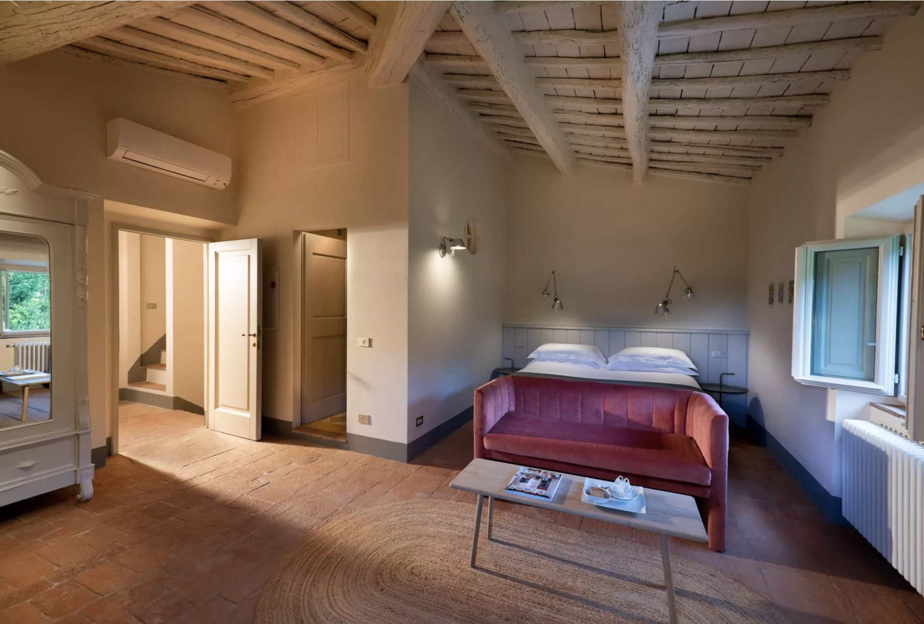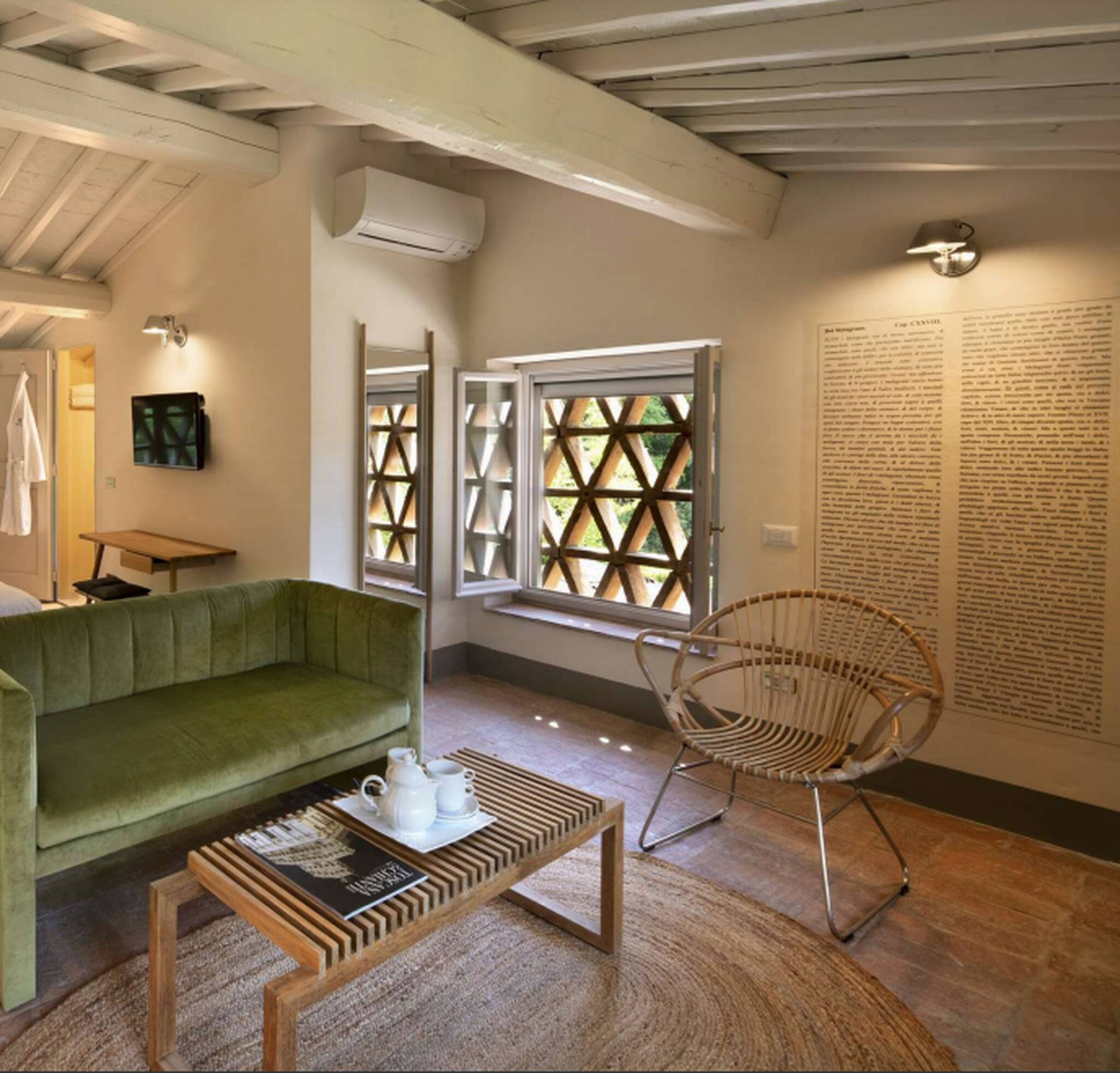 Erbavoglio was the sharecroppers' house where they would meet up after a day working in the fields. The farmhouse, surrounded by a large garden, is today just as homely and welcoming as ever. The entrance hall leads into a spacious, bright kitchen which opens onto the outdoor veranda and a lovely living room with its stone fireplace.