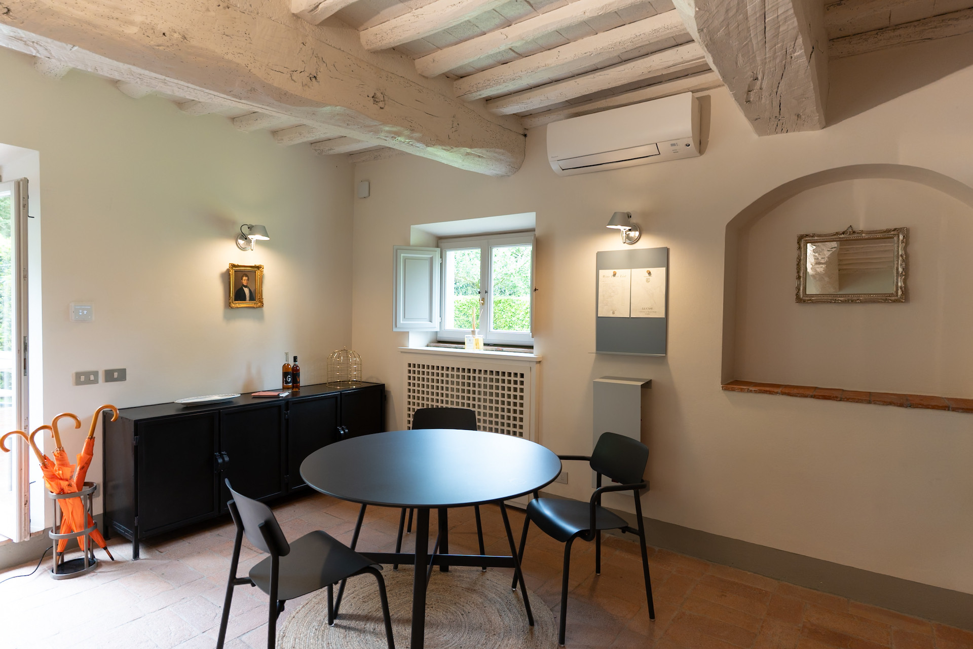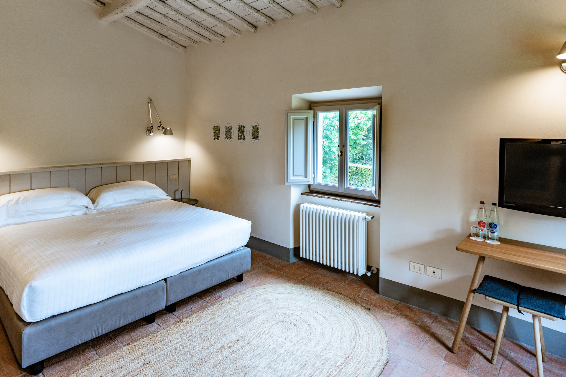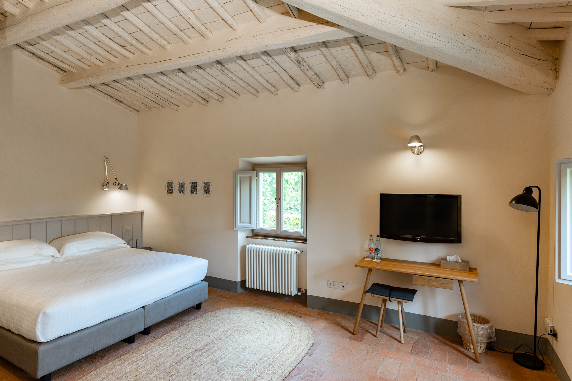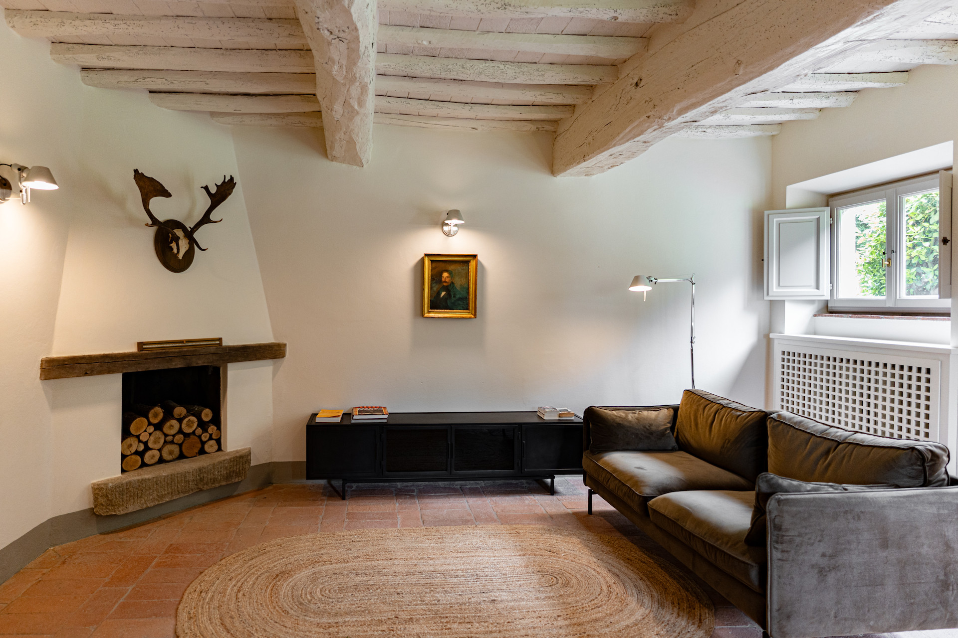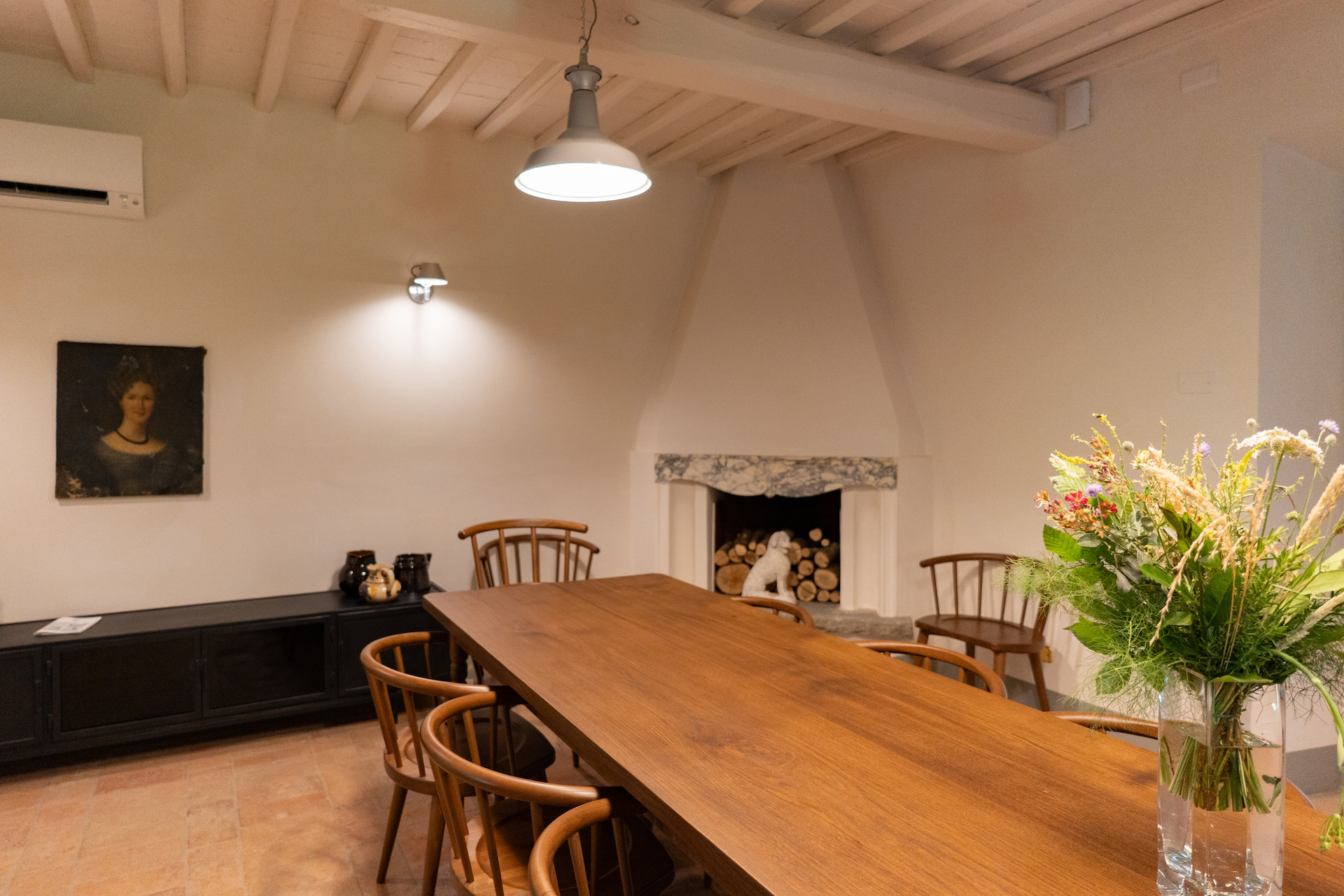 Erbavoglio was the sharecroppers' house where they would meet up after a day working in the fields. The farmhouse, surrounded by a large garden, is today just as homely and welcoming as ever. The entrance hall leads into a spacious, bright kitchen which opens onto the outdoor veranda and a lovely living room with its stone fireplace.
