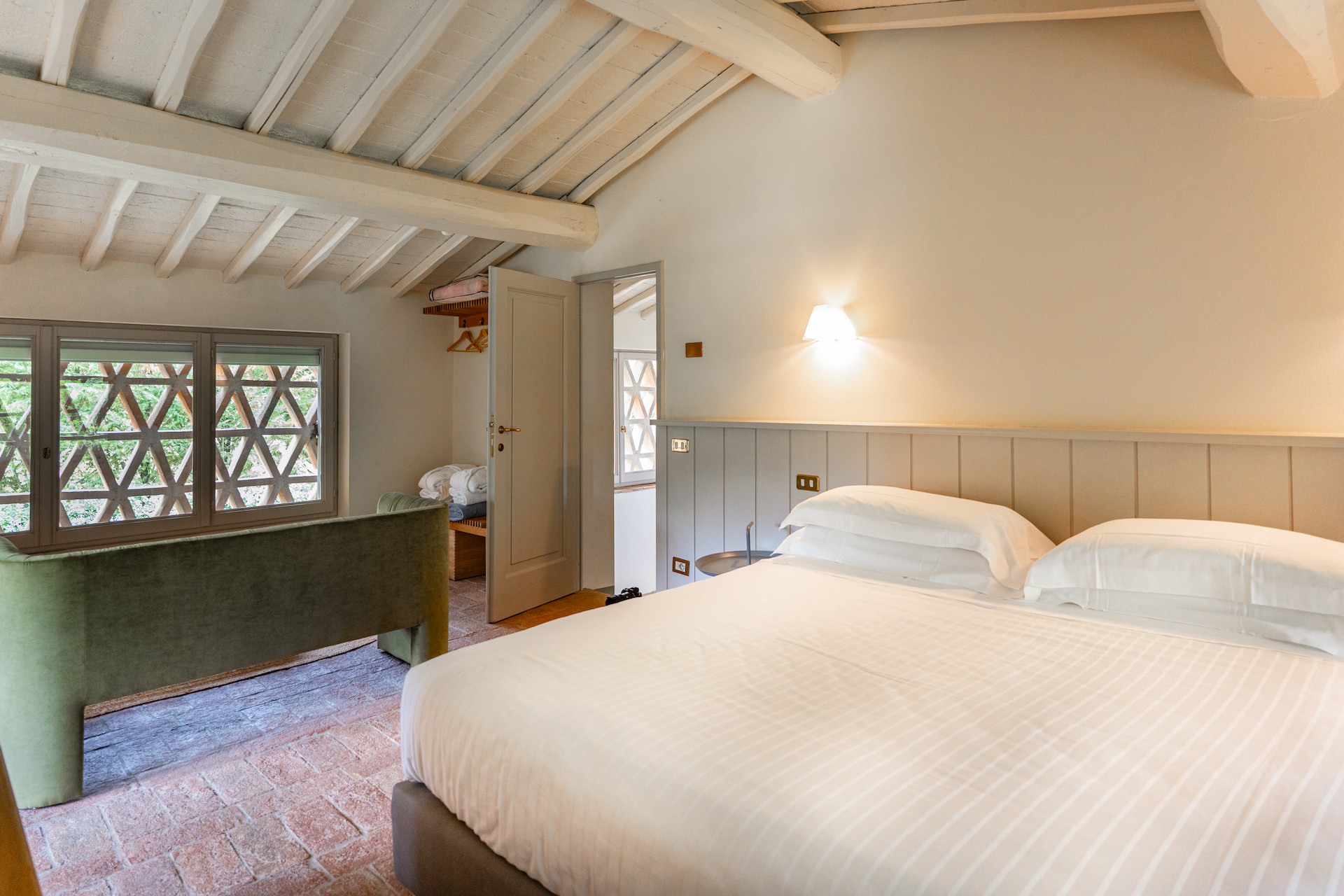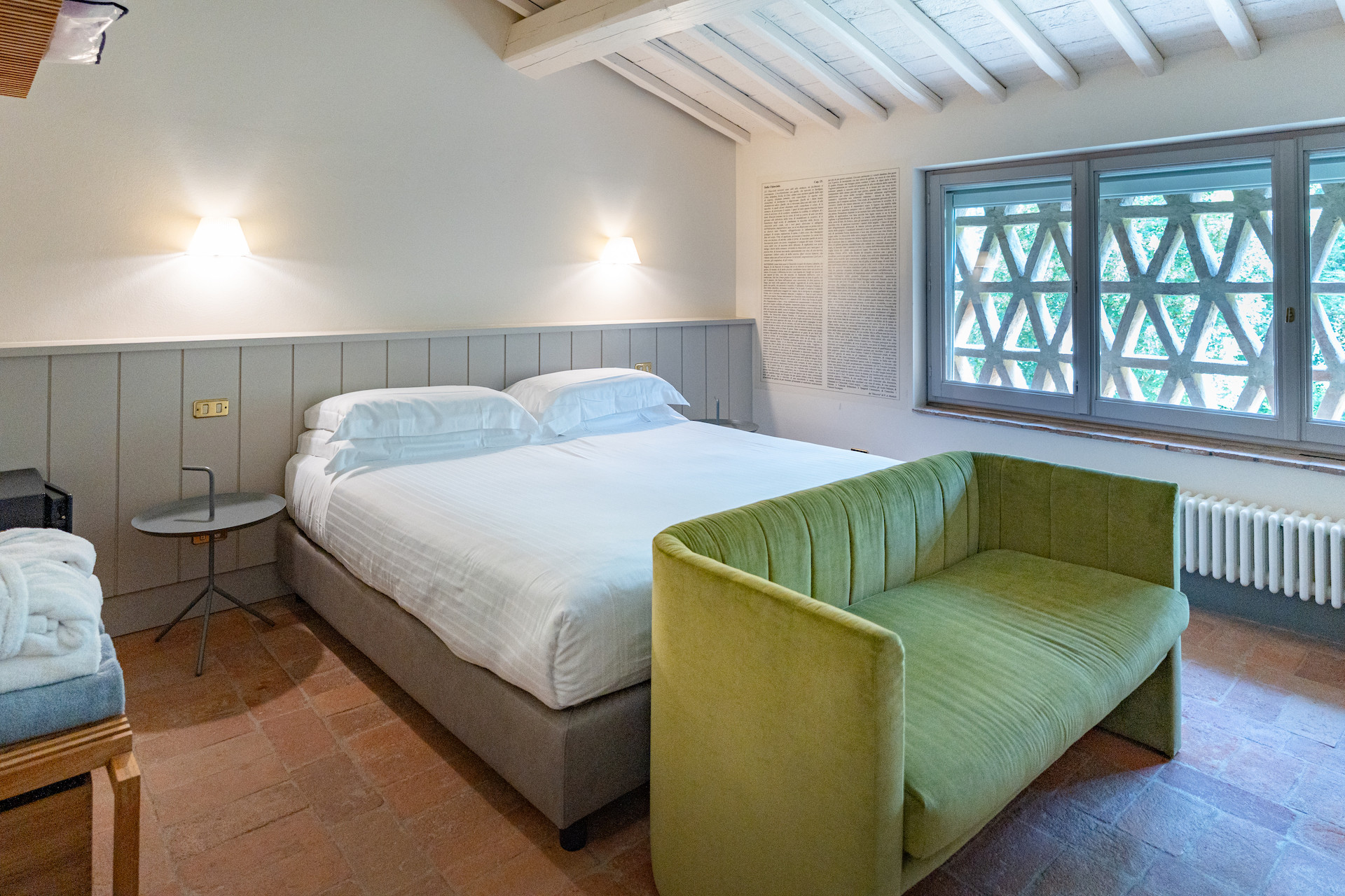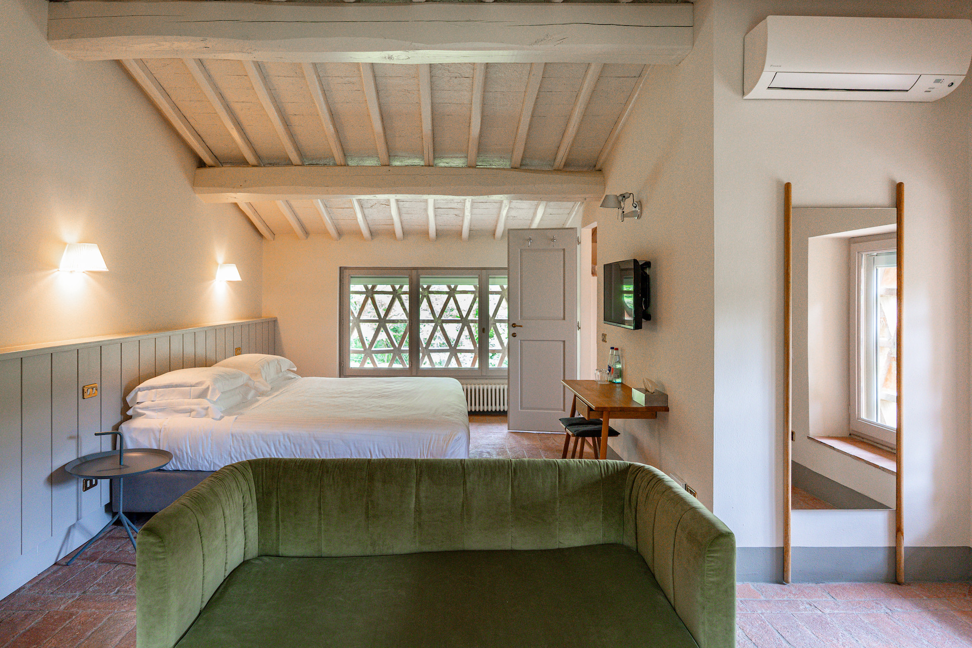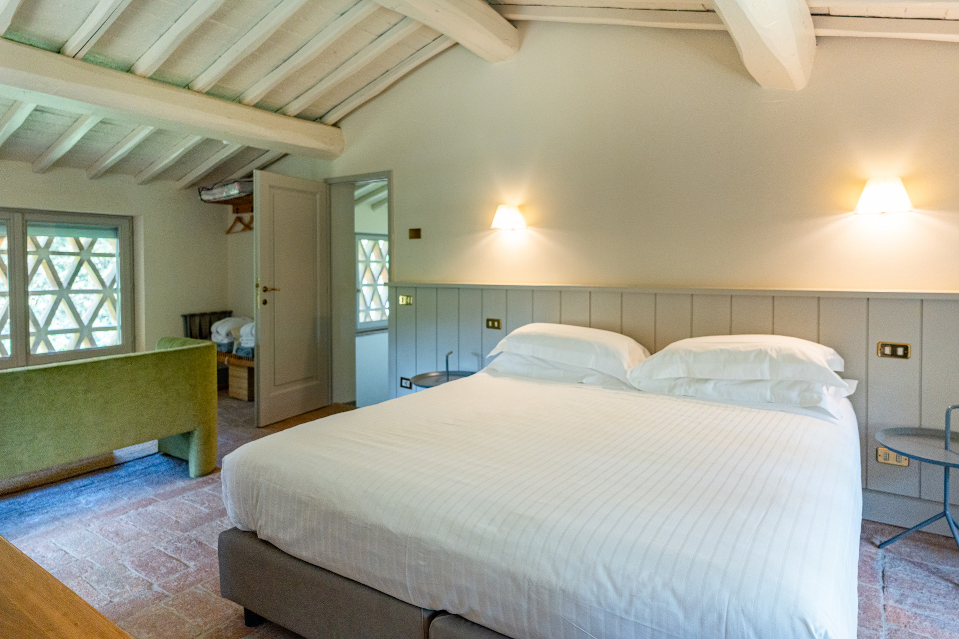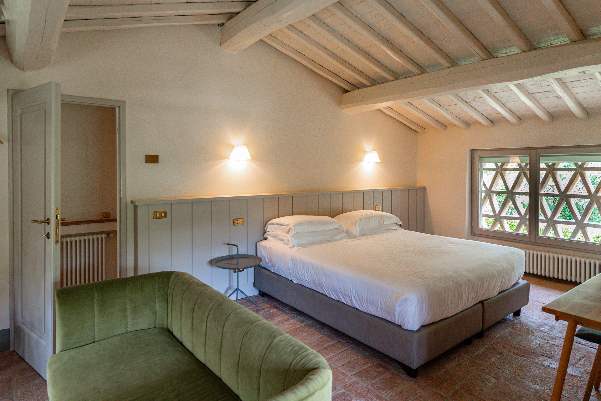 Erbavoglio was the sharecroppers' house where they would meet up after a day working in the fields. The farmhouse, surrounded by a large garden, is today just as homely and welcoming as ever. The entrance hall leads into a spacious, bright kitchen which opens onto the outdoor veranda and a lovely living room with its stone fireplace.