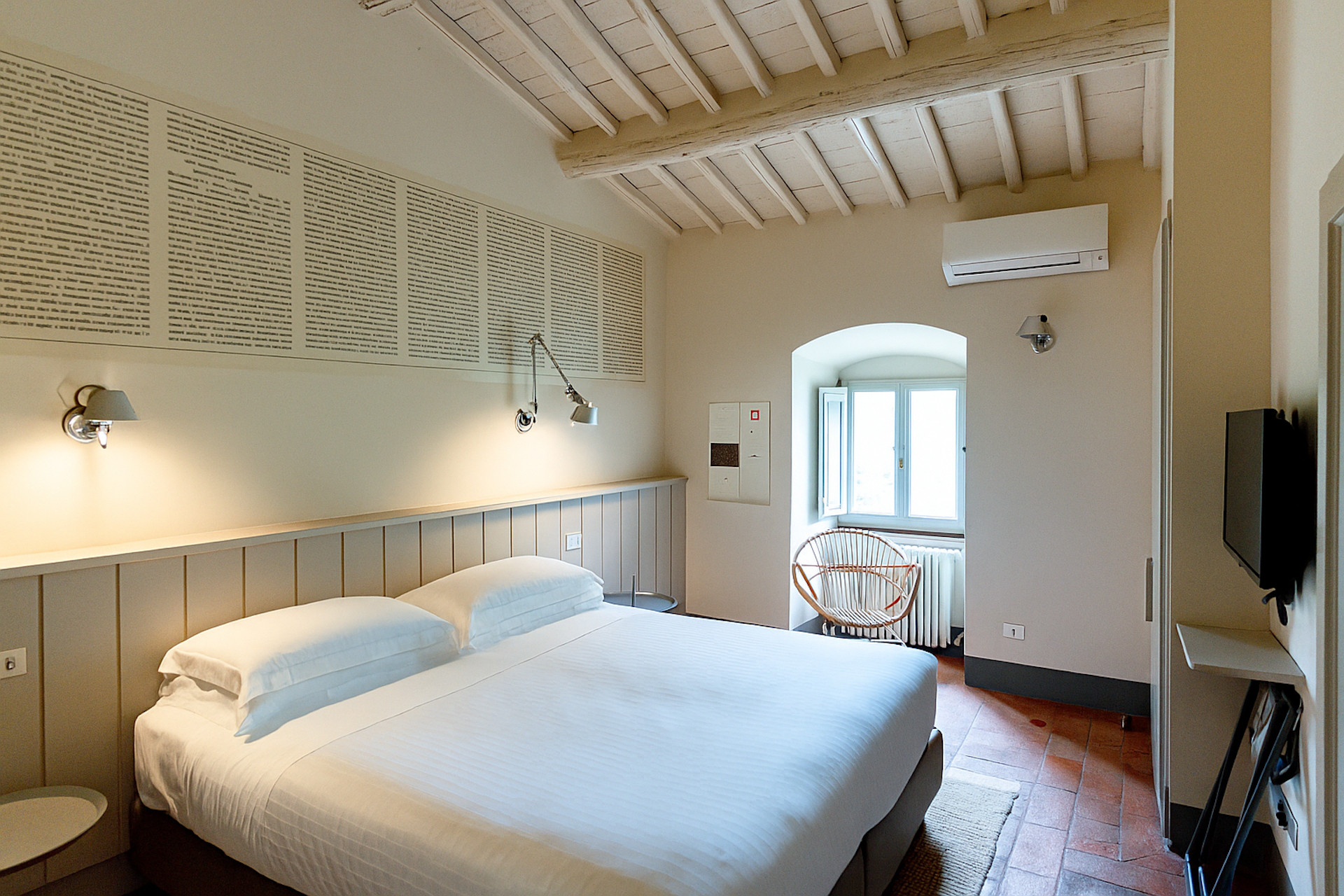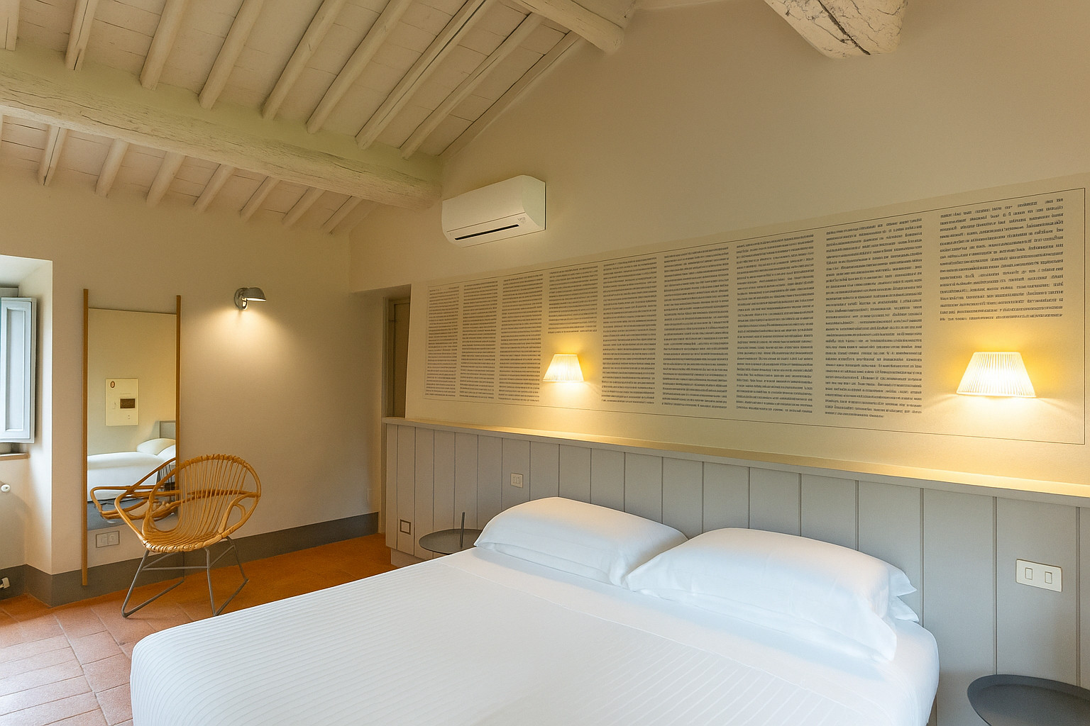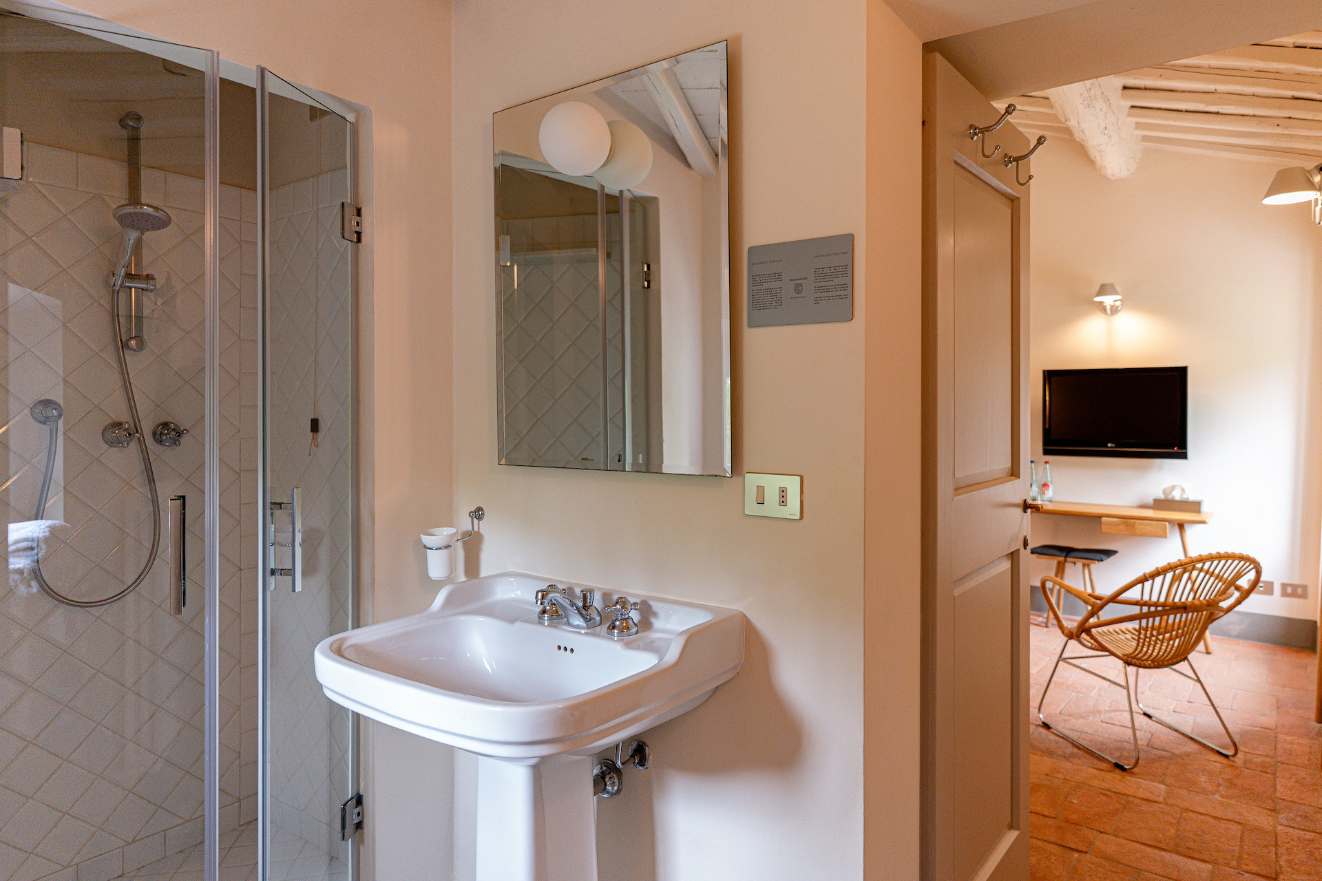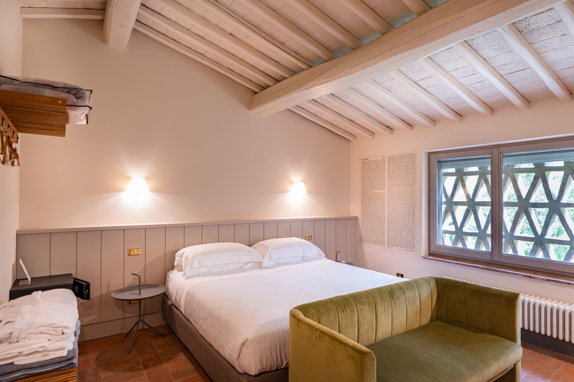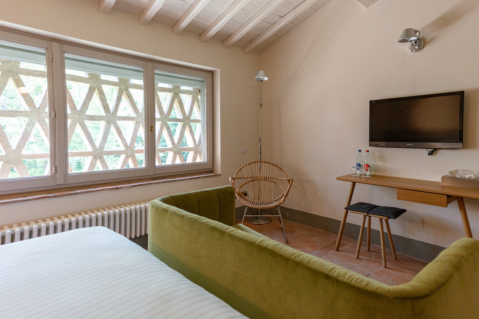 Erbavoglio was the sharecroppers' house where they would meet up after a day working in the fields. The farmhouse, surrounded by a large garden, is today just as homely and welcoming as ever. The entrance hall leads into a spacious, bright kitchen which opens onto the outdoor veranda and a lovely living room with its stone fireplace.