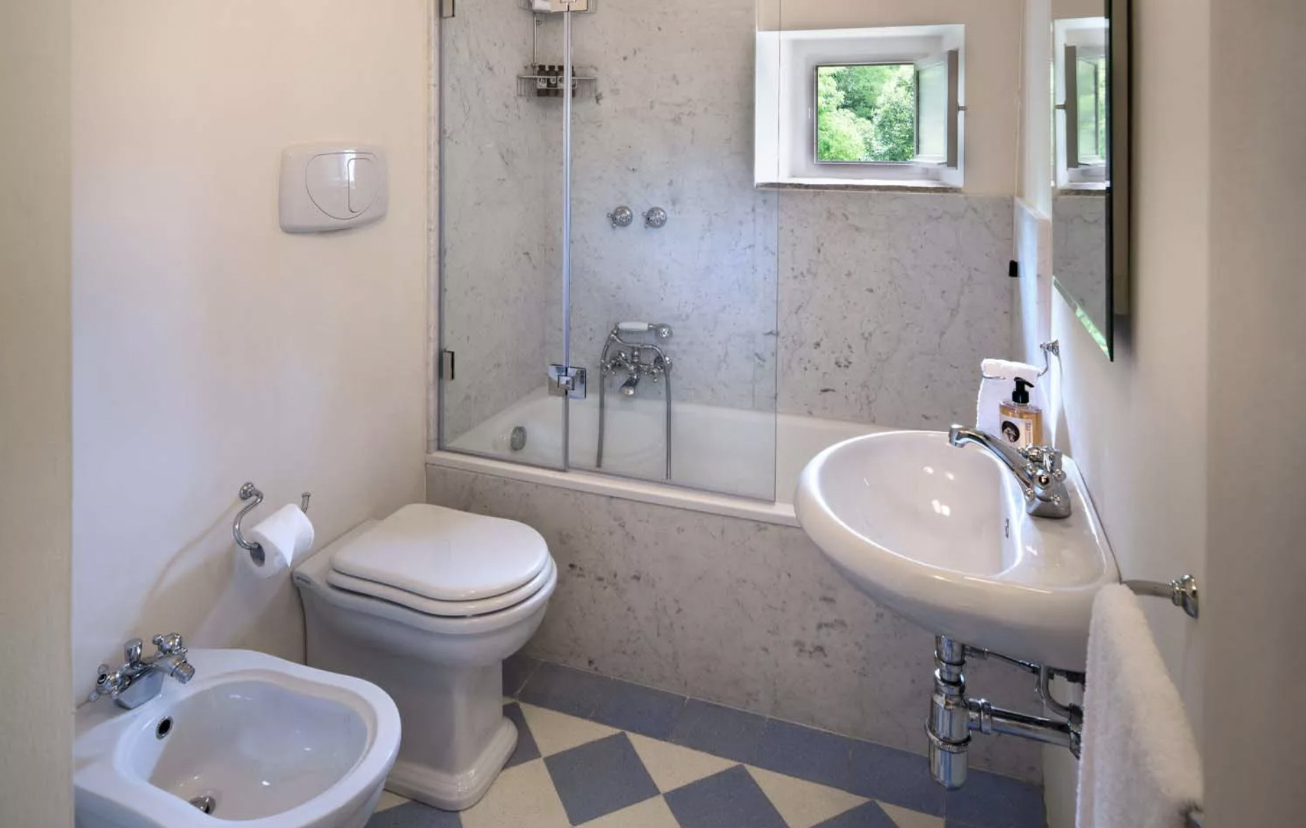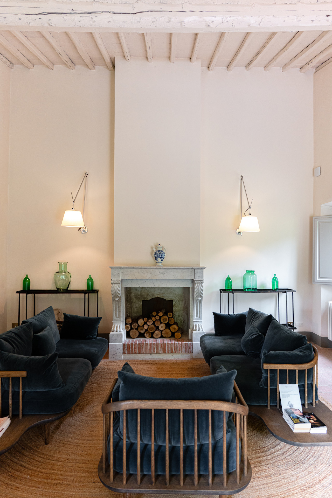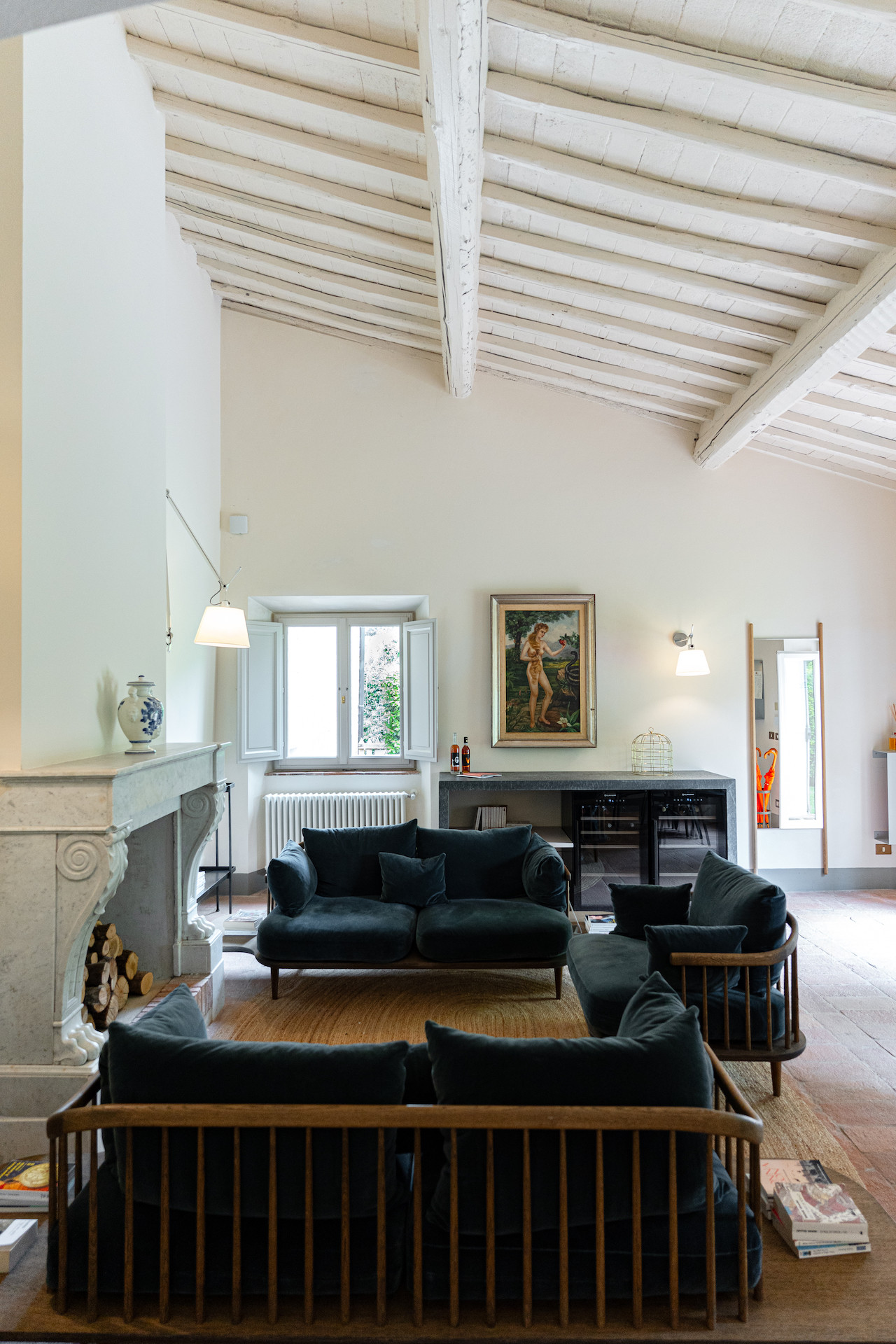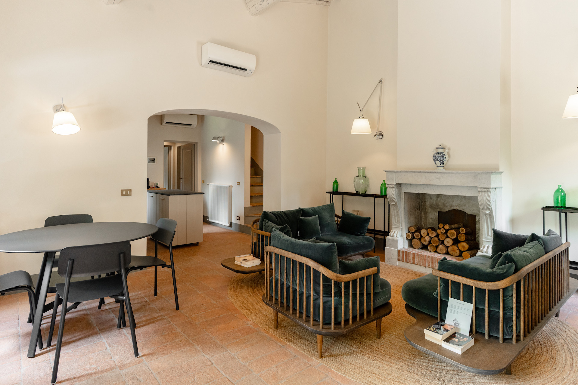 Velvet sofas and a marble fireplace await you in the spacious living room with kitchenette. On the ground floor there is one bedroom with a private bathroom, while upstairs you will find two other rooms with a shared bathroom.