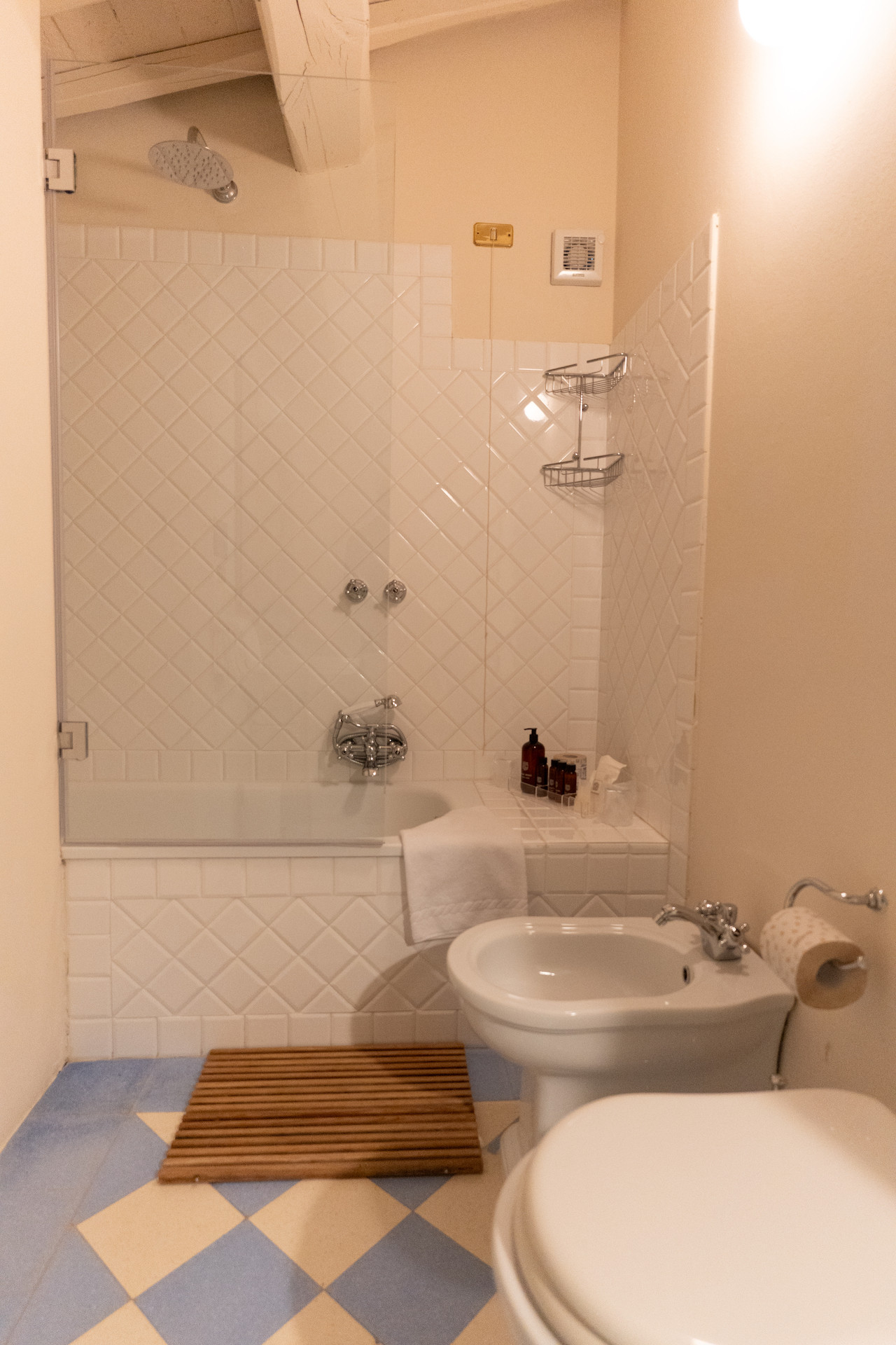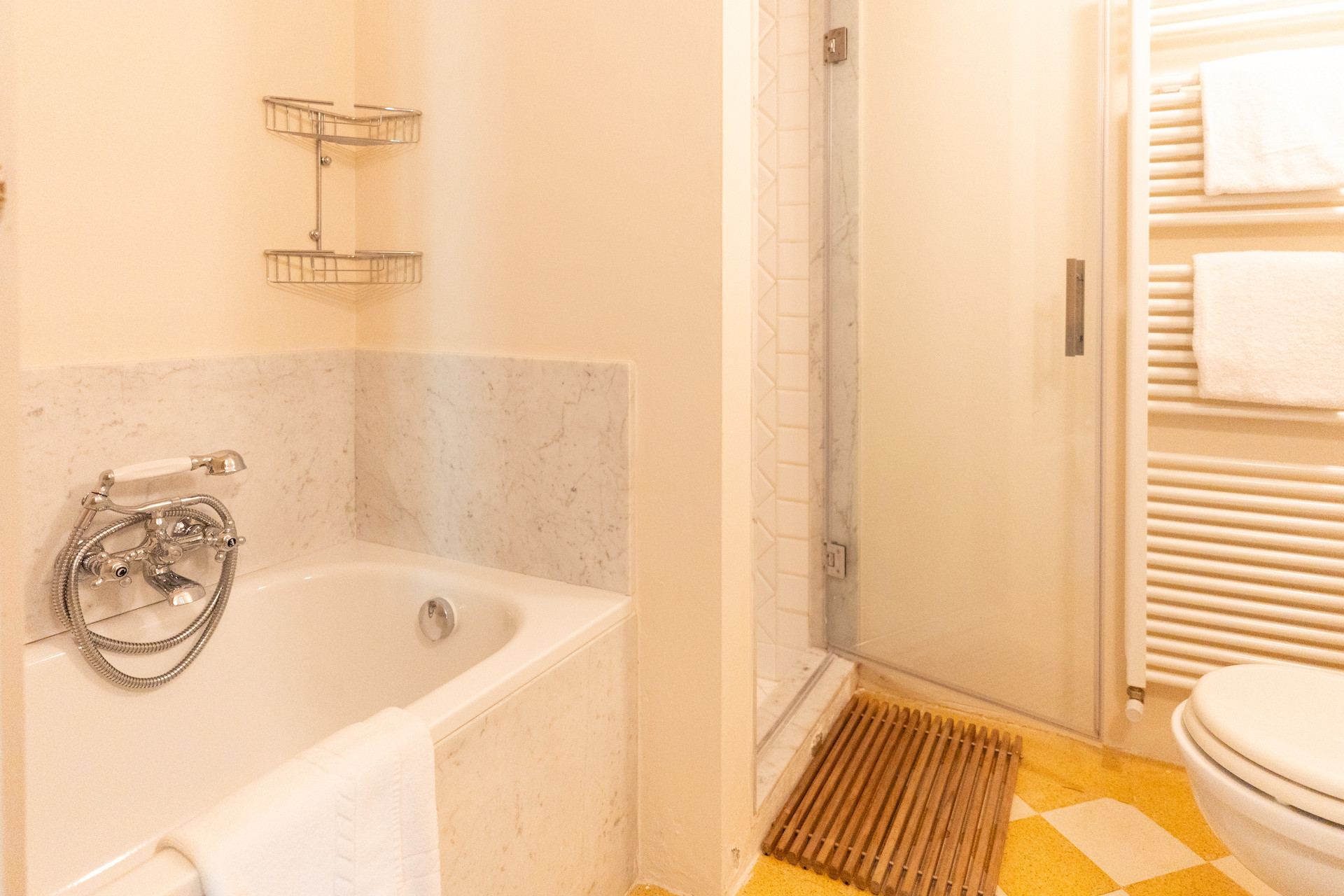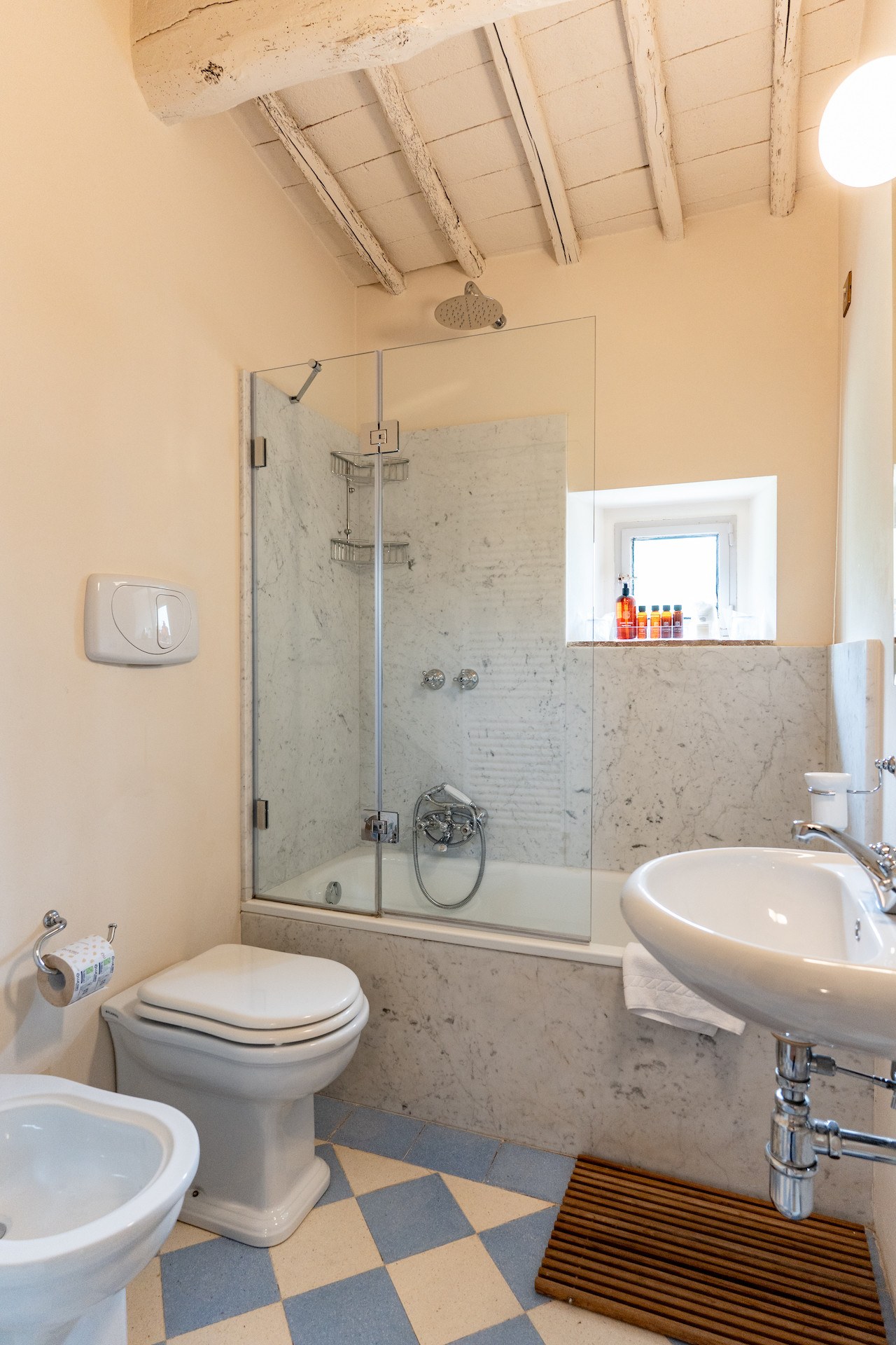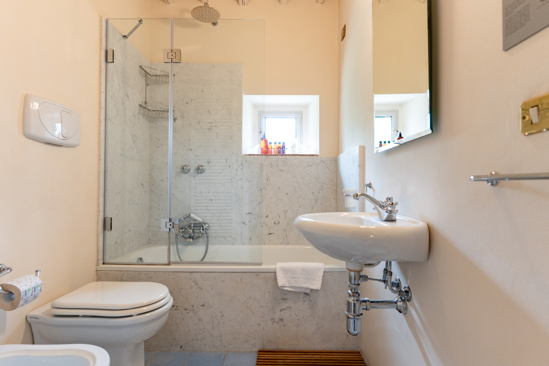 Velvet sofas and a marble fireplace await you in the spacious living room with kitchenette. On the ground floor there is one bedroom with a private bathroom, while upstairs you will find two other rooms with a shared bathroom.