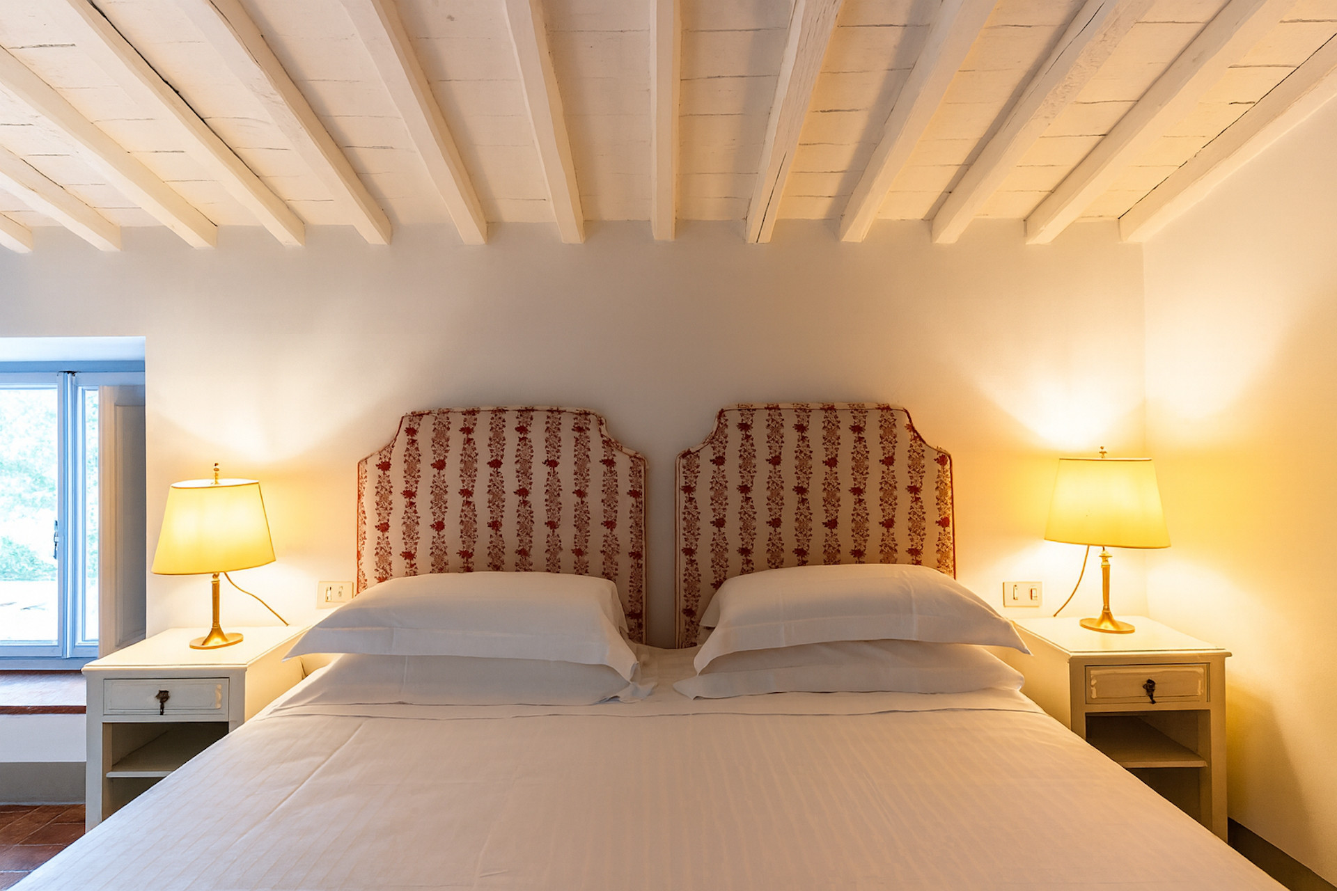 the Fienile has 2 suites: Slightly setback therefore completely private, Il Fienile is the original farm barn with two master bedrooms sharing a bathroom. The exposed white-washed trusses give all rooms a light & airy feel. The cozy lounge leads onto a fully equipped kitchen & opens on a private terrace sheltered by rows of buxus hedges.