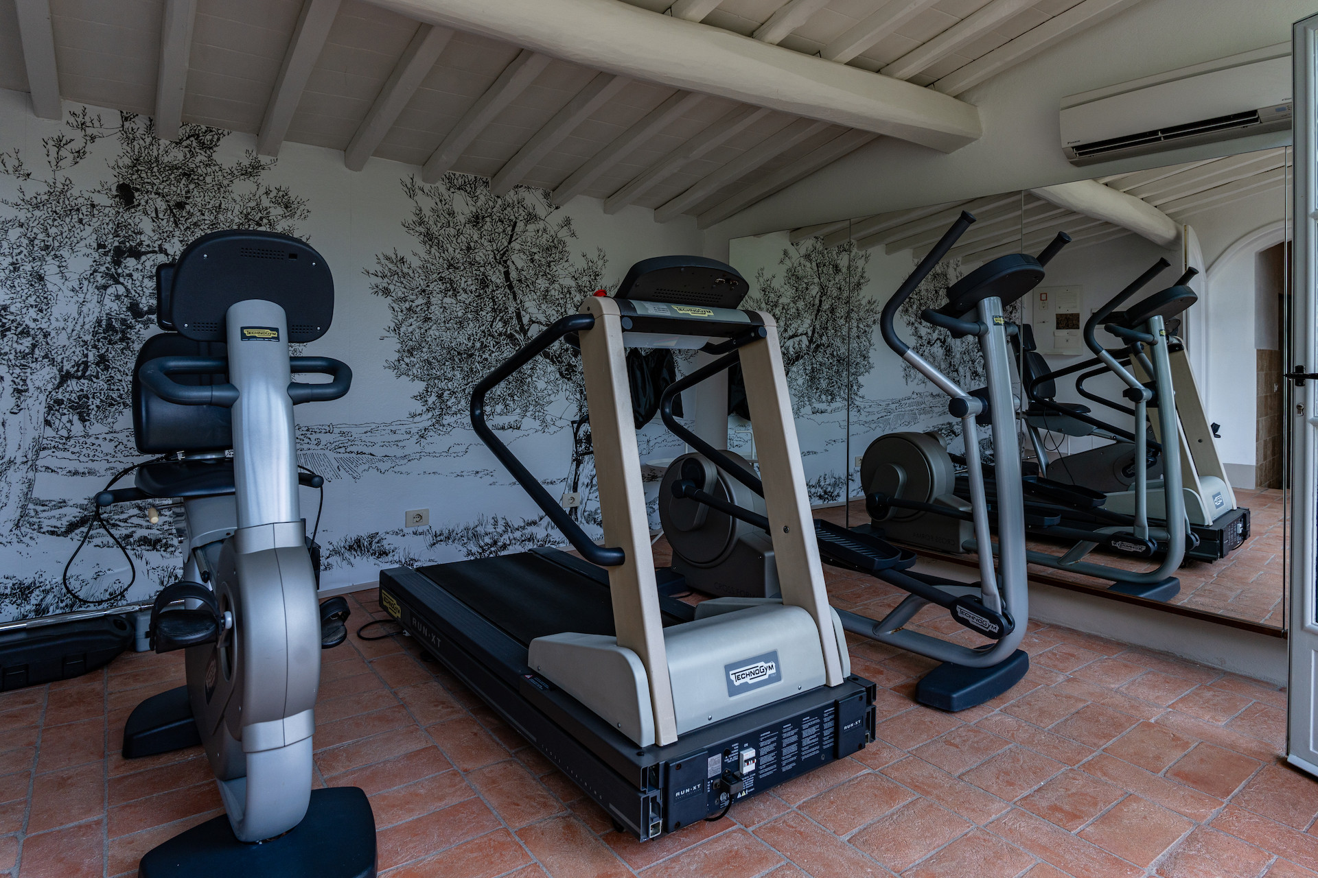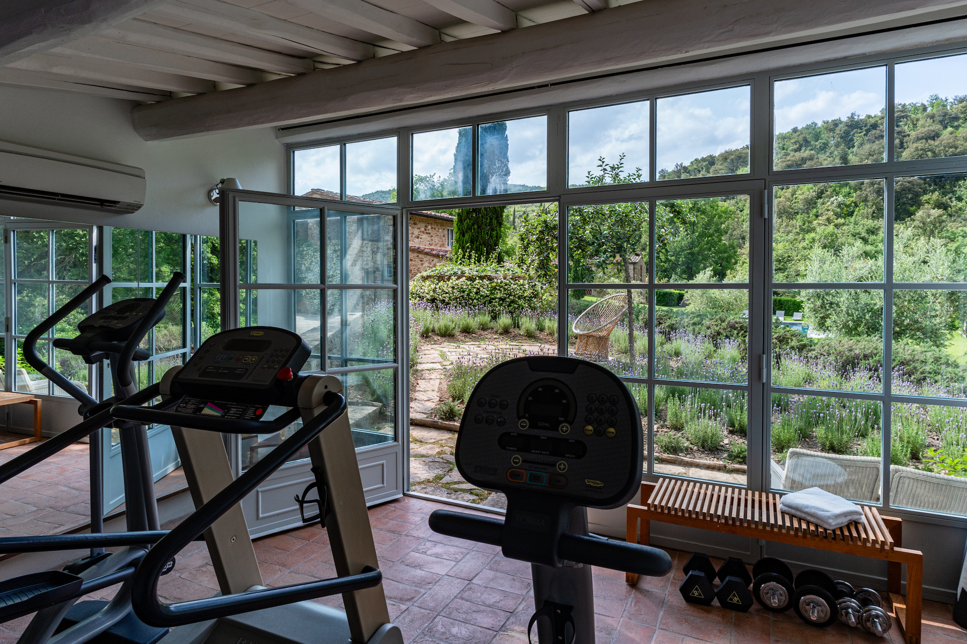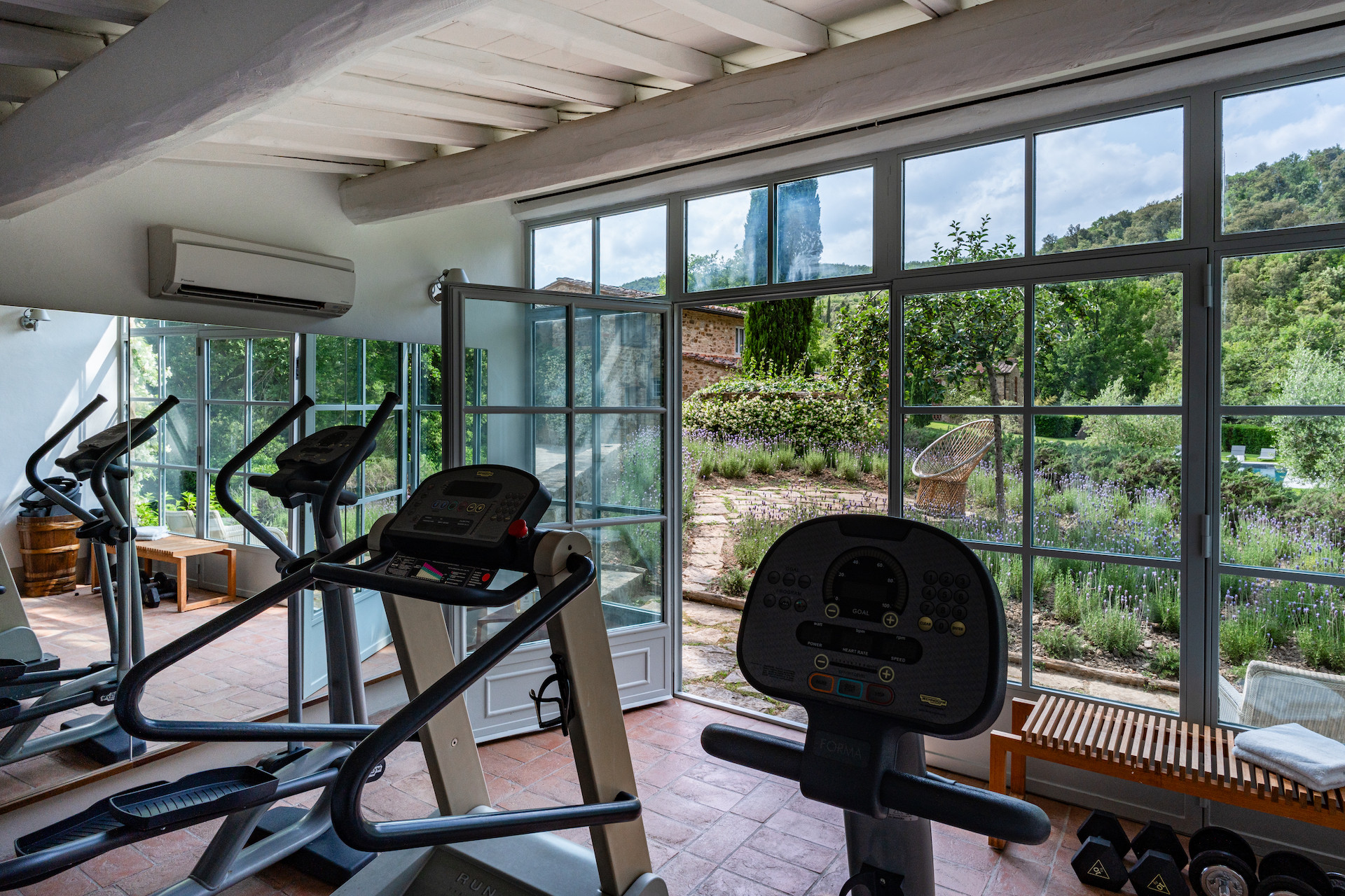 garden is picturesque – soft green fields, large oak trees, fig trees, small apple trees, olive trees, thriving rosemary bushes and corners brimming with lavender. The three stone dwellings are joined by a stone path leading to the swimming area, which is equipped with comfortable loungers for sunbathing. A few steps from the pool is a fully equipped gym with showers and a Turkish bath.