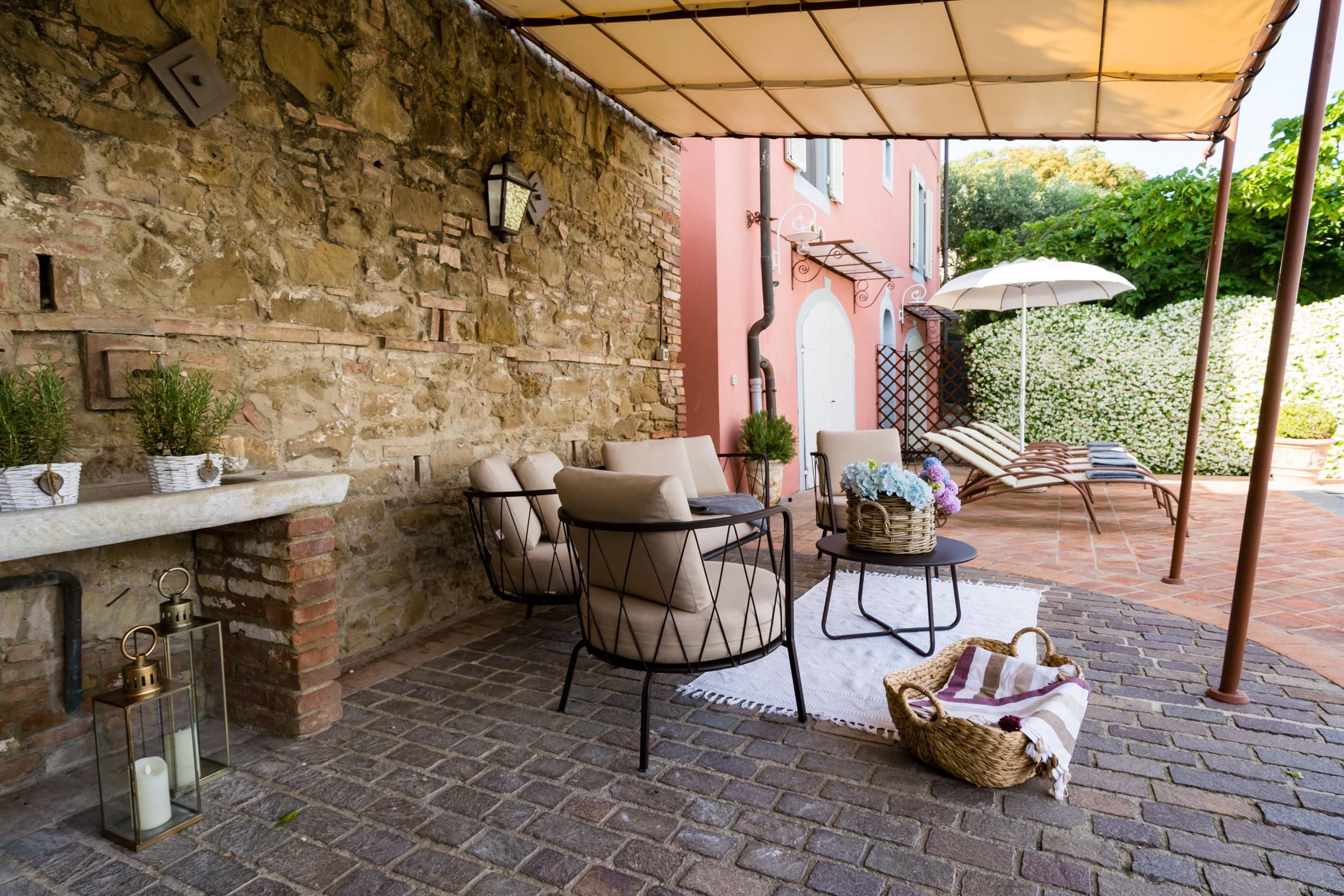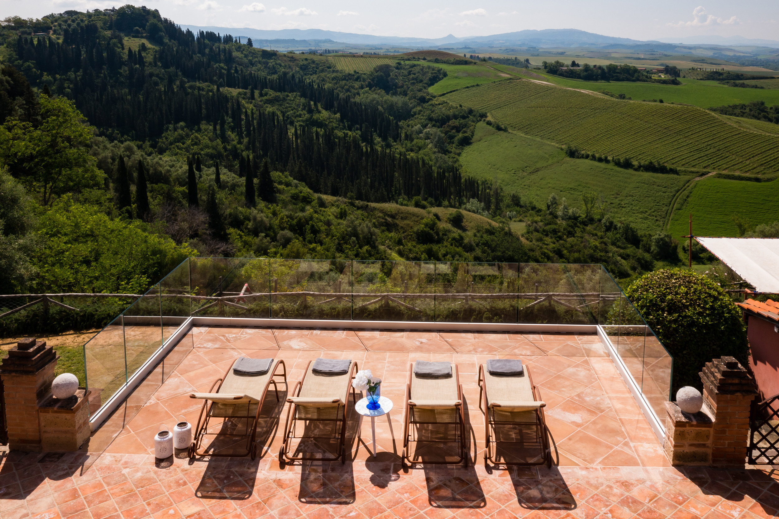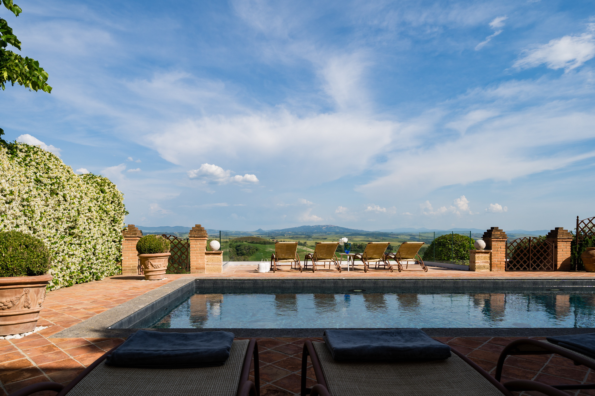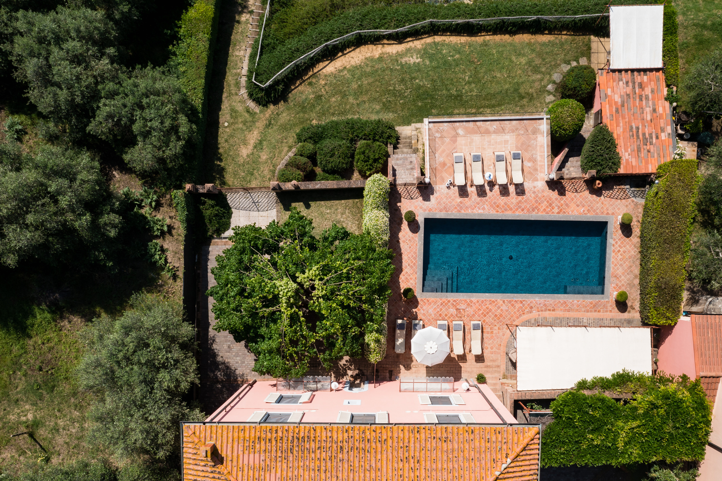 under a pergola with a hundred year old wisteria. From here you can admire the vineyards and olive groves as far as the city of Volterra. By means of another stone staircase we go down to the garden, protected by an ancient wall for privacy, to the panoramic swimming pool (12×4 metres by 1.30 deep).It has a hydromassage area, divans and umbrellas. The shops of Fabbrica are within walking distance.