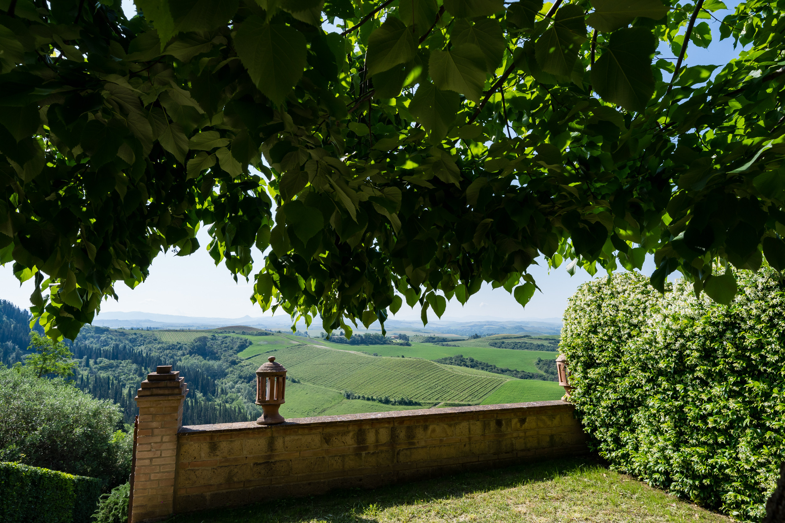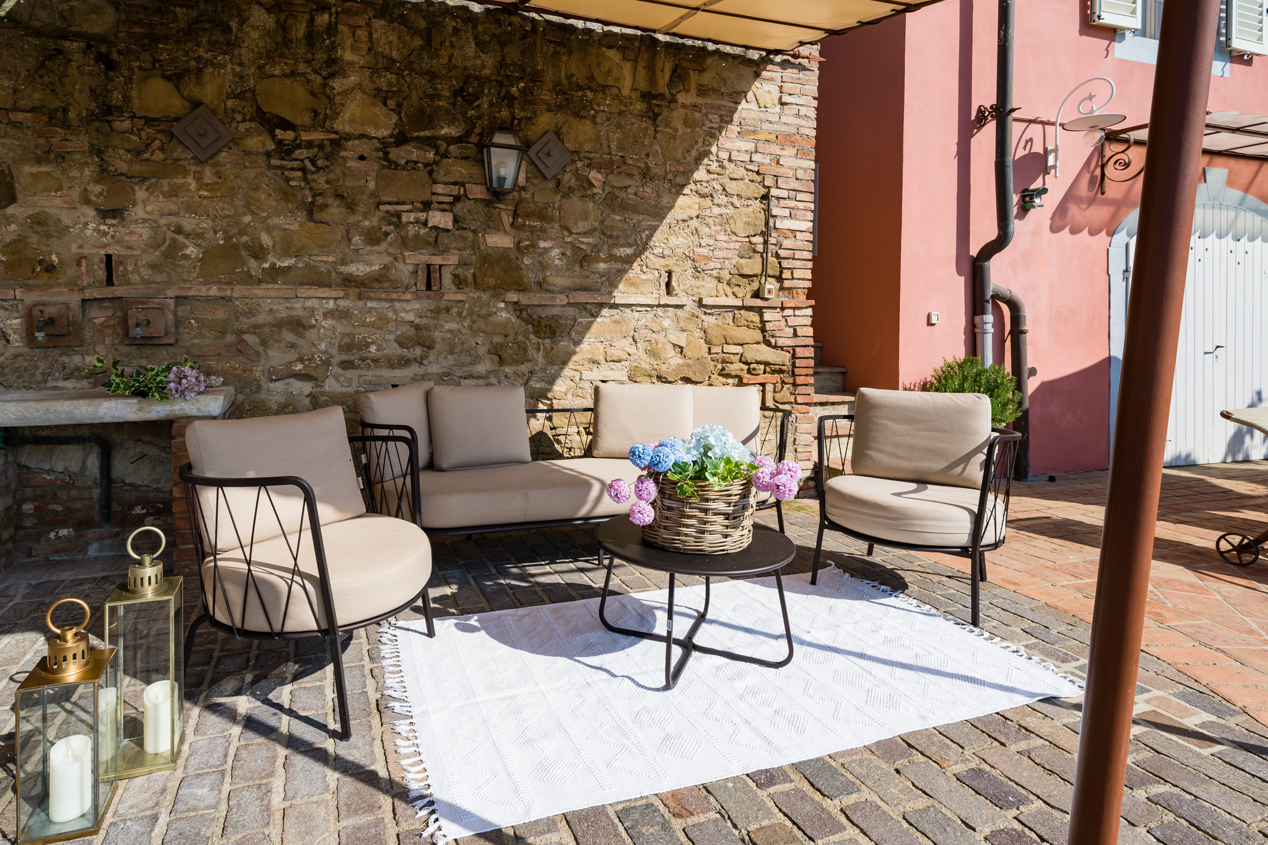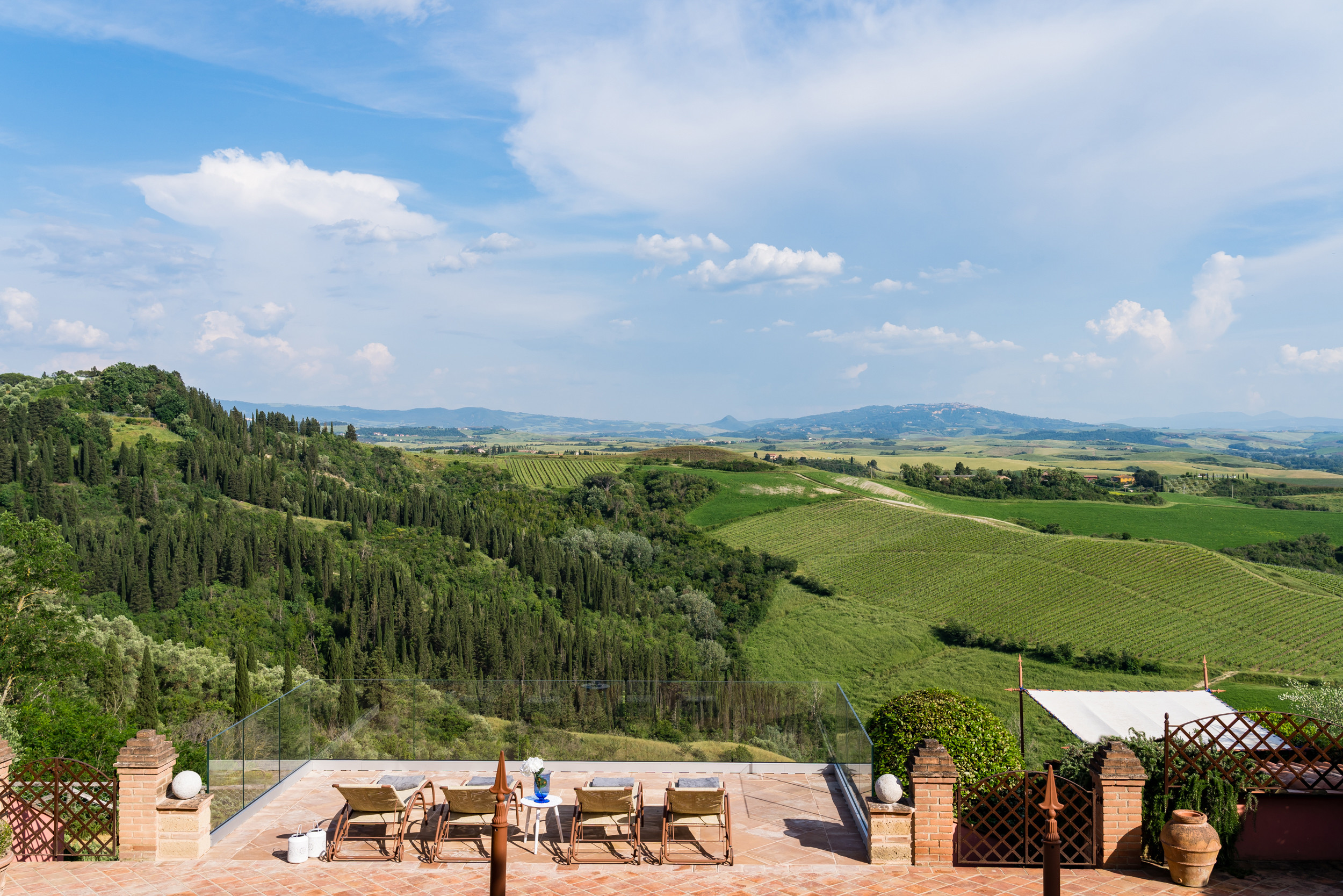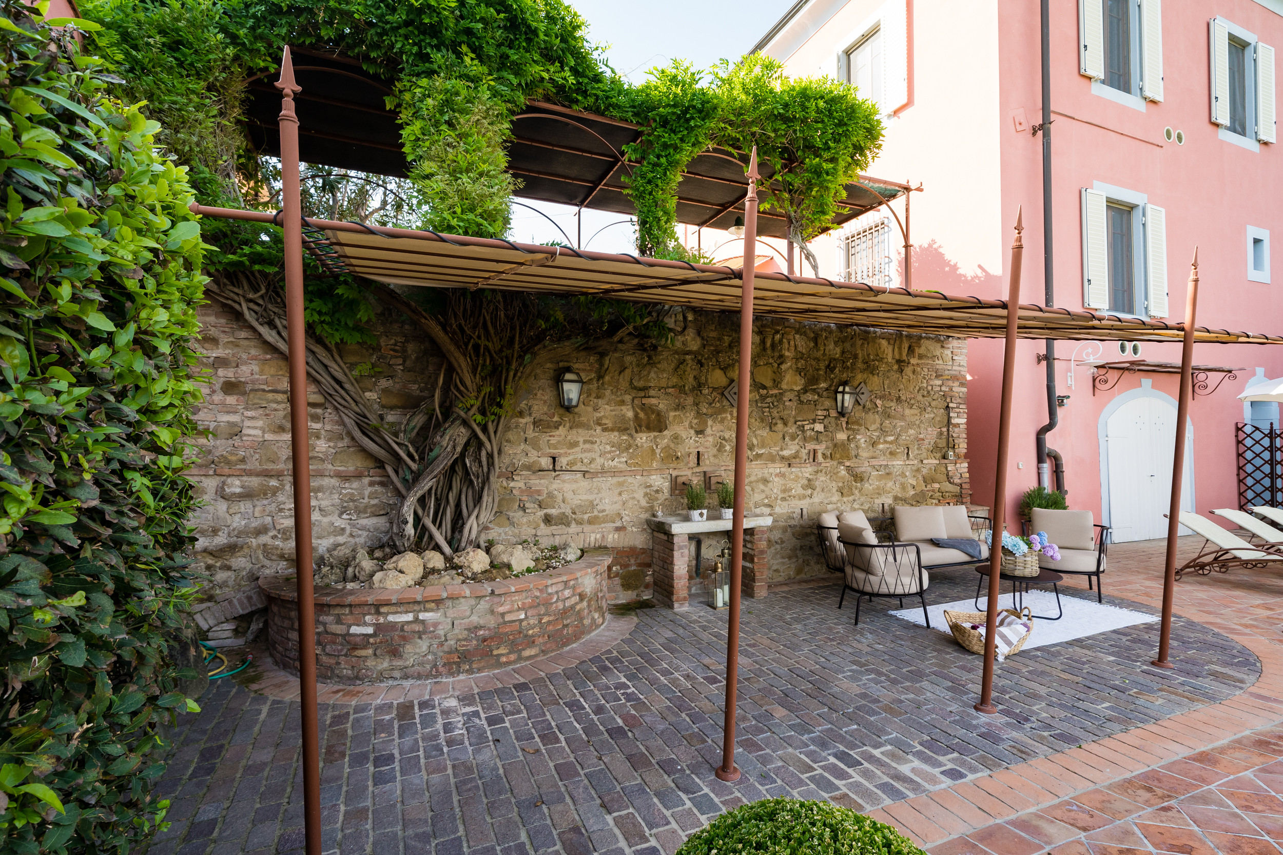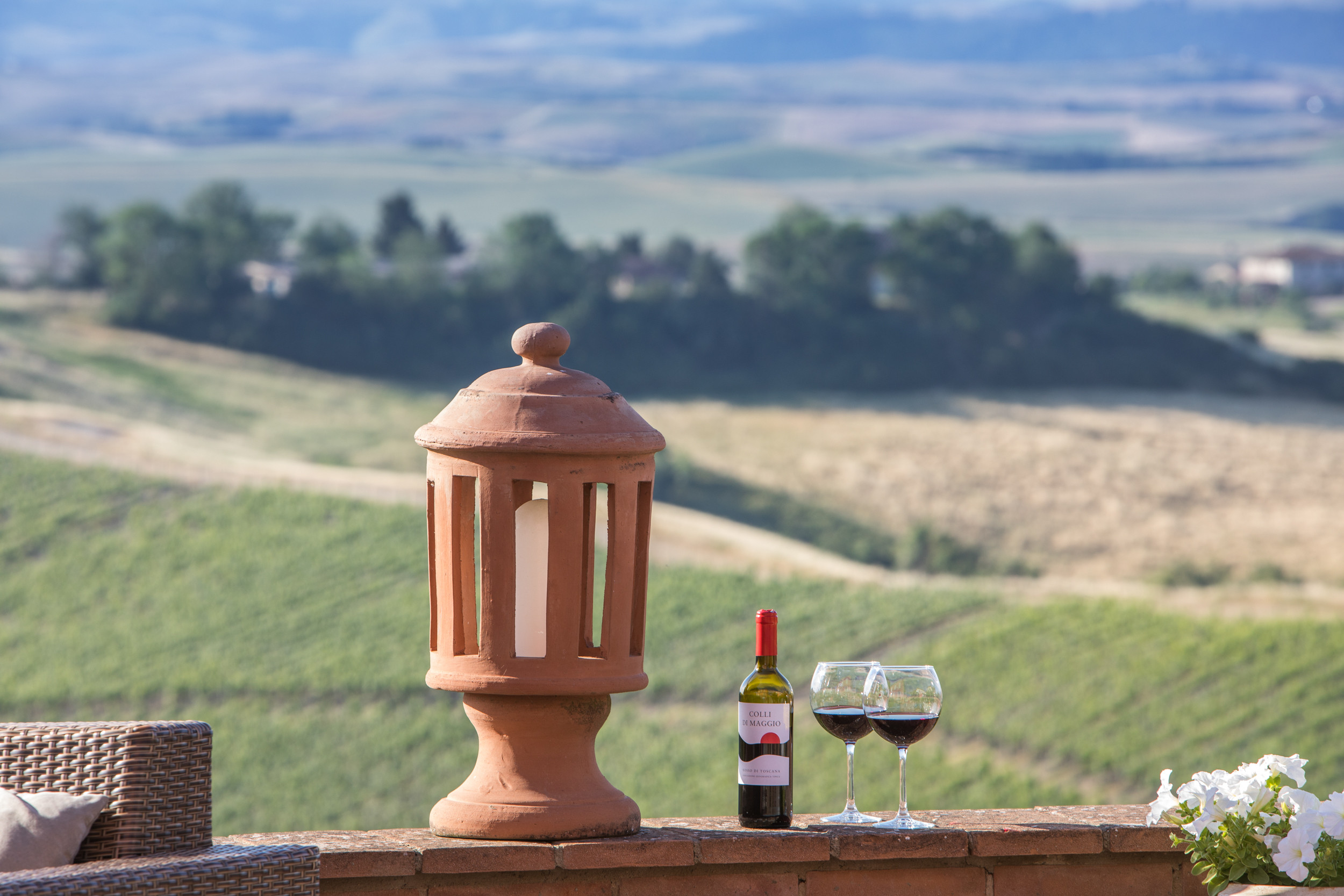 under a pergola with a hundred year old wisteria. From here you can admire the vineyards and olive groves as far as the city of Volterra. By means of another stone staircase we go down to the garden, protected by an ancient wall for privacy, to the panoramic swimming pool (12×4 metres by 1.30 deep).It has a hydromassage area, divans and umbrellas. The shops of Fabbrica are within walking distance.
