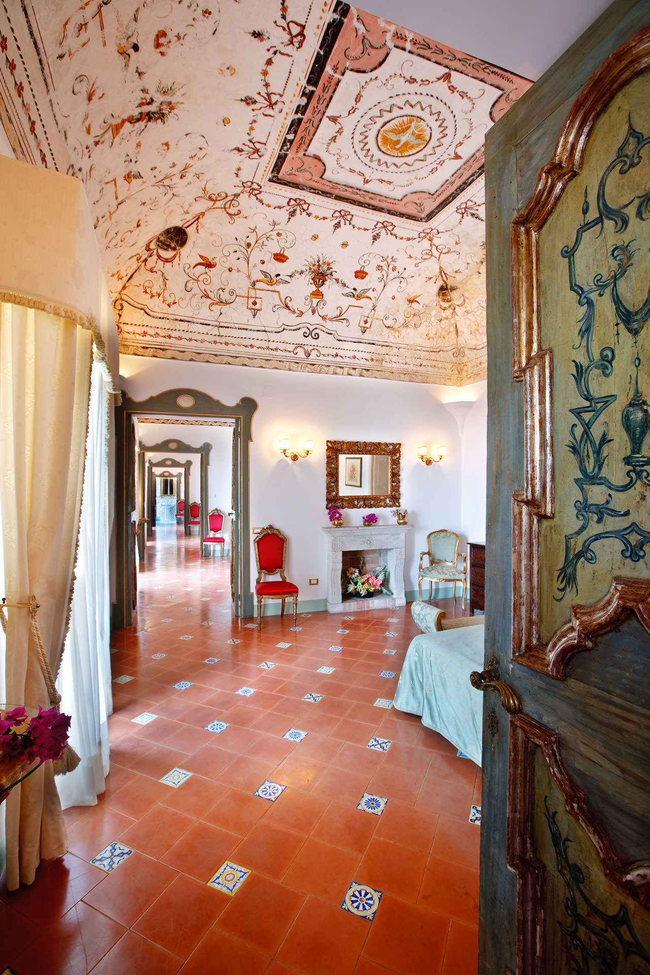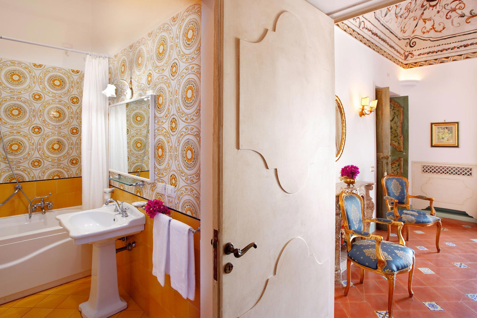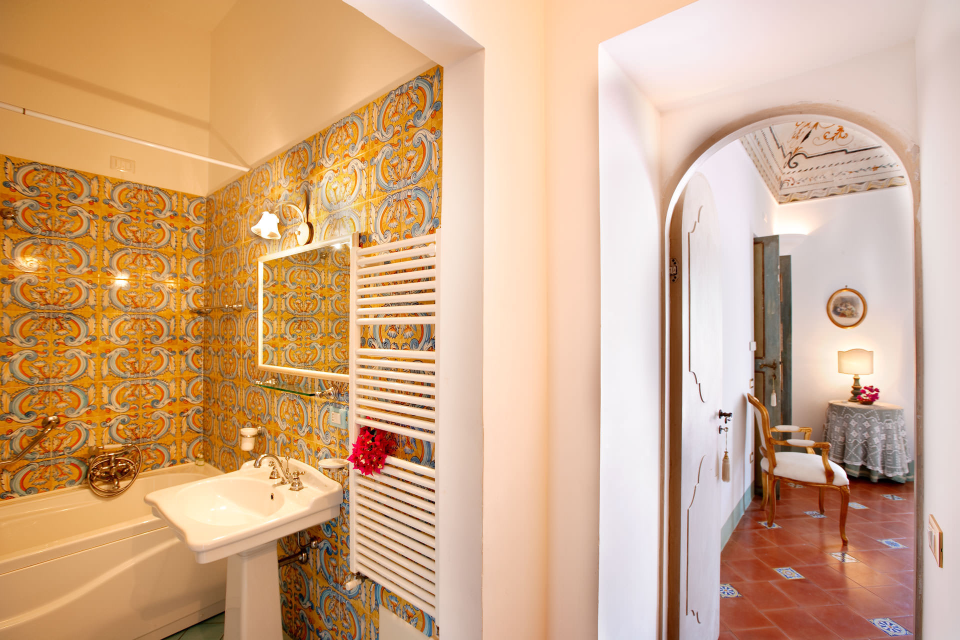 From the corridor you can enter other 5 bedrooms located on this level of the house, all characterized by vaulted and frescoed ceilings, matrimonial beds, that are wider than a queen-size bed (except one that is equipped with twin beds), ensuite bathrooms, with lucid hand-made majolica tiles and equipped with washbasins, toilet, bathtubs with fixed shower (one