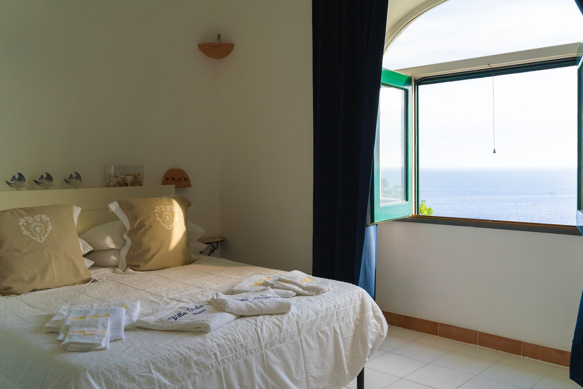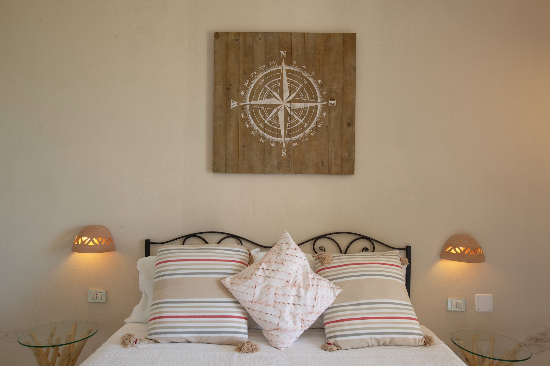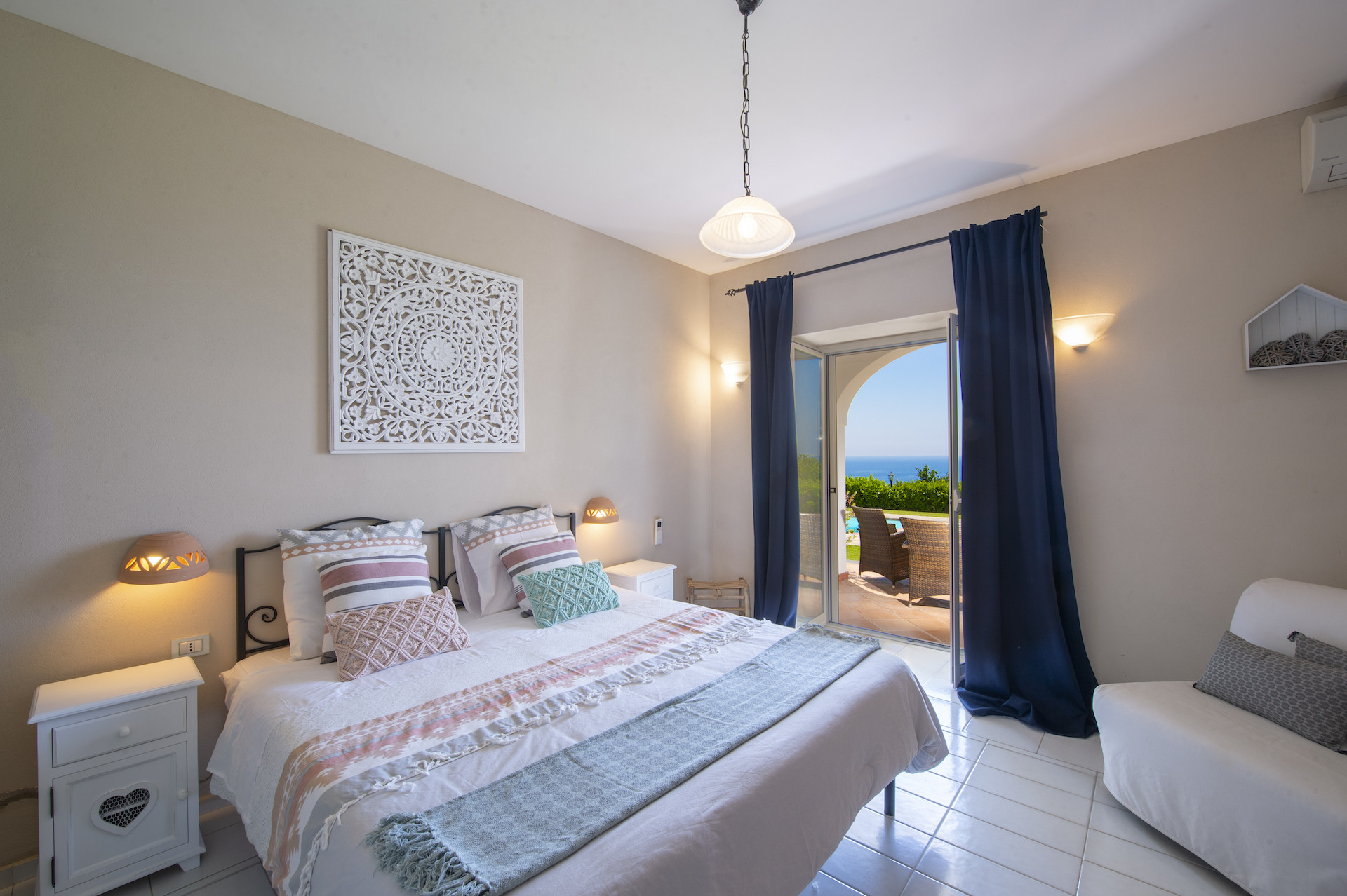 7)The bedroom has a double bed (160 cm/62 inches, wider than a queen-size bed). In this room you will find a satellite television. The bedroom has a window with a view of the sea and the island of Li Galli.