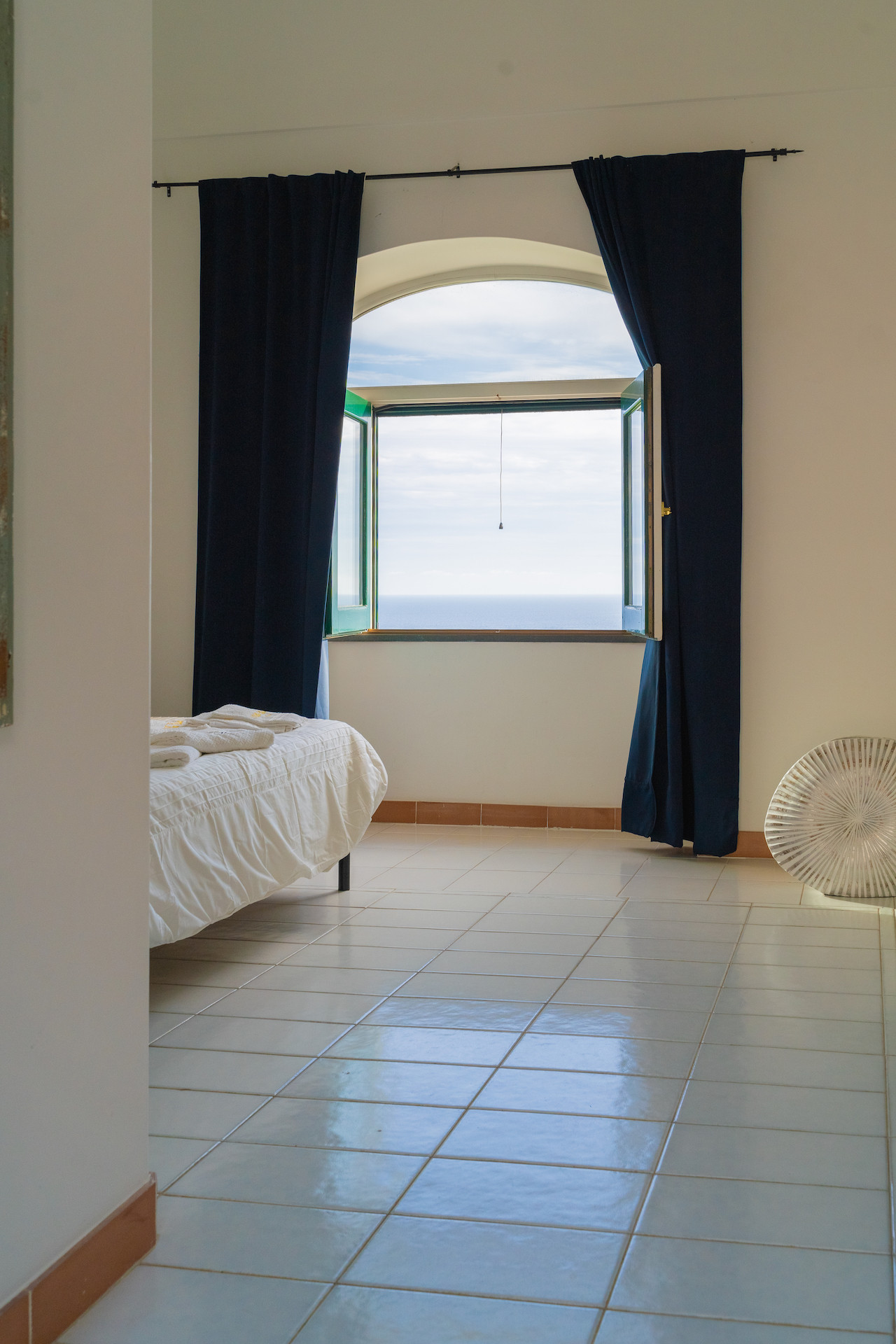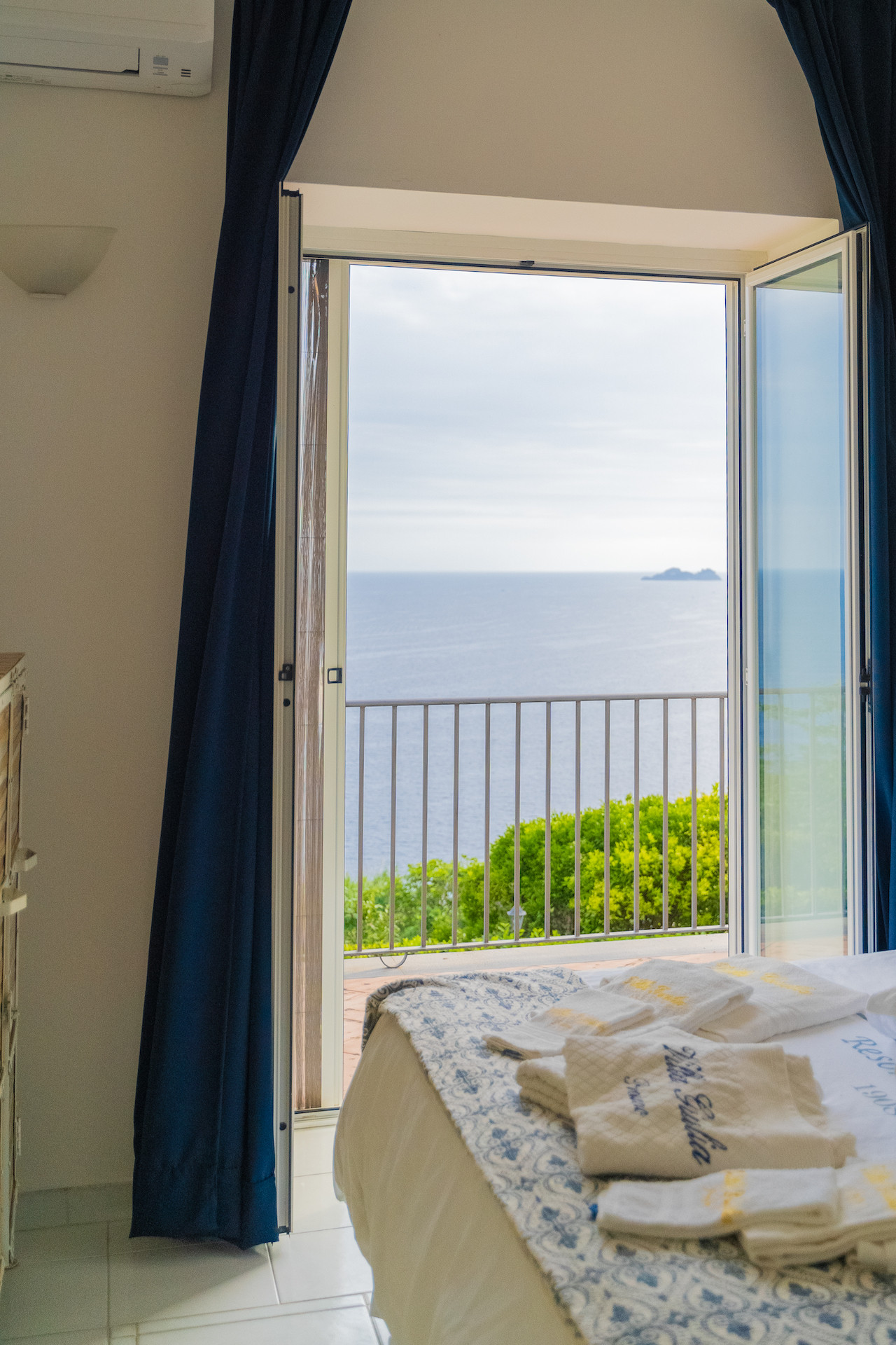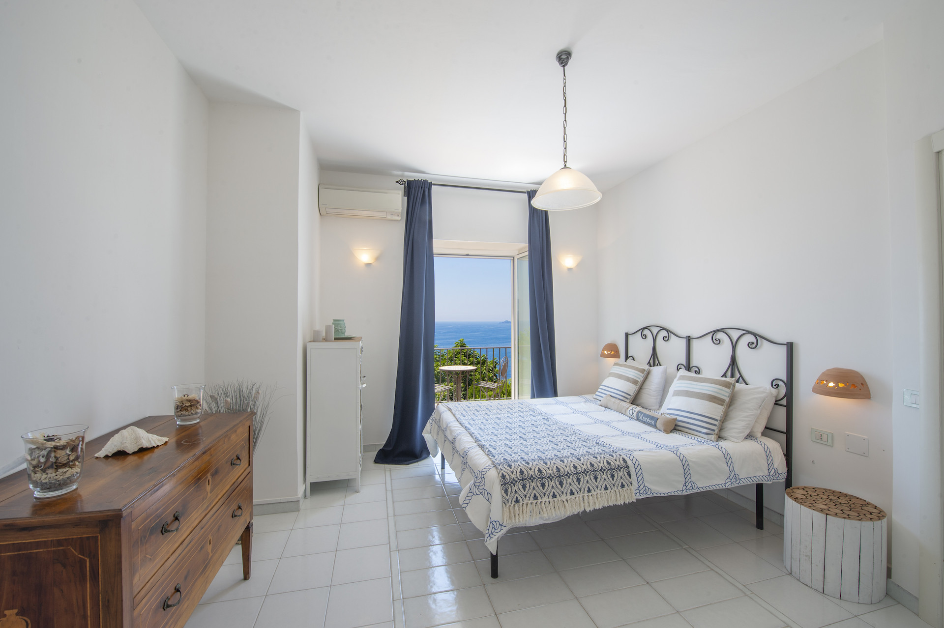 7)The bedroom has a double bed (160 cm/62 inches, wider than a queen-size bed). In this room you will find a satellite television. The bedroom has a window with a view of the sea and the island of Li Galli.